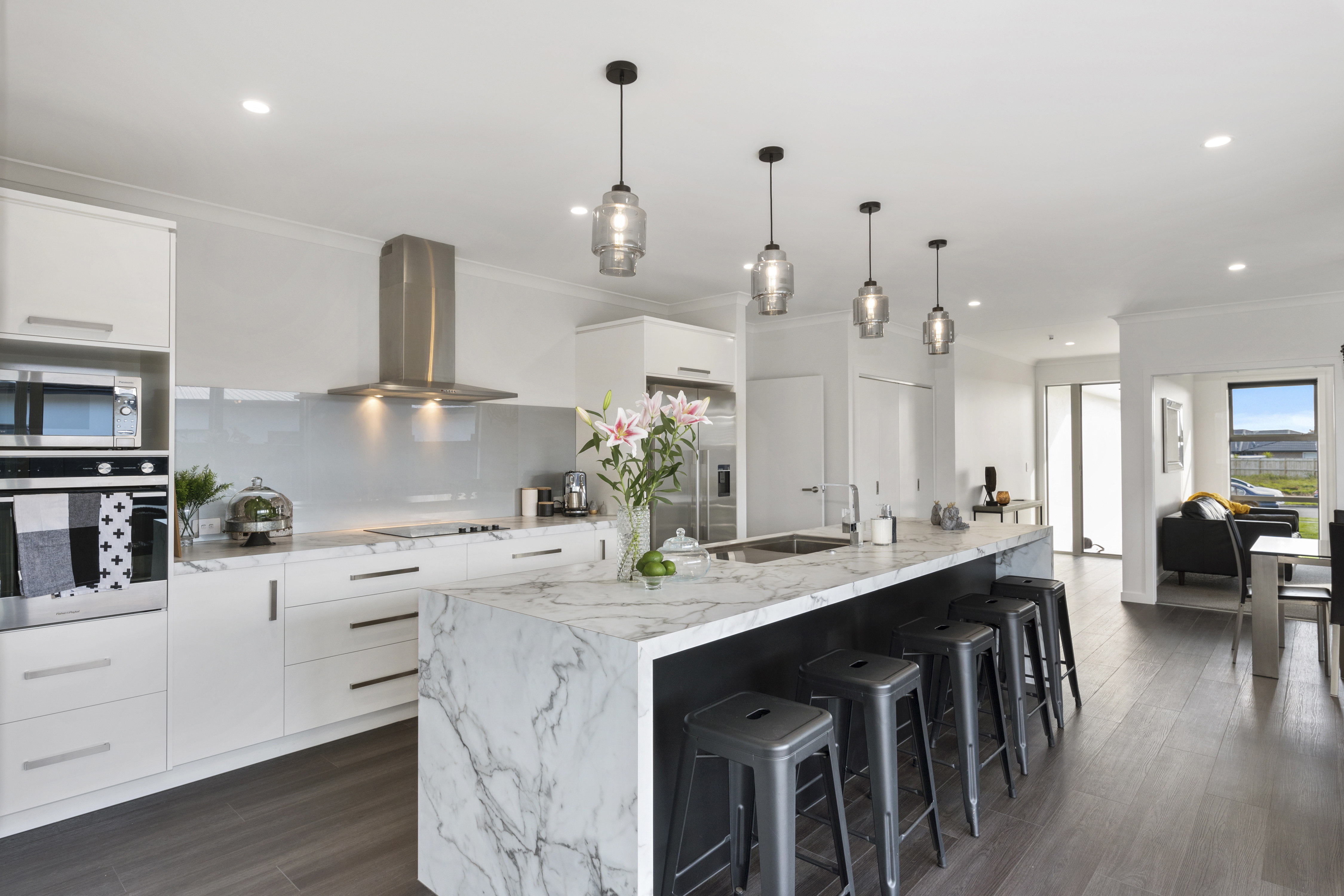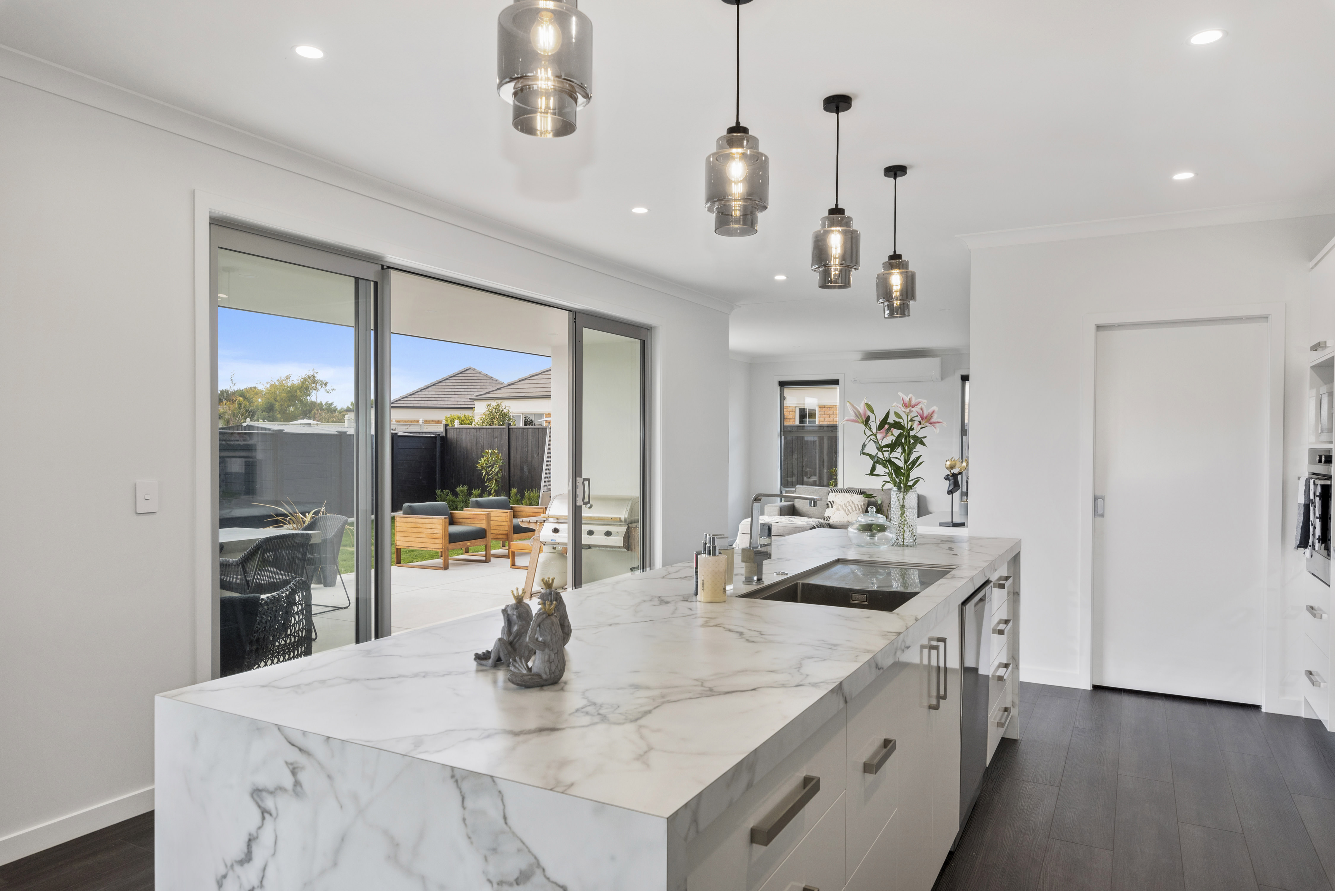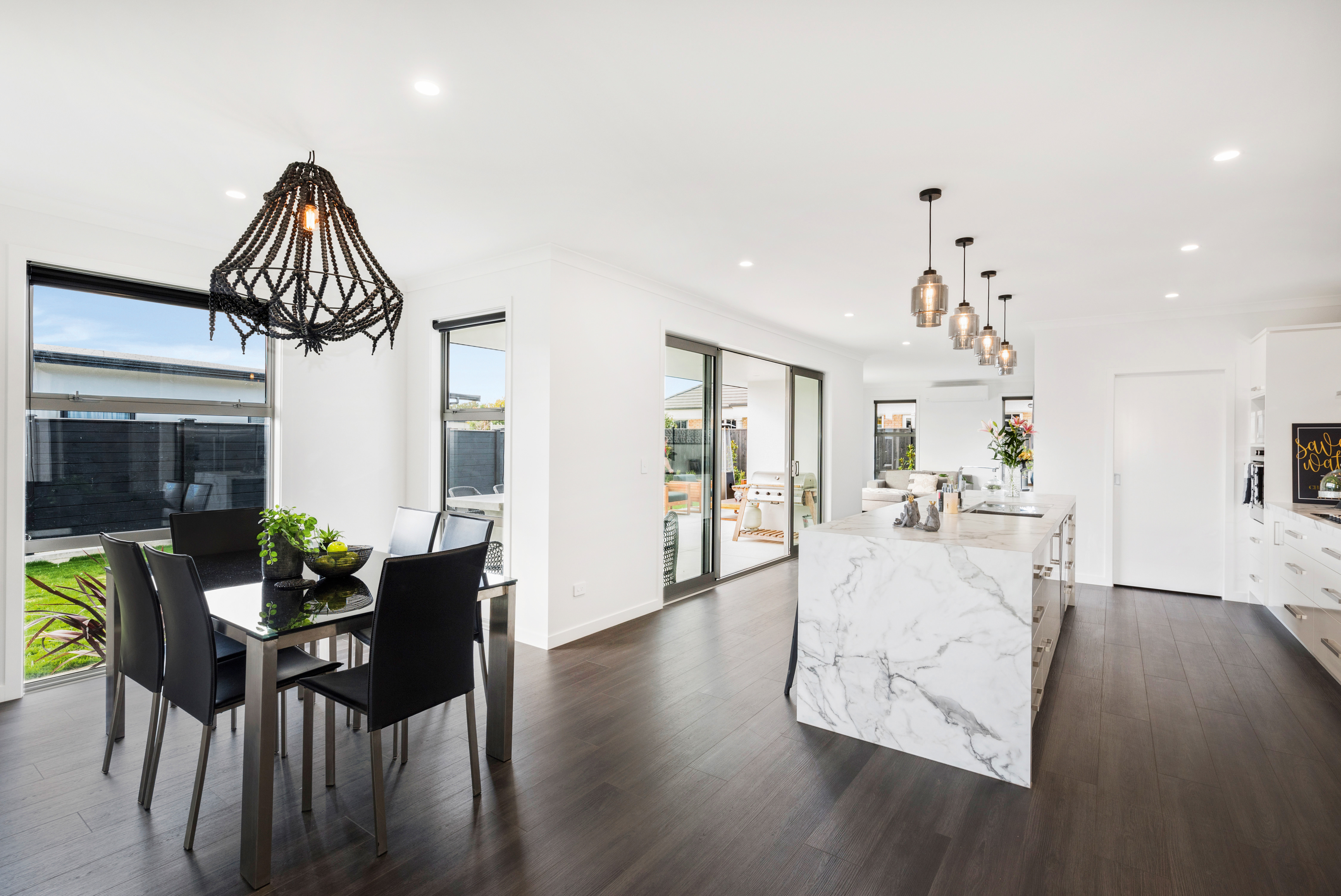 Fresh-faced and ready for action, this 234sqm home in Palmerston North is destined to please. Attractive vinyl plank flooring flows into the elegant open plan-living area. The breakfast bar with marble waterfall end is perfect for serving hors d’oeuvres and cocktails. Choose between indoor seating or the covered outdoor living area. A walk-in pantry hides all manner of sins. Positioned through an over-sized cavity sliding door, the well-equipped media room is ideal for movie nights. Low-maintenance yet luxurious, the main bathroom continues the home’s attention to detail. A wall-hung vanity, separate shower and large tile-encased bath accommodate the growing family. The separate toilet ensures privacy and convenience. This four-bedroom home plays favourites with the master suite, which boasts a walk-in wardrobe and beautifully detailed ensuite. The fully insulated double garage and separate laundry take care of all those dirty jobs. This home is an absolute clean sweep for family life and entertaining.