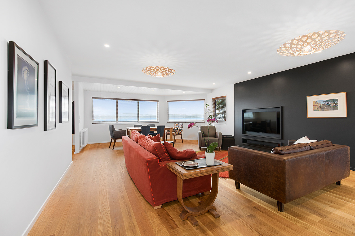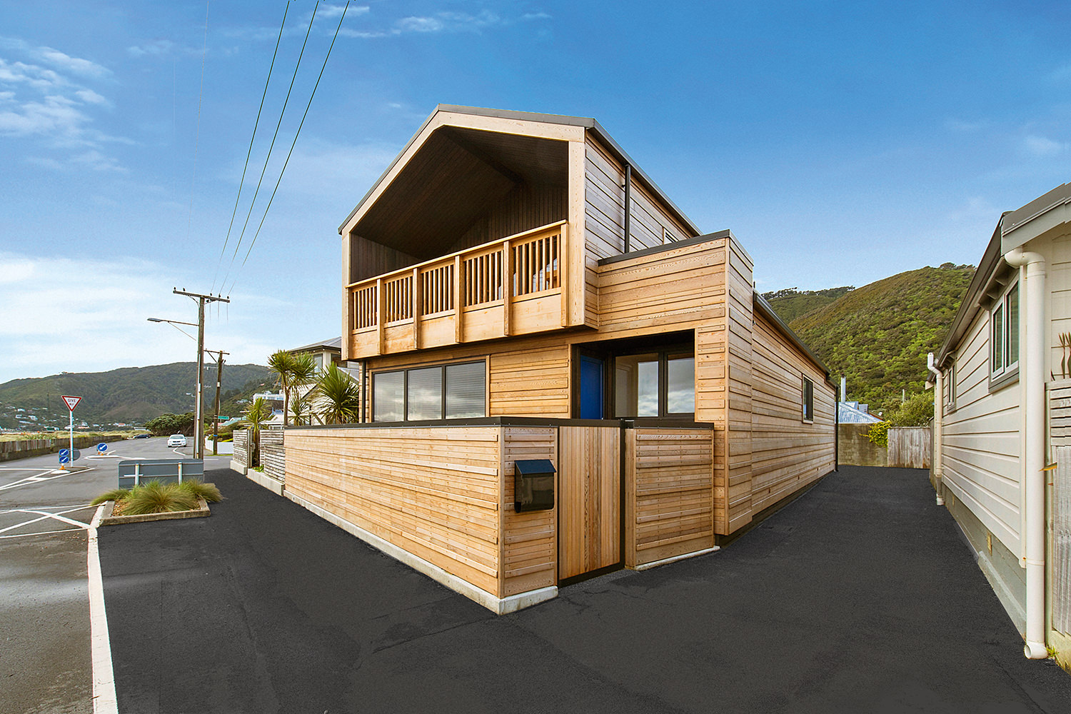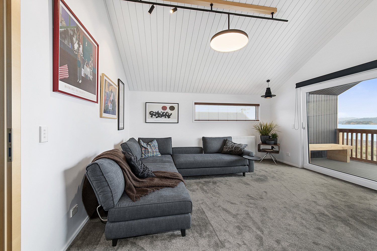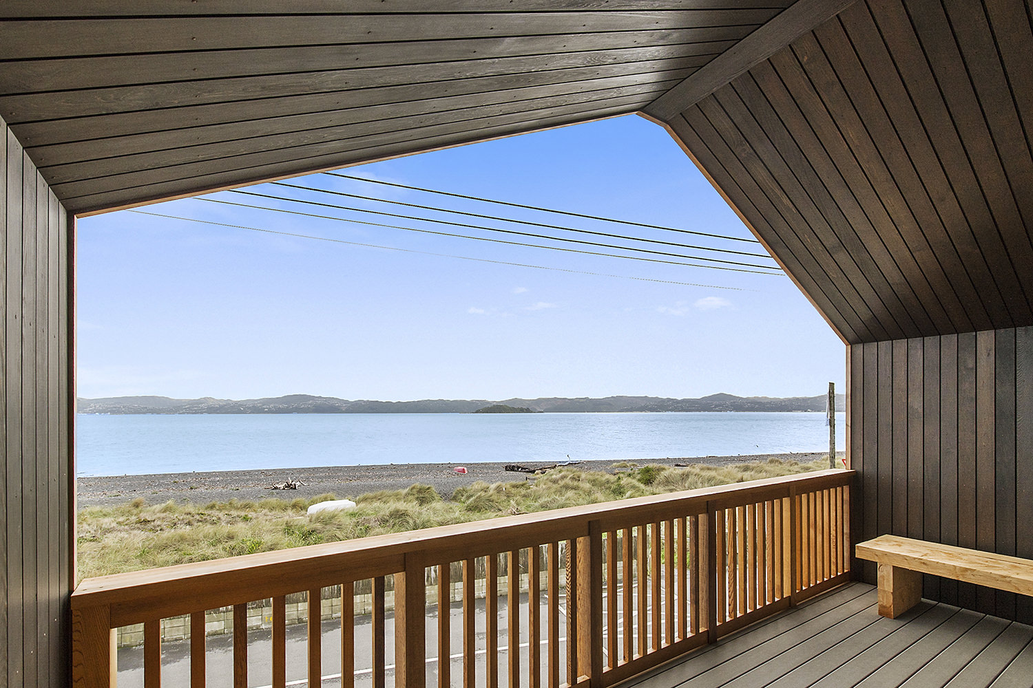 Located on a quiet street in its sought-after seaside suburb of Lower Hutt, this home is close enough to the harbour that waves can be heard gently lapping. An extensive renovation has enhanced the visual connection with the sea and delivered modern living spaces that reflect the owners’ lifestyle. A second storey addition, echoing the form of a wharenui, has taken the ocean outlook to new heights. Its maahau (veranda-like space) allows for an intimate connection with the water. This upper level functions as a retreat for the owners, but can easily transform into guest accommodation. It boasts its own lounge, convertible couches, kitchenette and bathroom. Downstairs, the superbly updated living space features an open-plan layout with designer kitchen and panoramic harbour views. Oiled American oak flooring and a black feature wall define the space. A private courtyard awaits for open-air entertaining. Extensive use of random width and depth cedar cladding creates a visually exciting facade that’s in harmony with the coastal location.