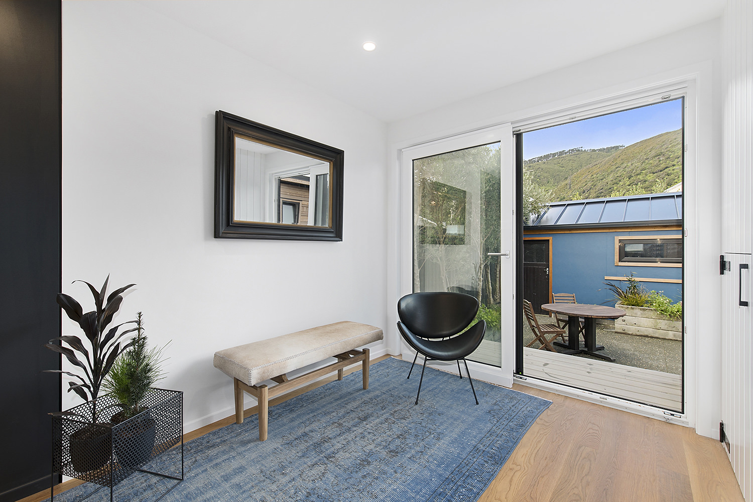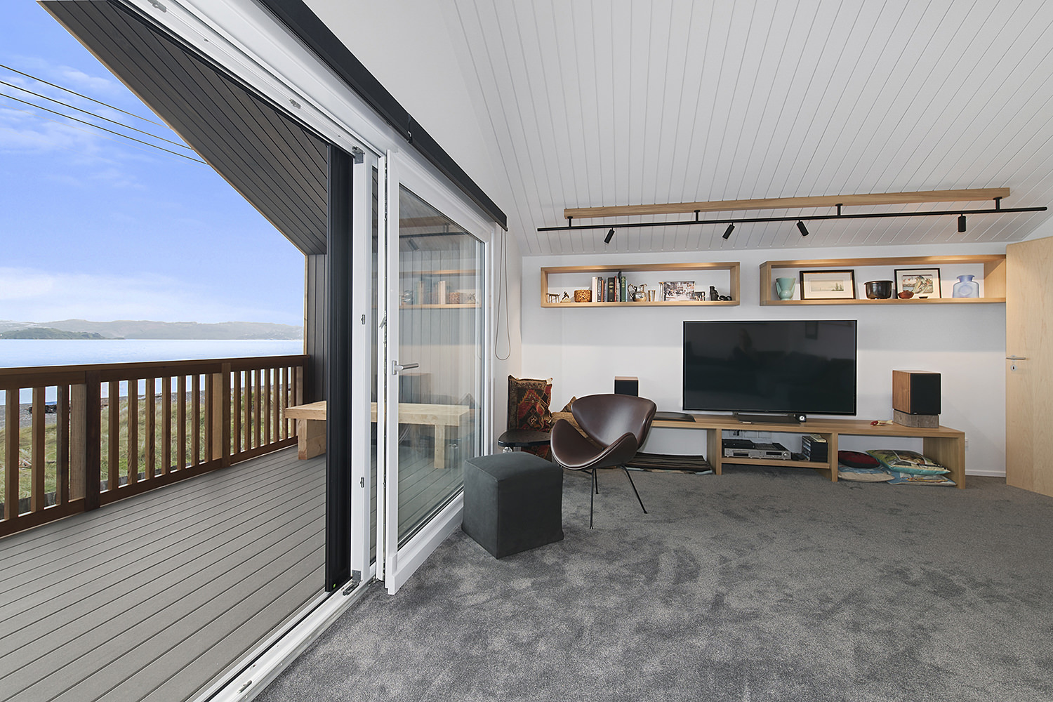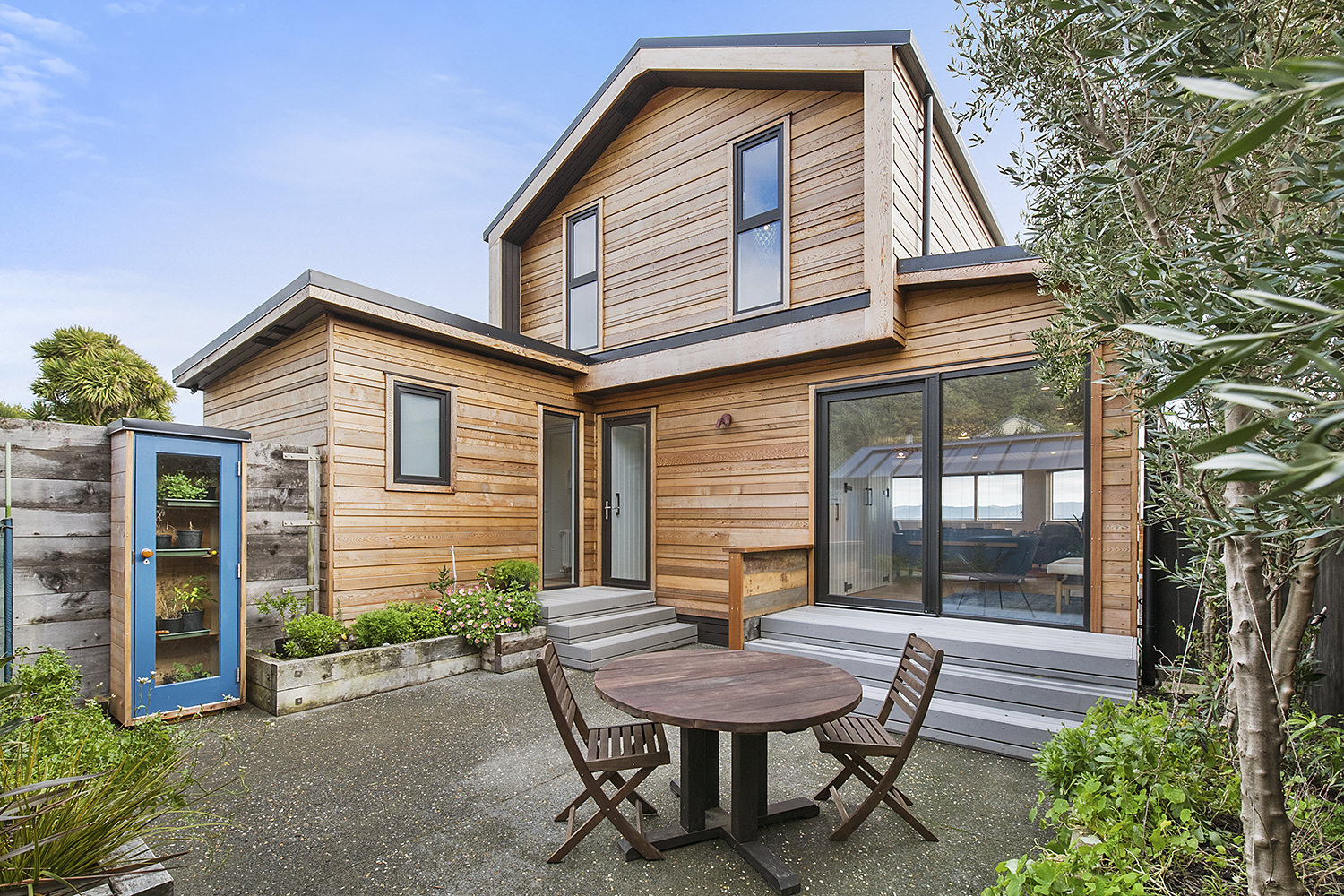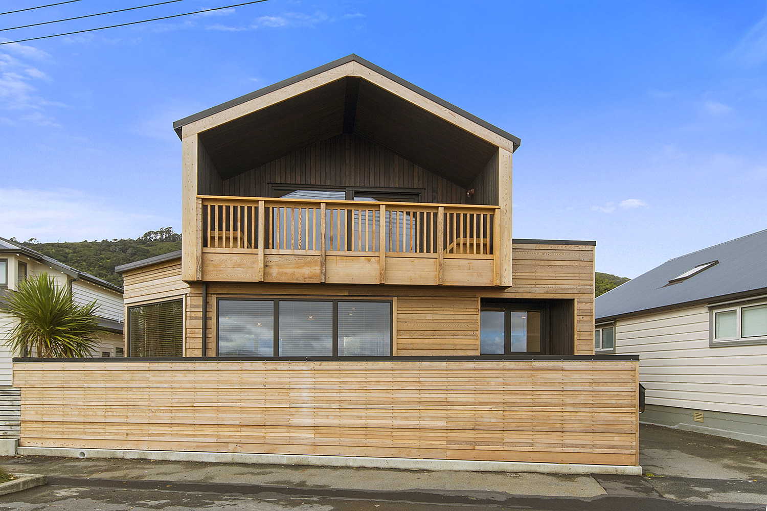 Located on a quiet street in its sought-after seaside suburb of Lower Hutt, this home is close enough to the harbour that waves can be heard gently lapping. An extensive renovation has enhanced the visual connection with the sea and delivered modern living spaces that reflect the owners’ lifestyle. A second storey addition, echoing the form of a wharenui, has taken the ocean outlook to new heights. Its maahau (veranda-like space) allows for an intimate connection with the water. This upper level functions as a retreat for the owners, but can easily transform into guest accommodation. It boasts its own lounge, convertible couches, kitchenette and bathroom. Downstairs, the superbly updated living space features an open-plan layout with designer kitchen and panoramic harbour views. Oiled American oak flooring and a black feature wall define the space. A private courtyard awaits for open-air entertaining. Extensive use of random width and depth cedar cladding creates a visually exciting facade that’s in harmony with the coastal location.