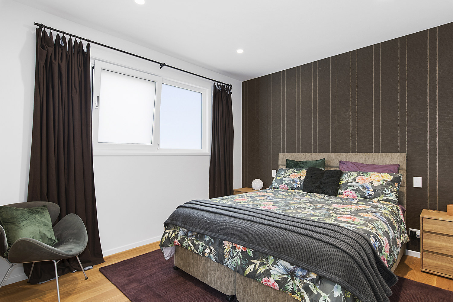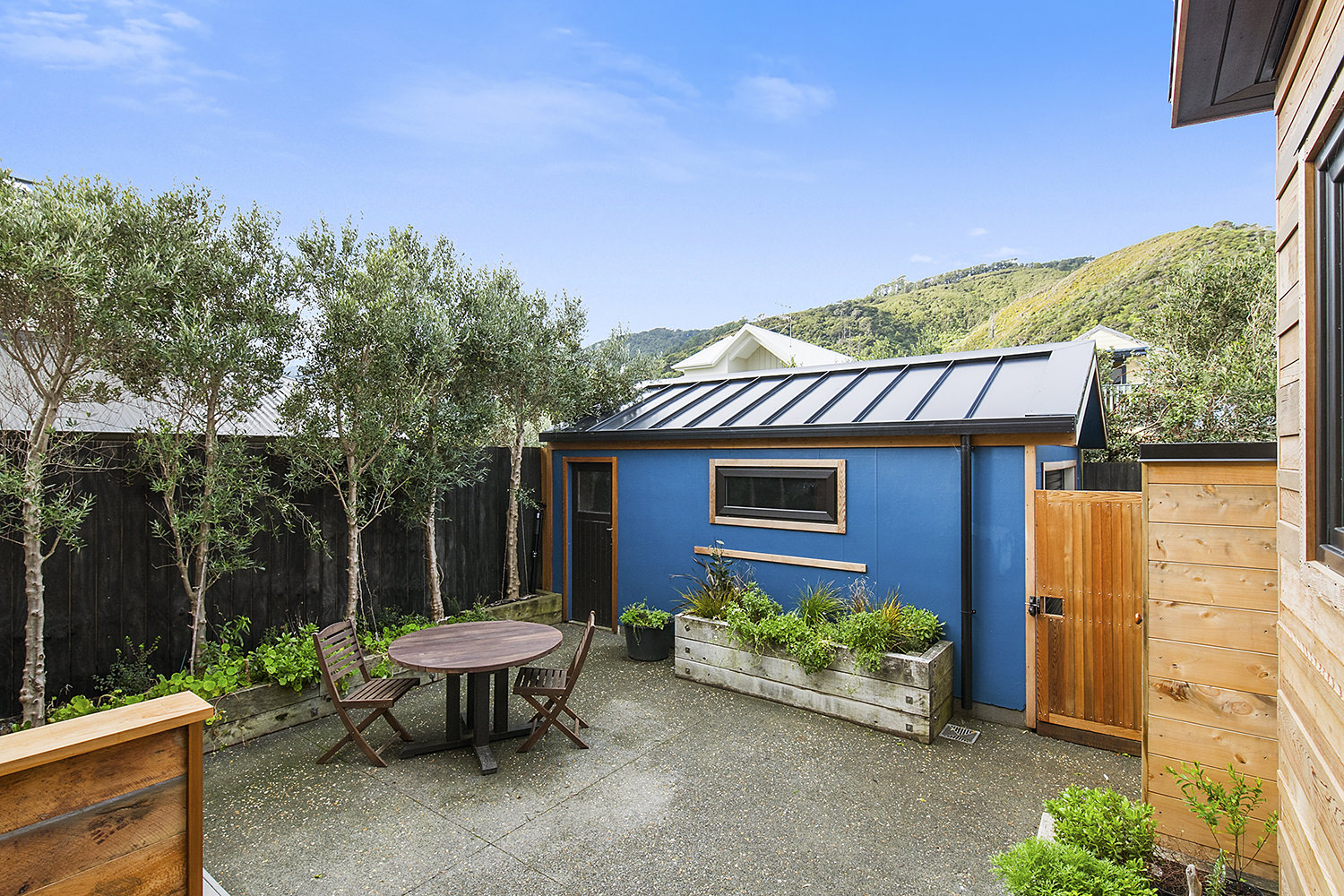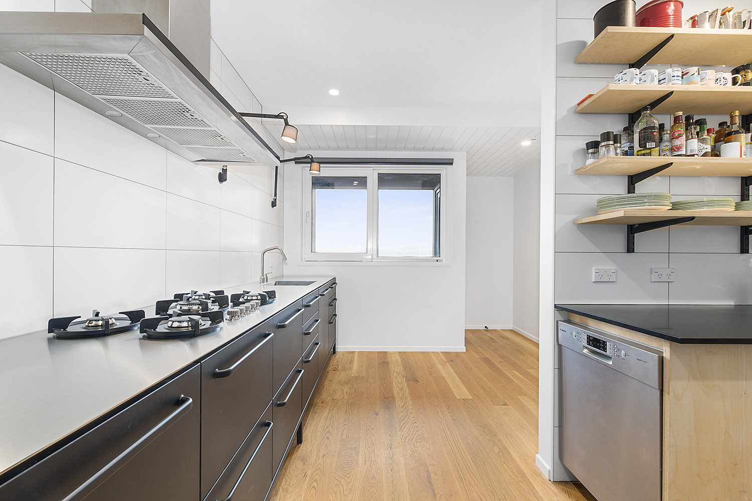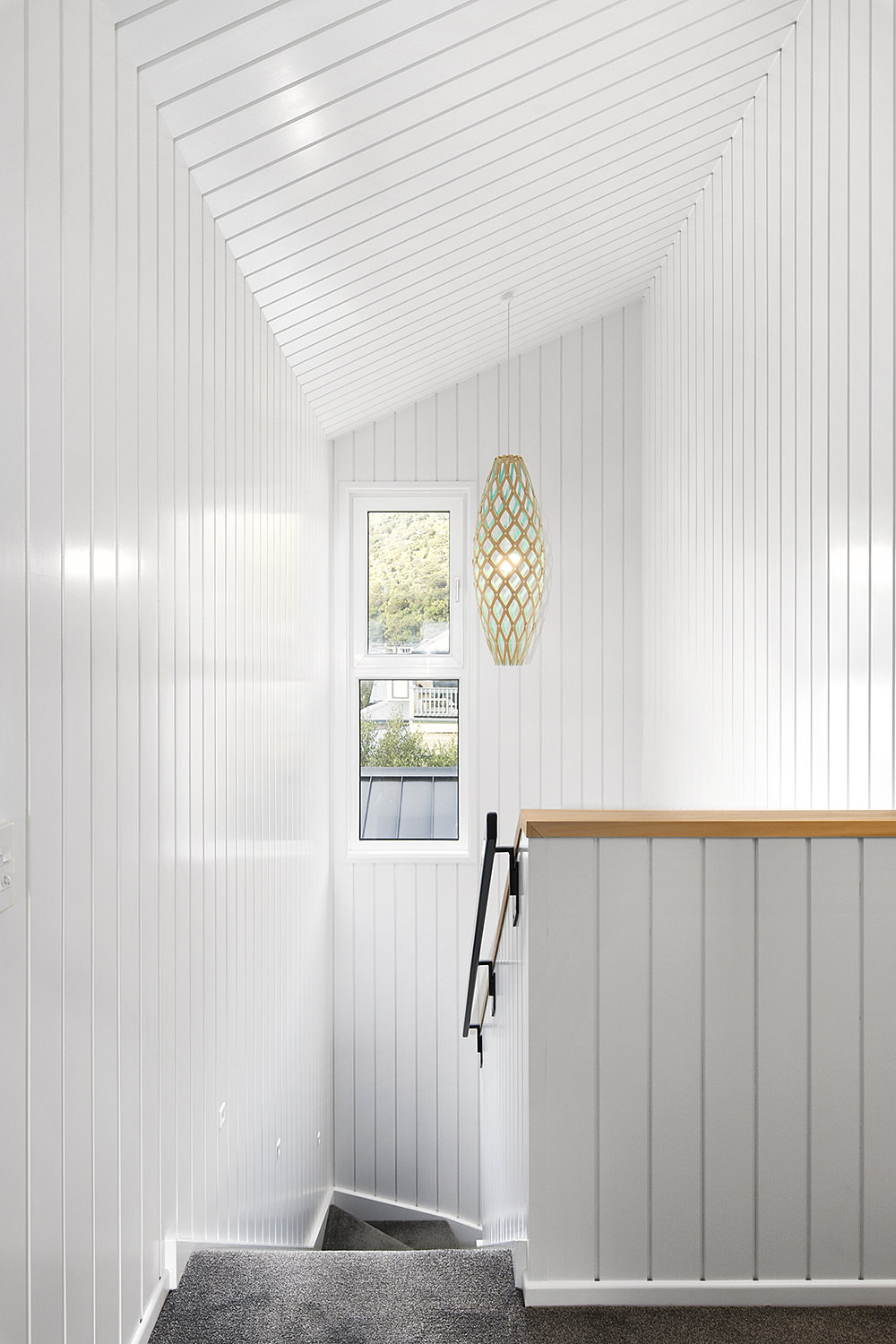 Located on a quiet street in its sought-after seaside suburb of Lower Hutt, this home is close enough to the harbour that waves can be heard gently lapping. An extensive renovation has enhanced the visual connection with the sea and delivered modern living spaces that reflect the owners’ lifestyle. A second storey addition, echoing the form of a wharenui, has taken the ocean outlook to new heights. Its maahau (veranda-like space) allows for an intimate connection with the water. This upper level functions as a retreat for the owners, but can easily transform into guest accommodation. It boasts its own lounge, convertible couches, kitchenette and bathroom. Downstairs, the superbly updated living space features an open-plan layout with designer kitchen and panoramic harbour views. Oiled American oak flooring and a black feature wall define the space. A private courtyard awaits for open-air entertaining. Extensive use of random width and depth cedar cladding creates a visually exciting facade that’s in harmony with the coastal location.