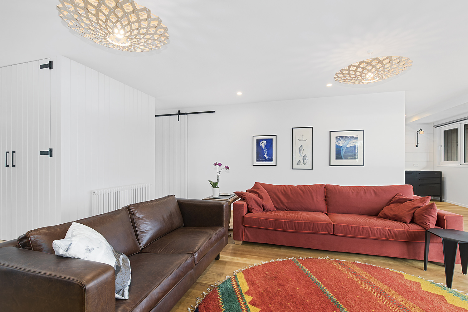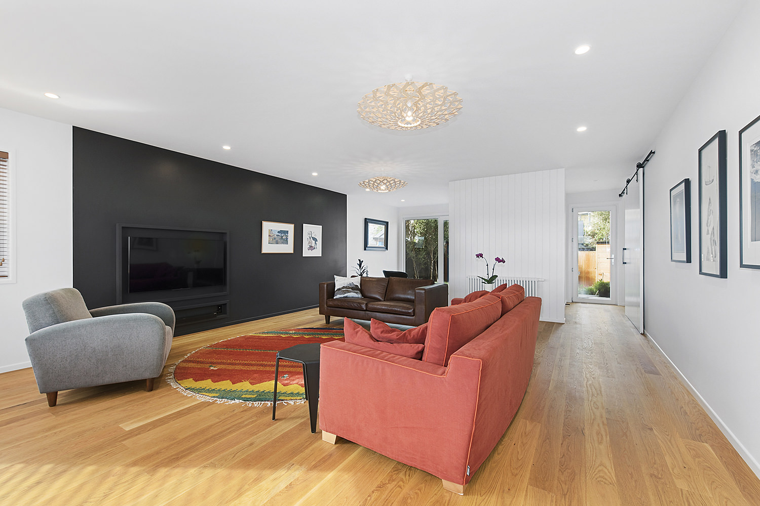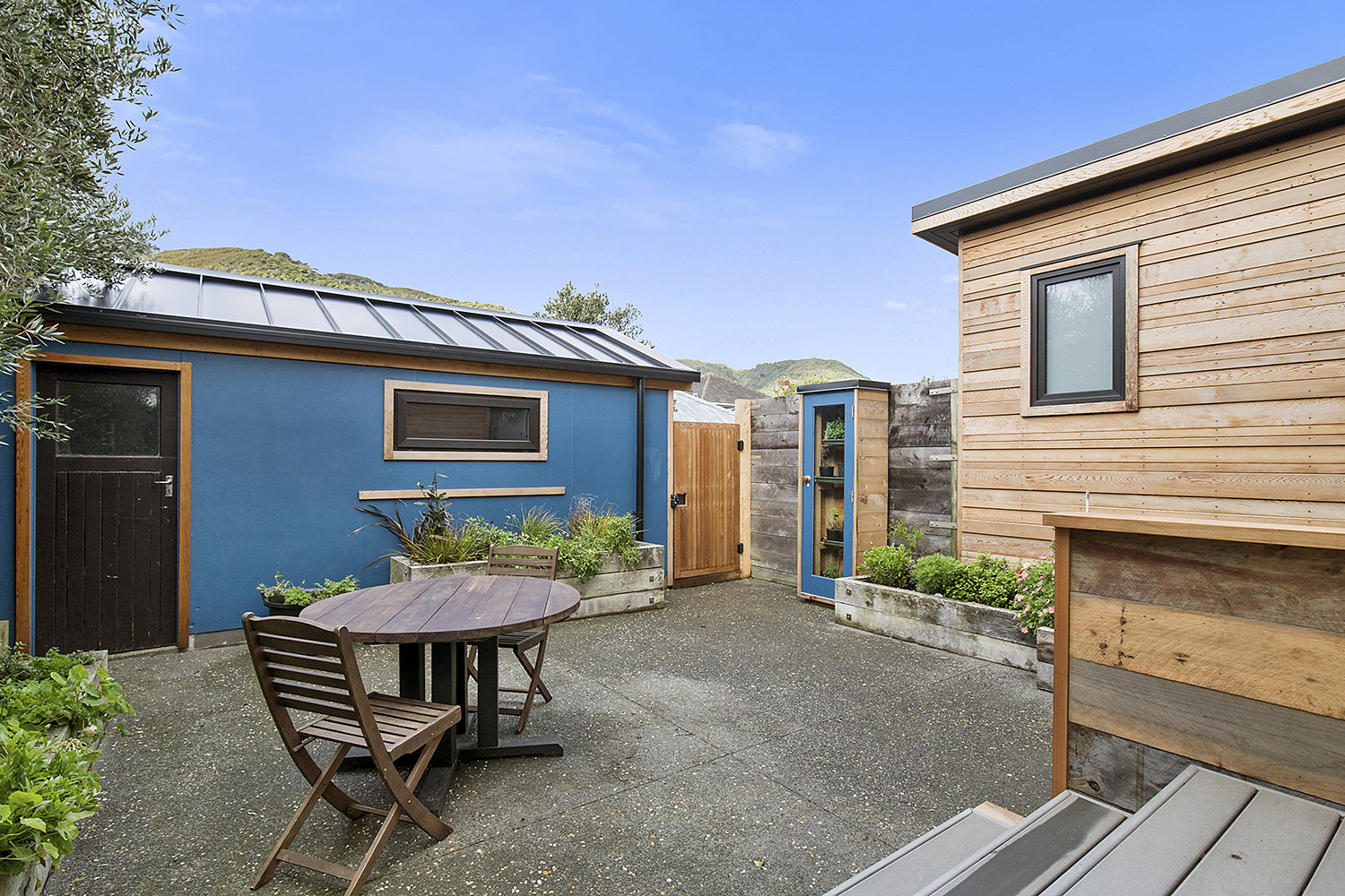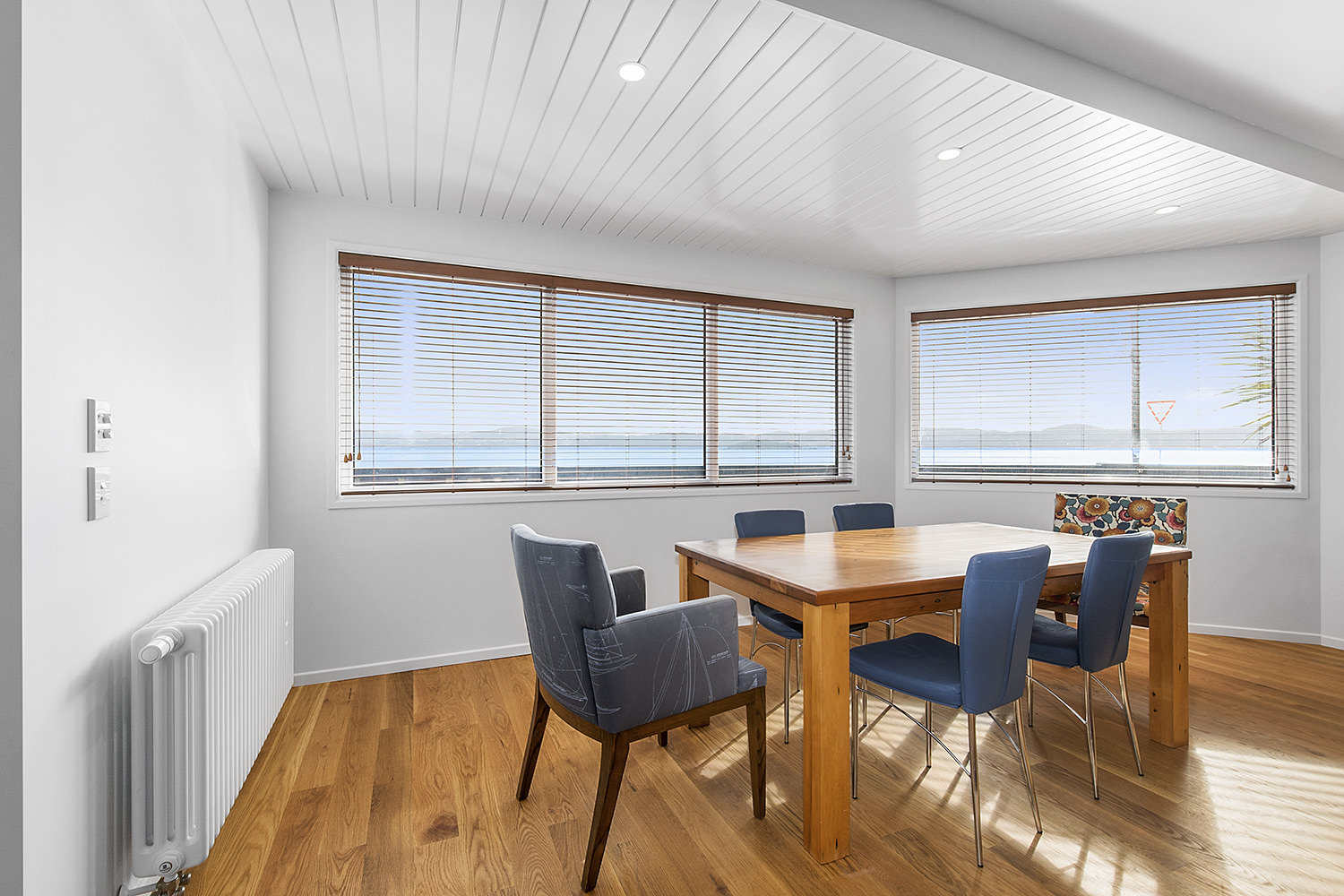 Located on a quiet street in its sought-after seaside suburb of Lower Hutt, this home is close enough to the harbour that waves can be heard gently lapping. An extensive renovation has enhanced the visual connection with the sea and delivered modern living spaces that reflect the owners’ lifestyle. A second storey addition, echoing the form of a wharenui, has taken the ocean outlook to new heights. Its maahau (veranda-like space) allows for an intimate connection with the water. This upper level functions as a retreat for the owners, but can easily transform into guest accommodation. It boasts its own lounge, convertible couches, kitchenette and bathroom. Downstairs, the superbly updated living space features an open-plan layout with designer kitchen and panoramic harbour views. Oiled American oak flooring and a black feature wall define the space. A private courtyard awaits for open-air entertaining. Extensive use of random width and depth cedar cladding creates a visually exciting facade that’s in harmony with the coastal location.