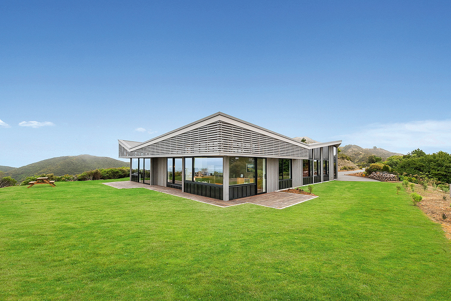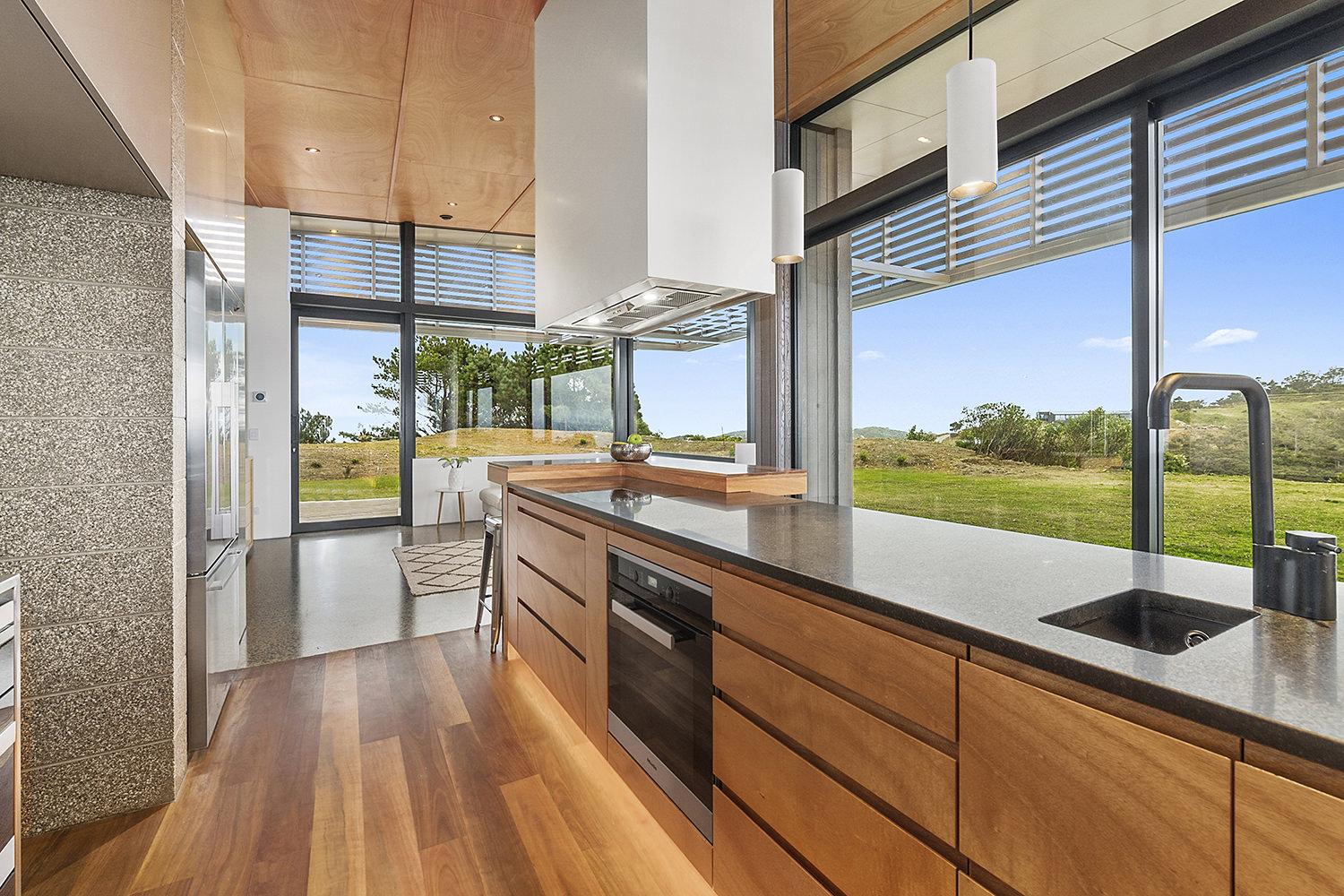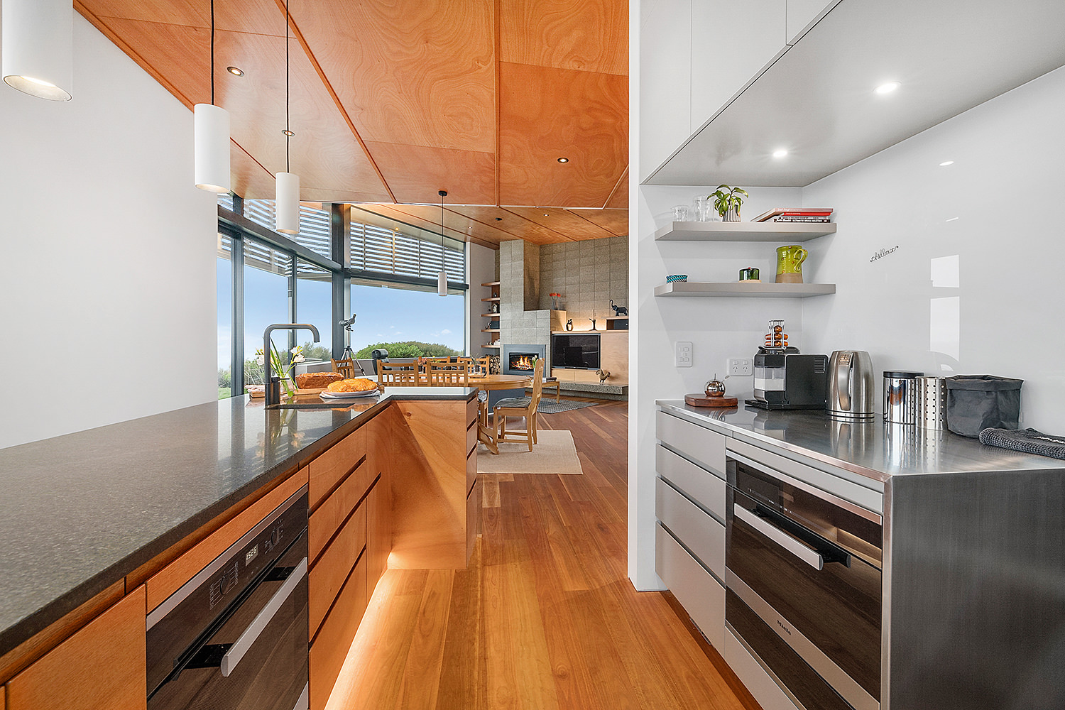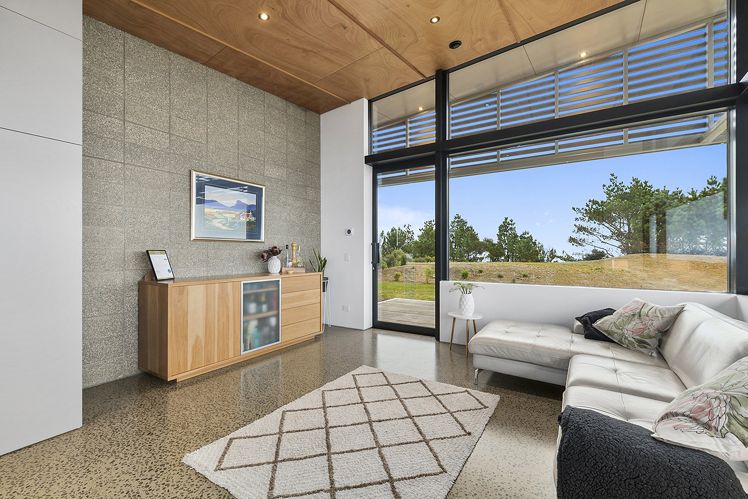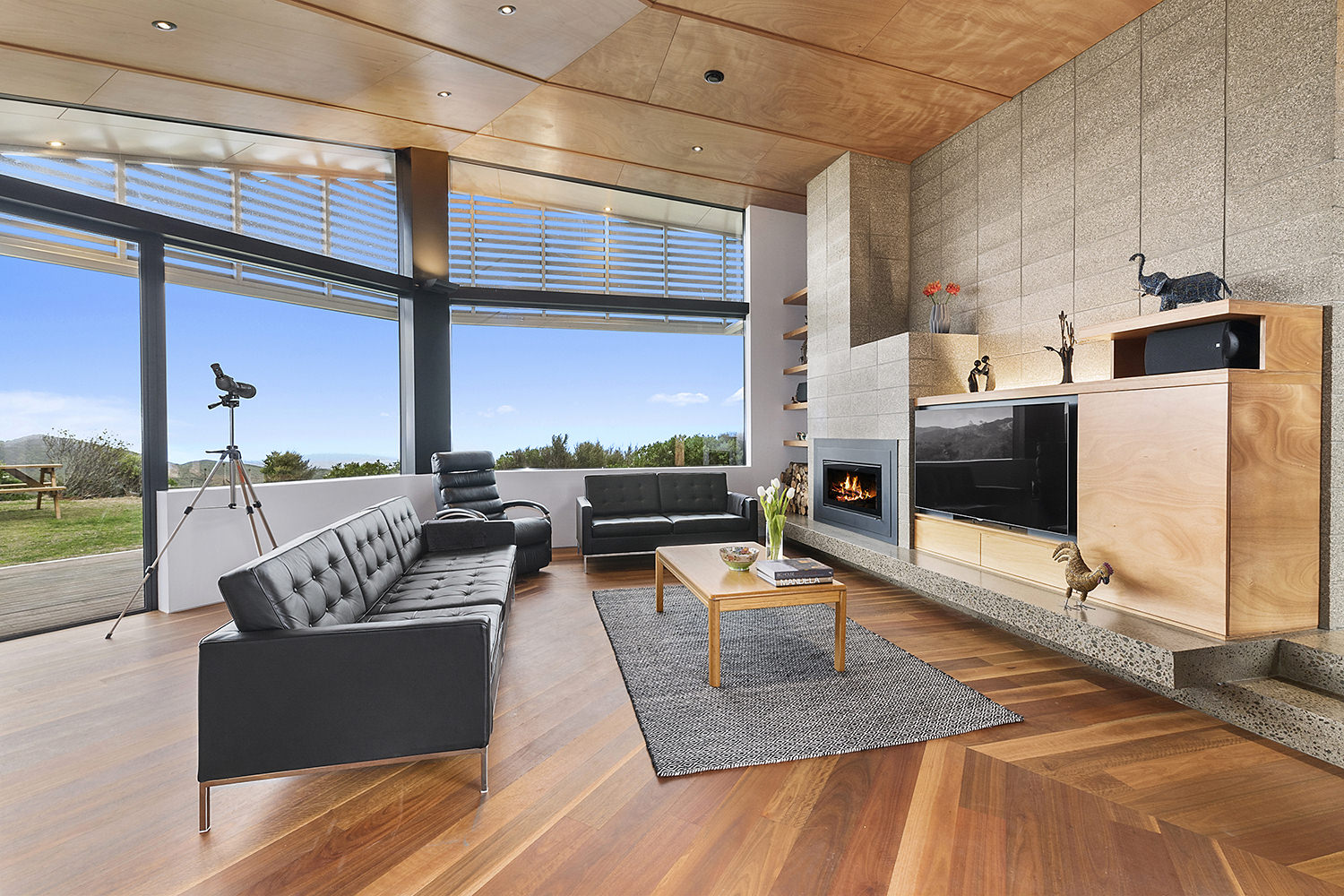 A hybrid city-country home, this architecturally designed home frames views over Wellington from the comfort of its secluded hilltop. The structure exists in harmony with the land while offering sheltered and sunny alfresco living spaces. Oiled cedar and zinc cladding ensures enduring good looks in the unforgiving climate. The skillion ceiling delivers a dynamic feeling of space in the main living area. Areas of floor-to-ceiling glass enhance the open connection with nature. The four-bedroom, three-bathroom layout offers parents and children their own wings. These converge in the shared social spaces. Separate living doubles as a guest room with access to an adjacent bathroom. The energy-efficient interiors stay exceptionally cosy thanks to in-slab hydronic underfloor heating and passive solar heating. Exposed concrete floors and block walls retain the sun’s warmth. Alfresco living areas include a sheltered courtyard with outdoor oven, plus wood storage to feed the fire. This is luxurious living at its understated best.