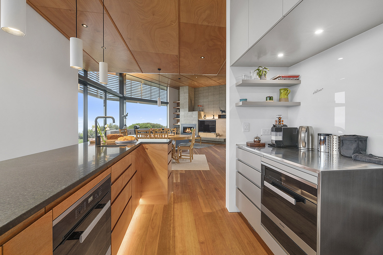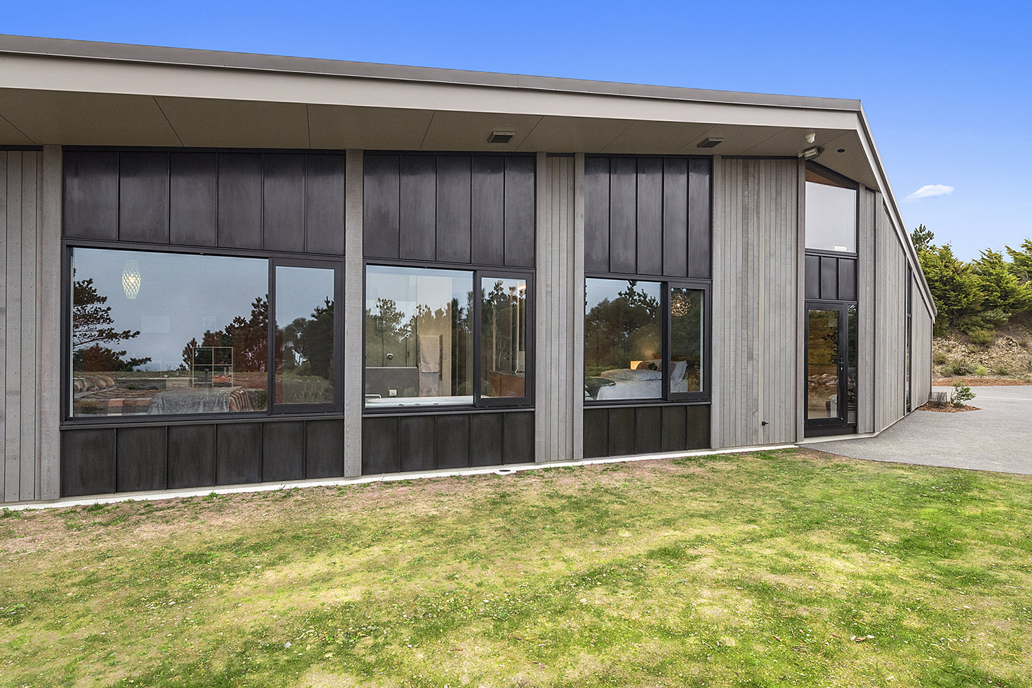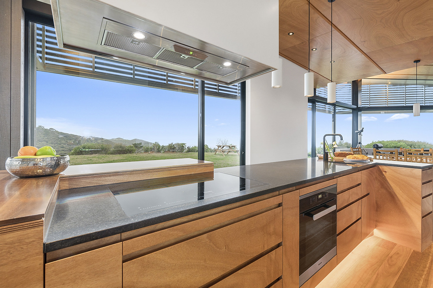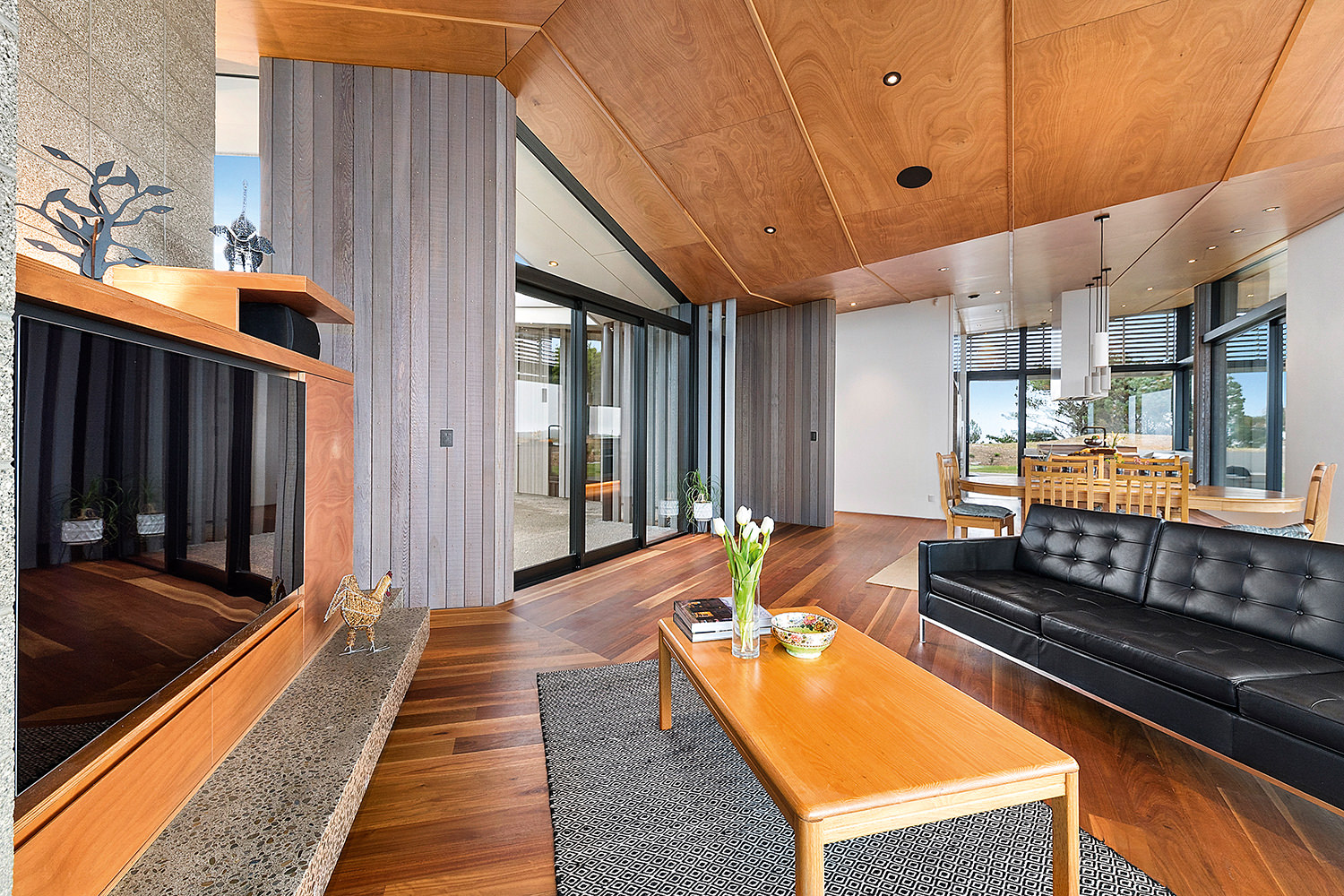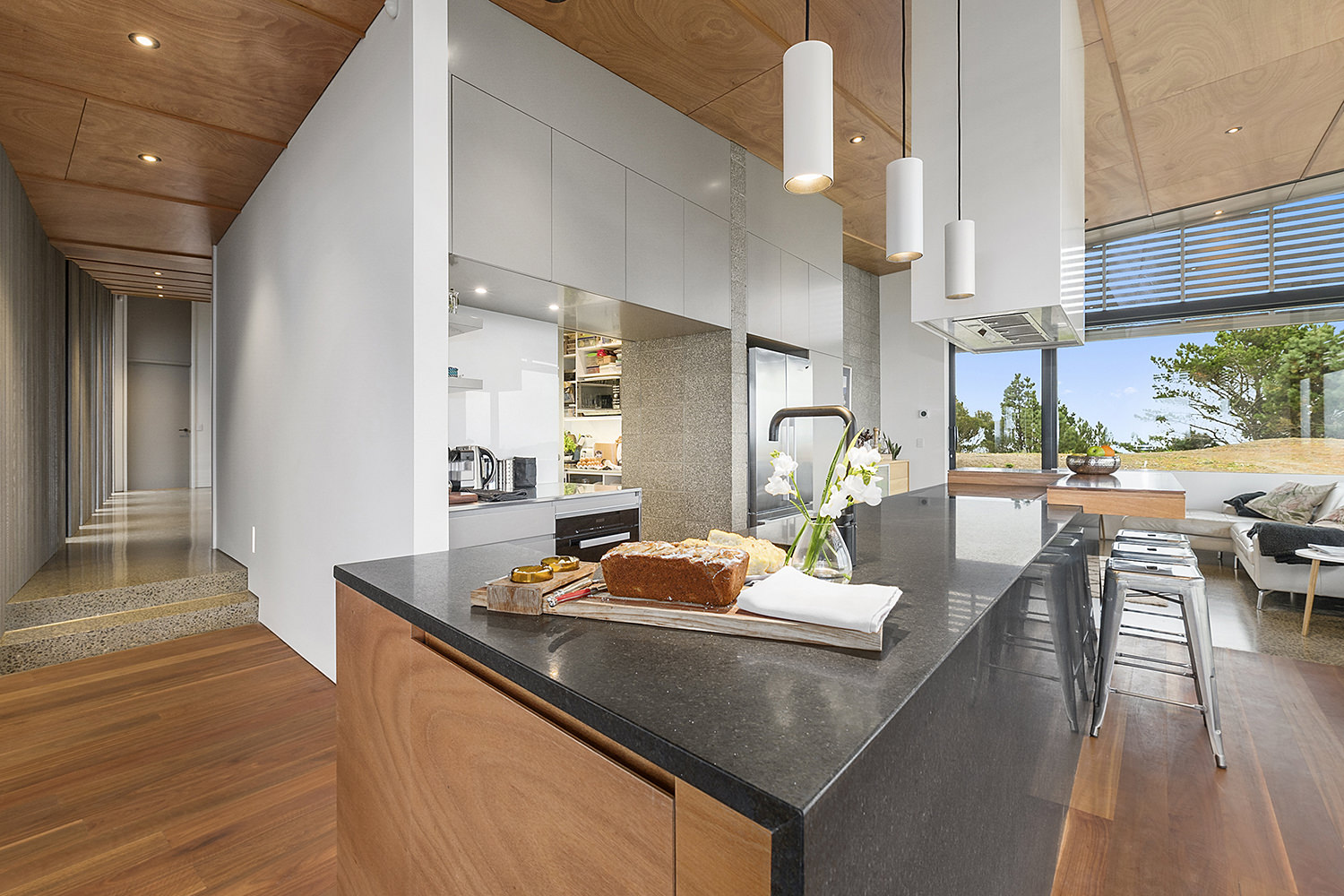 A hybrid city-country home, this architecturally designed home frames views over Wellington from the comfort of its secluded hilltop. The structure exists in harmony with the land while offering sheltered and sunny alfresco living spaces. Oiled cedar and zinc cladding ensures enduring good looks in the unforgiving climate. The skillion ceiling delivers a dynamic feeling of space in the main living area. Areas of floor-to-ceiling glass enhance the open connection with nature. The four-bedroom, three-bathroom layout offers parents and children their own wings. These converge in the shared social spaces. Separate living doubles as a guest room with access to an adjacent bathroom. The energy-efficient interiors stay exceptionally cosy thanks to in-slab hydronic underfloor heating and passive solar heating. Exposed concrete floors and block walls retain the sun’s warmth. Alfresco living areas include a sheltered courtyard with outdoor oven, plus wood storage to feed the fire. This is luxurious living at its understated best.