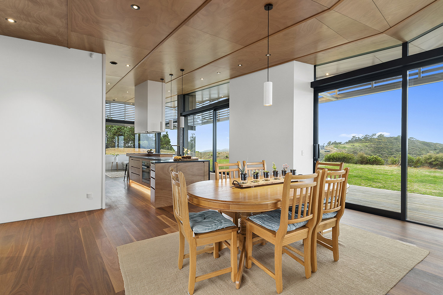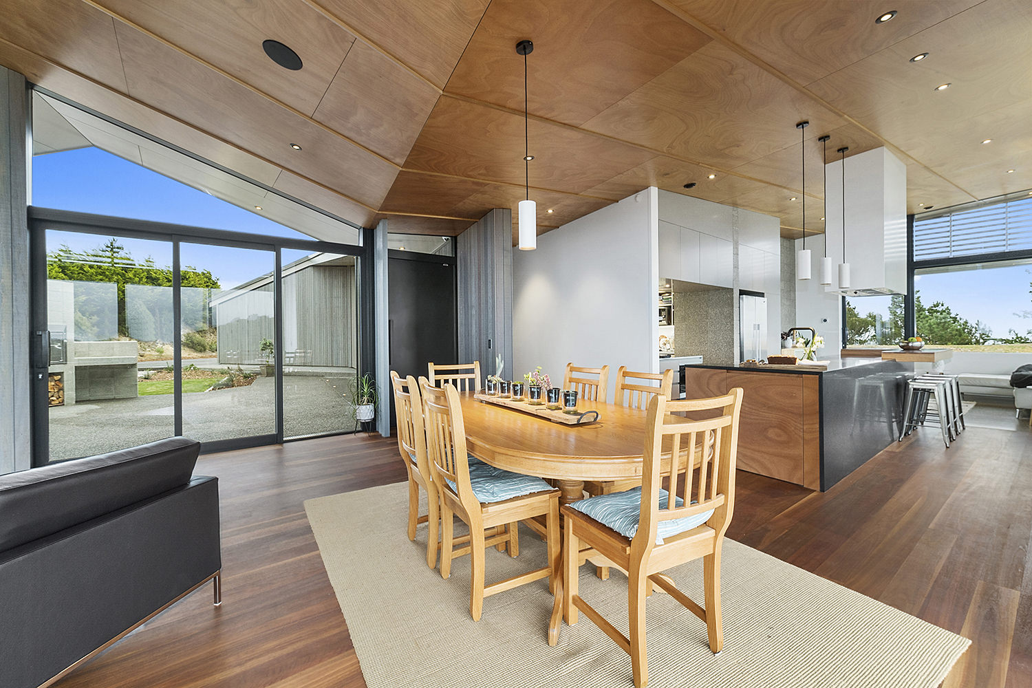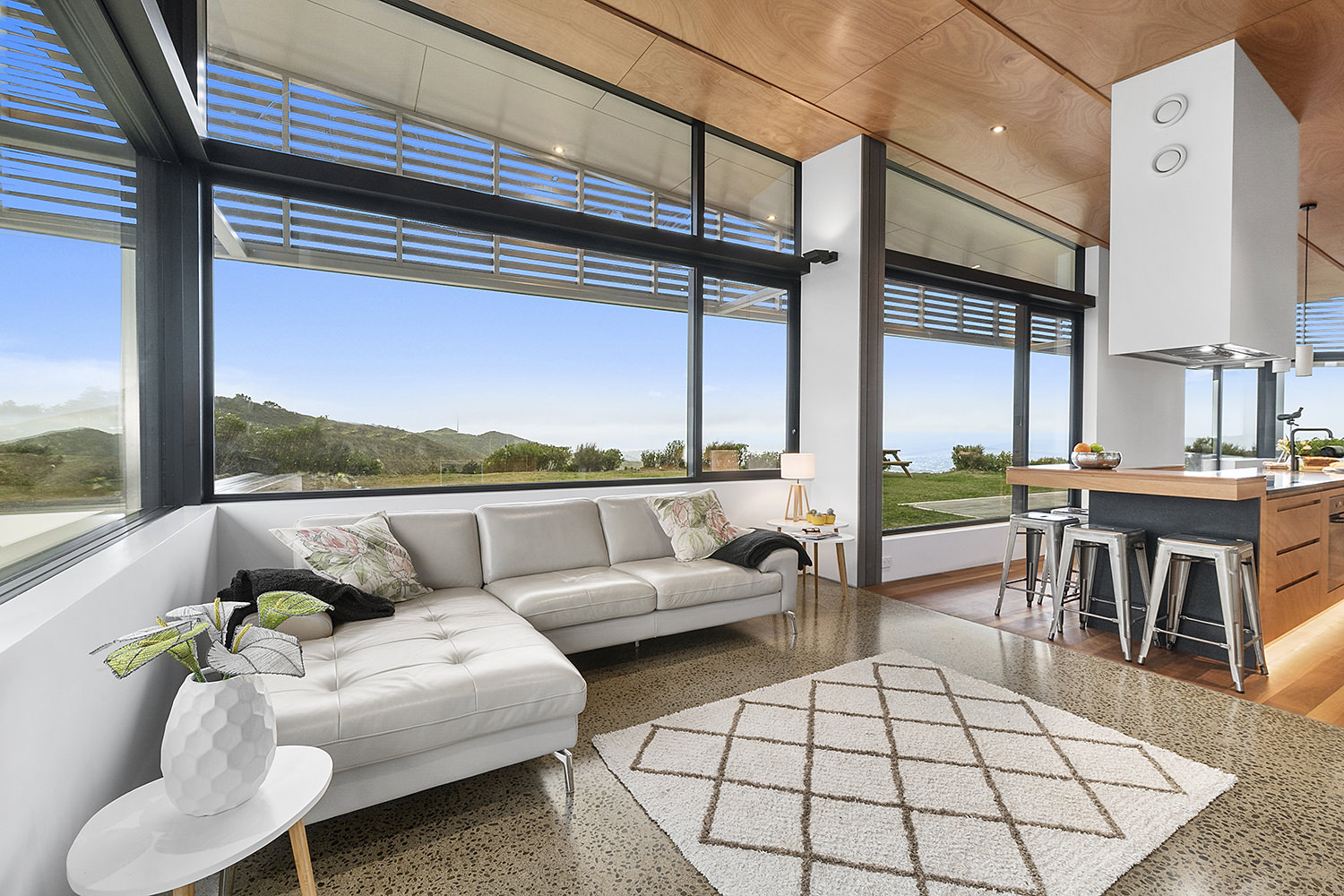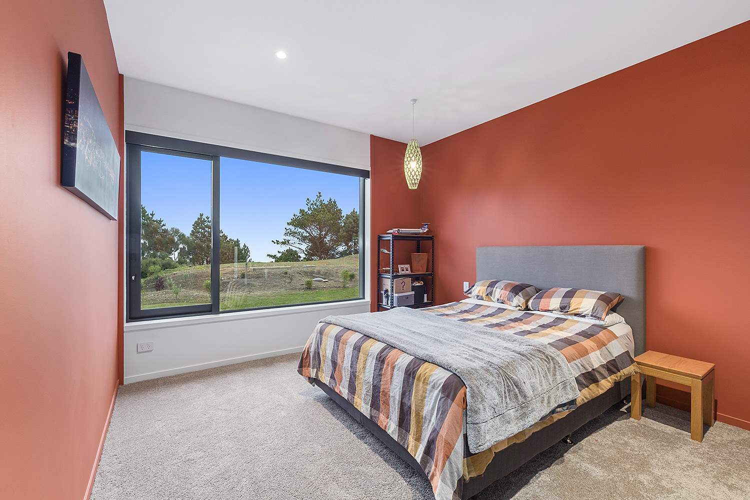 A hybrid city-country home, this architecturally designed home frames views over Wellington from the comfort of its secluded hilltop. The structure exists in harmony with the land while offering sheltered and sunny alfresco living spaces. Oiled cedar and zinc cladding ensures enduring good looks in the unforgiving climate. The skillion ceiling delivers a dynamic feeling of space in the main living area. Areas of floor-to-ceiling glass enhance the open connection with nature. The four-bedroom, three-bathroom layout offers parents and children their own wings. These converge in the shared social spaces. Separate living doubles as a guest room with access to an adjacent bathroom. The energy-efficient interiors stay exceptionally cosy thanks to in-slab hydronic underfloor heating and passive solar heating. Exposed concrete floors and block walls retain the sun’s warmth. Alfresco living areas include a sheltered courtyard with outdoor oven, plus wood storage to feed the fire. This is luxurious living at its understated best.