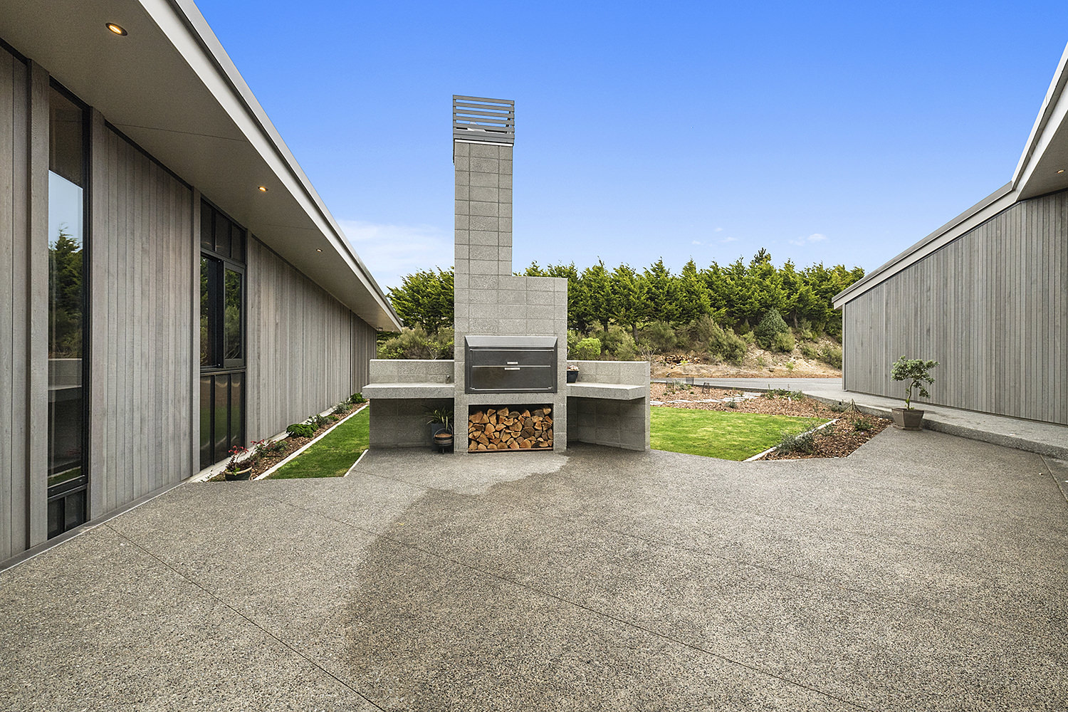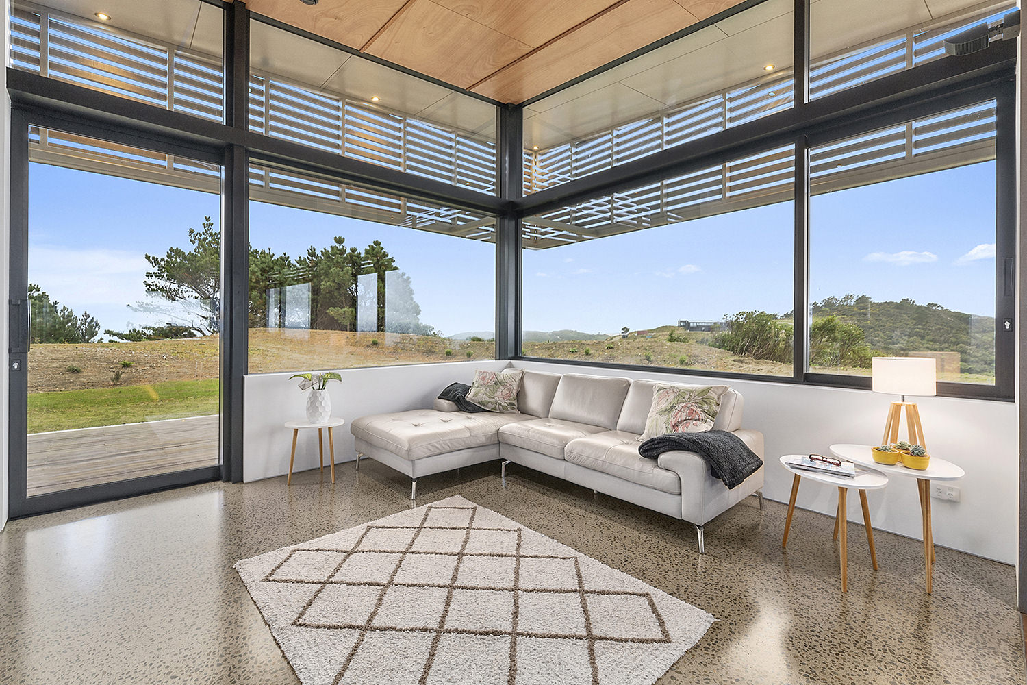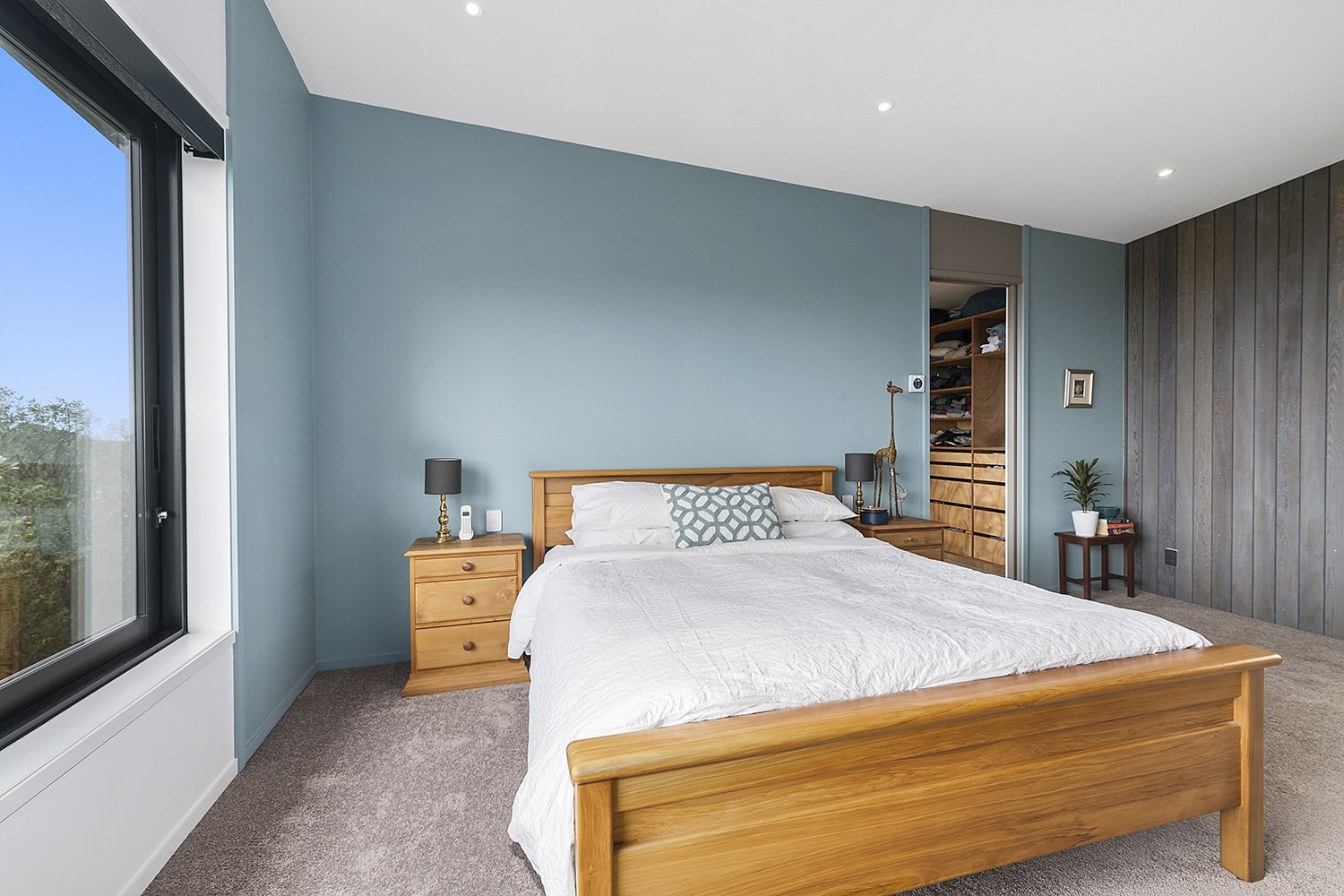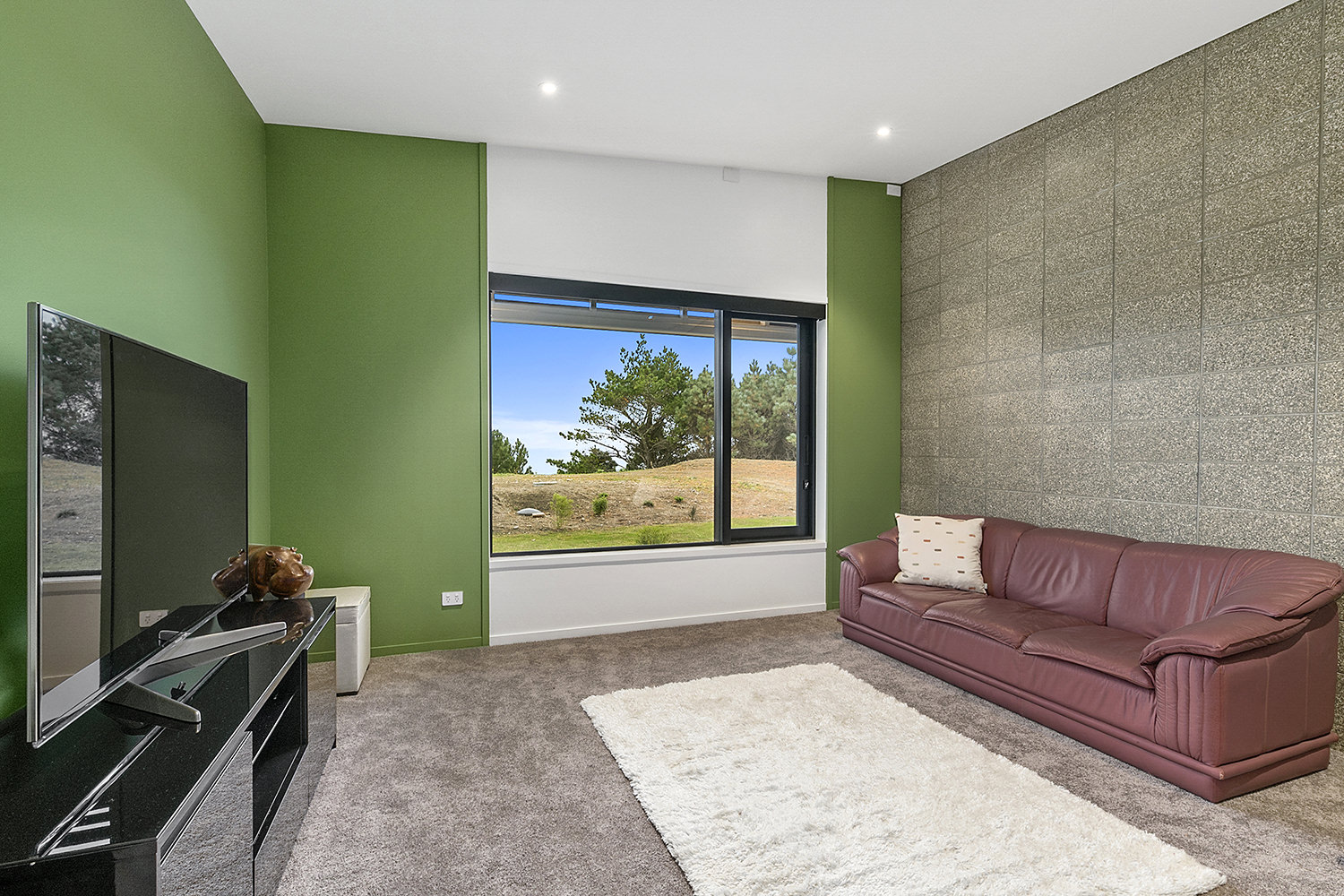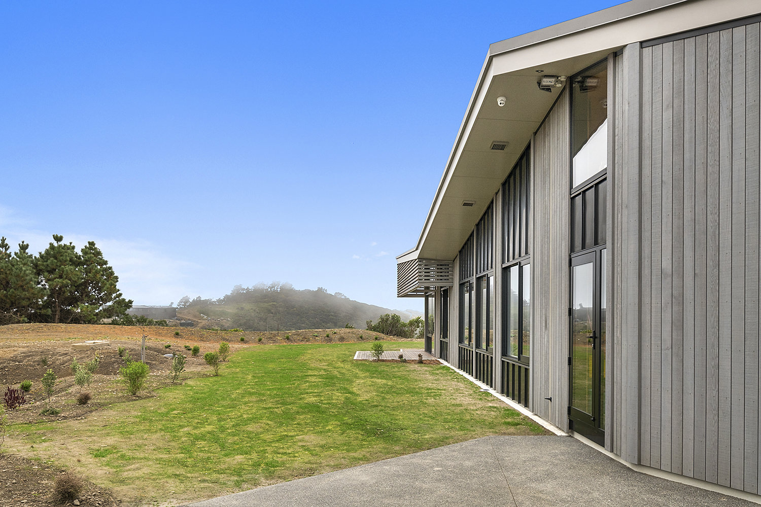 A hybrid city-country home, this architecturally designed home frames views over Wellington from the comfort of its secluded hilltop. The structure exists in harmony with the land while offering sheltered and sunny alfresco living spaces. Oiled cedar and zinc cladding ensures enduring good looks in the unforgiving climate. The skillion ceiling delivers a dynamic feeling of space in the main living area. Areas of floor-to-ceiling glass enhance the open connection with nature. The four-bedroom, three-bathroom layout offers parents and children their own wings. These converge in the shared social spaces. Separate living doubles as a guest room with access to an adjacent bathroom. The energy-efficient interiors stay exceptionally cosy thanks to in-slab hydronic underfloor heating and passive solar heating. Exposed concrete floors and block walls retain the sun’s warmth. Alfresco living areas include a sheltered courtyard with outdoor oven, plus wood storage to feed the fire. This is luxurious living at its understated best.