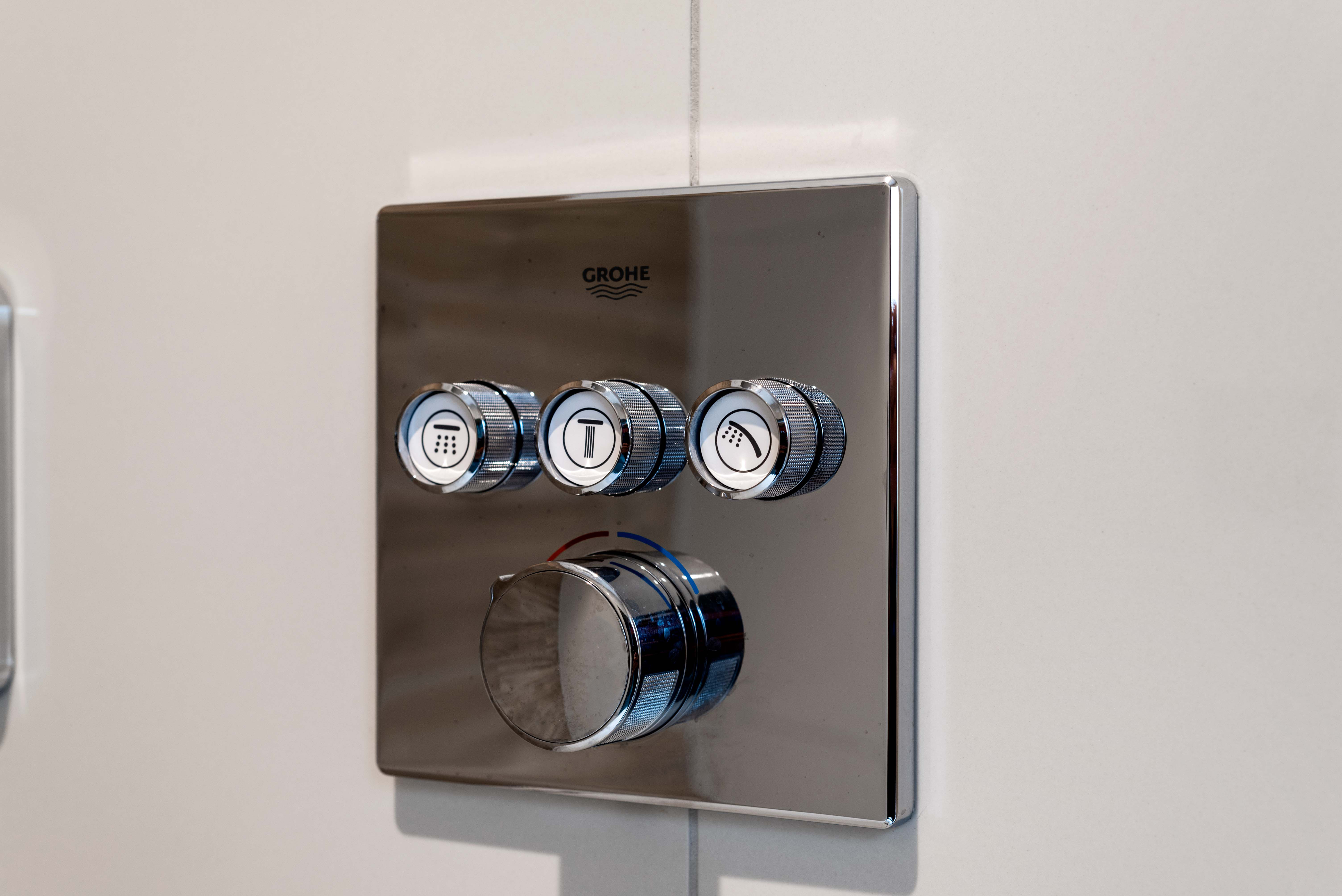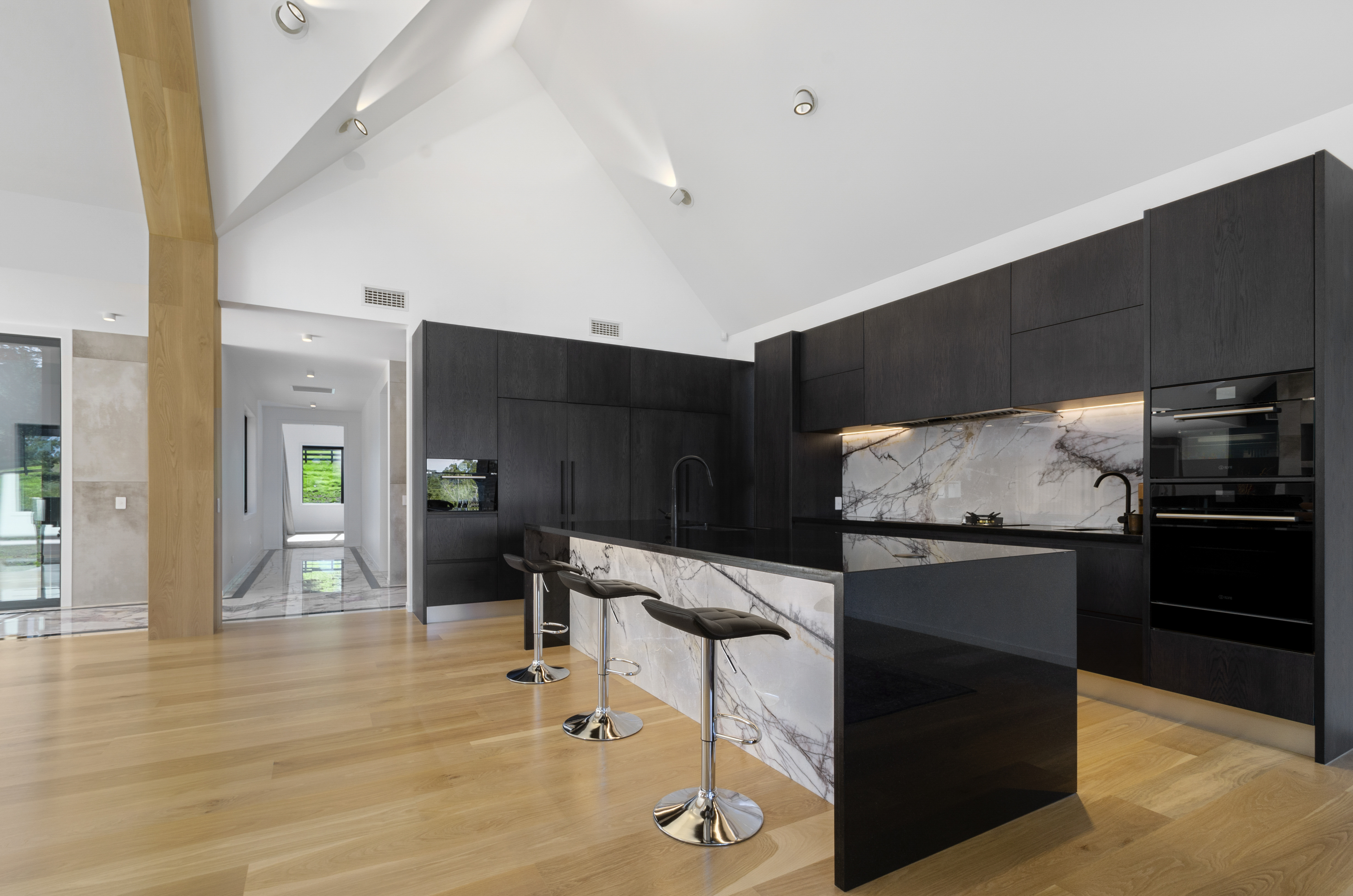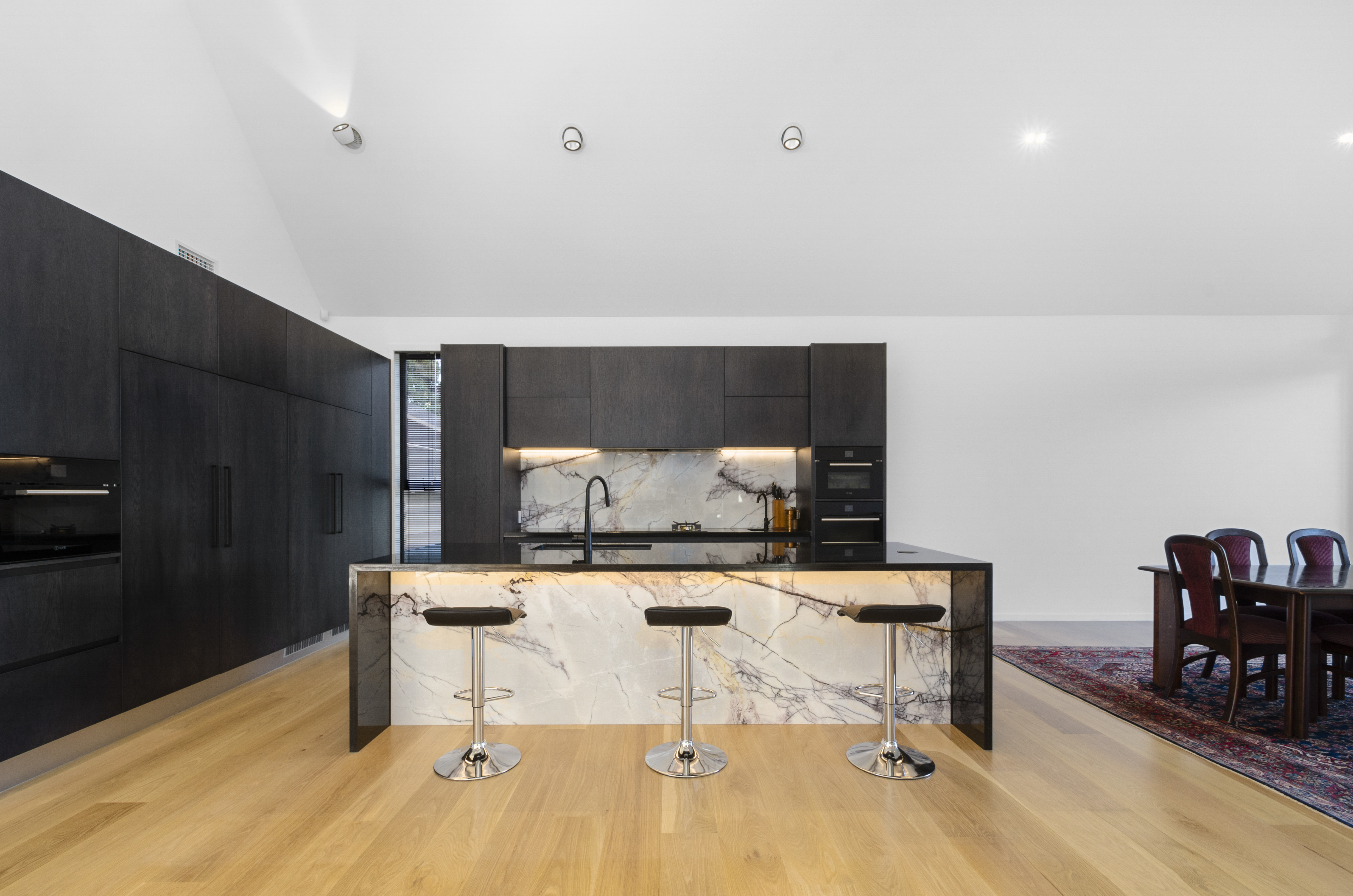 The attention to detail is apparent with negative lighting illuminating both the opulent marble splashback and the island toe-kick in the entertainer’s kitchen.