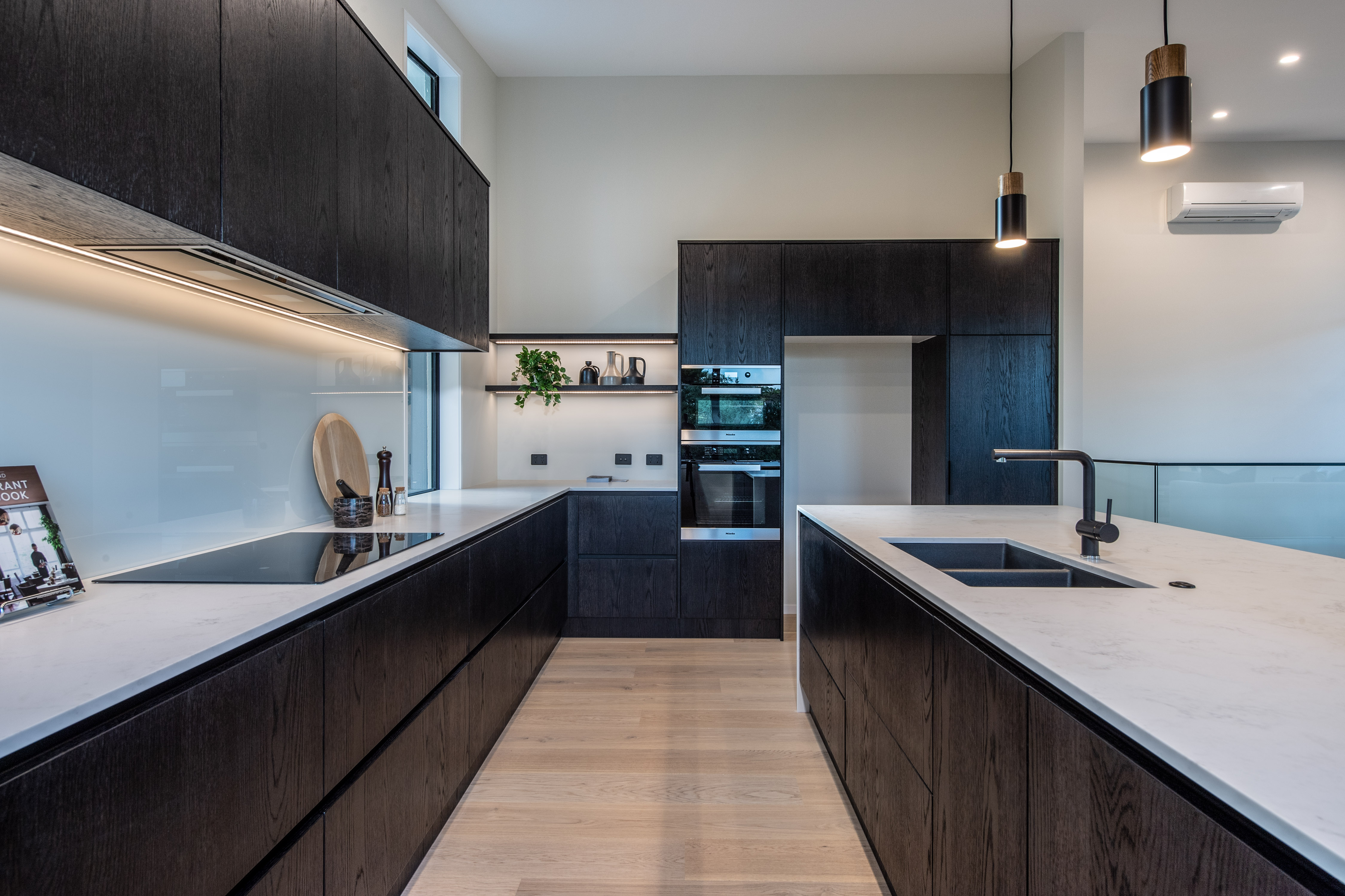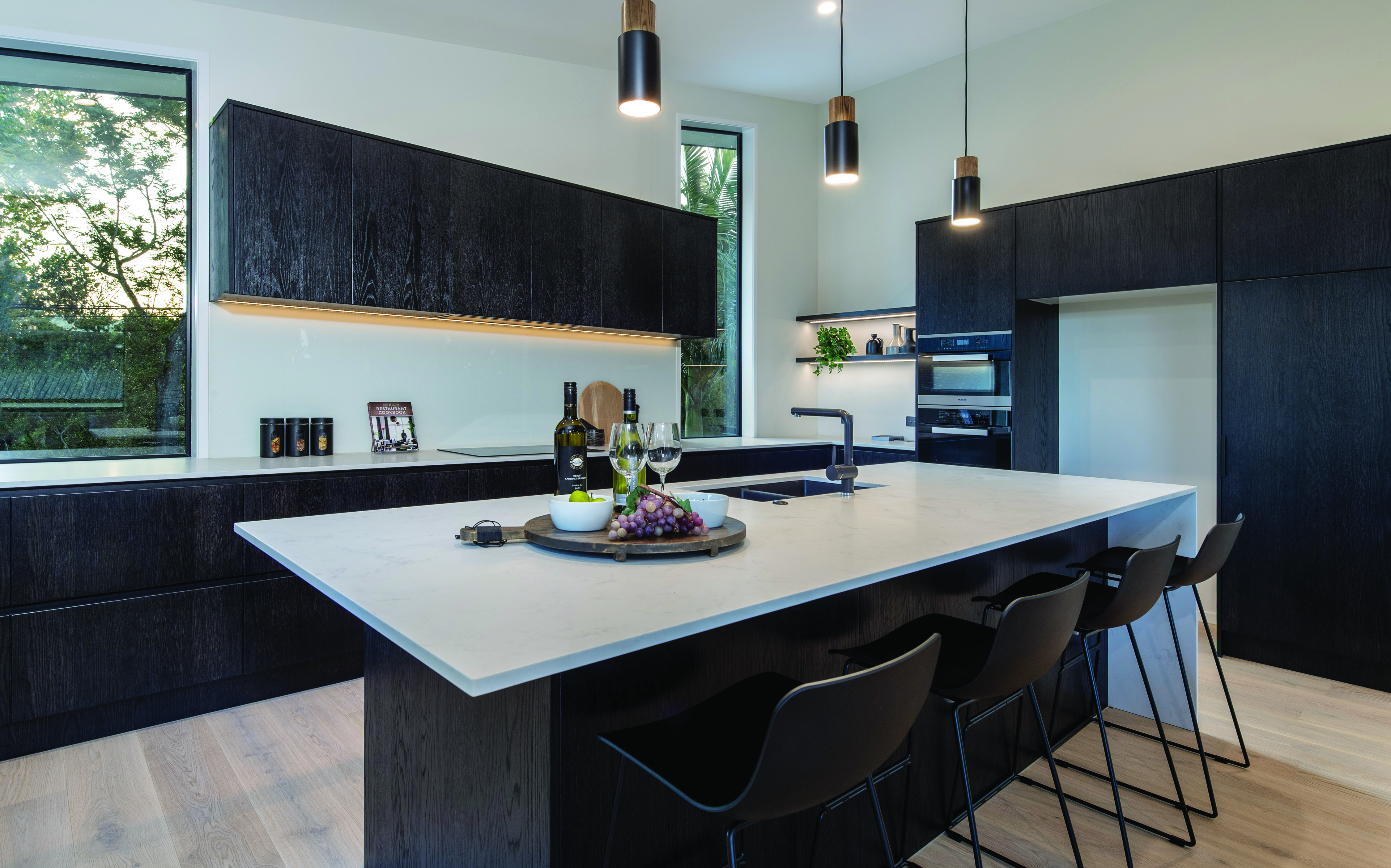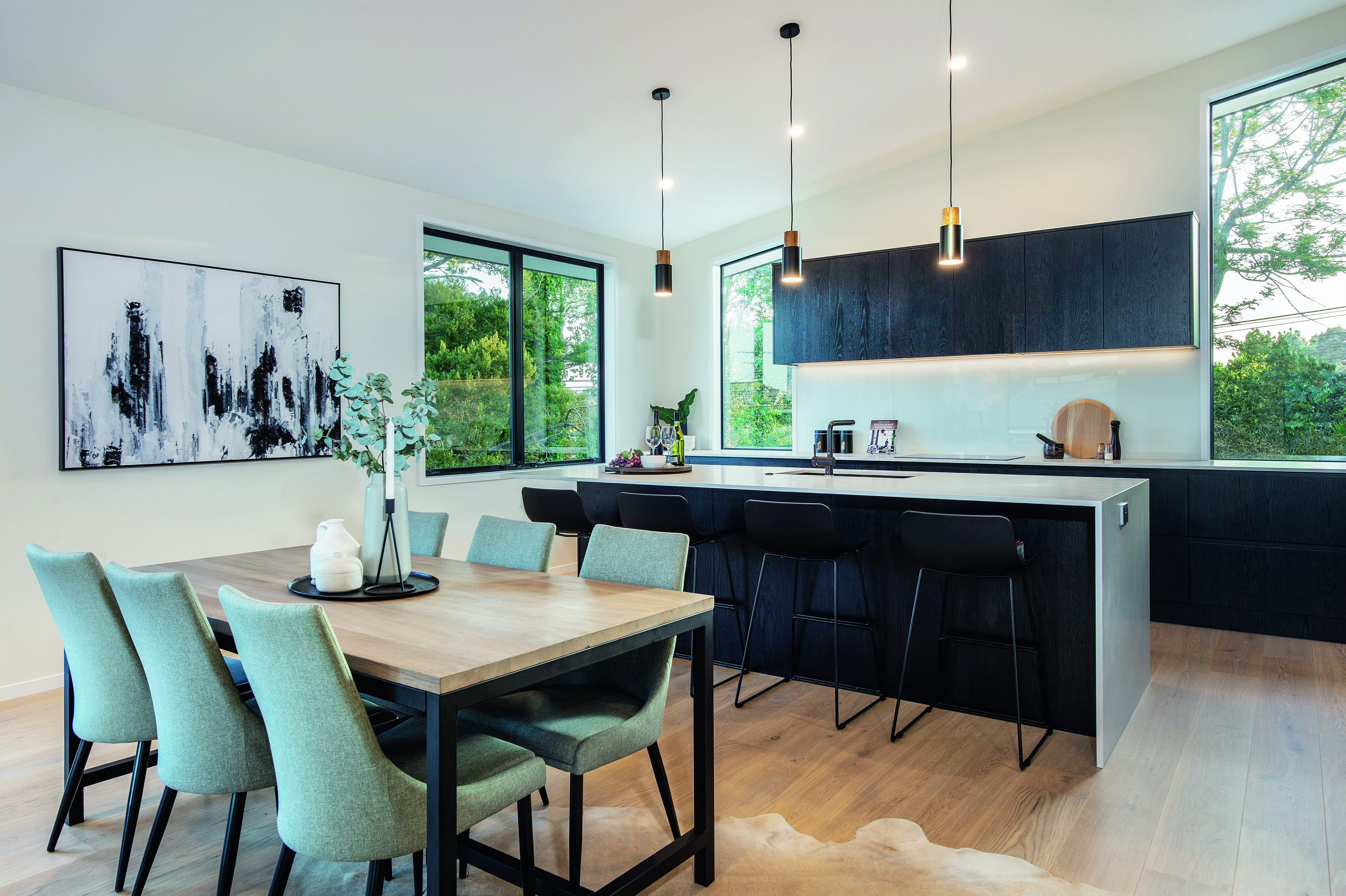 The detailed kitchen with central island makes preparing meals in company a pleasure. A mix of lighting styles creates subtle interest and ambience. Designer fittings deliver added luxury throughout.