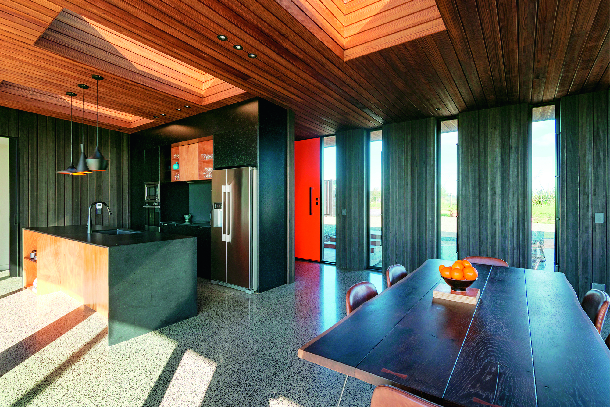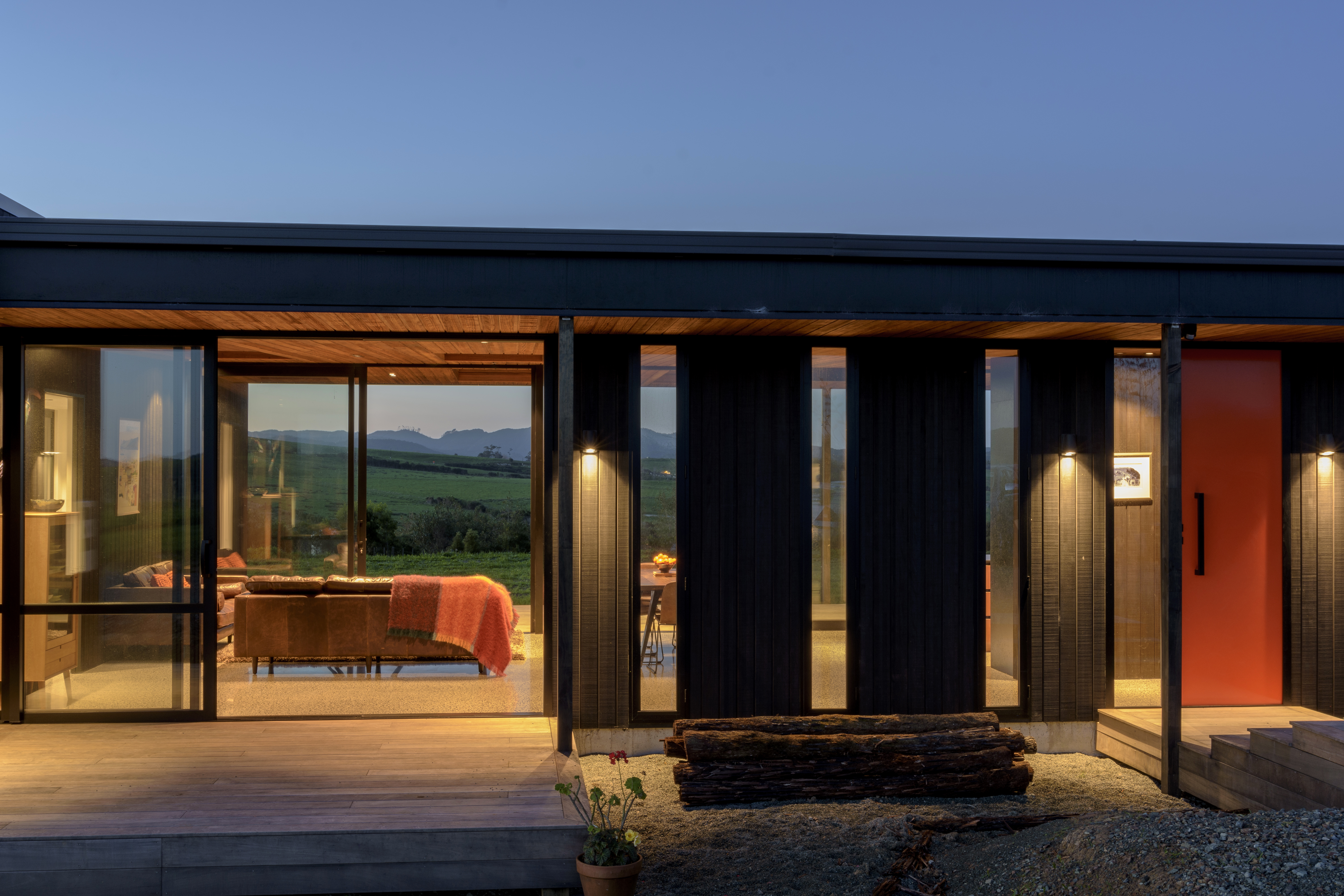 Polished concrete floors look sleek as they bask in passive solar gain. Flush rebated joinery in the glass sliding doors creates a seamless transition to the outdoors. Open or closed, large glass sliders enhance the connection to the dramatic scenery. From the safety and comfort of a cosy living space, who wouldn’t enjoy the odd passing storm?