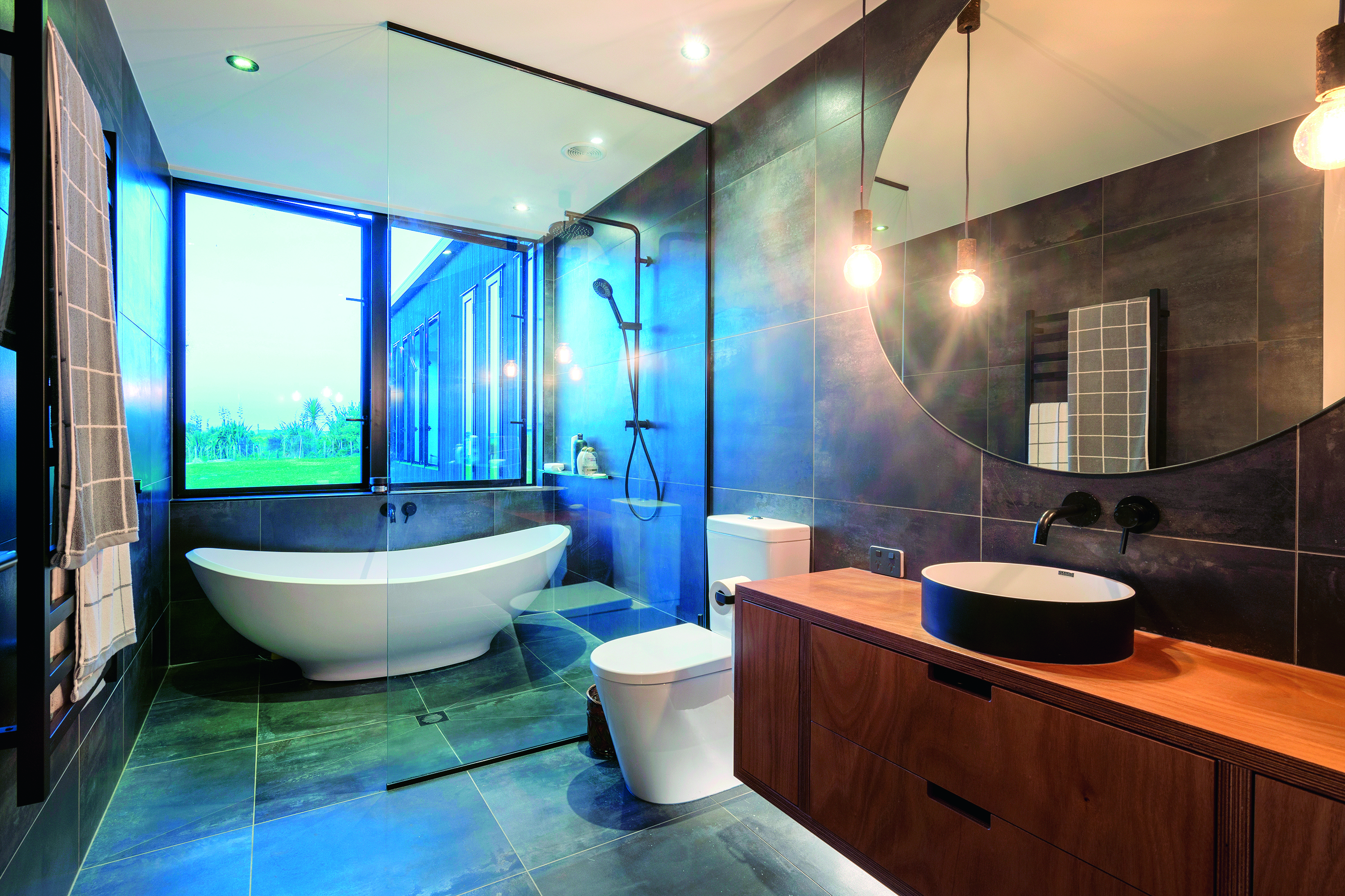 A second lounge delivers secluded comfort. For more me-time, retreat to the stunning tiled bathroom with crescent tub for soaking up the scenery. At the other extreme from warming cedar, large grey tiles evoke the feeling of moody skies rolling in.