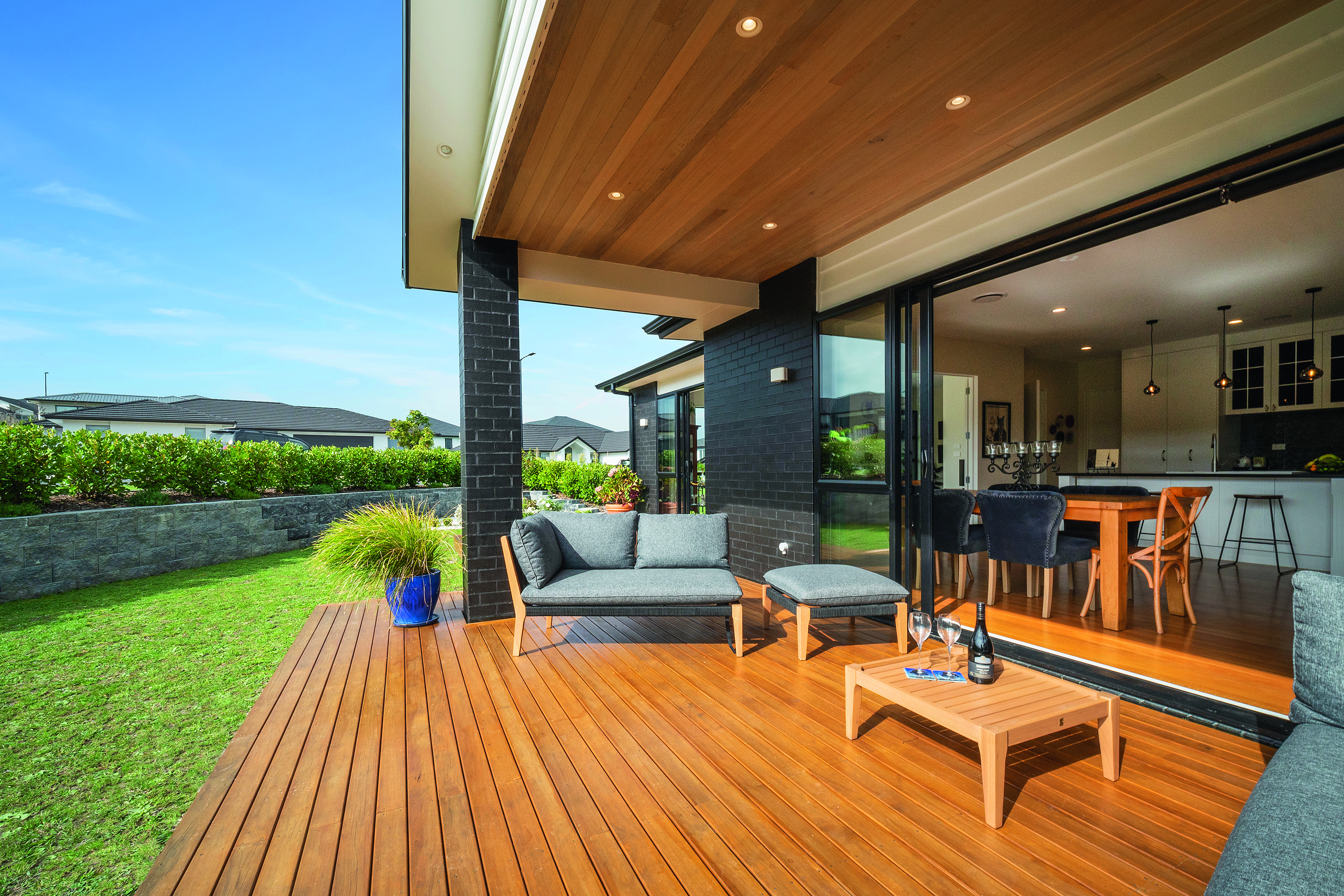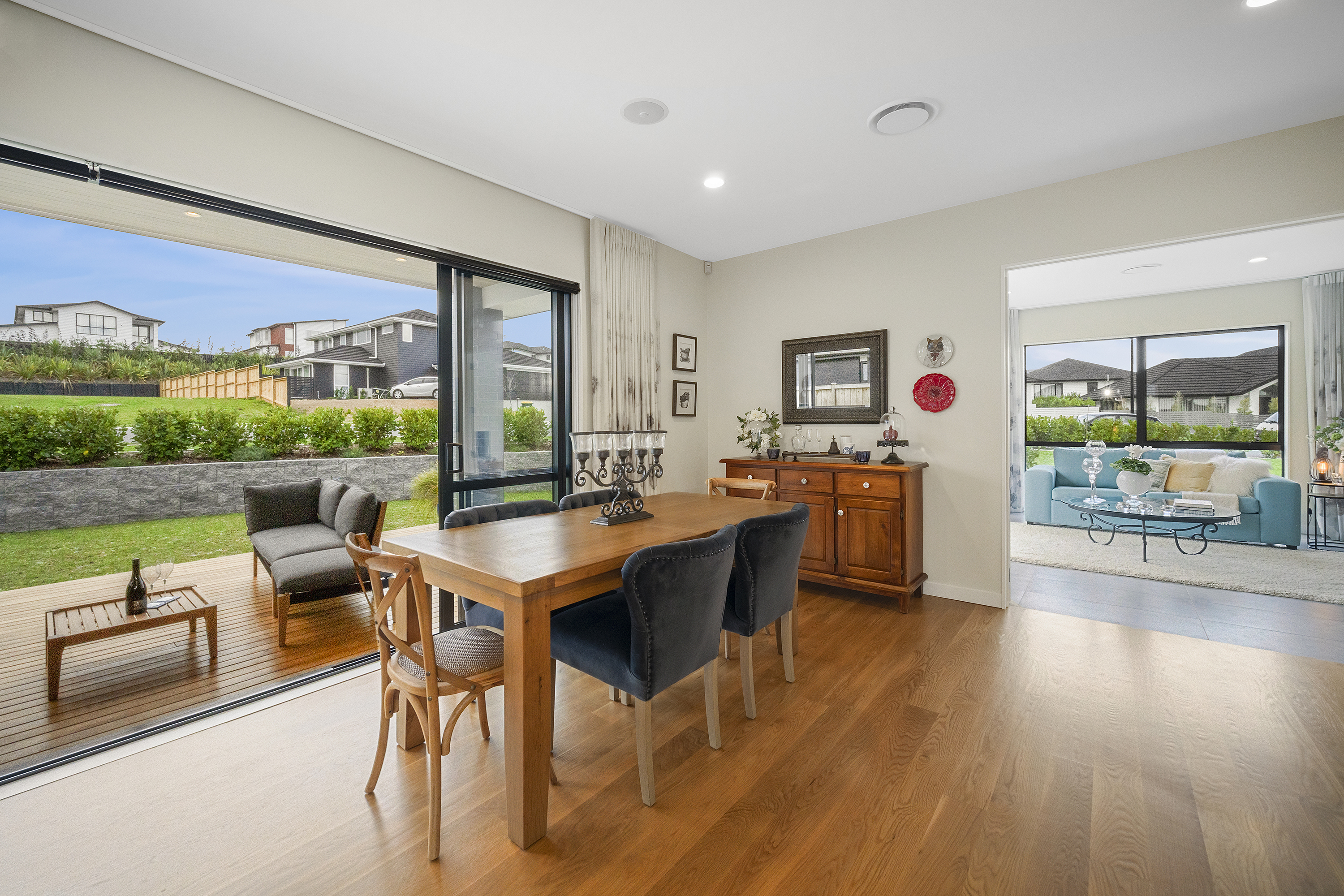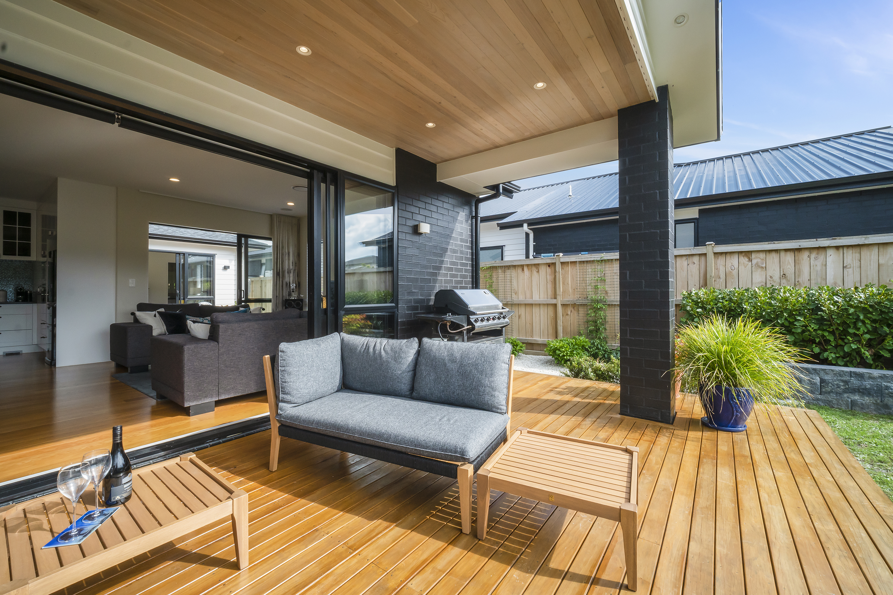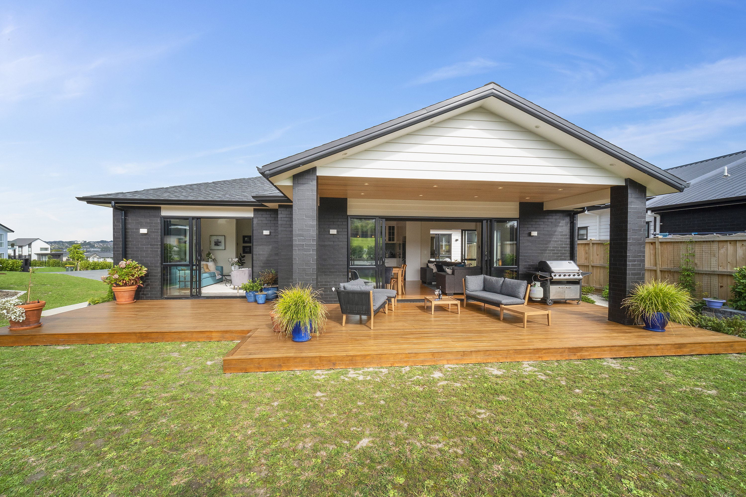 The open-plan sitting area and large separate family room provide options for luxurious lounging. These mirror the main alfresco space with its choice of sheltered portico or sun-drenched deck. Landscaping subtly aids privacy while retaining the open feel.
