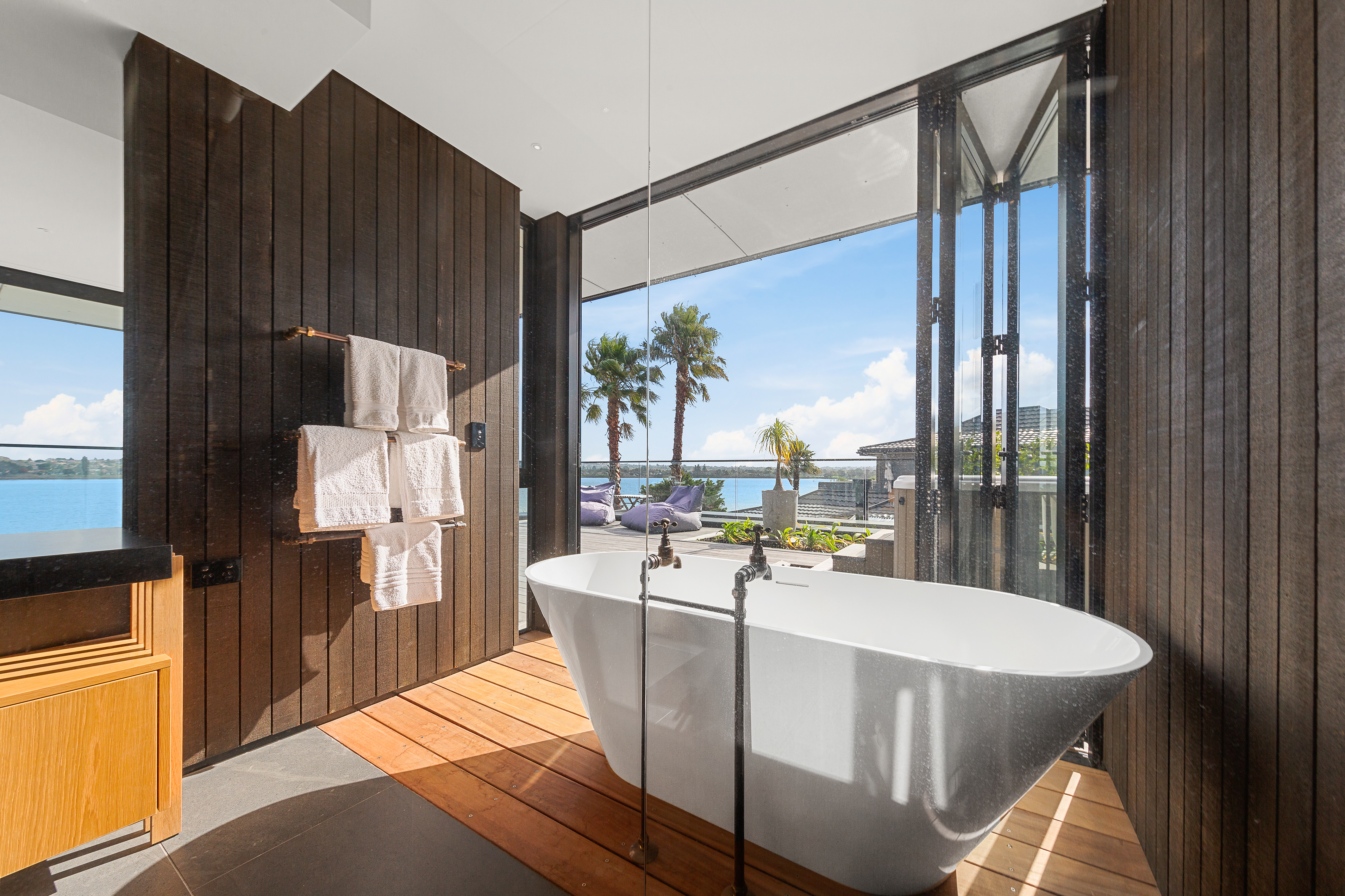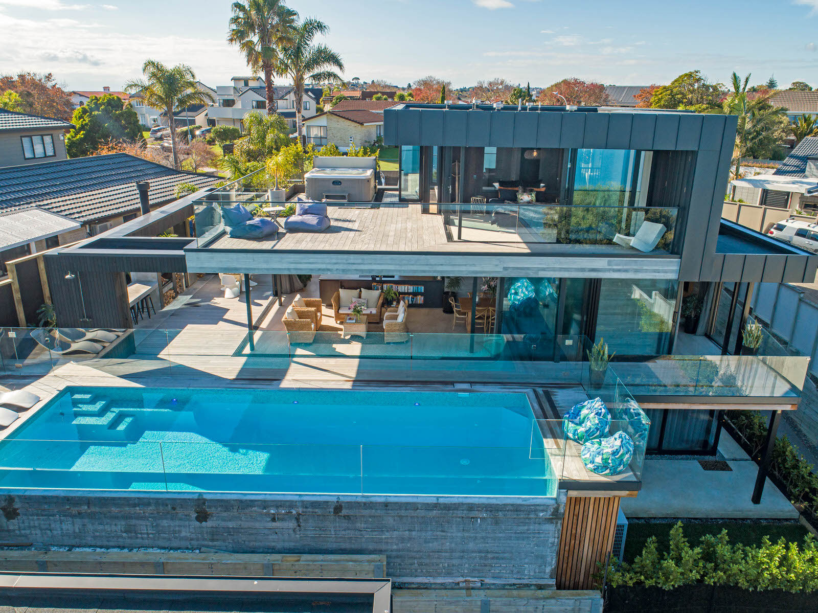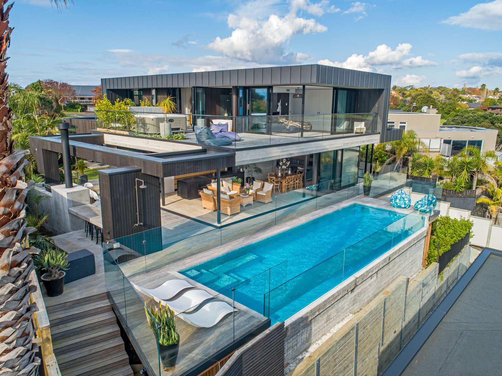 Floor-to-ceiling glass opens the 475sqm interior to views over East Tamaki and Mt Wellington to the city. Alfresco living includes a stunning outdoor kitchen and dining space. Five bedrooms, four bathrooms and two living spaces offer luxury and flexibility inside.
