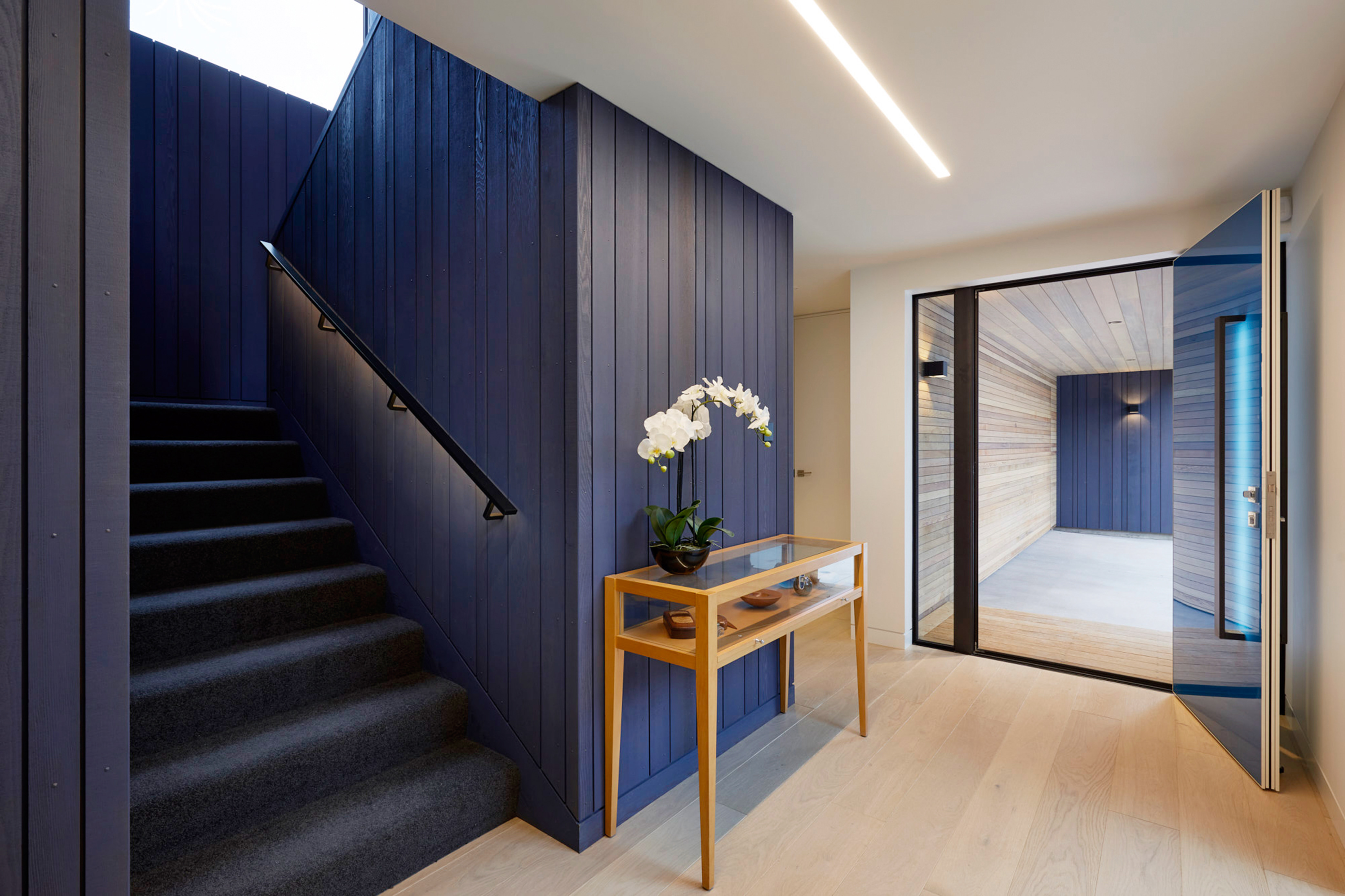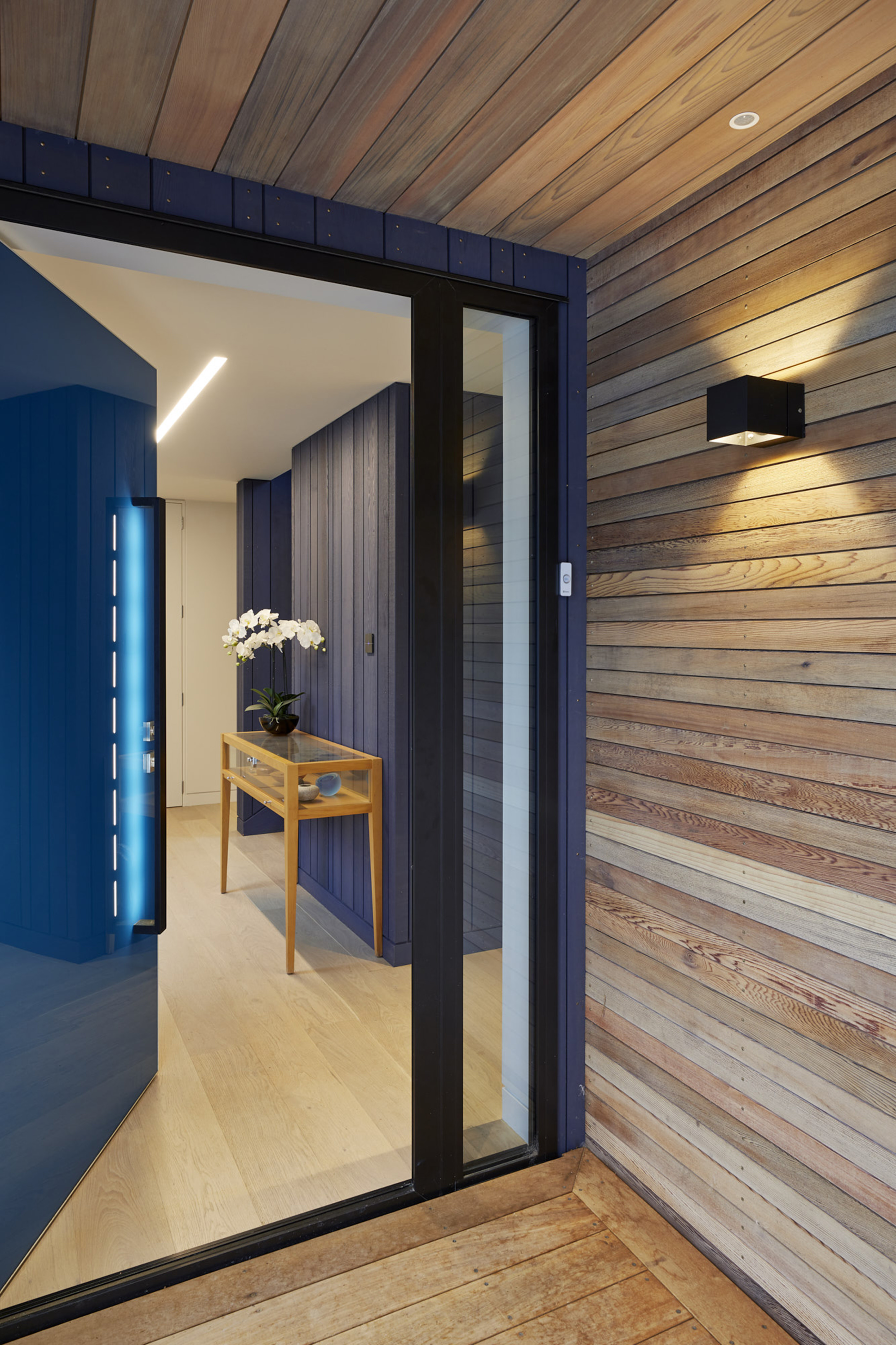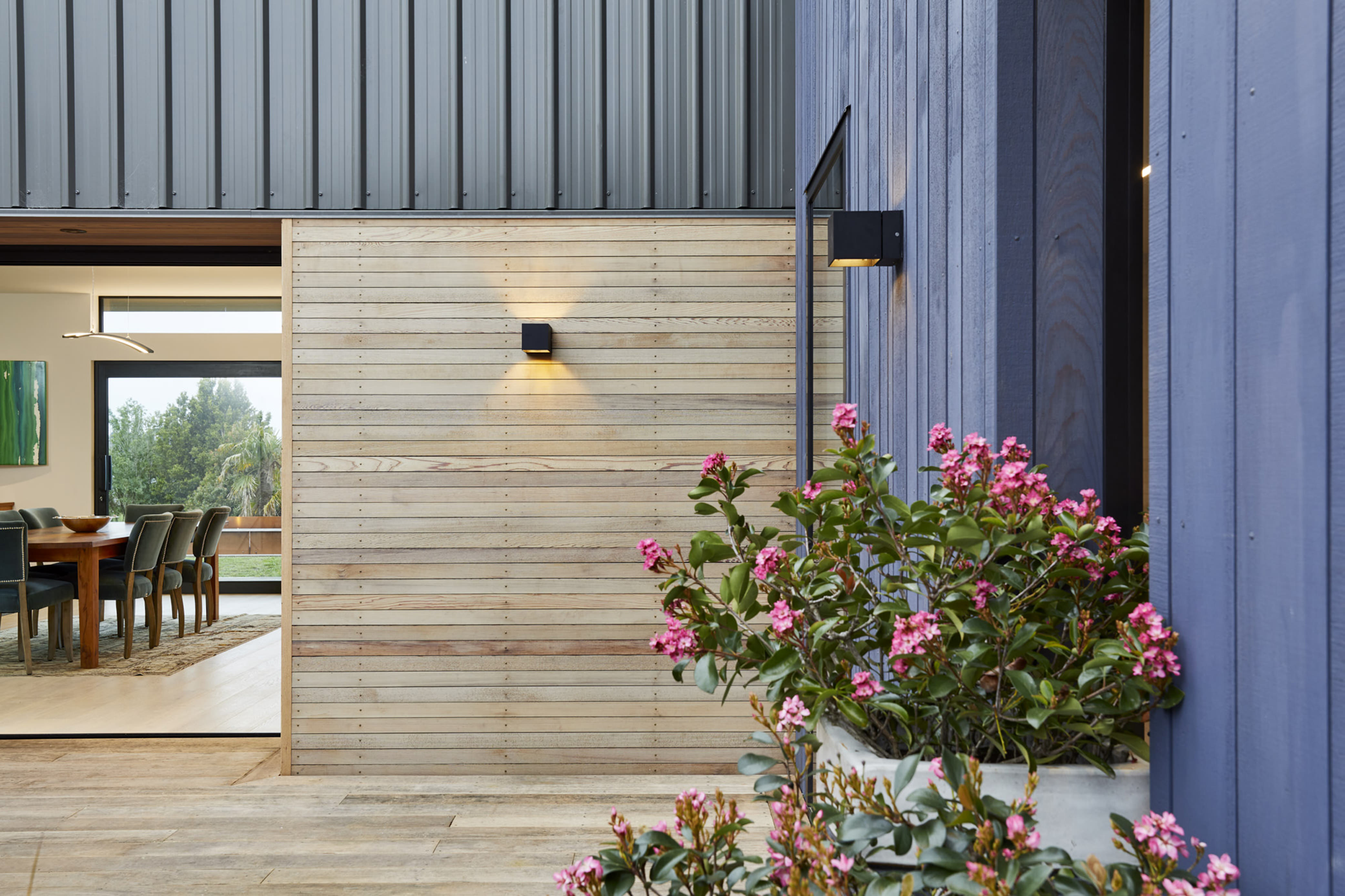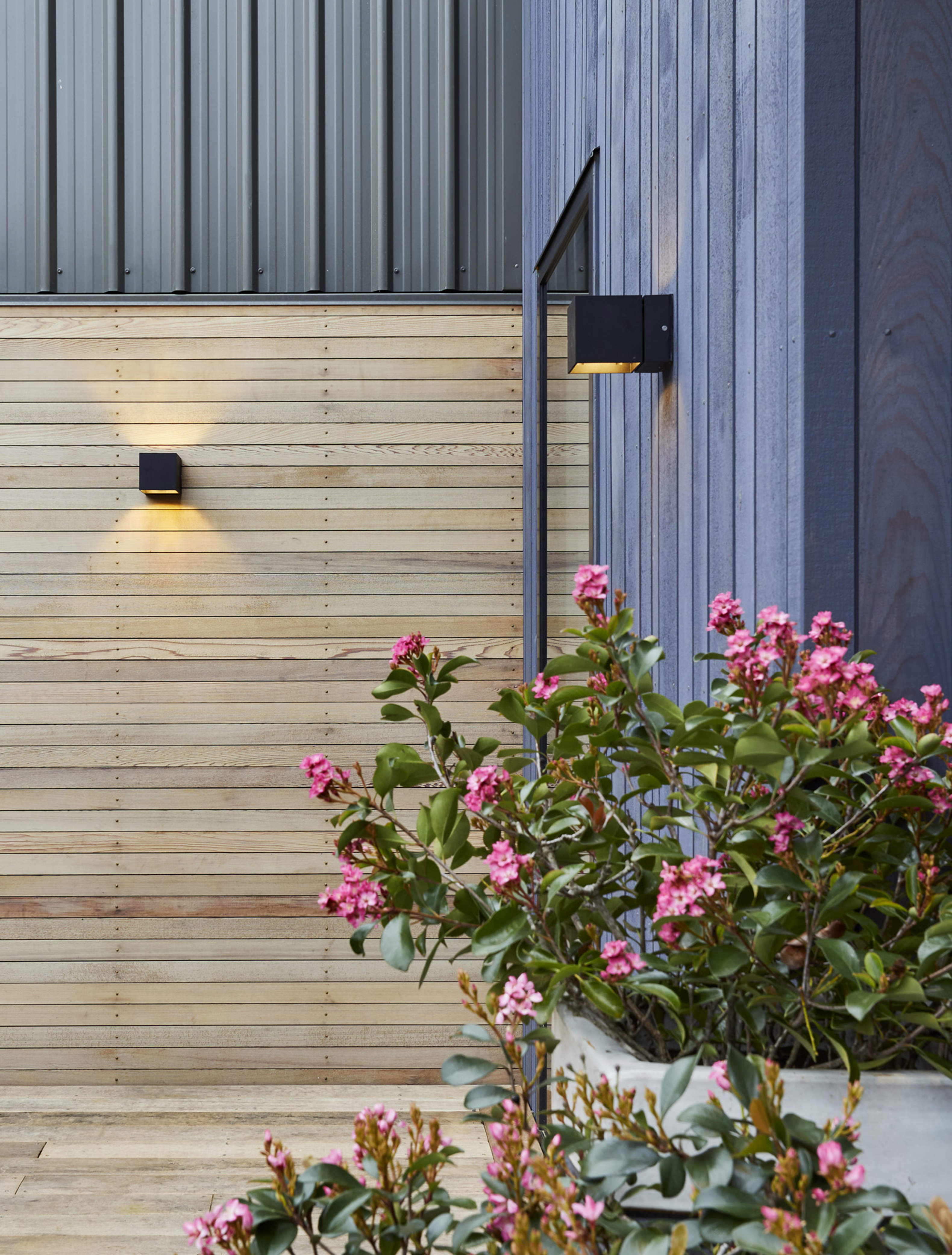 The exterior is clad in iron and a combination of vertical and horizontal cedar. Attention to detail is evident in the continuous lines and flush mouldings, such as the garage door’s integration. Cedar cladding has also been utilised for interior feature walls.