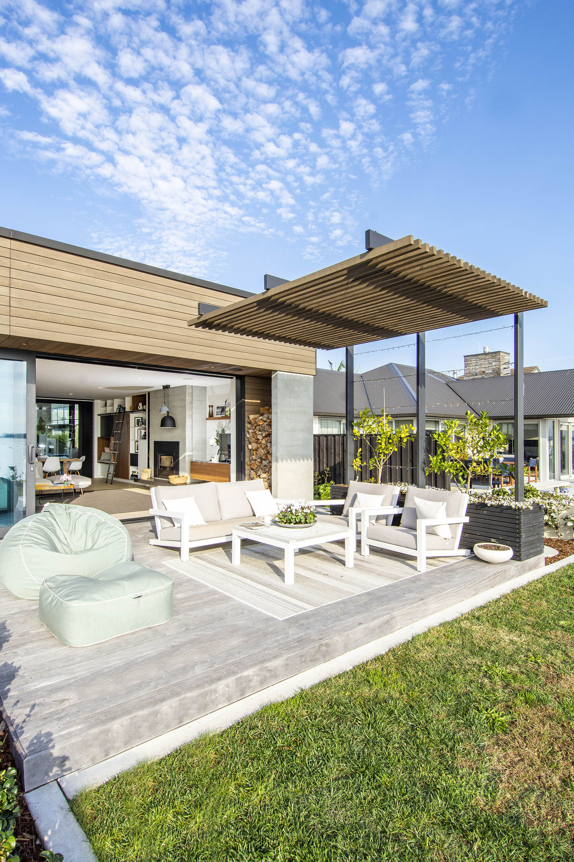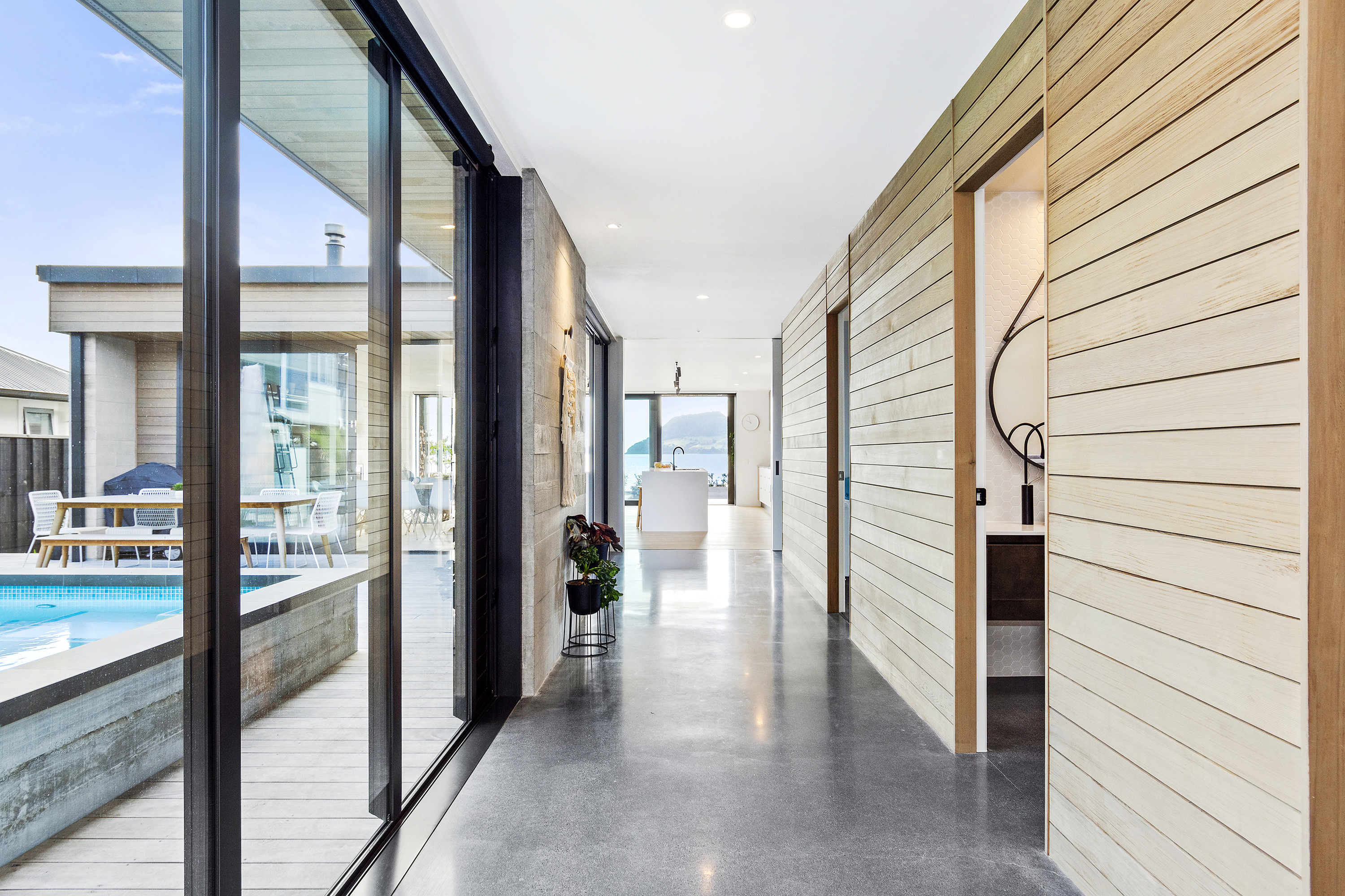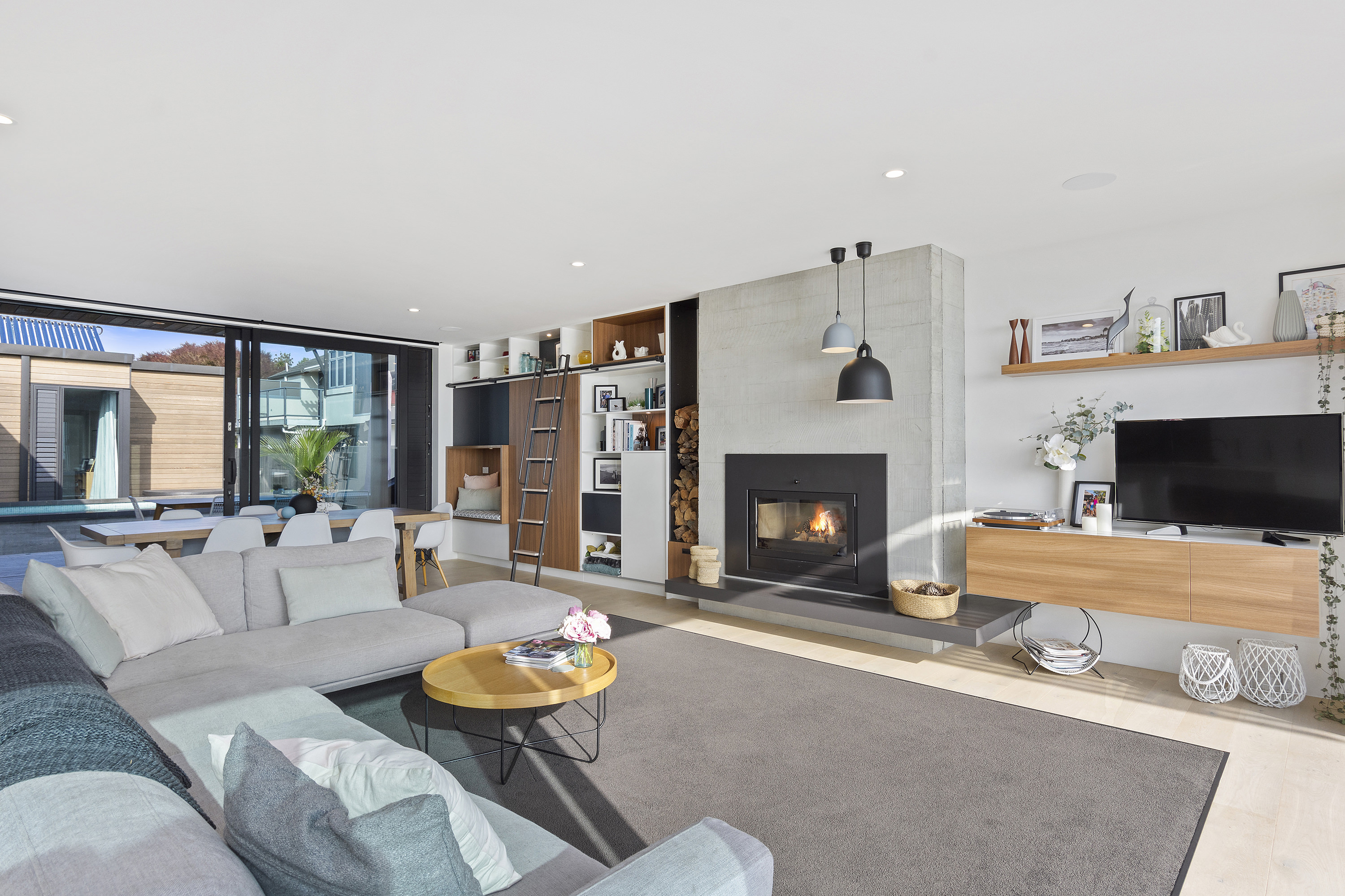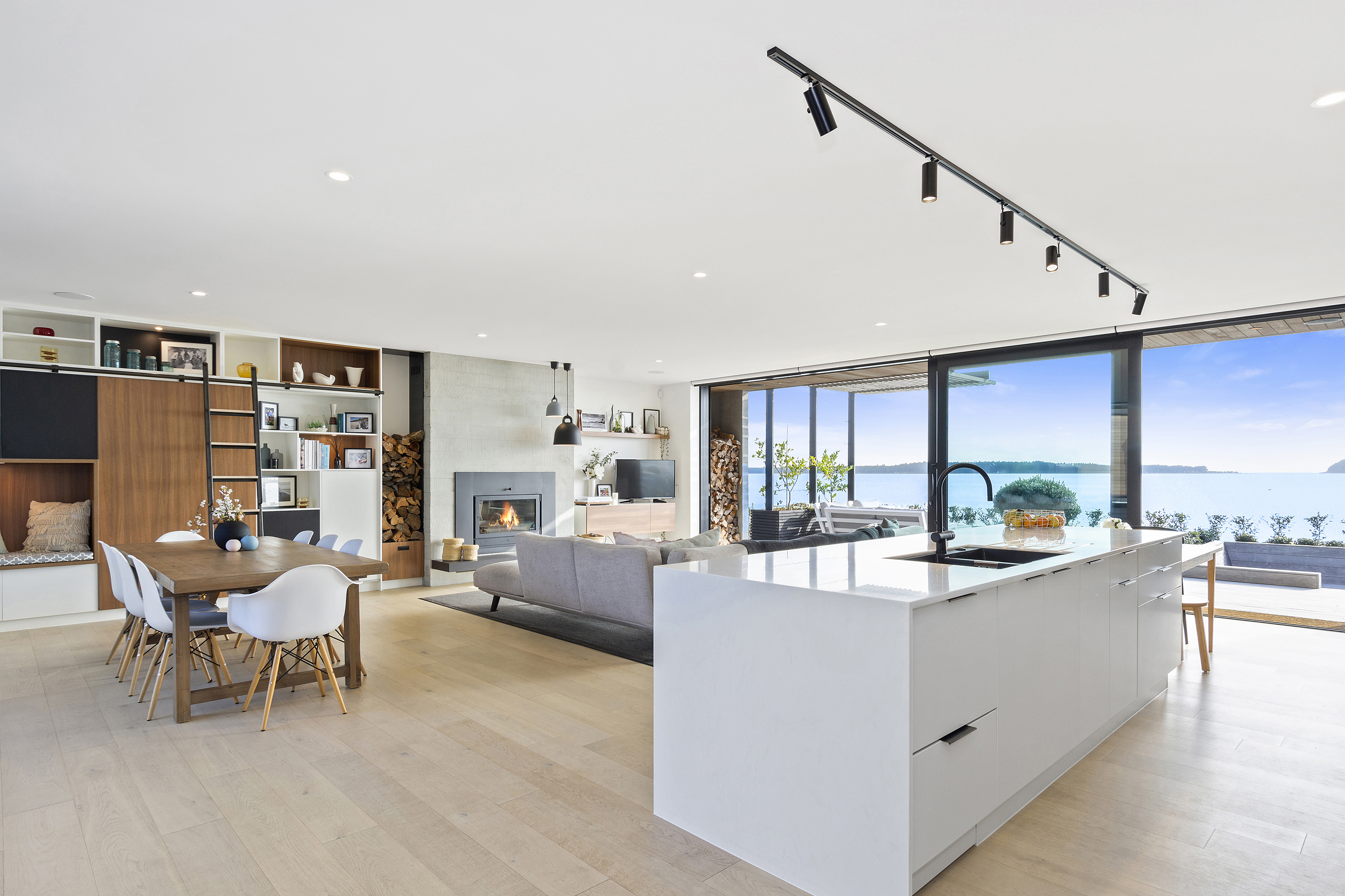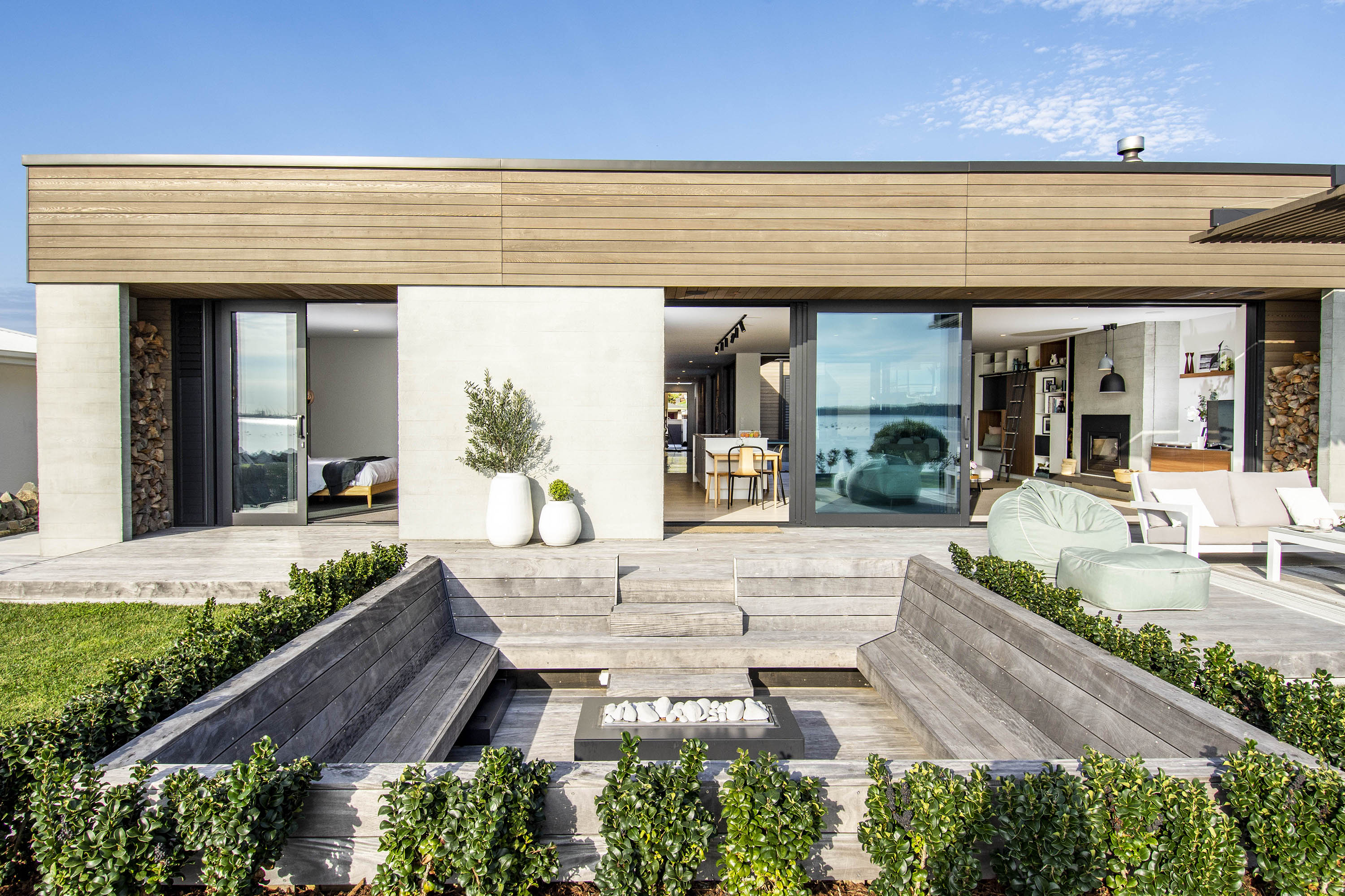 Outdoor living is key to this design. The flow from the courtyard pool and spa area through the open-plan interior to sunken seating at the waterfront has been shrewdly considered. Smart solar heats the pool and hot water during summer. In winter the underfloor heating and radiators are fed by the wood burner.