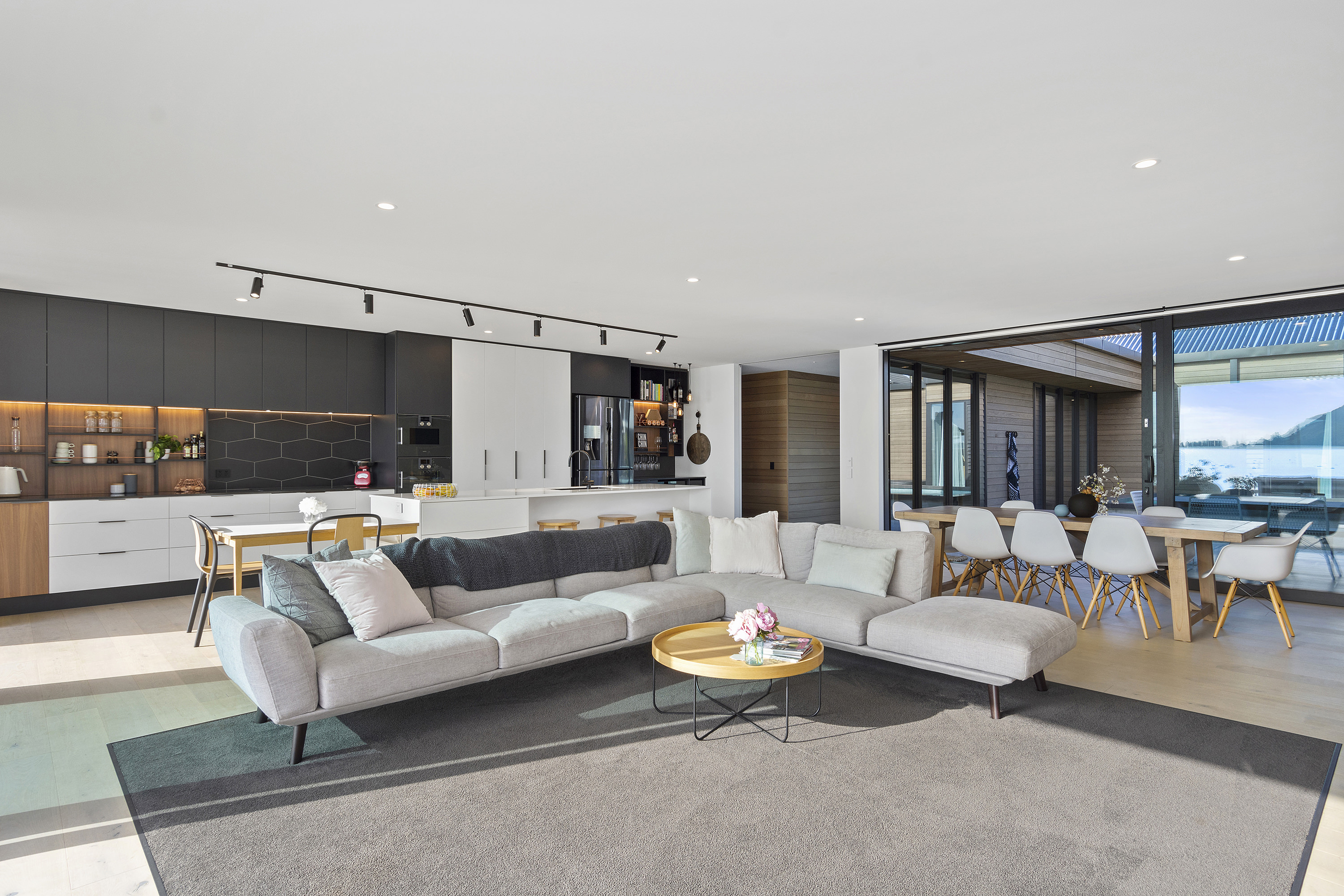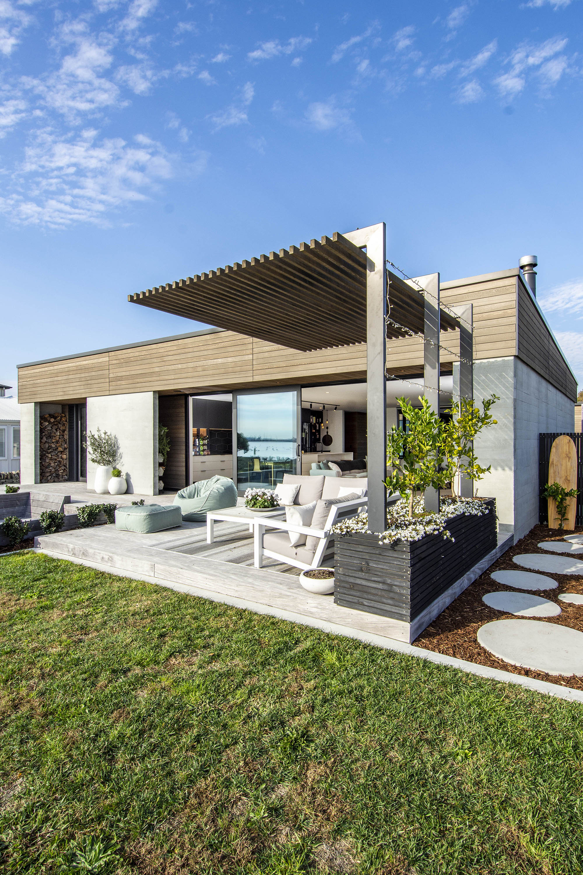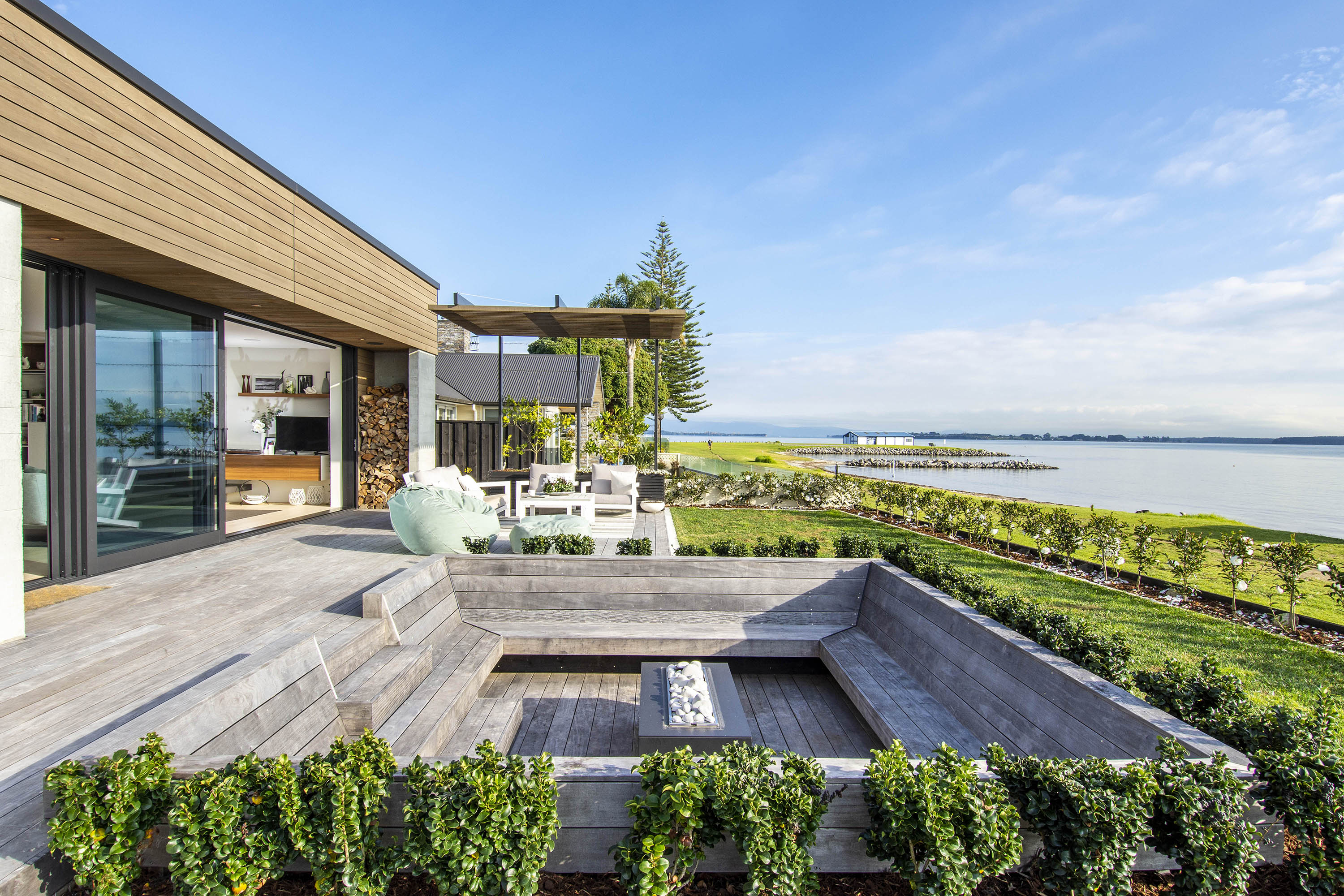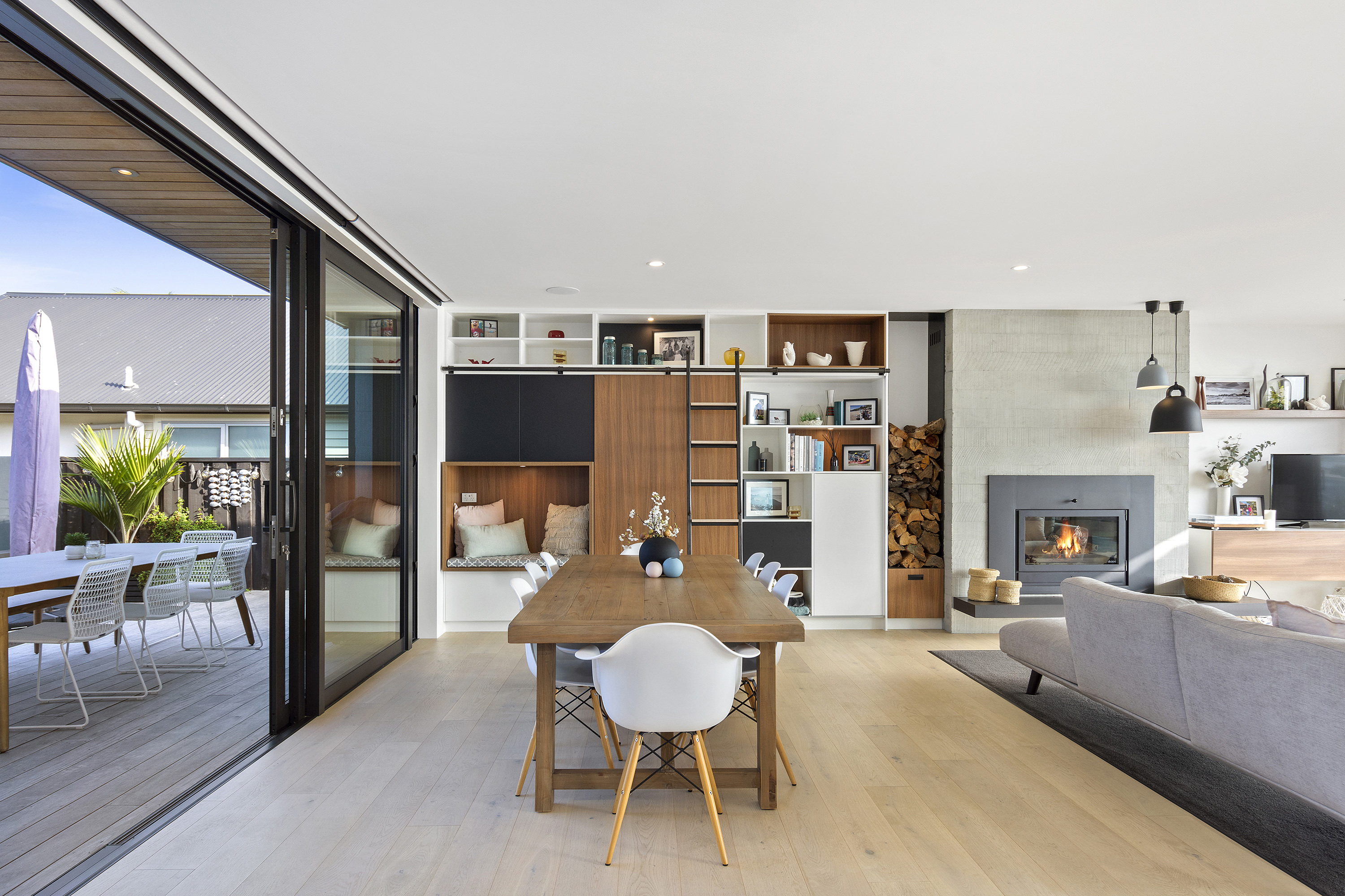 Outdoor living is key to this design. The flow from the courtyard pool and spa area through the open-plan interior to sunken seating at the waterfront has been shrewdly considered. Smart solar heats the pool and hot water during summer. In winter the underfloor heating and radiators are fed by the wood burner.