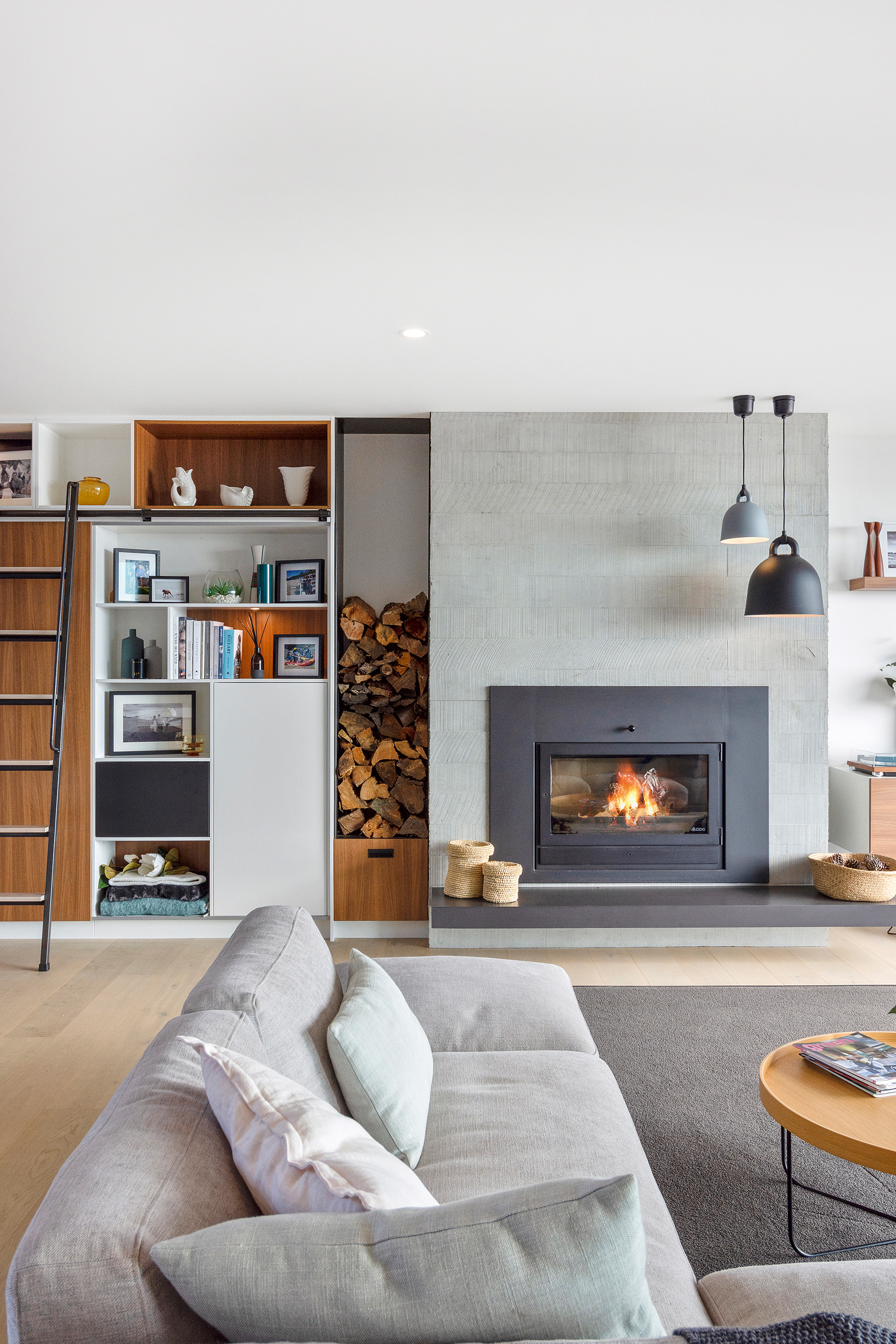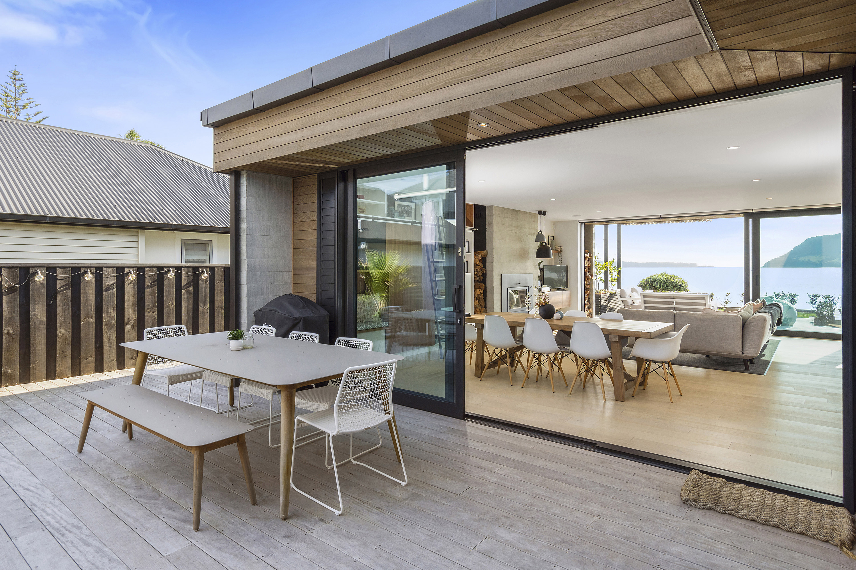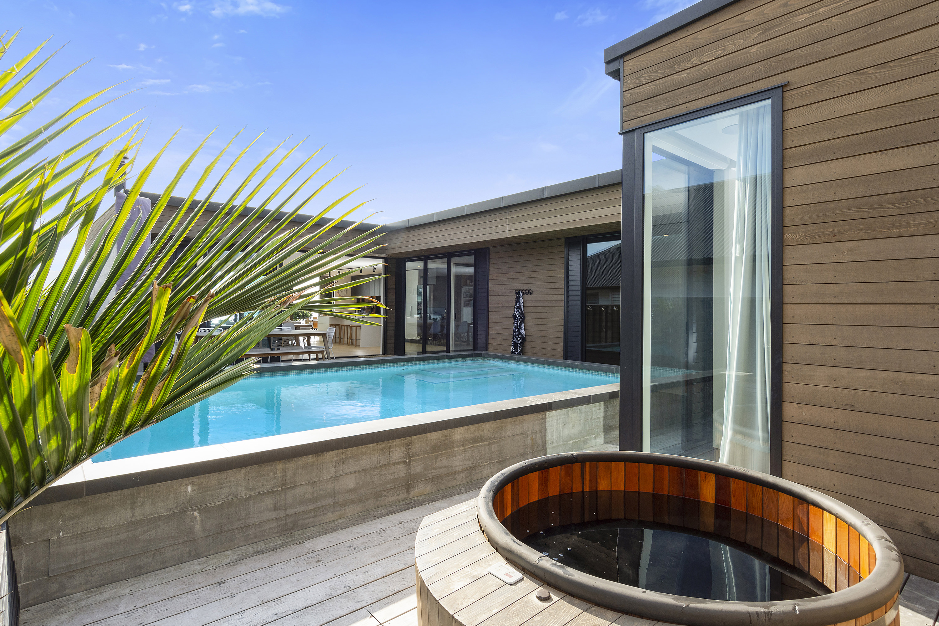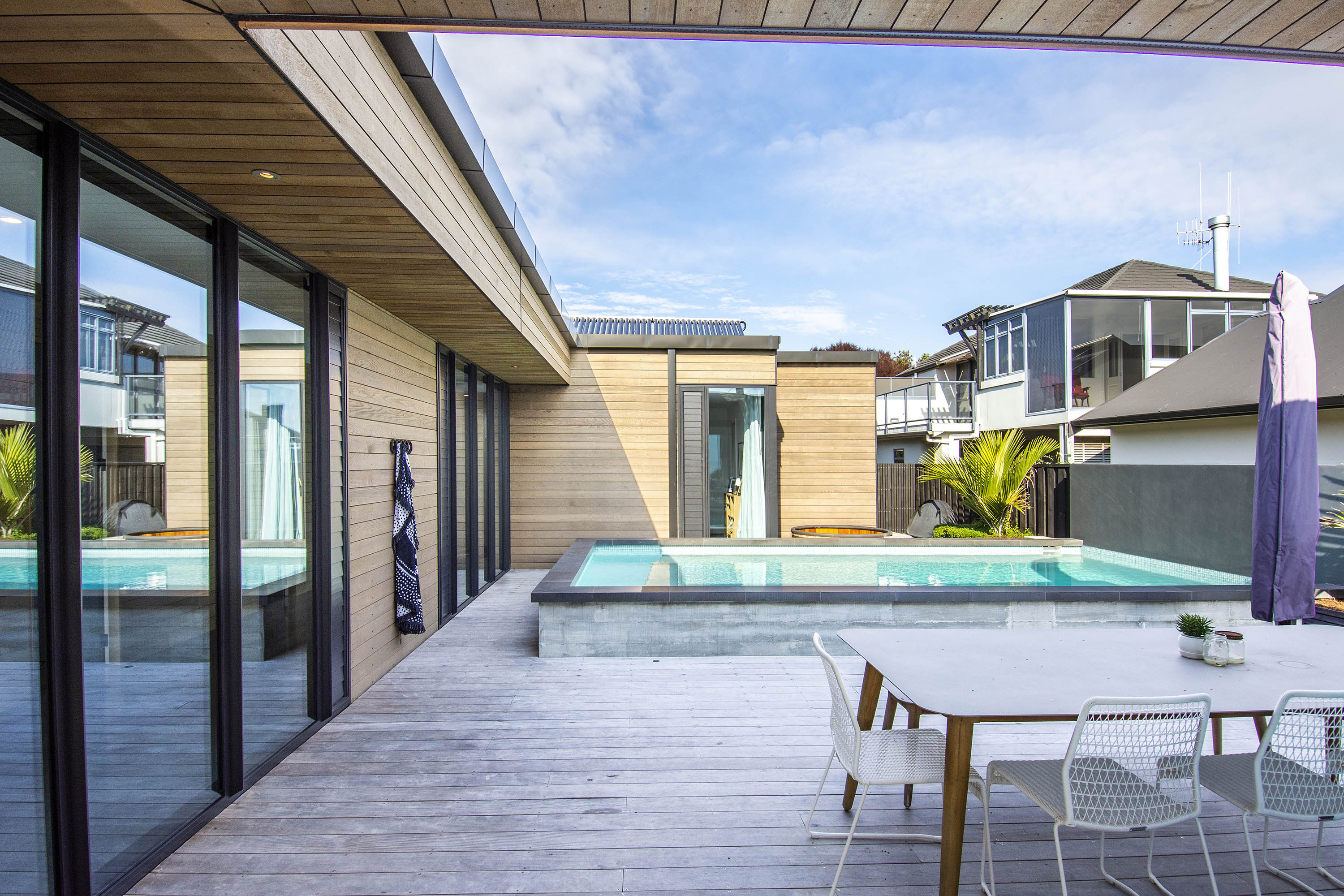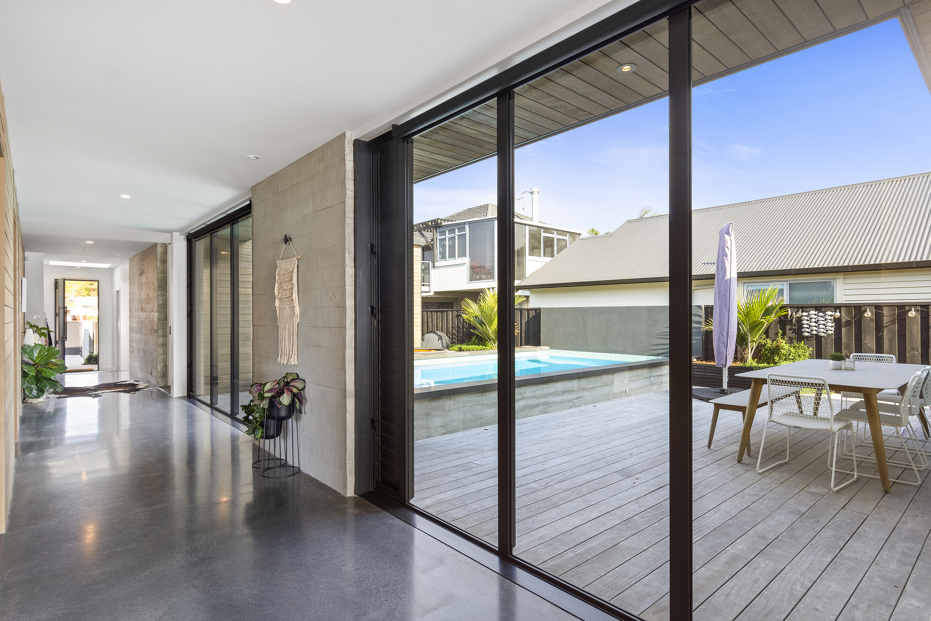 Outdoor living is key to this design. The flow from the courtyard pool and spa area through the open-plan interior to sunken seating at the waterfront has been shrewdly considered. Smart solar heats the pool and hot water during summer. In winter the underfloor heating and radiators are fed by the wood burner.