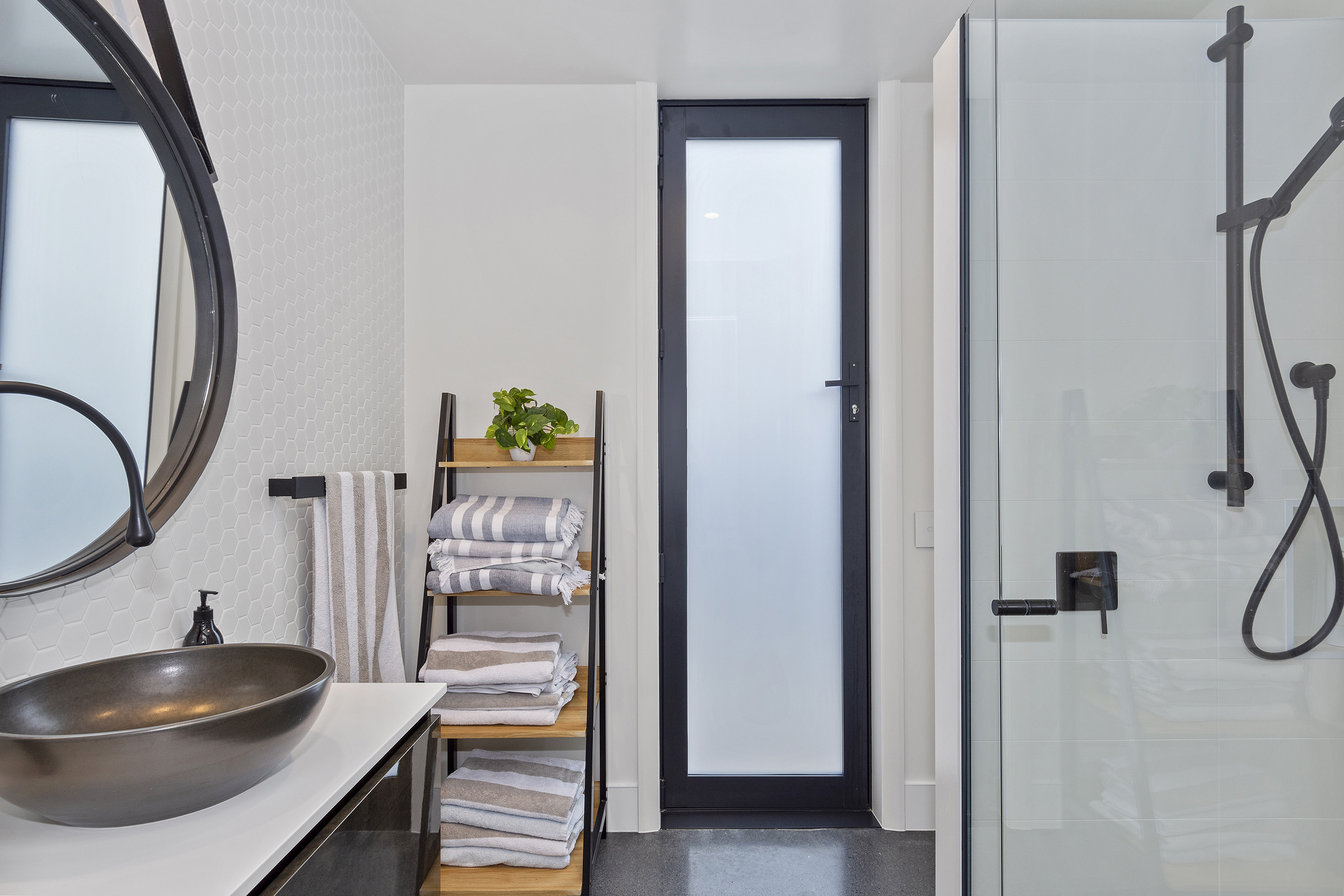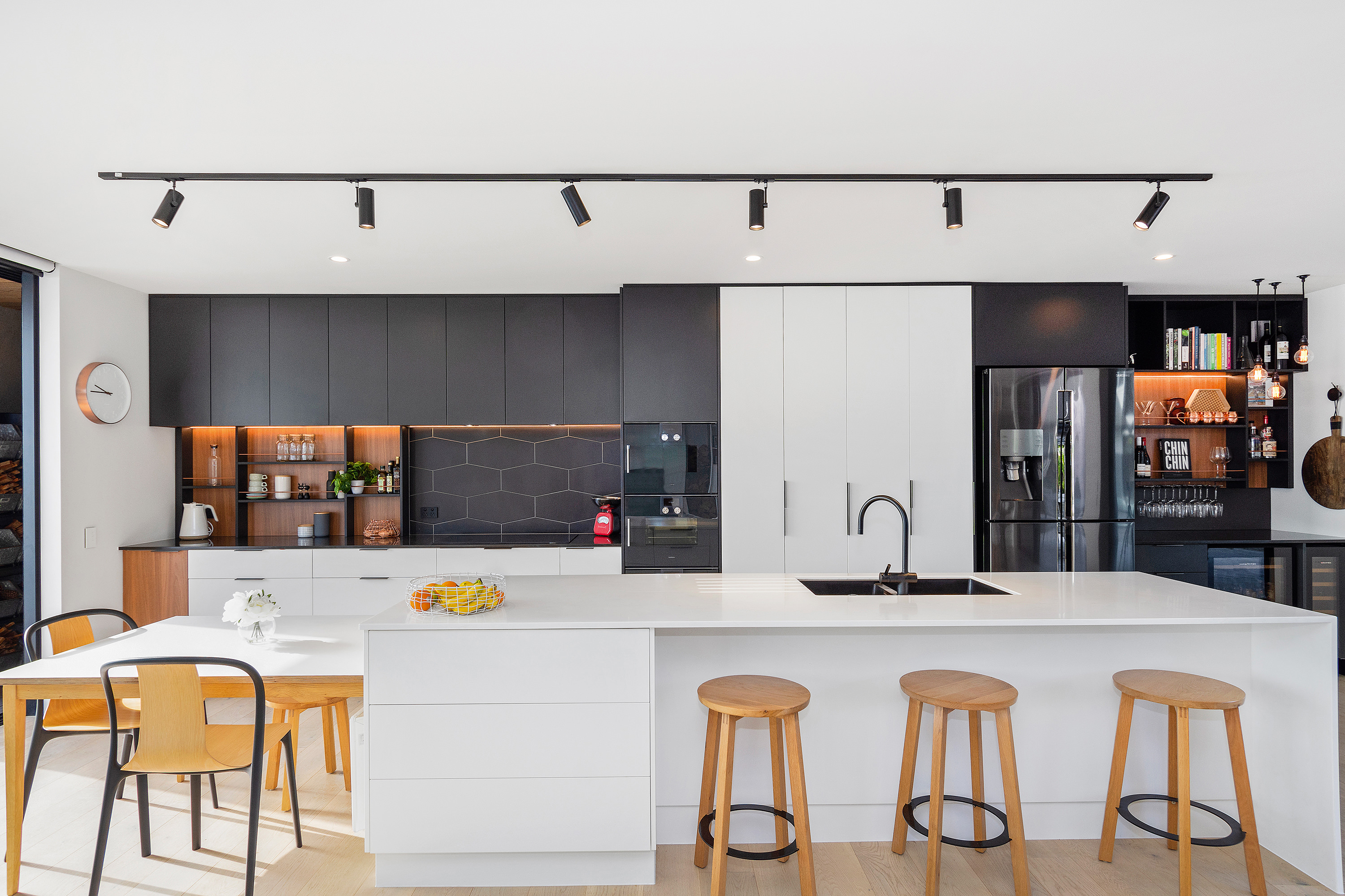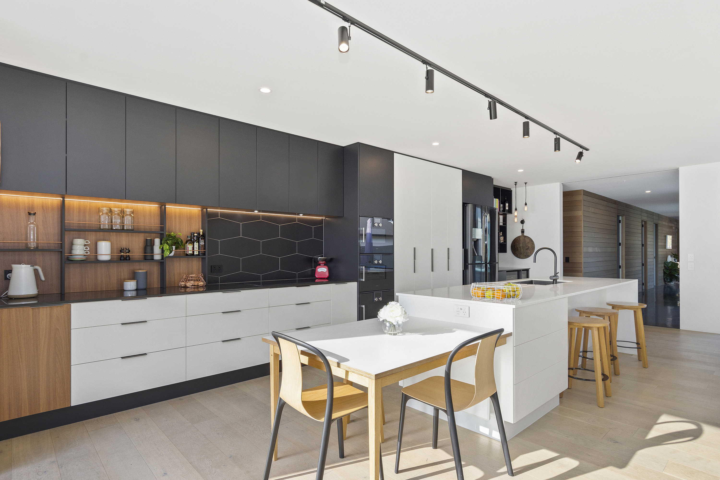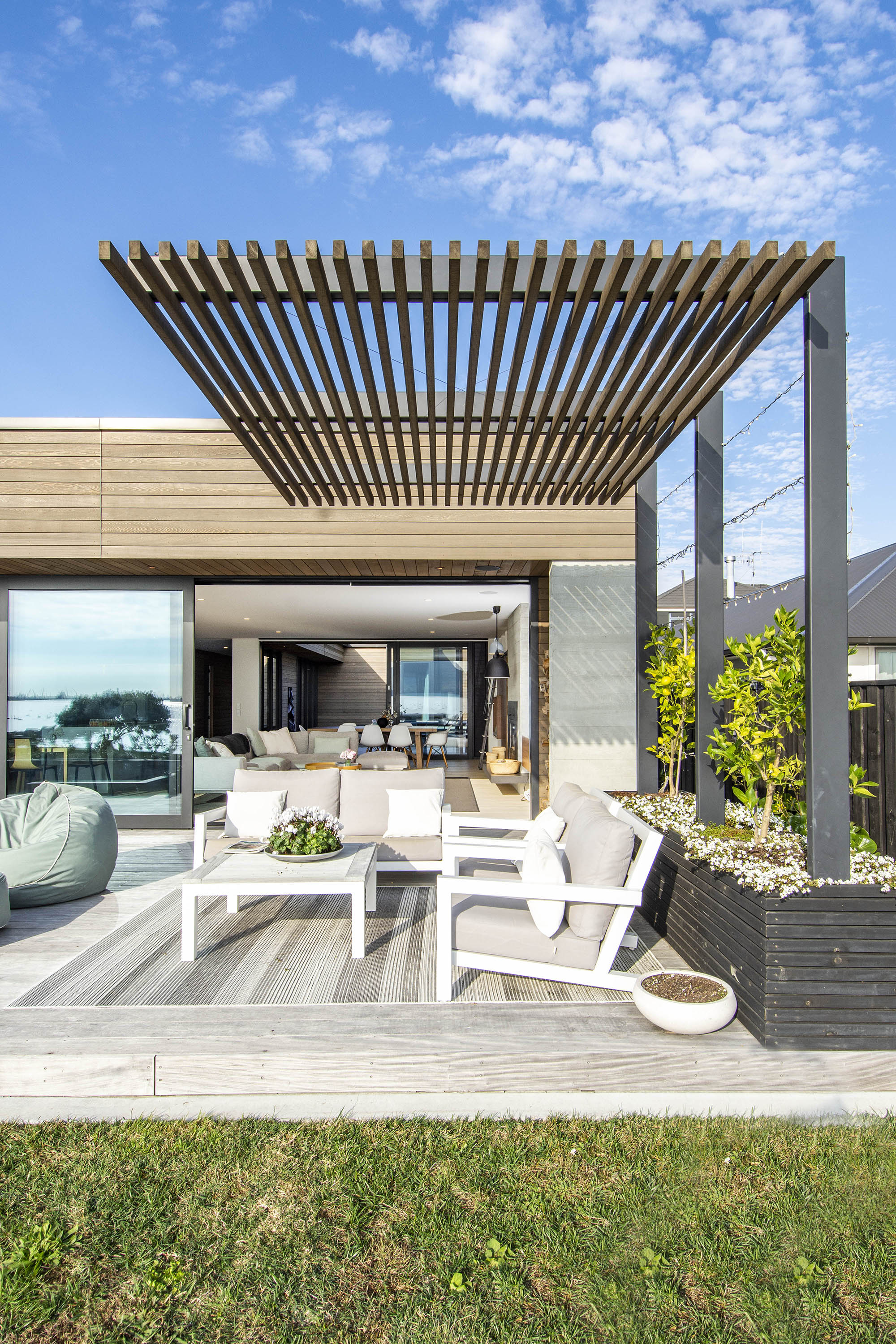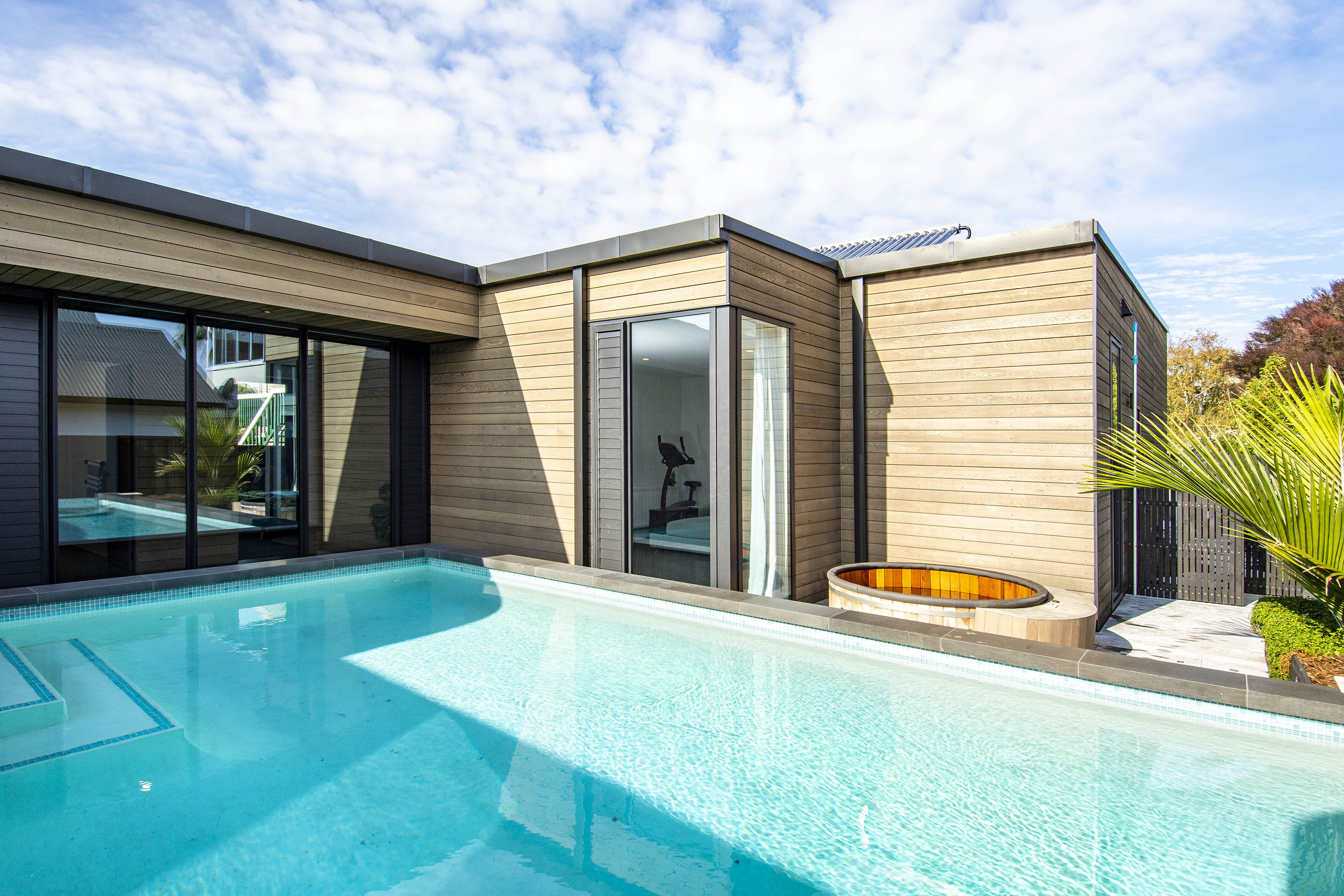 Outdoor living is key to this design. The flow from the courtyard pool and spa area through the open-plan interior to sunken seating at the waterfront has been shrewdly considered. Smart solar heats the pool and hot water during summer. In winter the underfloor heating and radiators are fed by the wood burner.