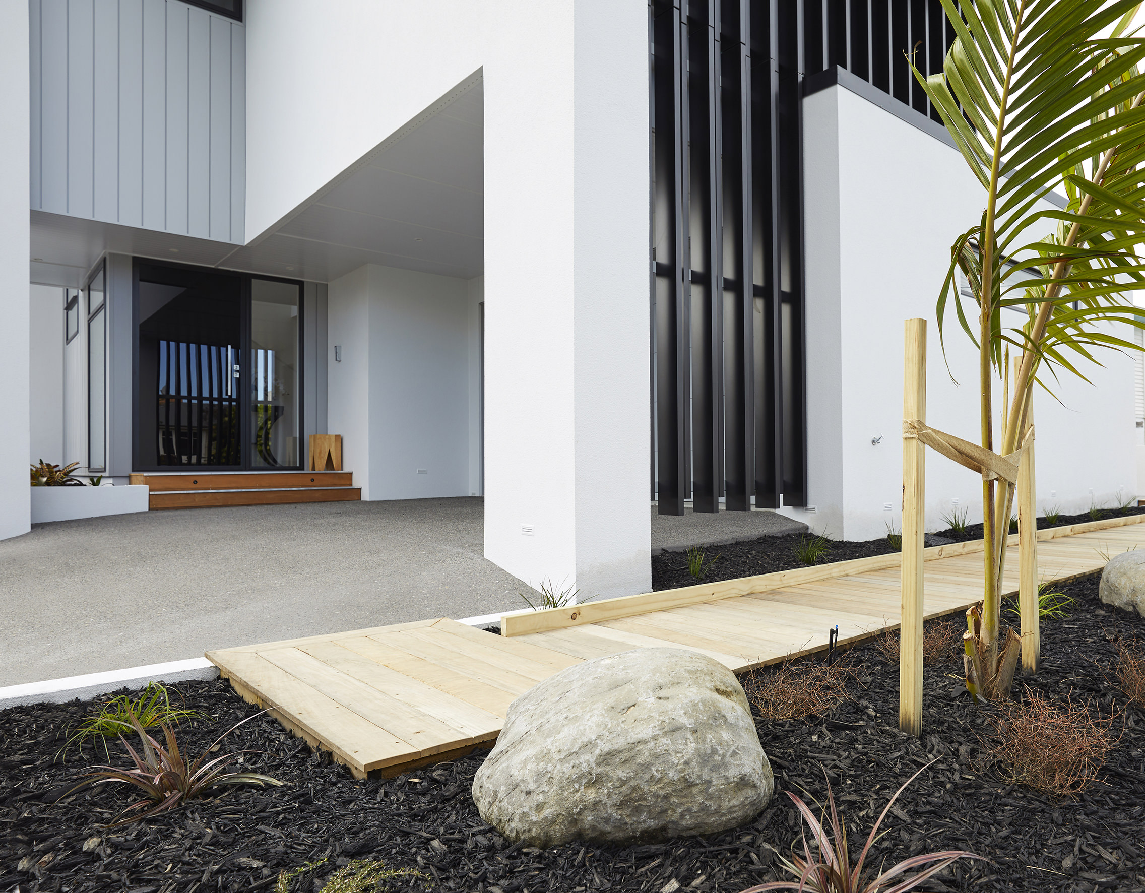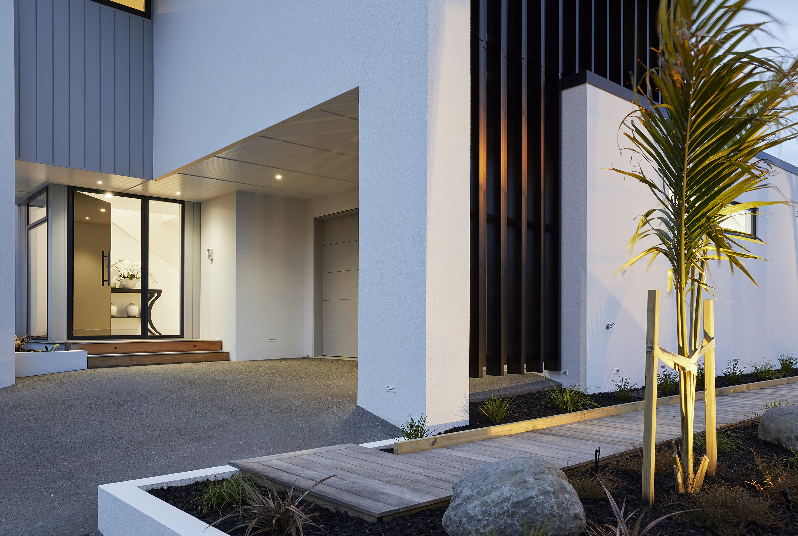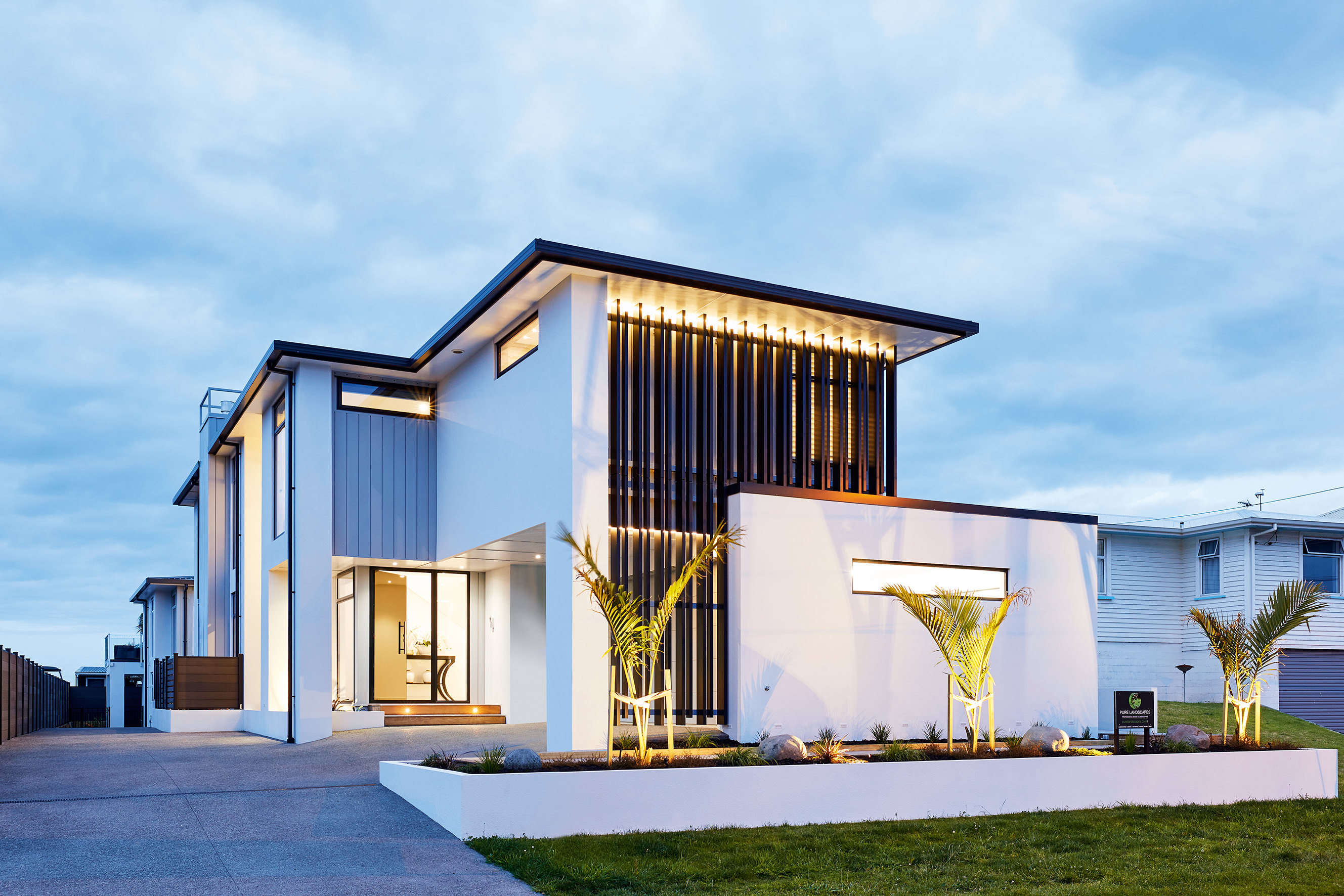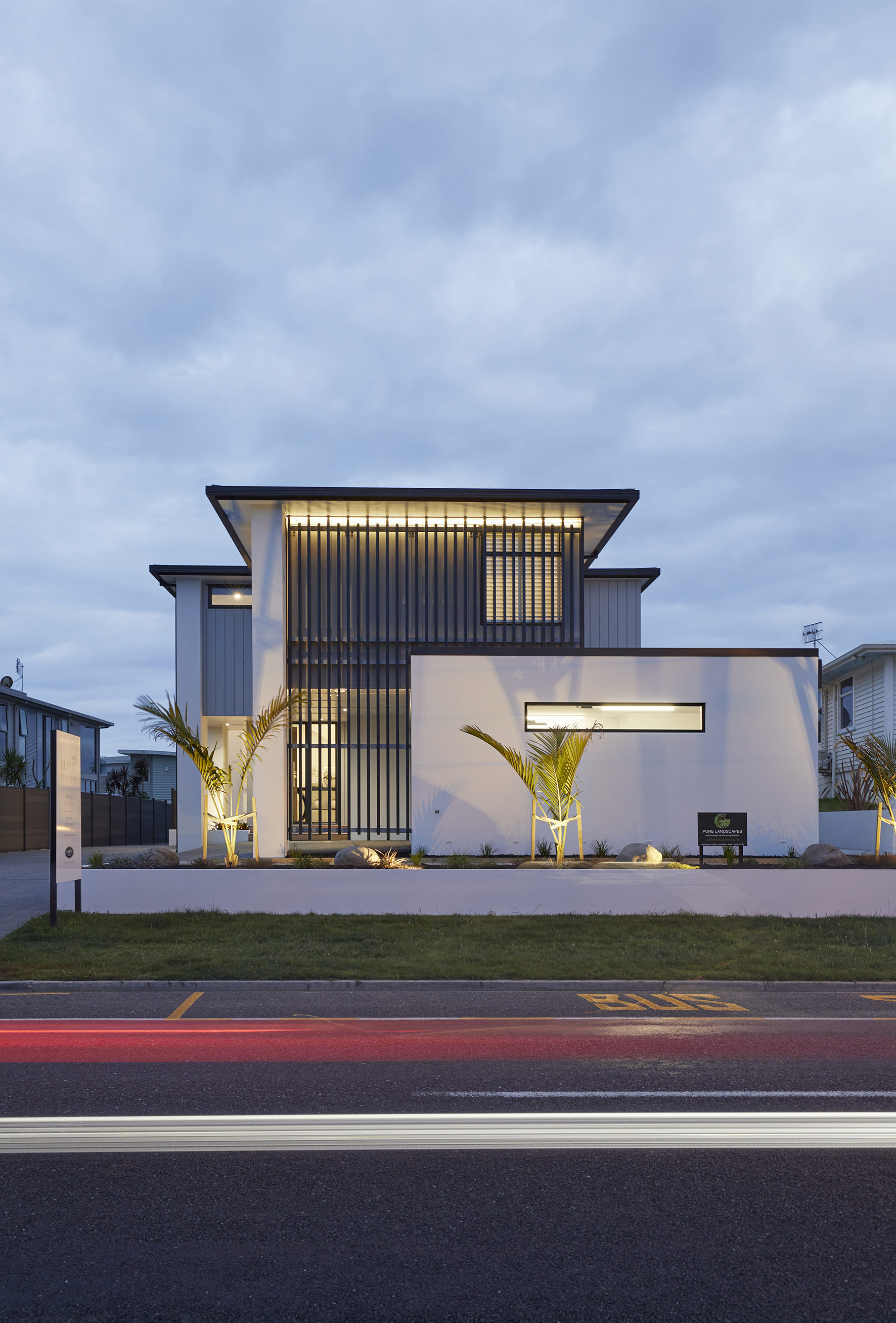With its strong vertical detailing and proud stature, this Tauranga show home beckons visitors to take a closer look. Resort-style living is the theme here, with separate accommodation upstairs and down. A choice of a lift or stairs connects the levels.