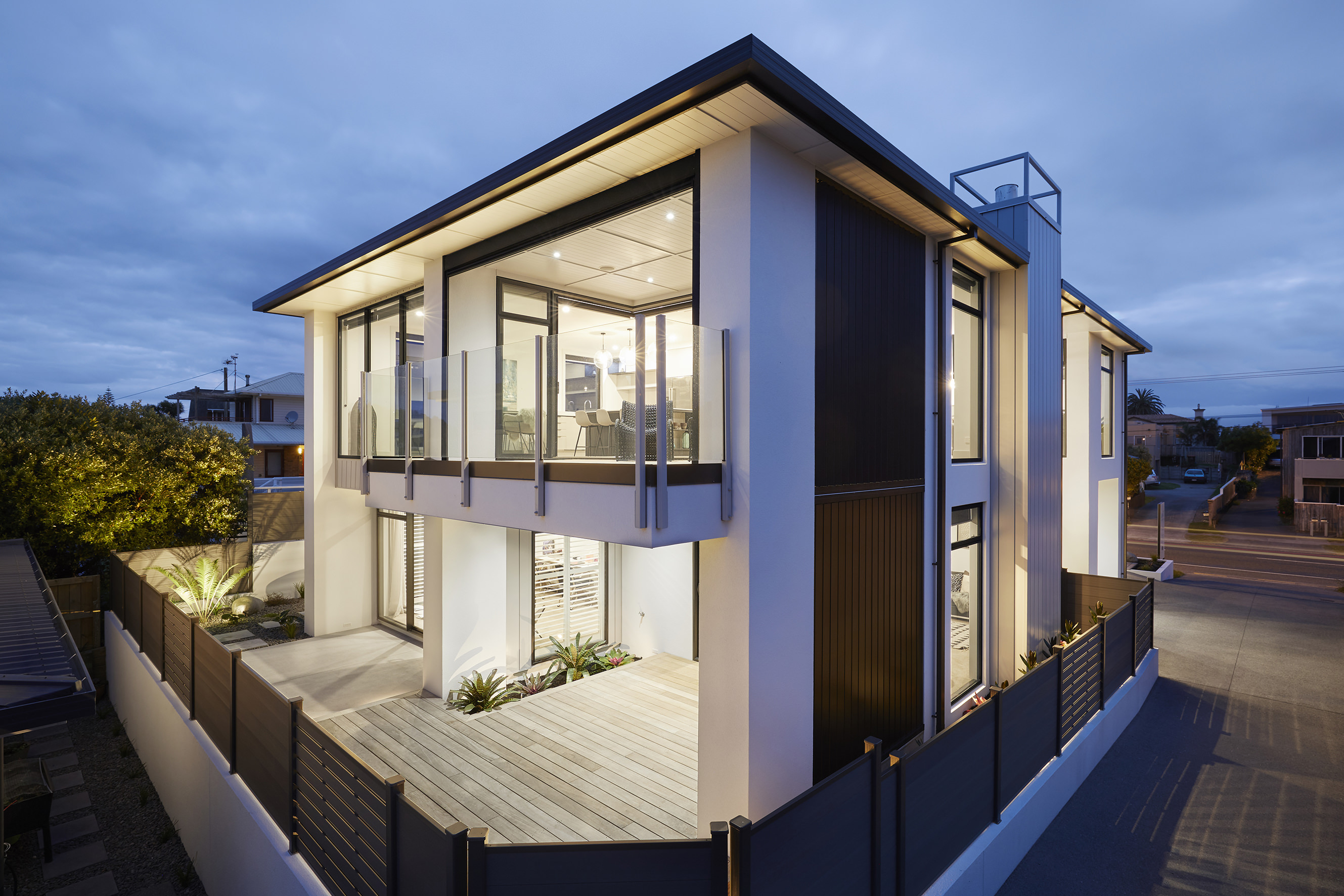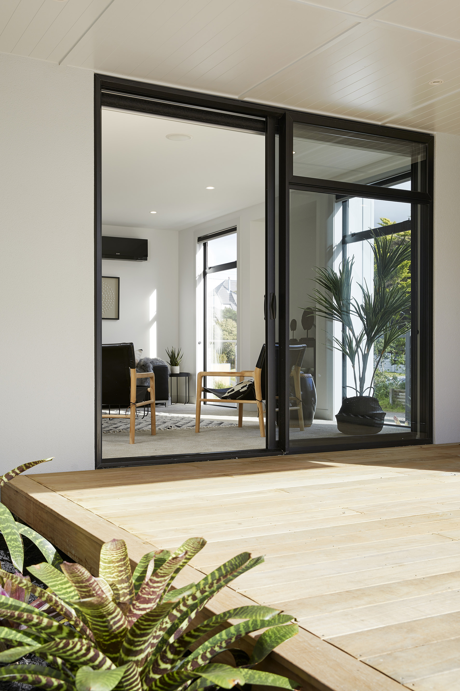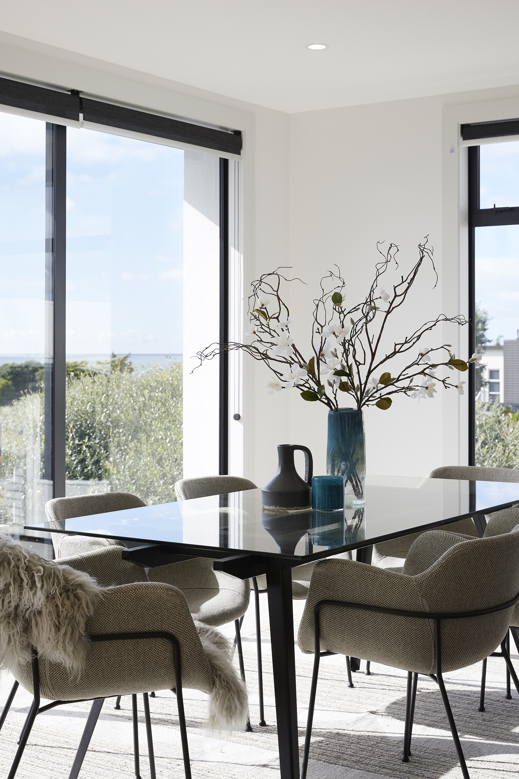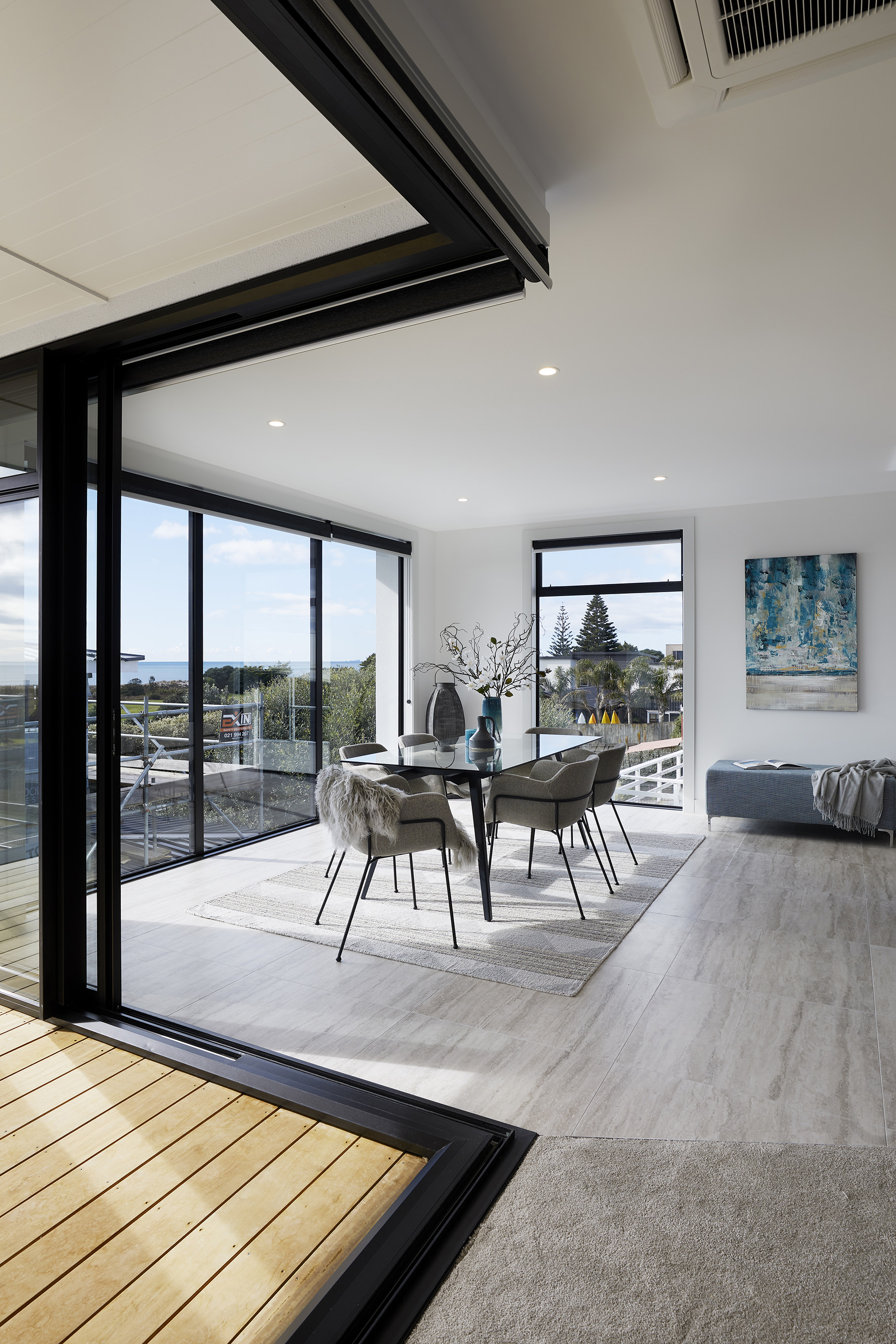 Large expanses of glass drink in natural light, framing water views in the large open-plan domain. Cornerless sliders open to a deck on the top level, blurring the boundaries between interior and exterior living.