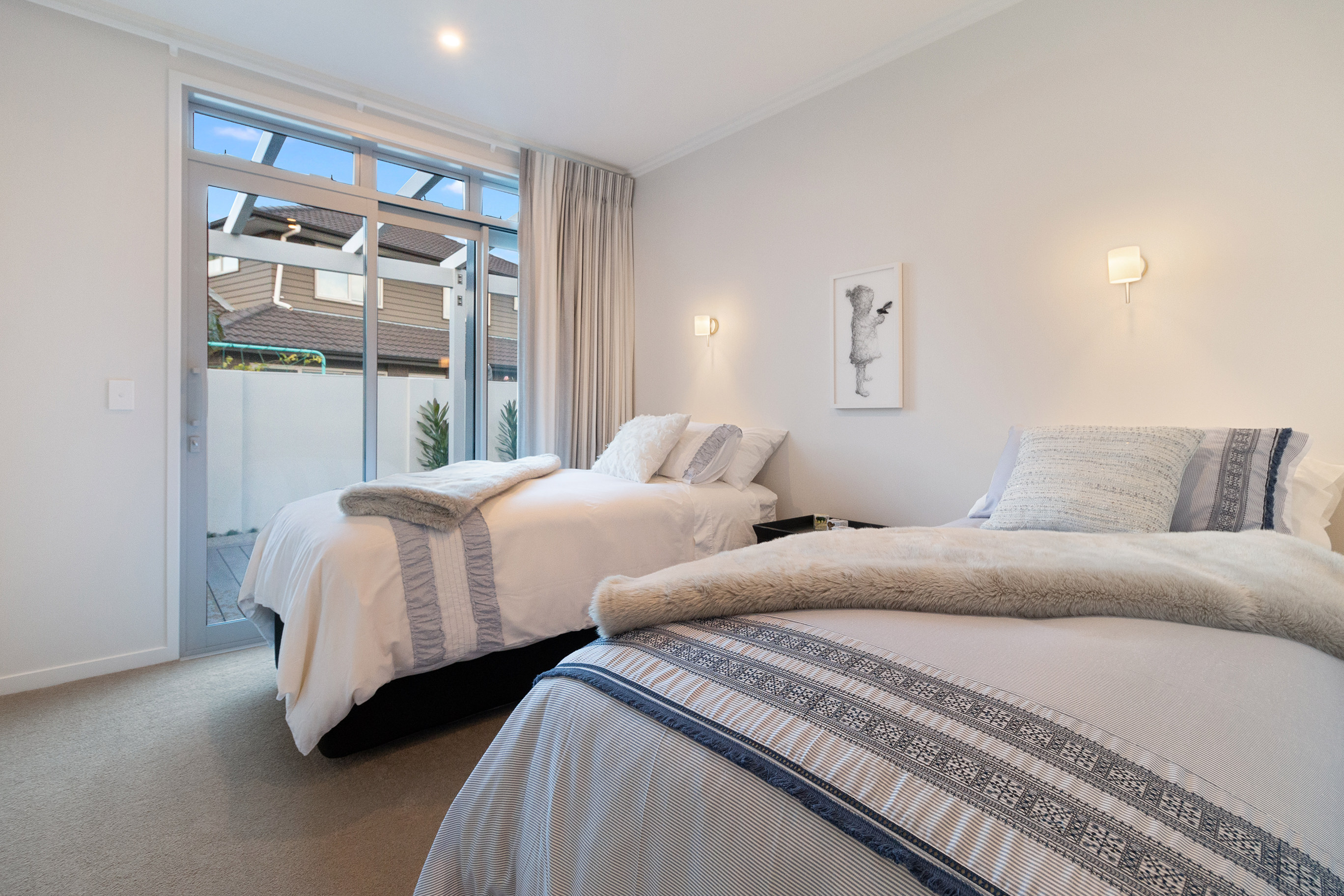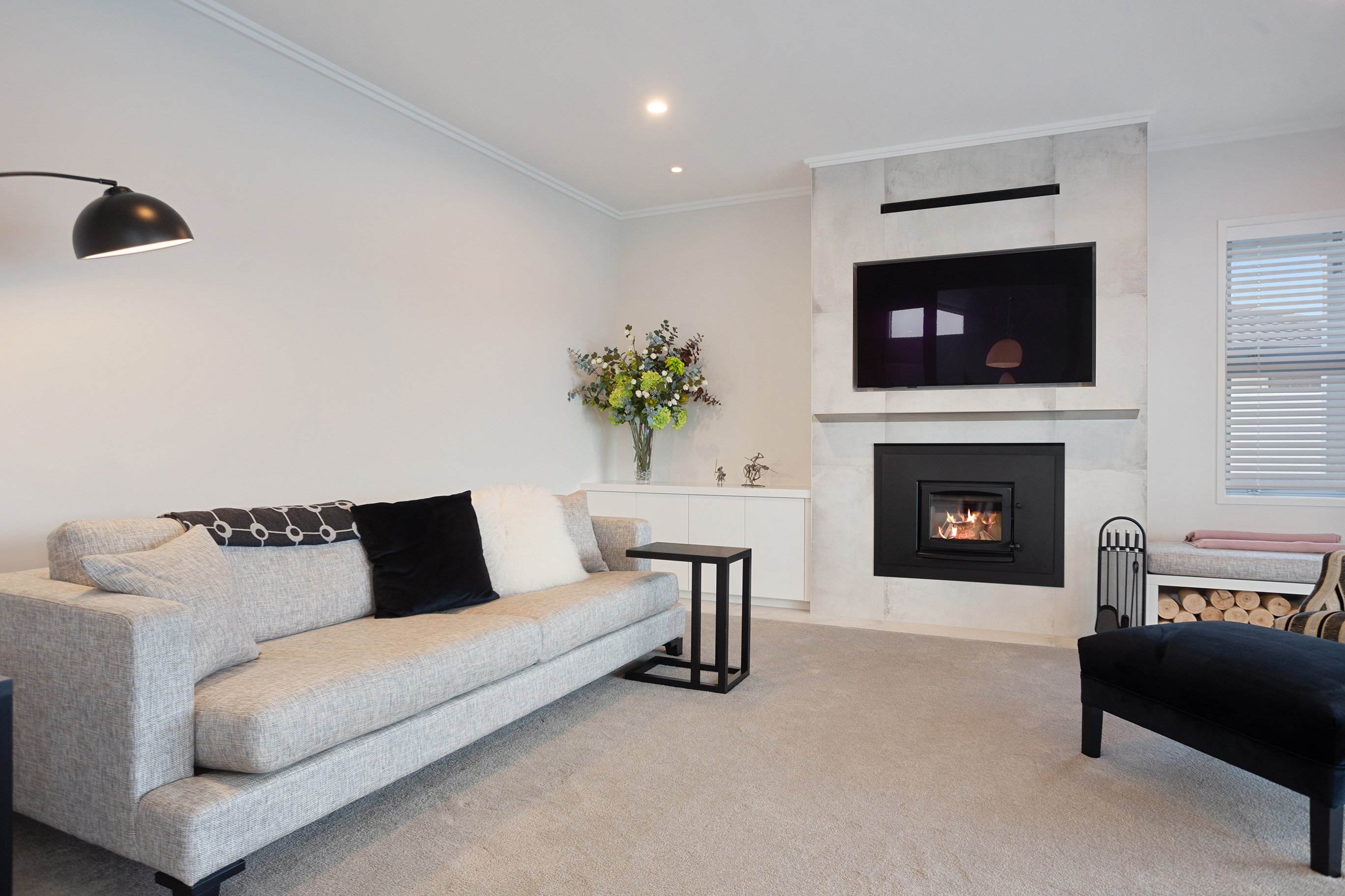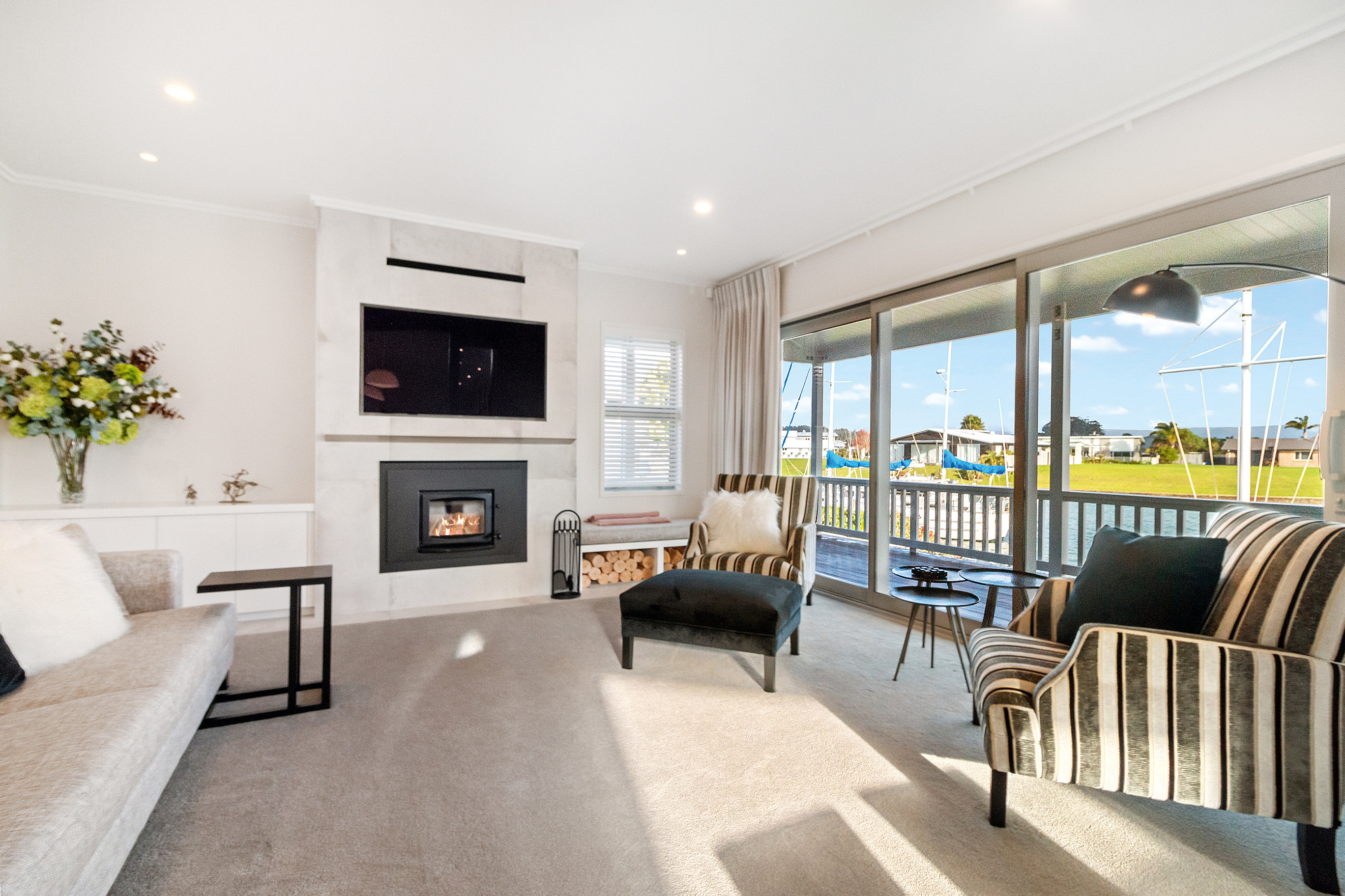 Large glass cavity slider doors open into the lounge with its wood fire and tiled chimney. A relaxing window seat doubles as a wood box.