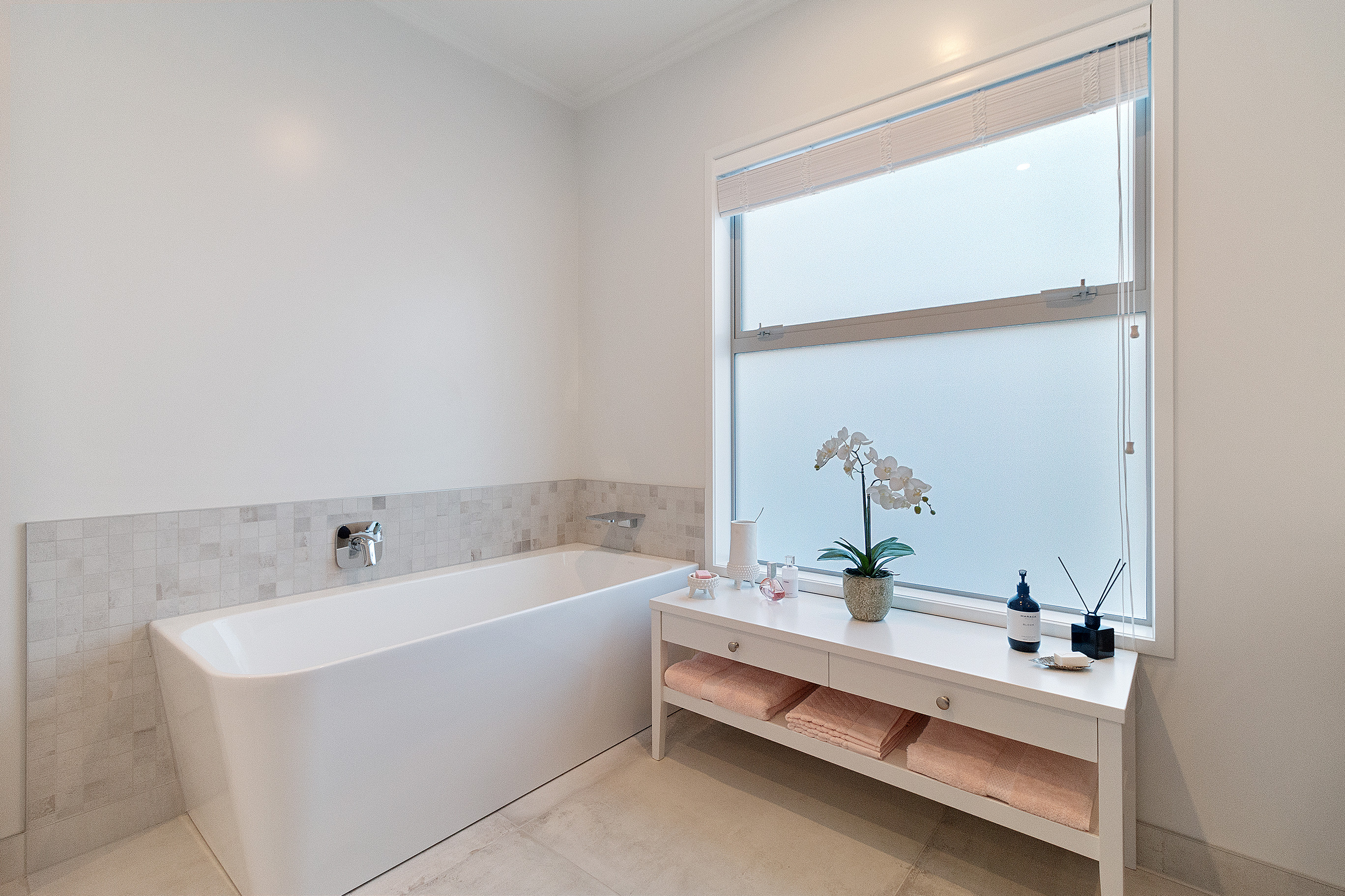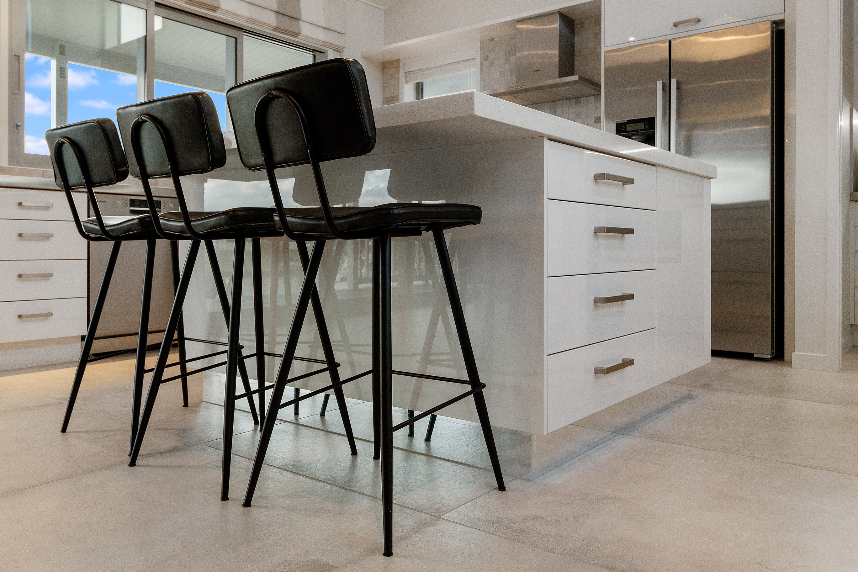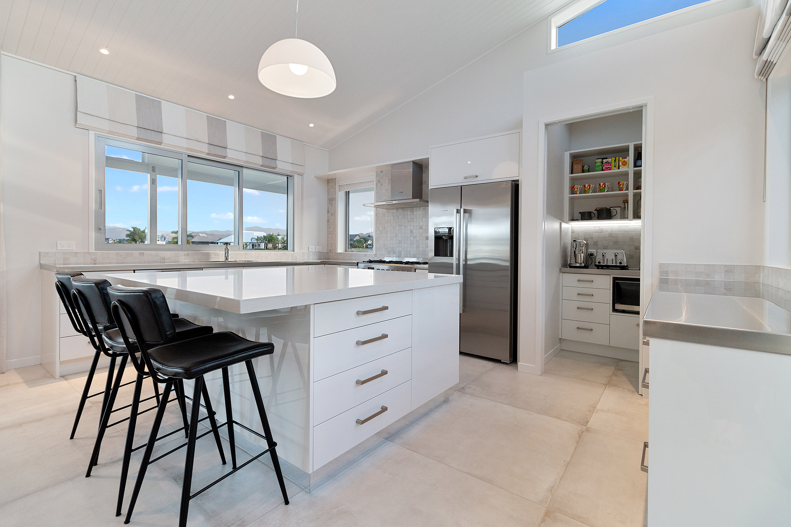 The kitchen’s blend of sleek finishes and functional space provides timeless appeal. Large floor tiles offer elegance underfoot, making way for carpet in the cosy lounge and three bedrooms.