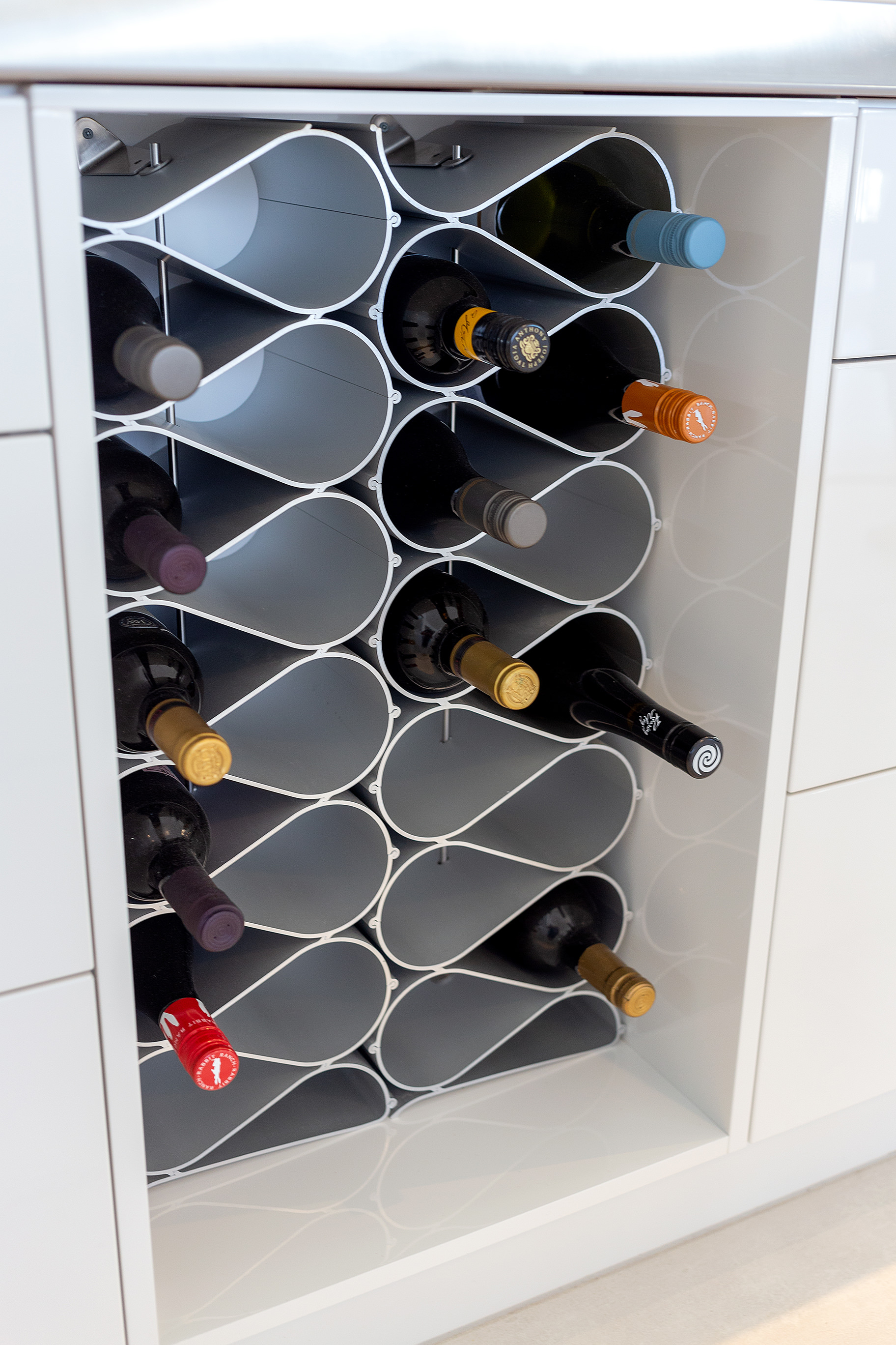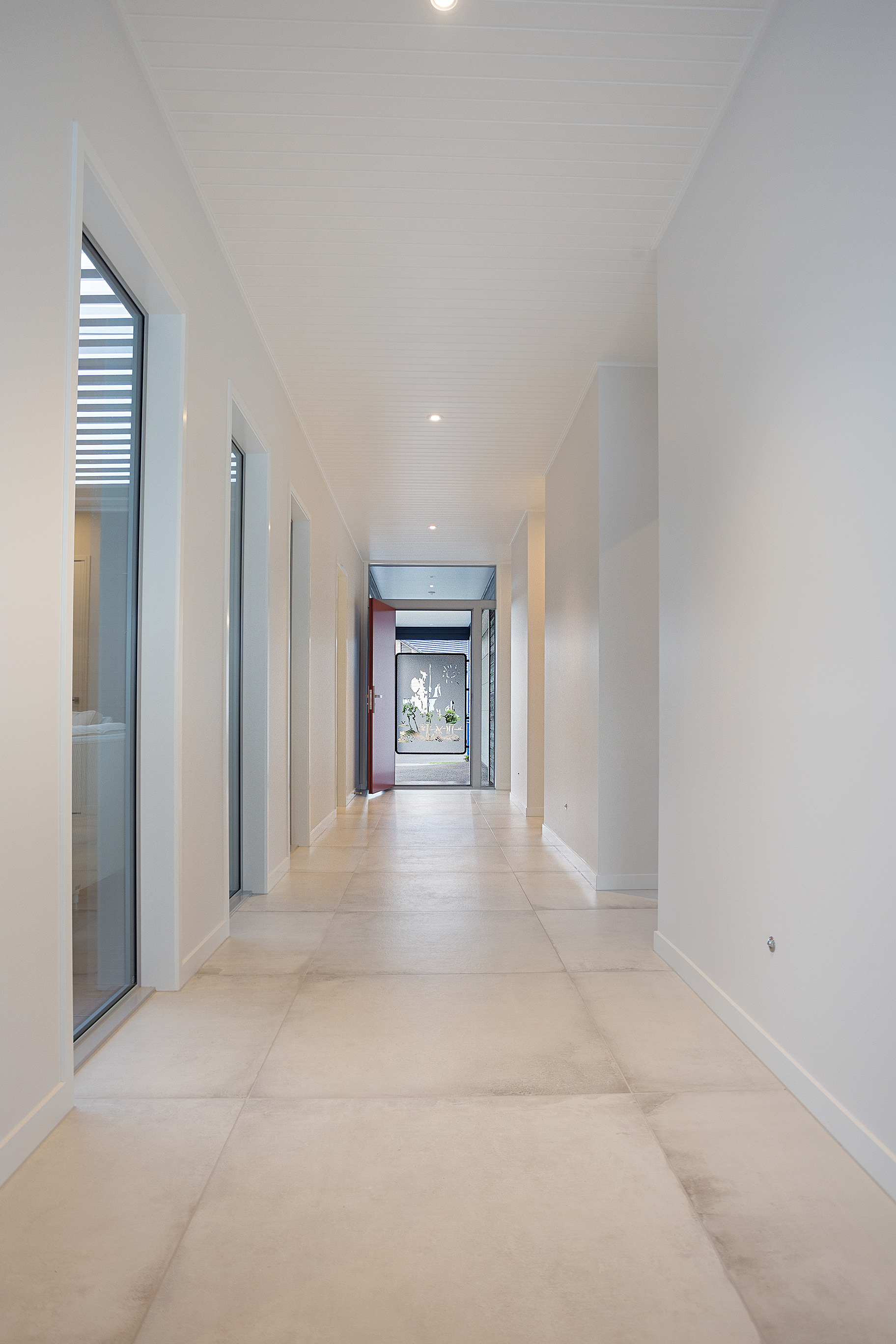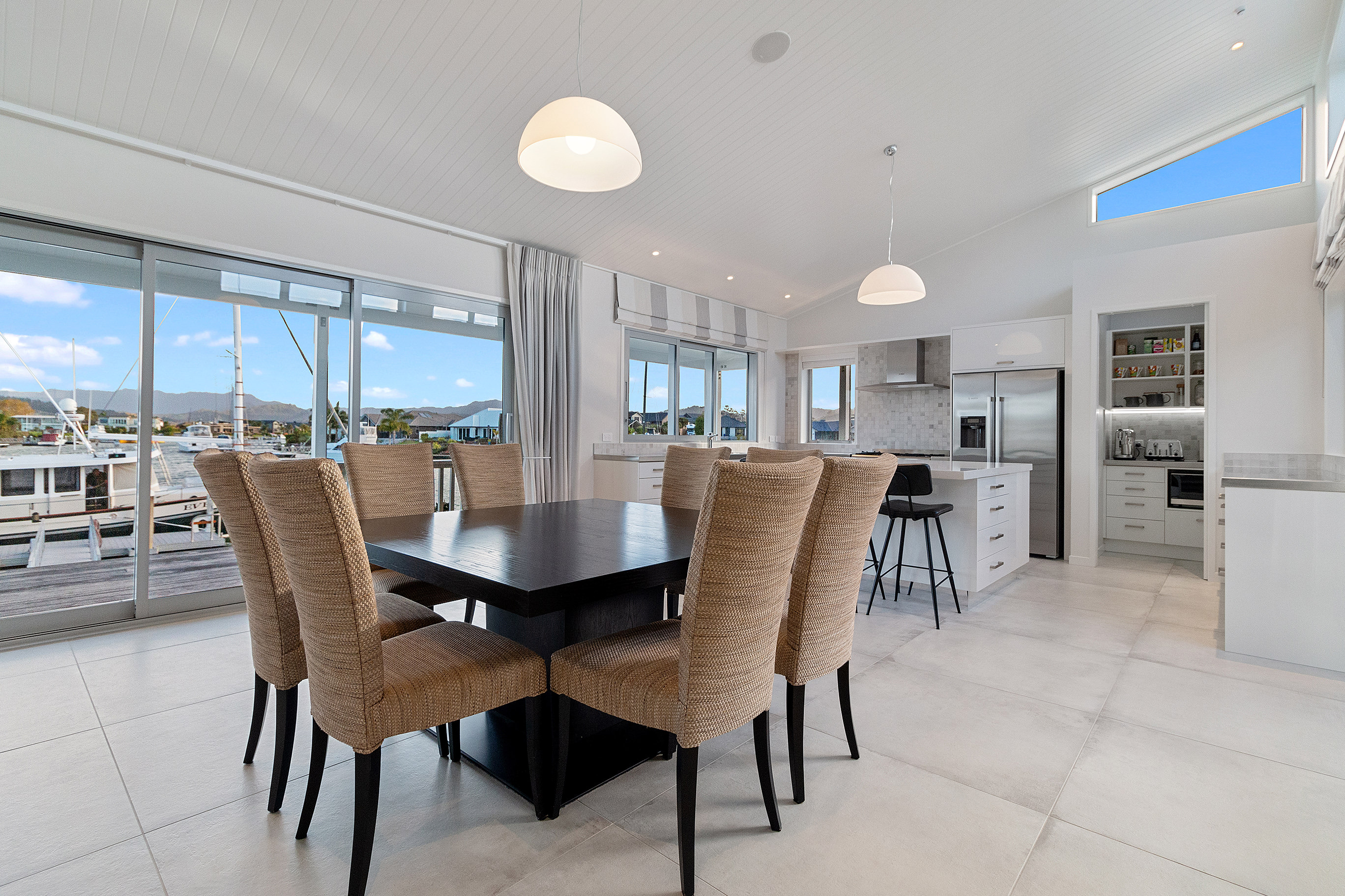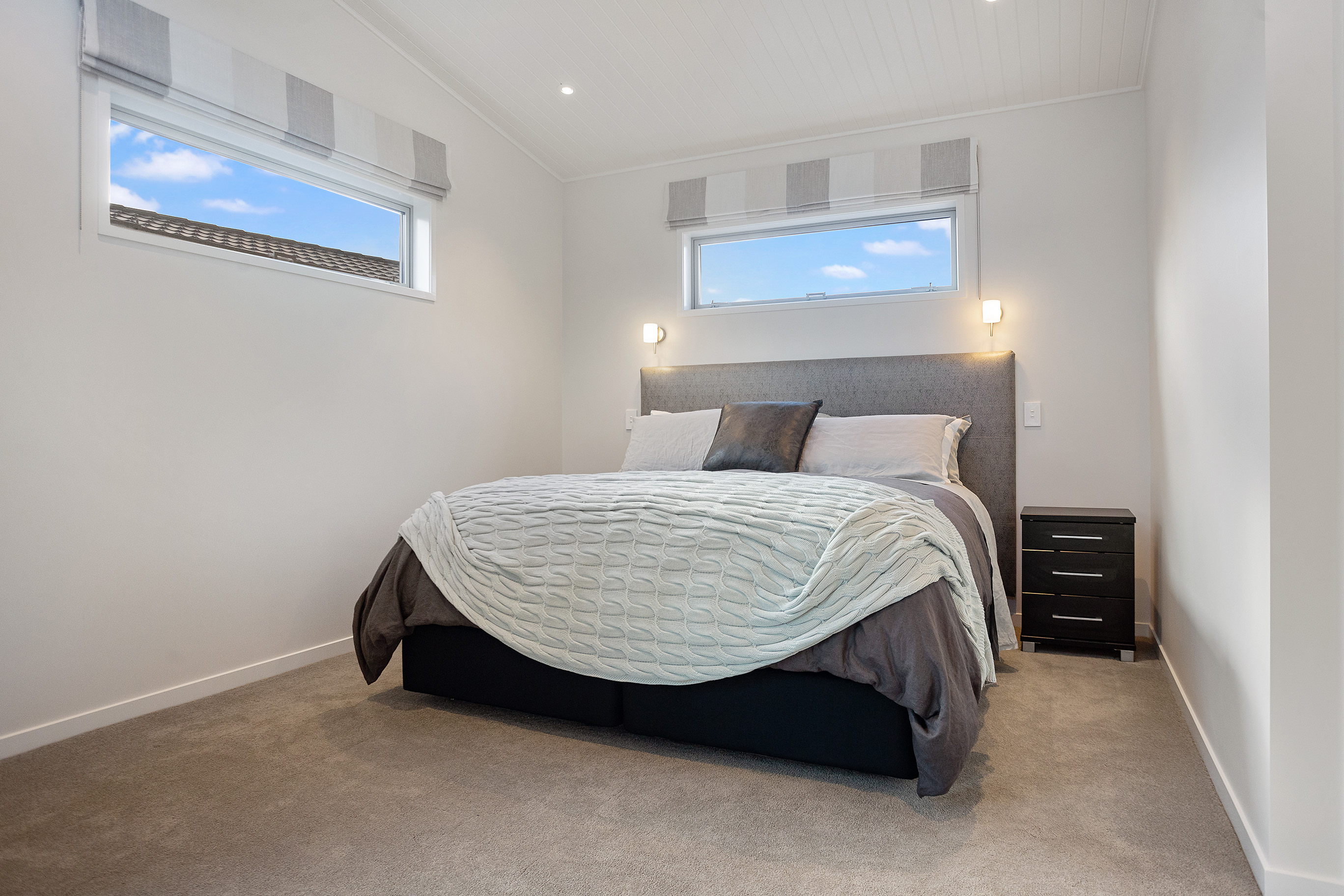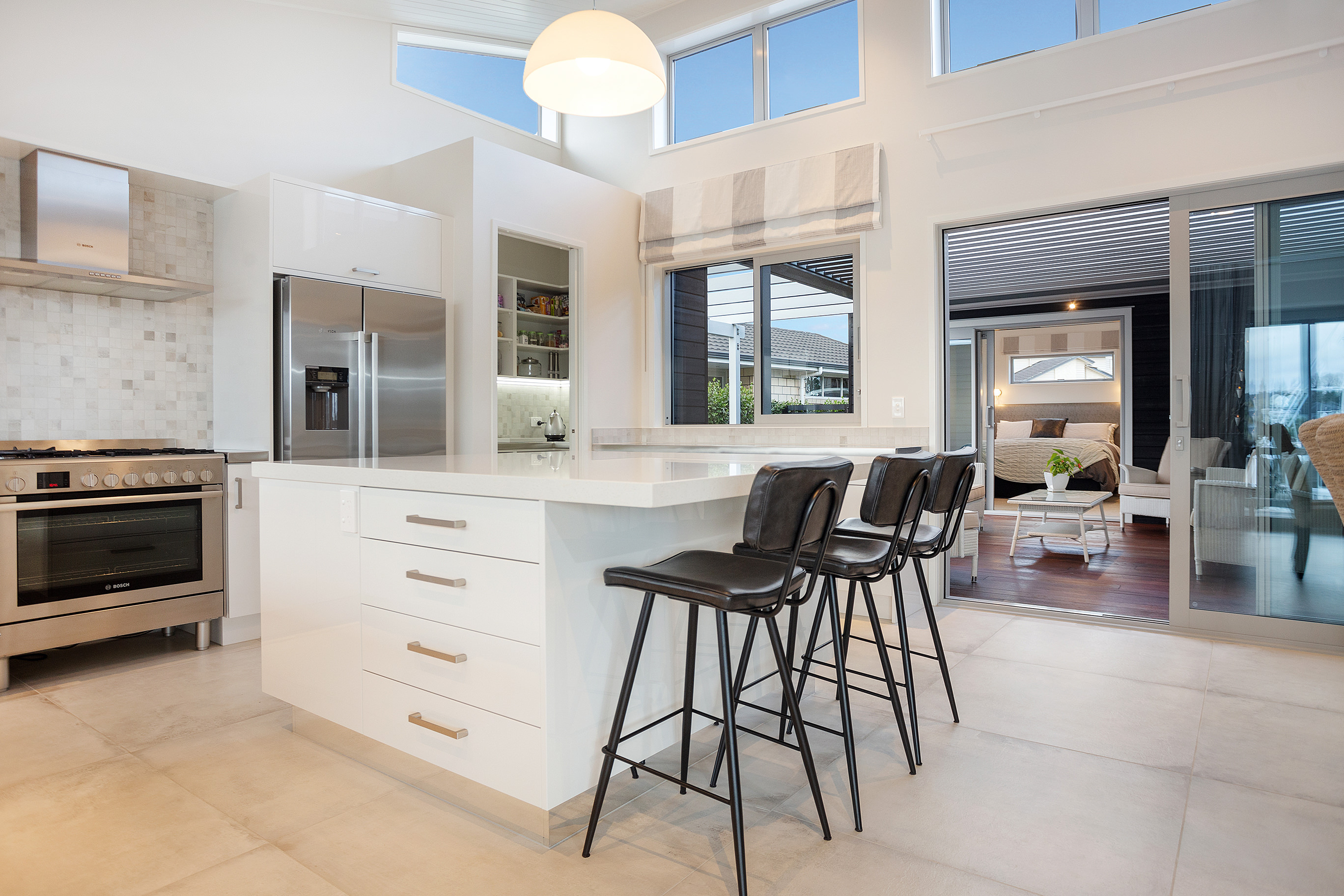 Tongue-and-groove timber ceilings flow into the living space, following the raking roof line. Electrically operated clerestory windows draw in sunlight.