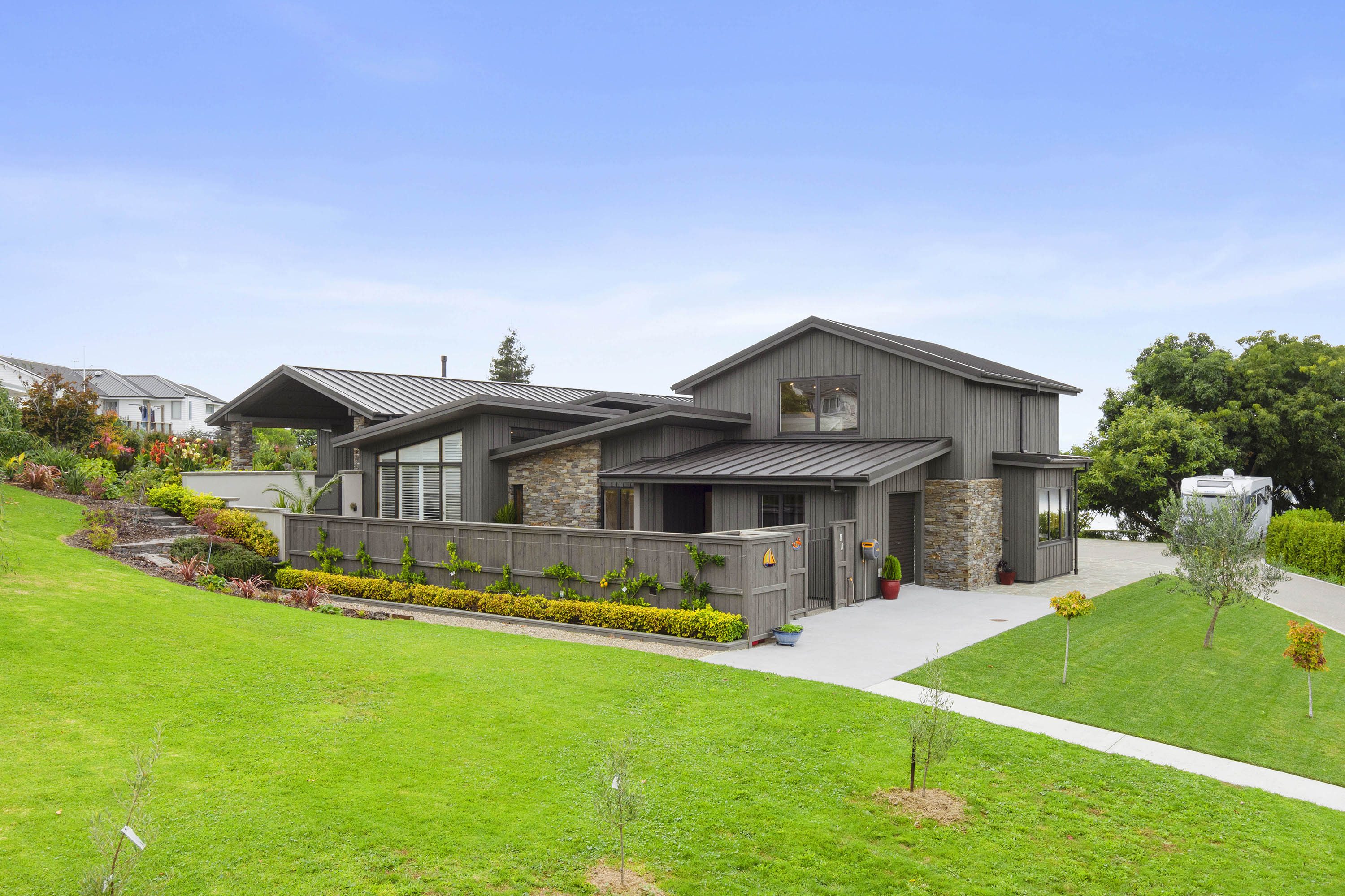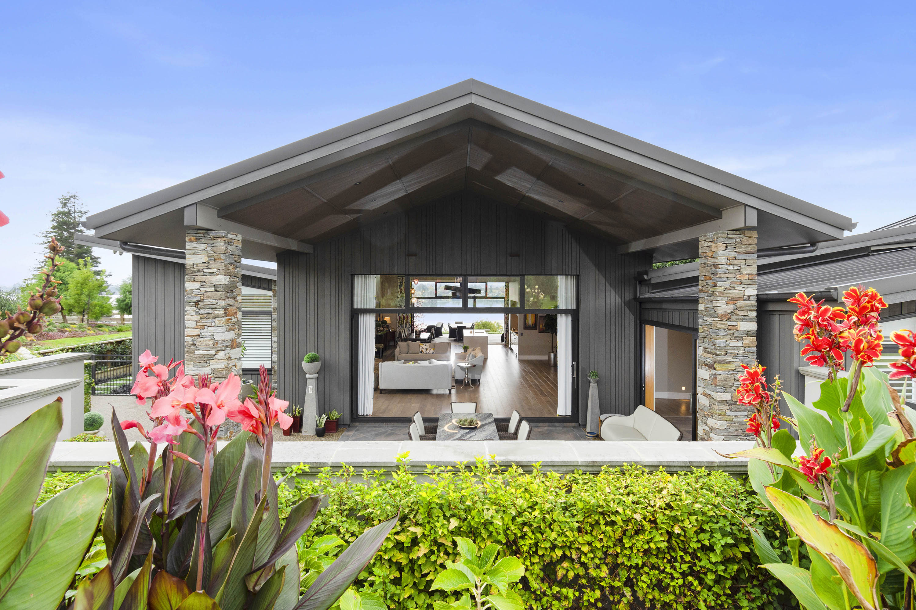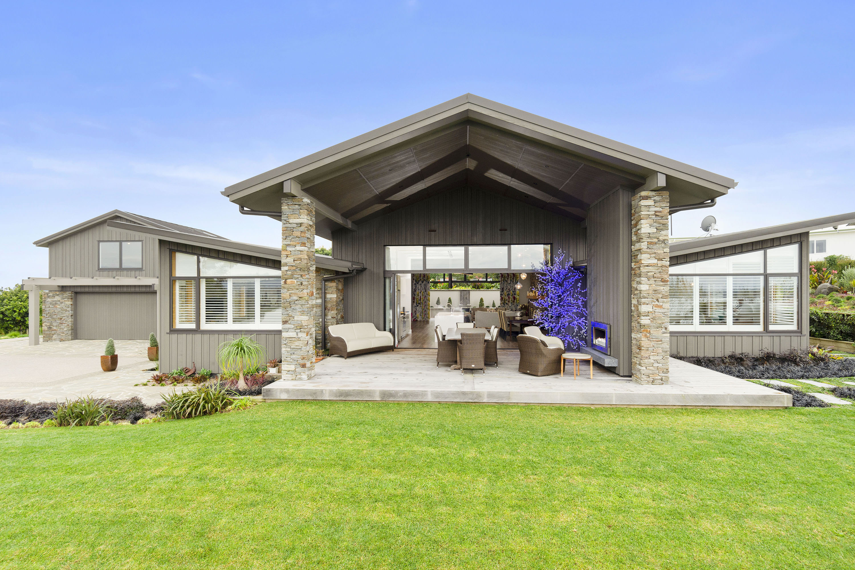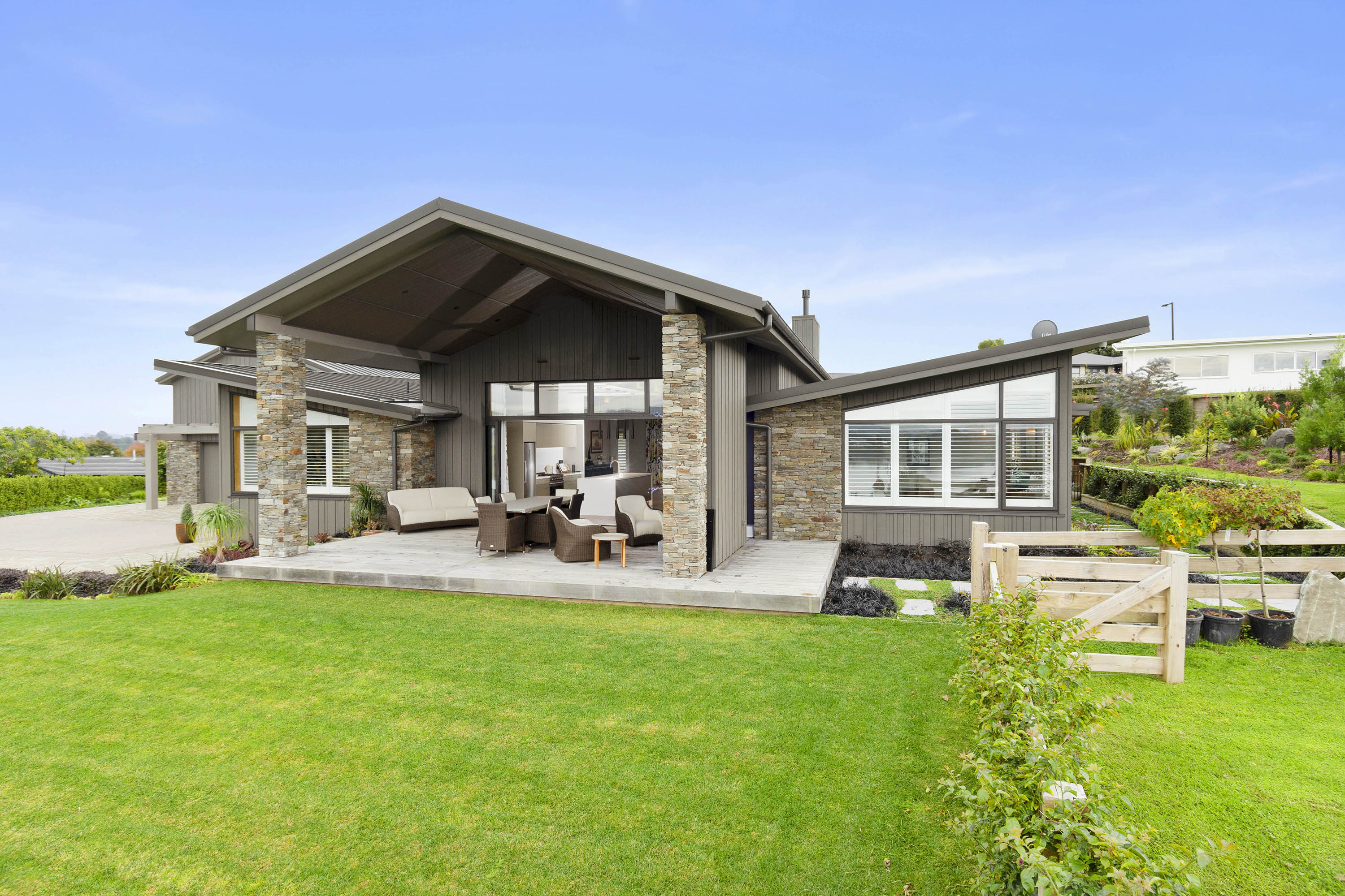 You only need to take one look at this edgy, modern abode in Tauranga to know it’s something special. Positioned on either side of its huge central volume, raking rooftops spread their wings. Cedar weatherboard and schist cladding anchors the robust 439sqm home.