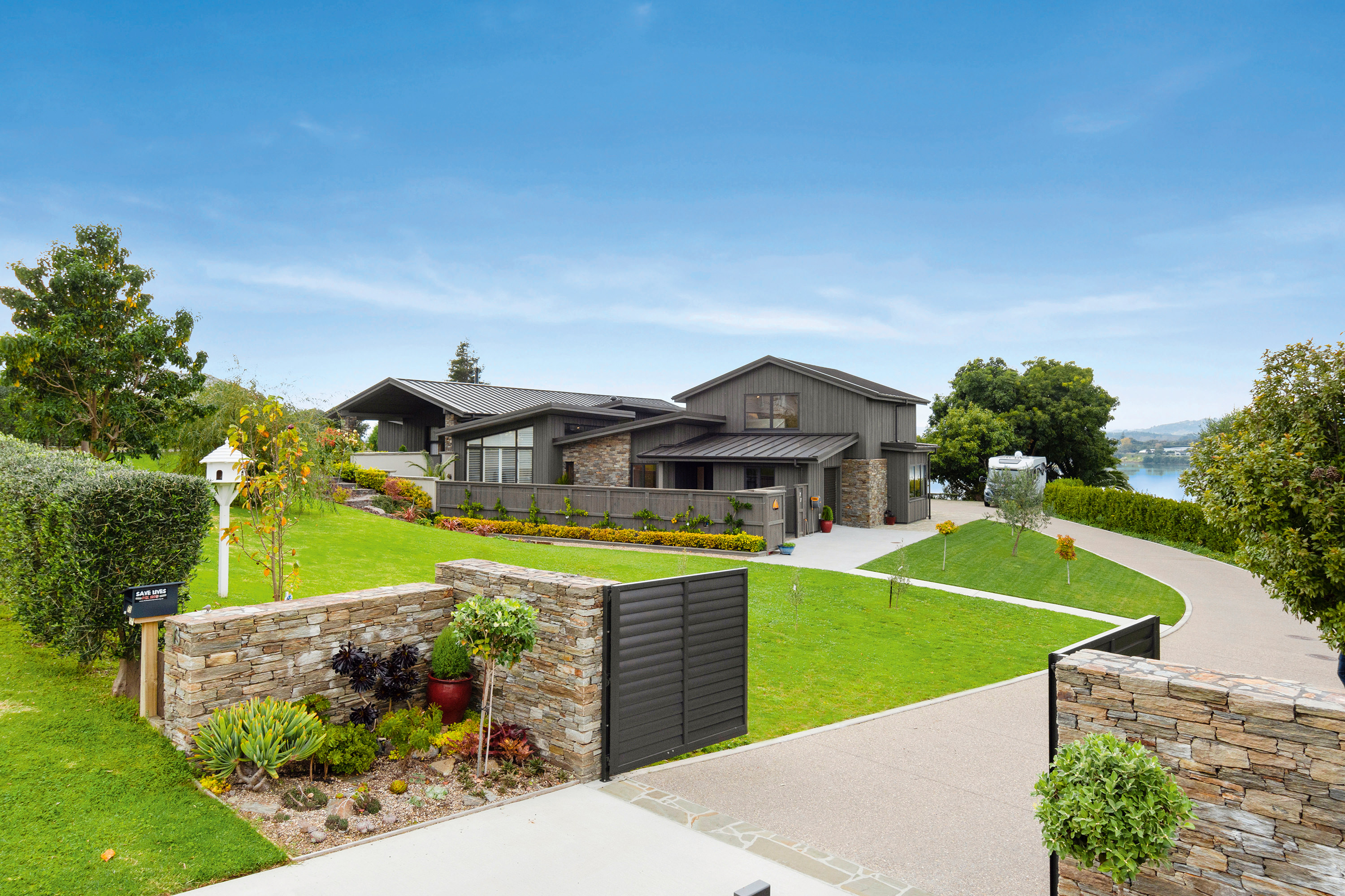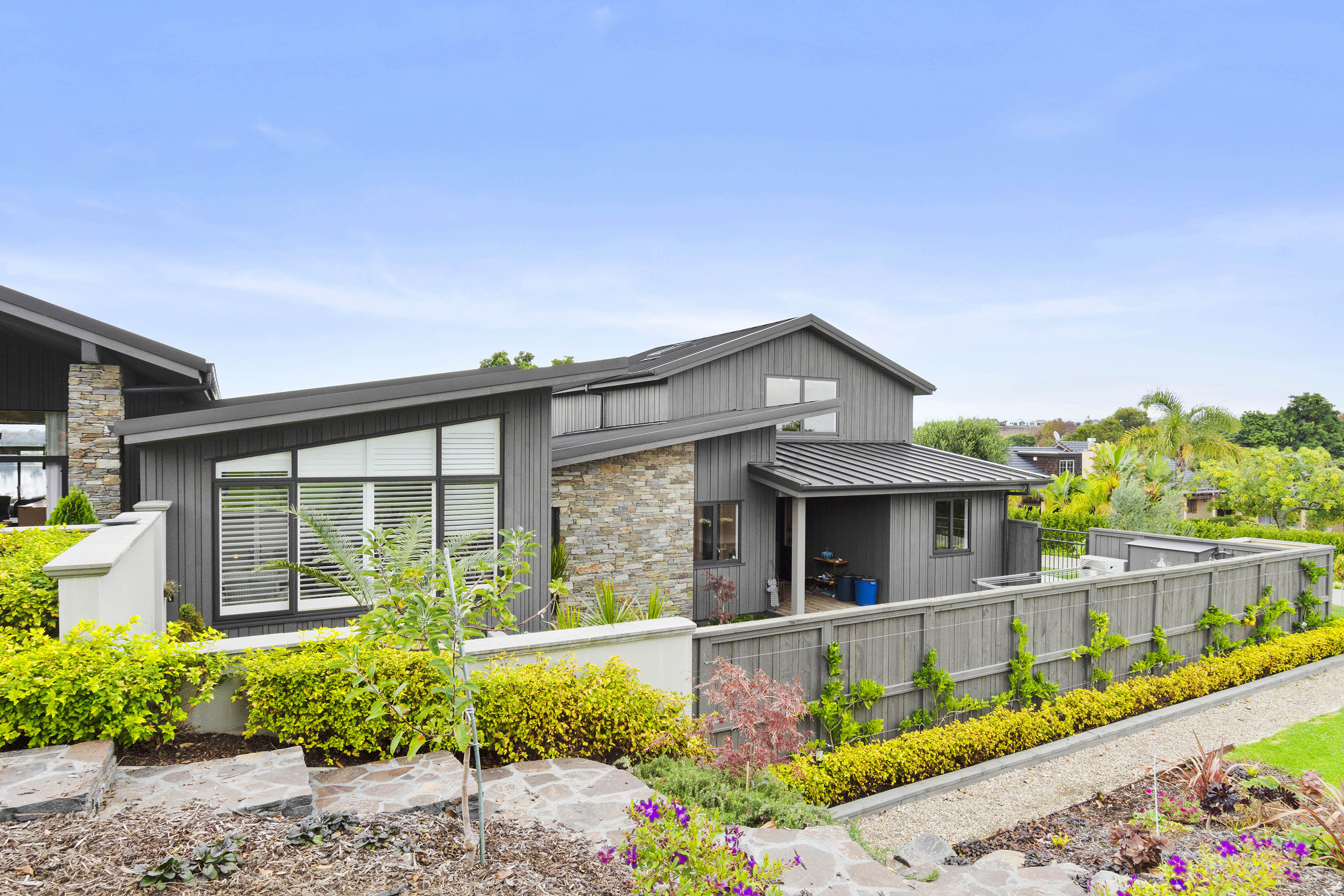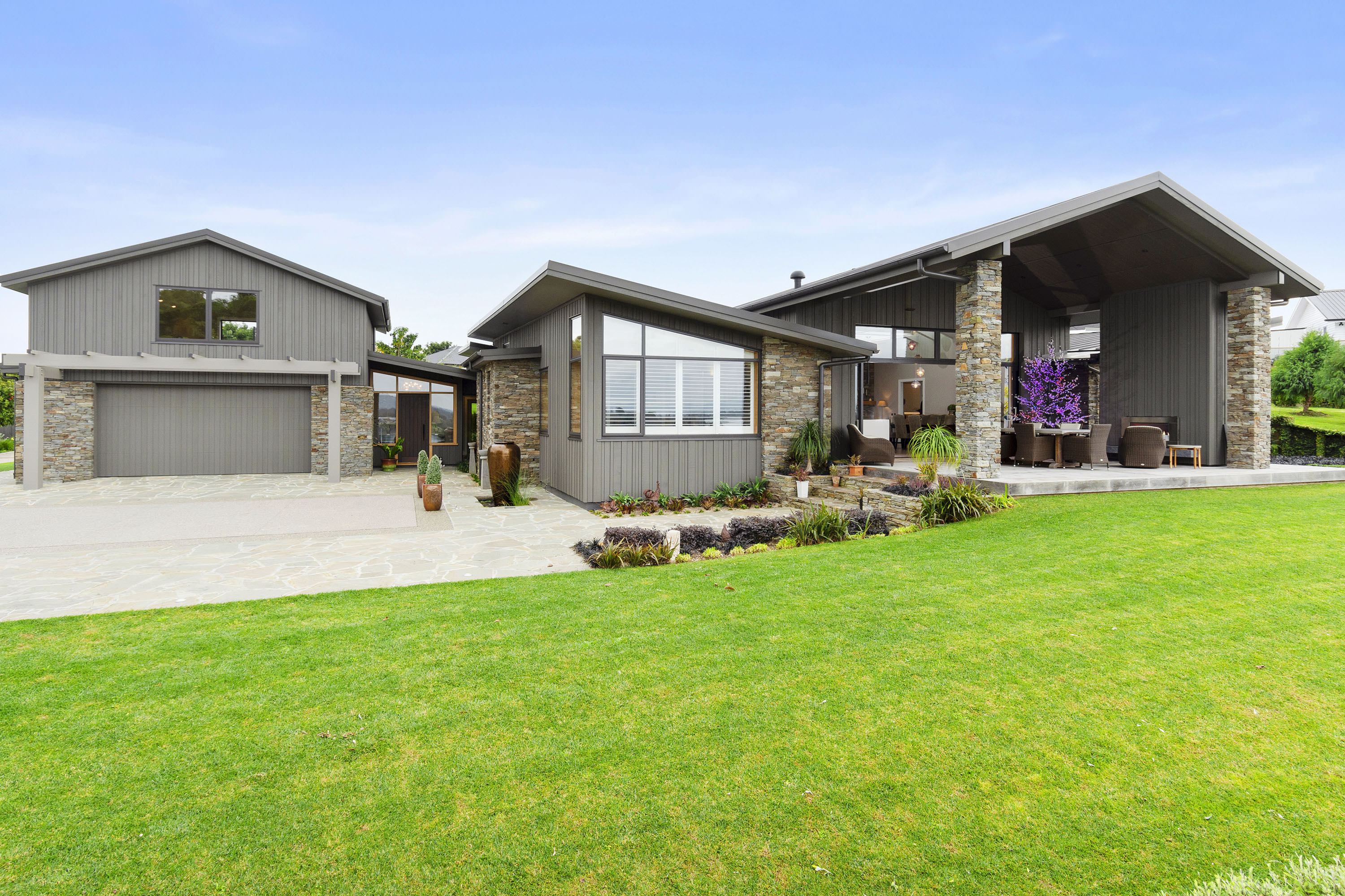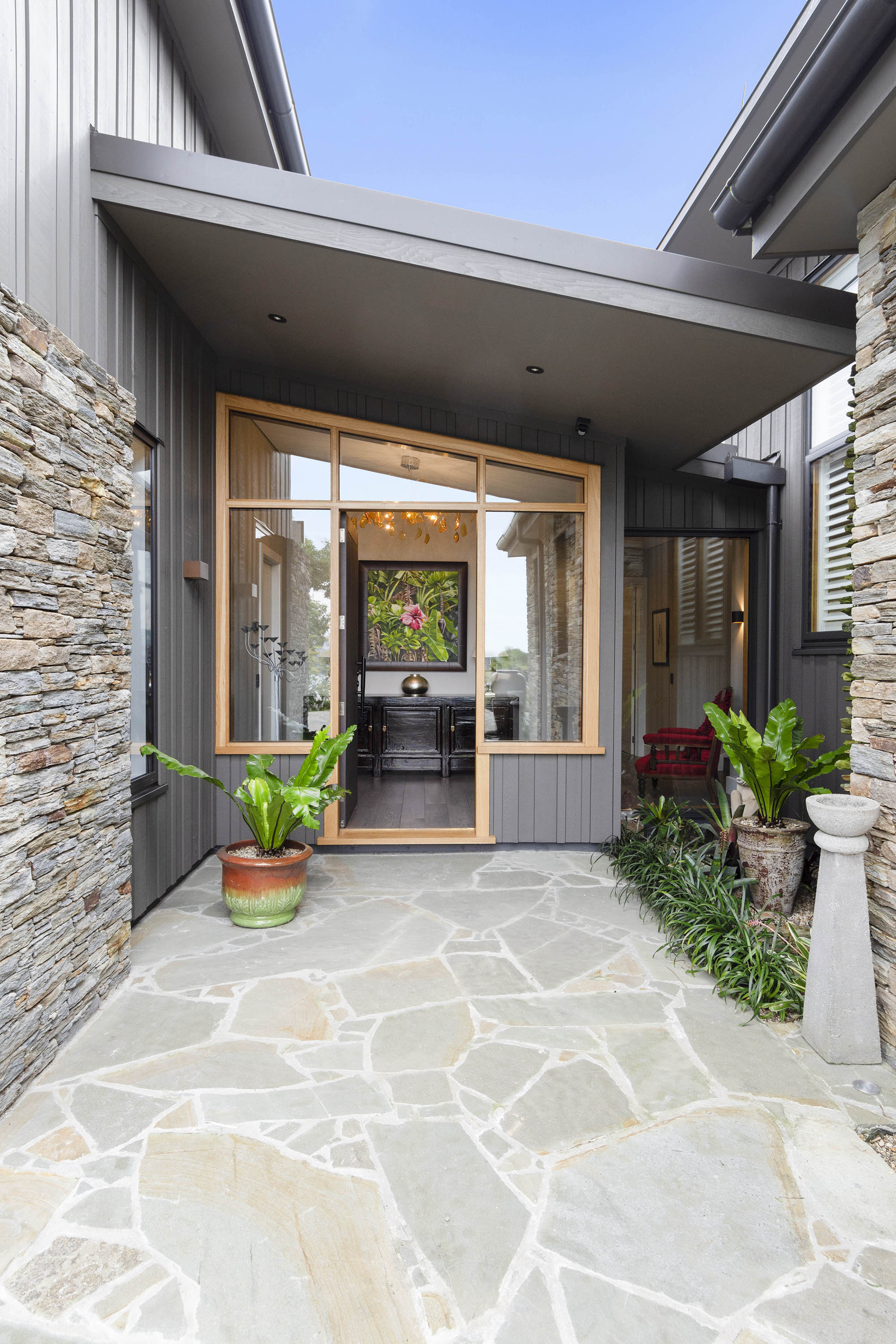 You only need to take one look at this edgy, modern abode in Tauranga to know it’s something special. Positioned on either side of its huge central volume, raking rooftops spread their wings. Cedar weatherboard and schist cladding anchors the robust 439sqm home.