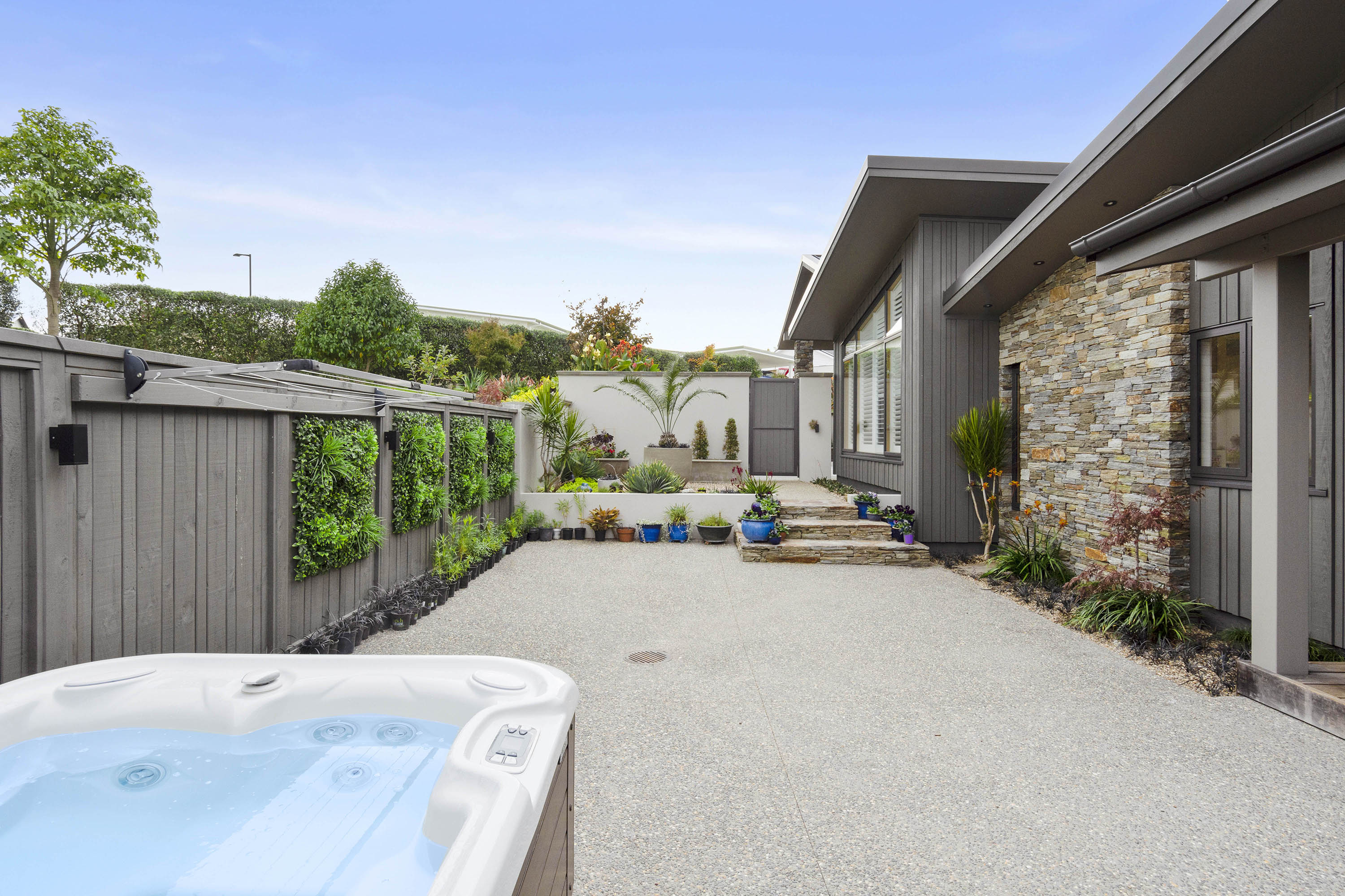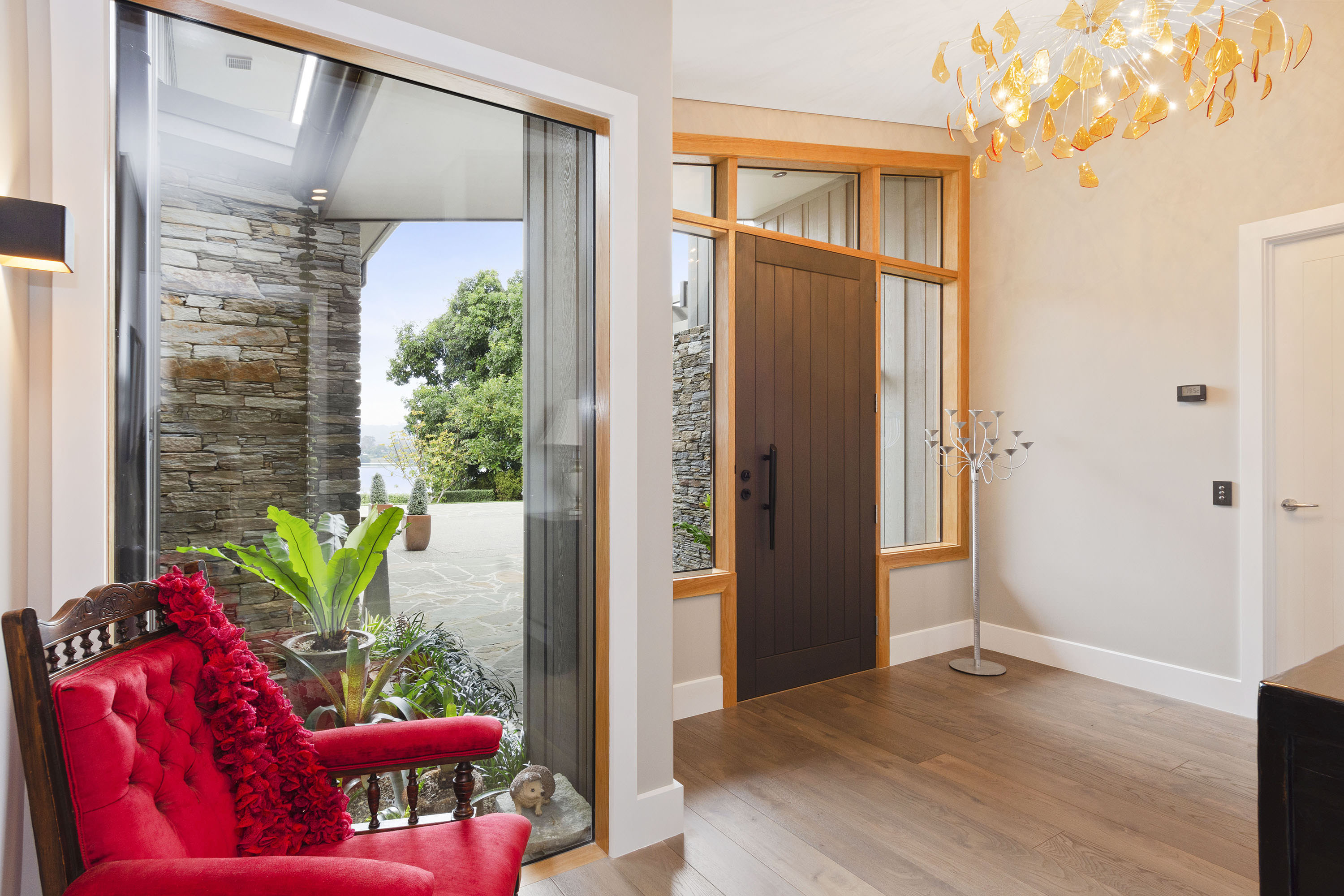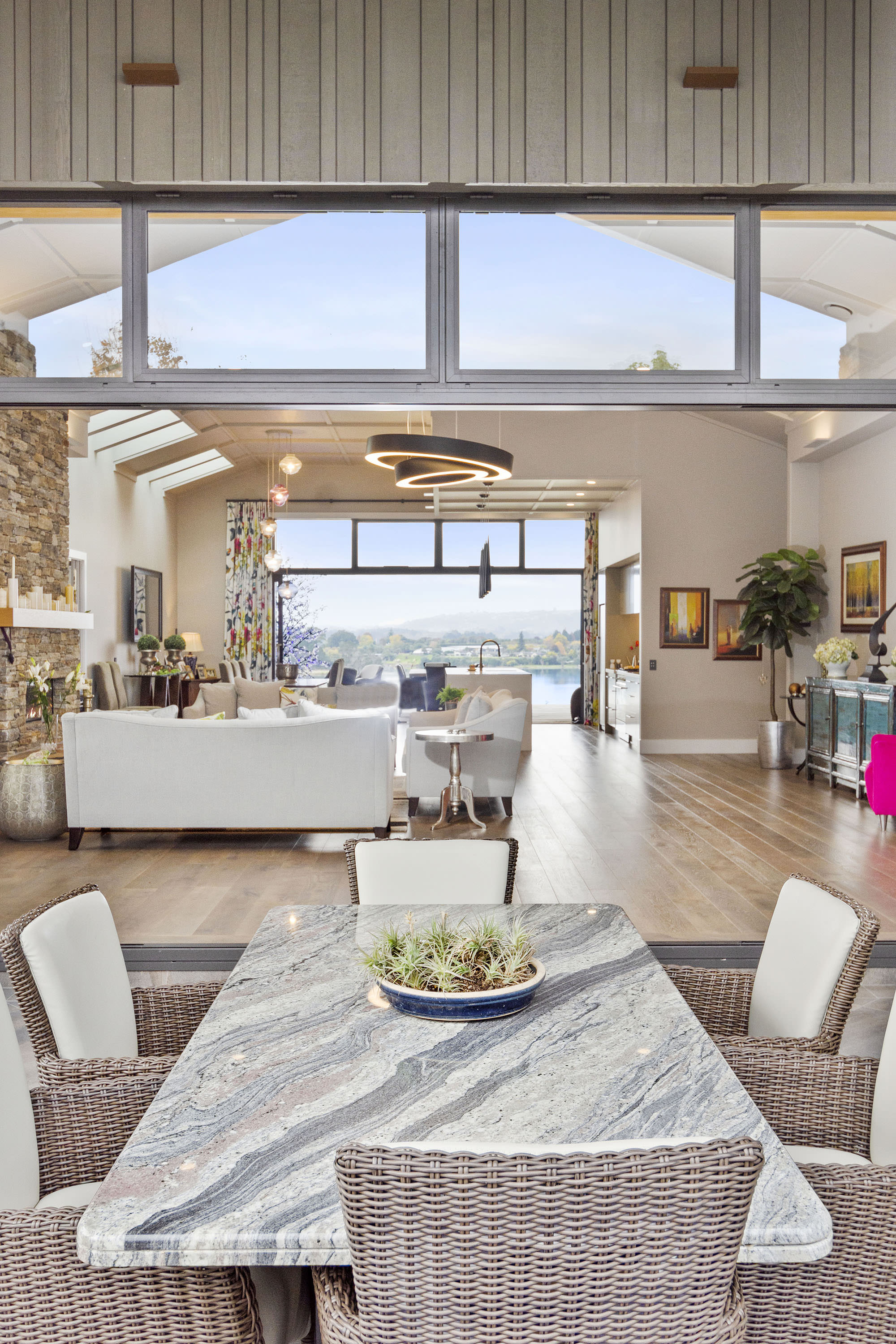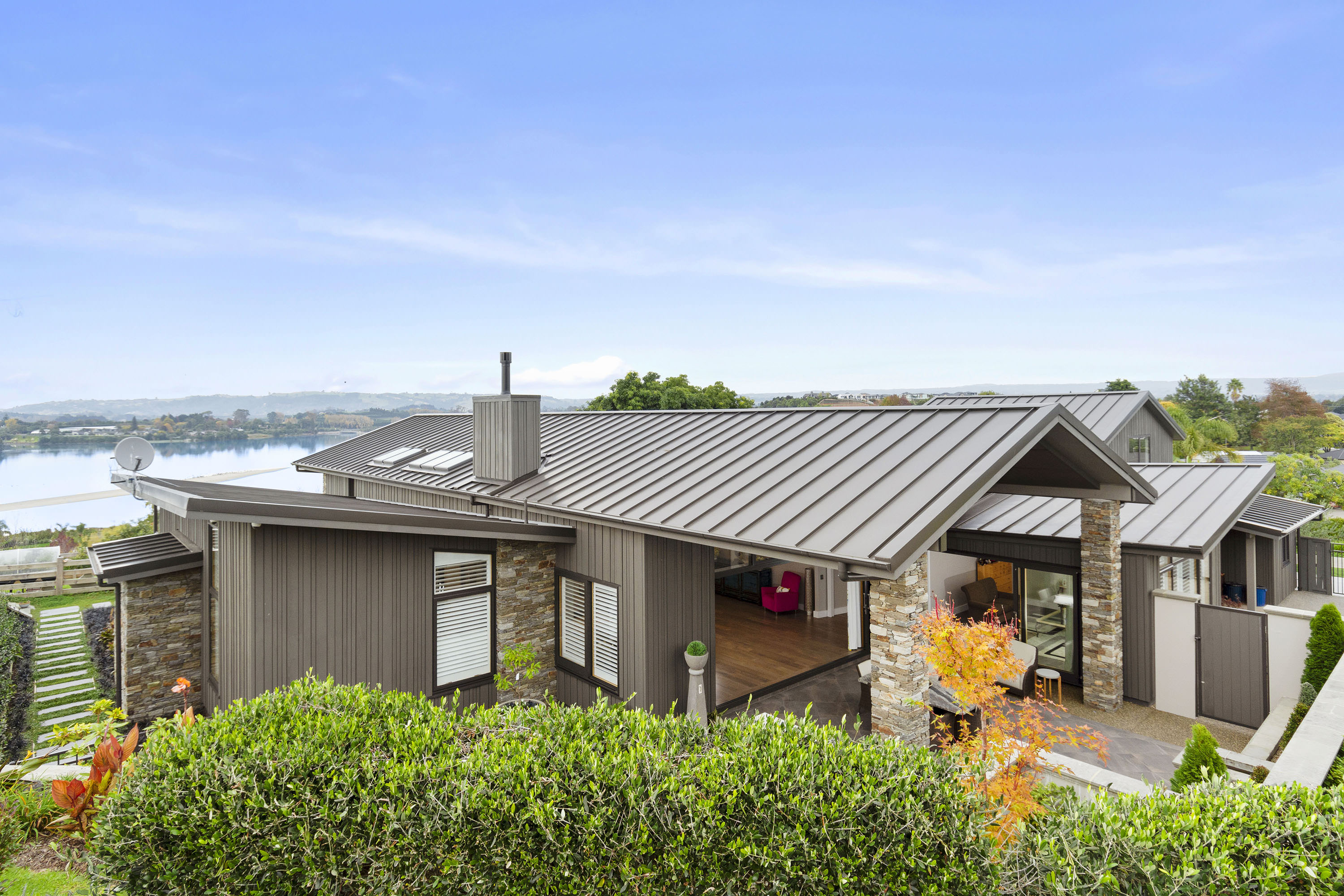 You only need to take one look at this edgy, modern abode in Tauranga to know it’s something special. Positioned on either side of its huge central volume, raking rooftops spread their wings. Cedar weatherboard and schist cladding anchors the robust 439sqm home.