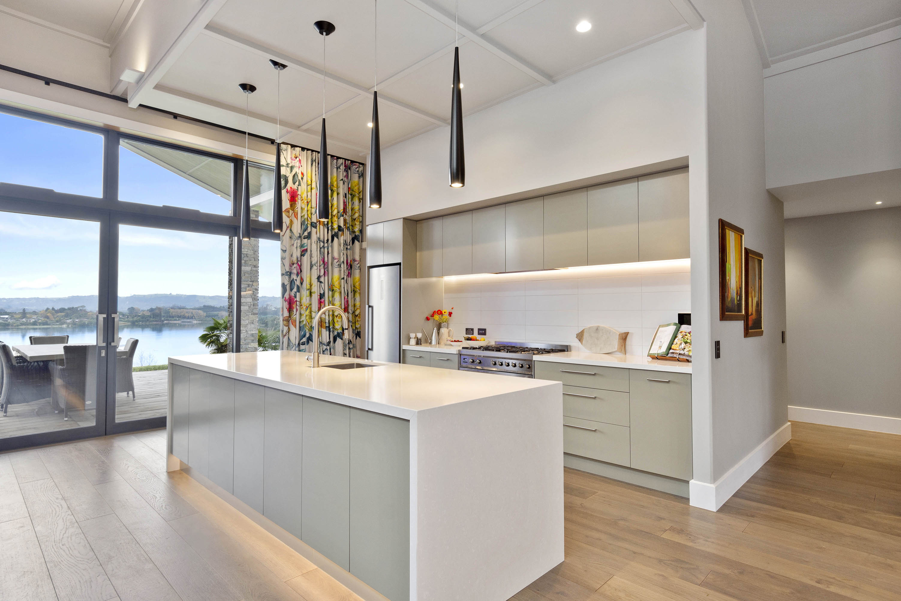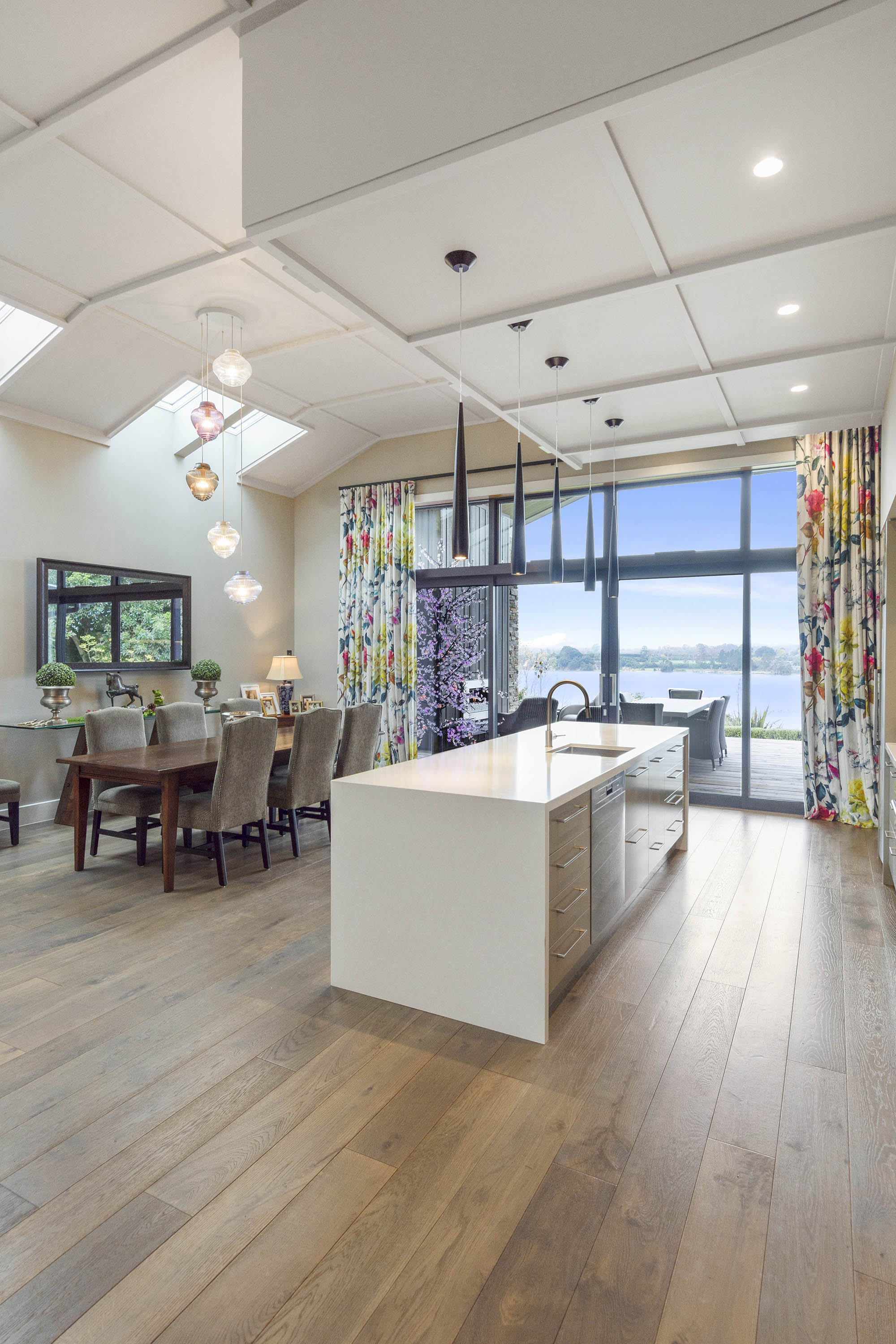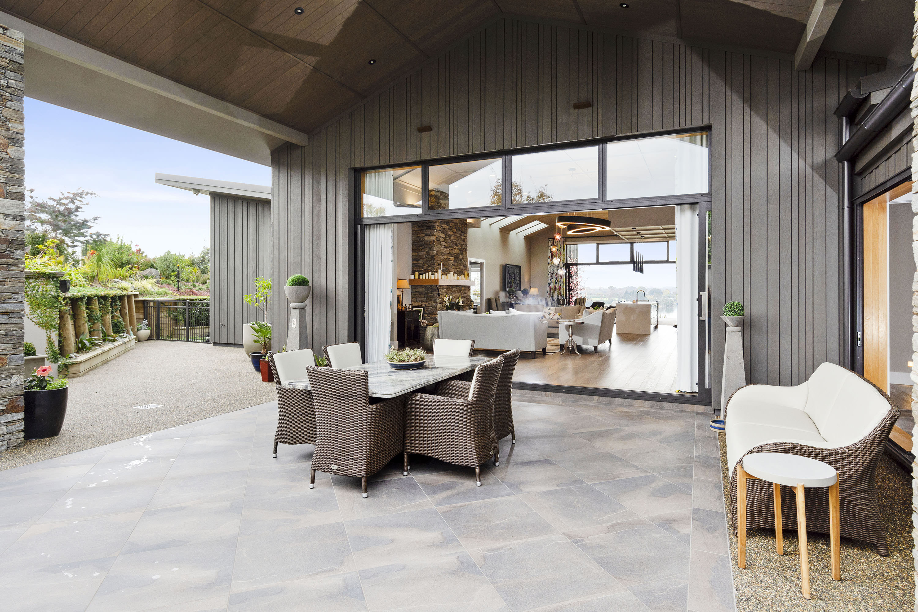 The gable roof extends out from either end of the open-plan zone, giving cover to large outdoor entertaining areas. This offers the best of both worlds, with views to the south, and sun to the north.