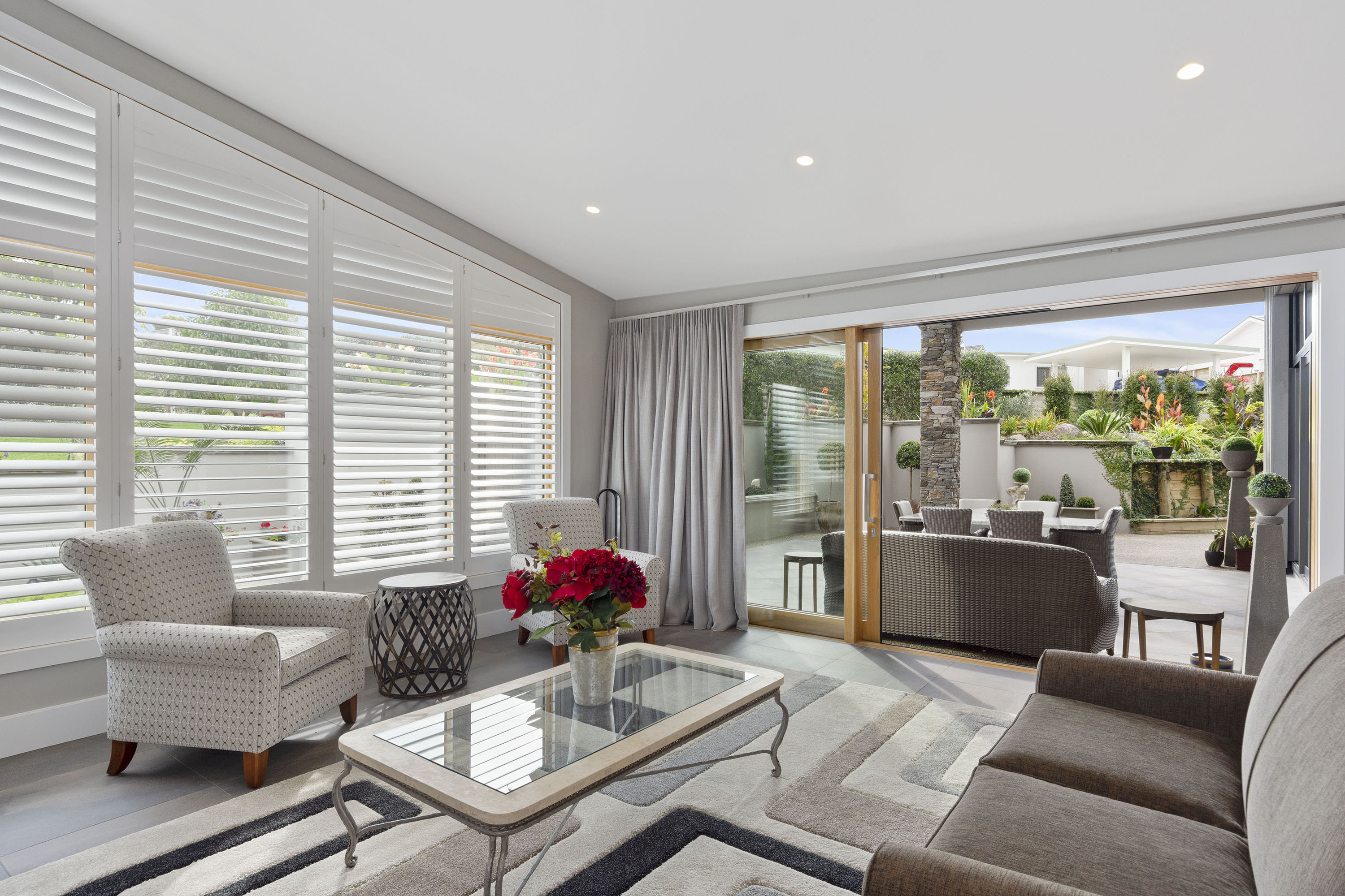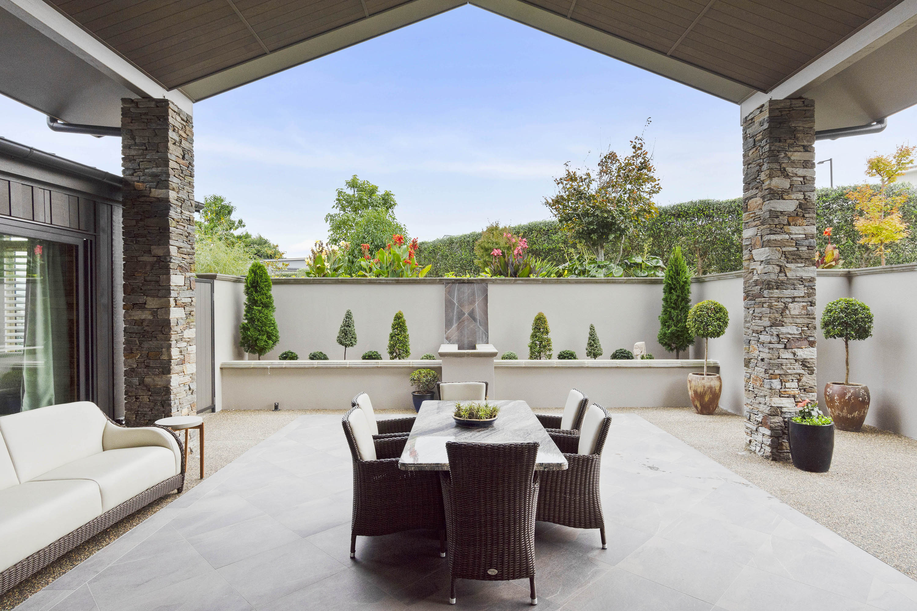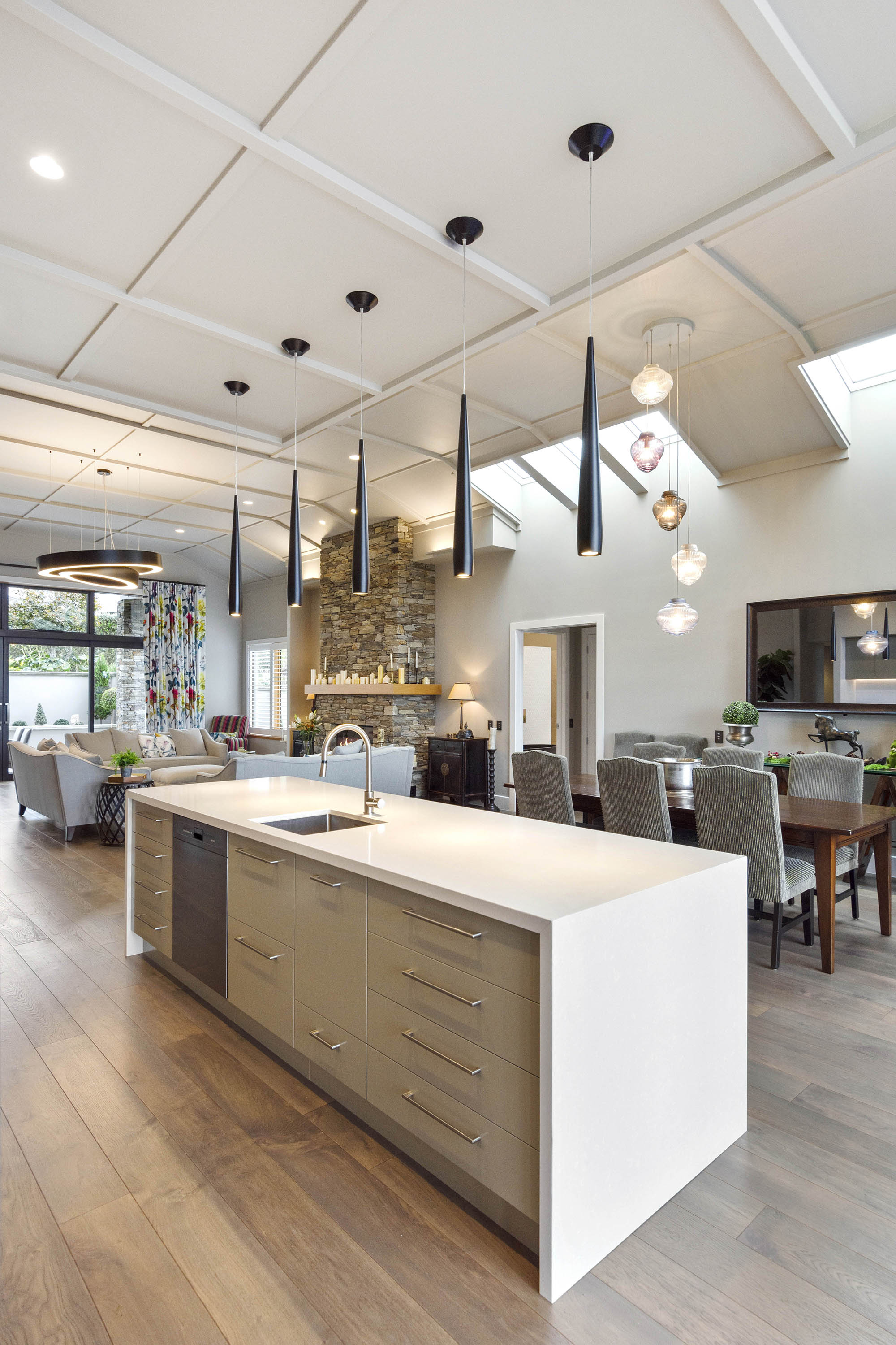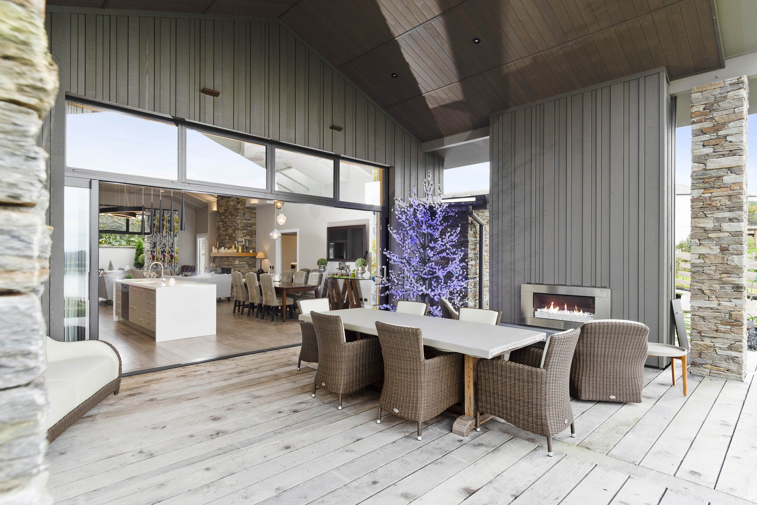The gable roof extends out from either end of the open-plan zone, giving cover to large outdoor entertaining areas. This offers the best of both worlds, with views to the south, and sun to the north.