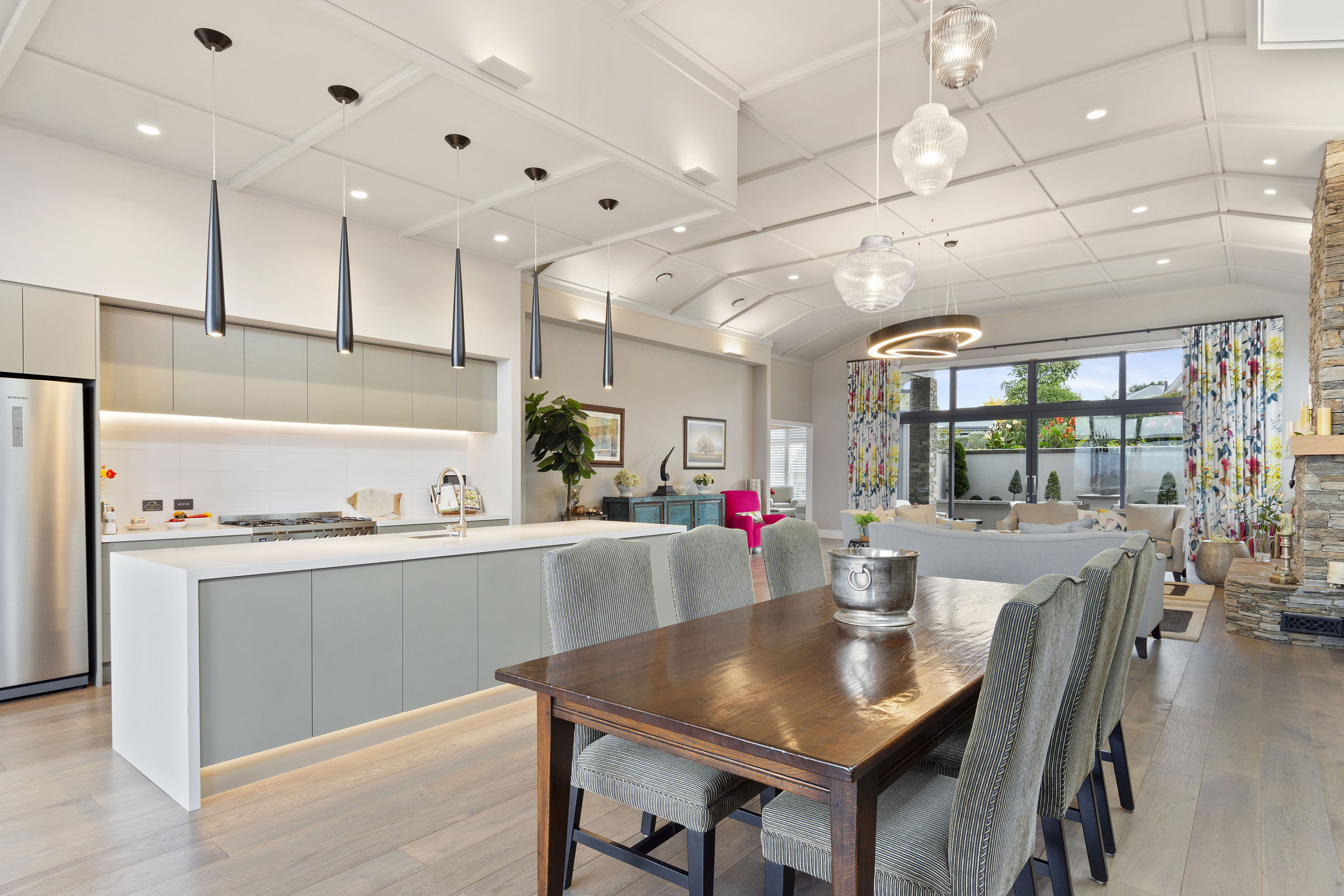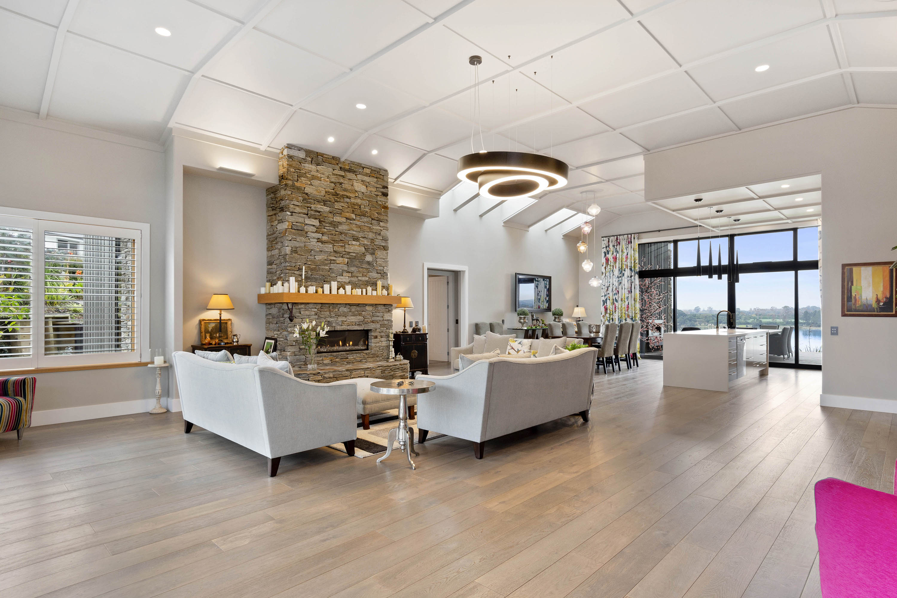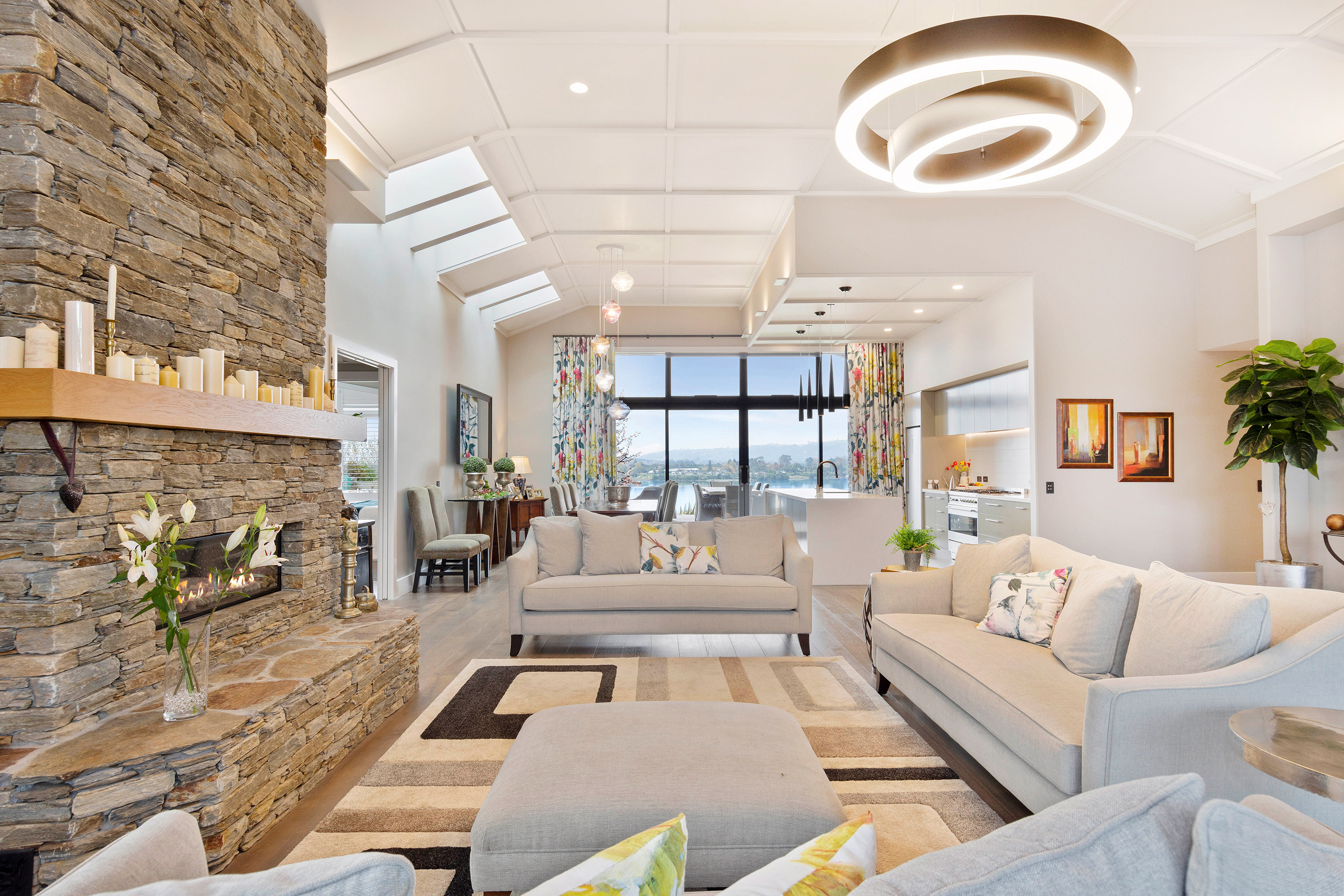A curved wall leads from the entrance into the open-plan living area, deserverdly dubbed the Great Hall. The 4m-high ceiling with grid and batten detail demands attention above the kitchen/dining/living areas. A huge stone hearth draws you into the sitting area.