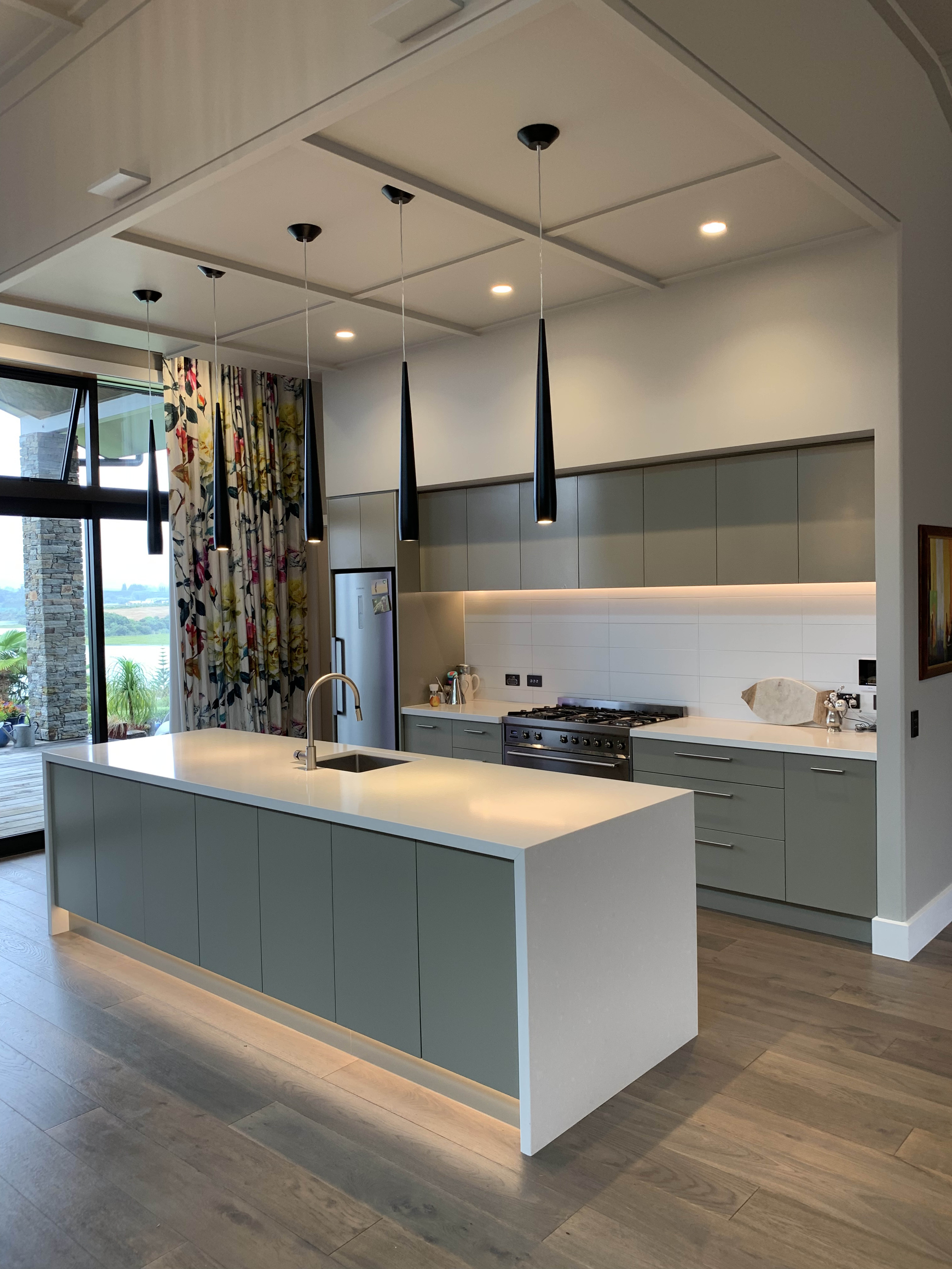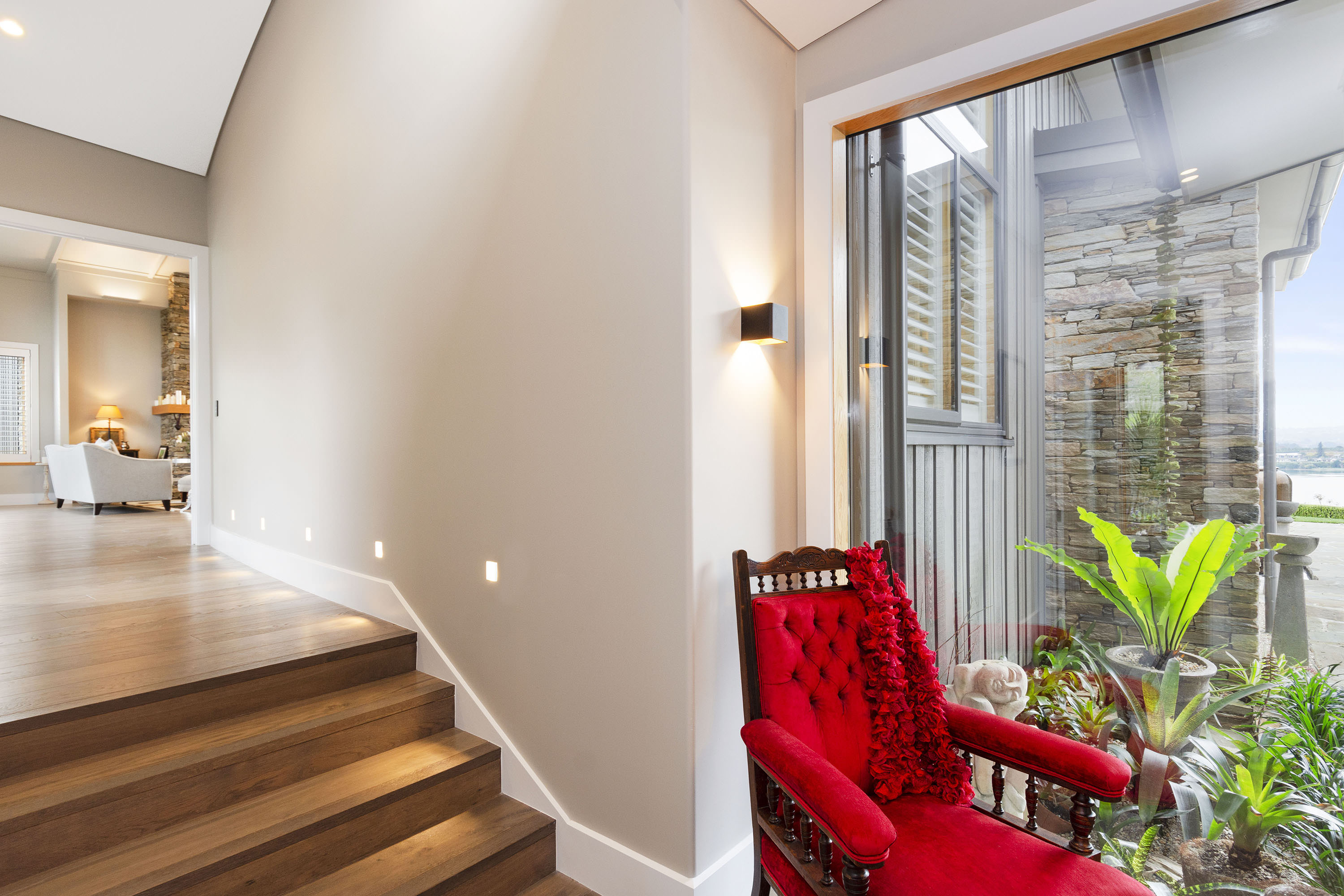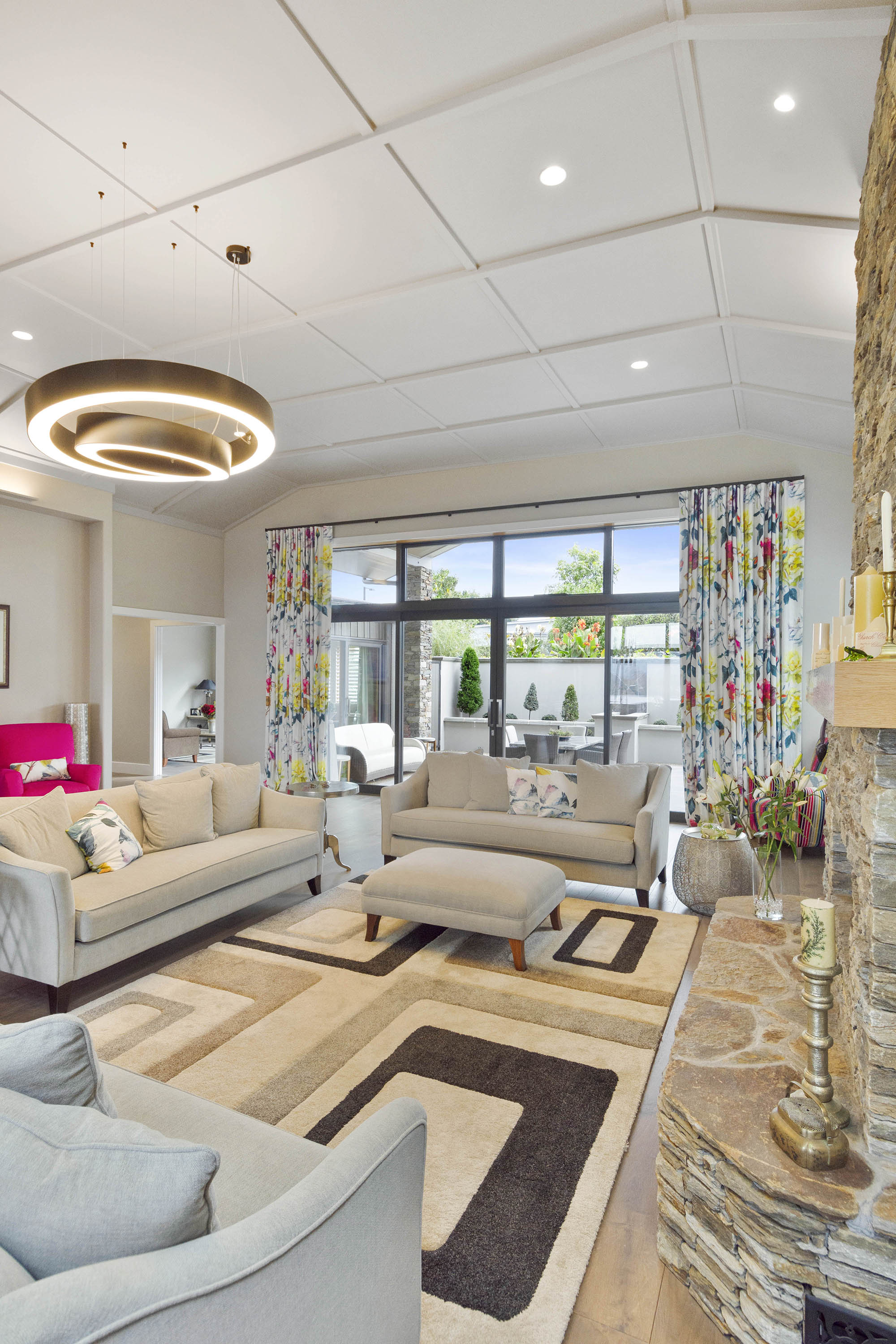 A curved wall leads from the entrance into the open-plan living area, deserverdly dubbed the Great Hall. The 4m-high ceiling with grid and batten detail demands attention above the kitchen/dining/living areas. A huge stone hearth draws you into the sitting area.