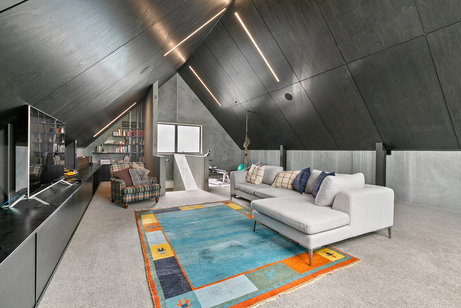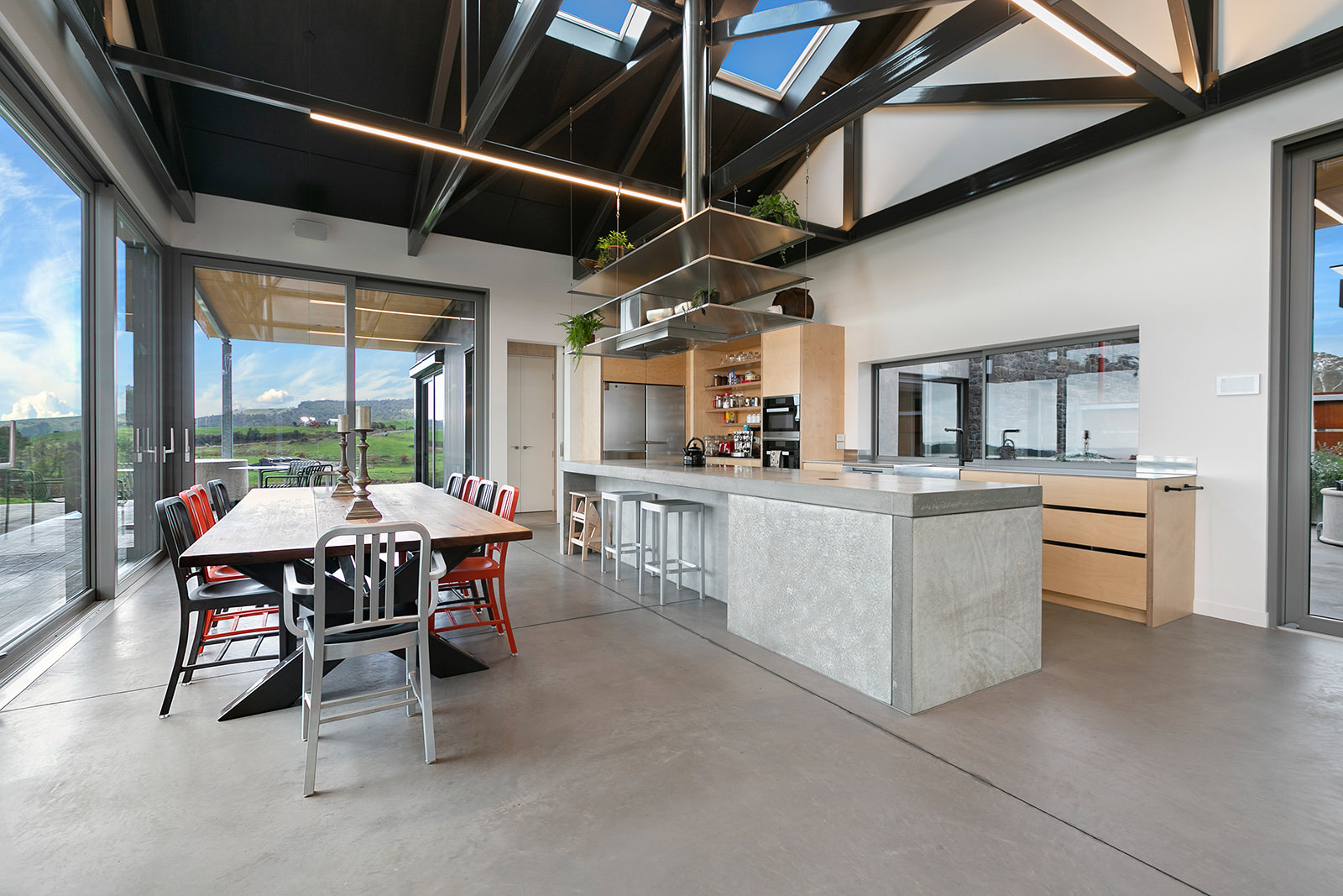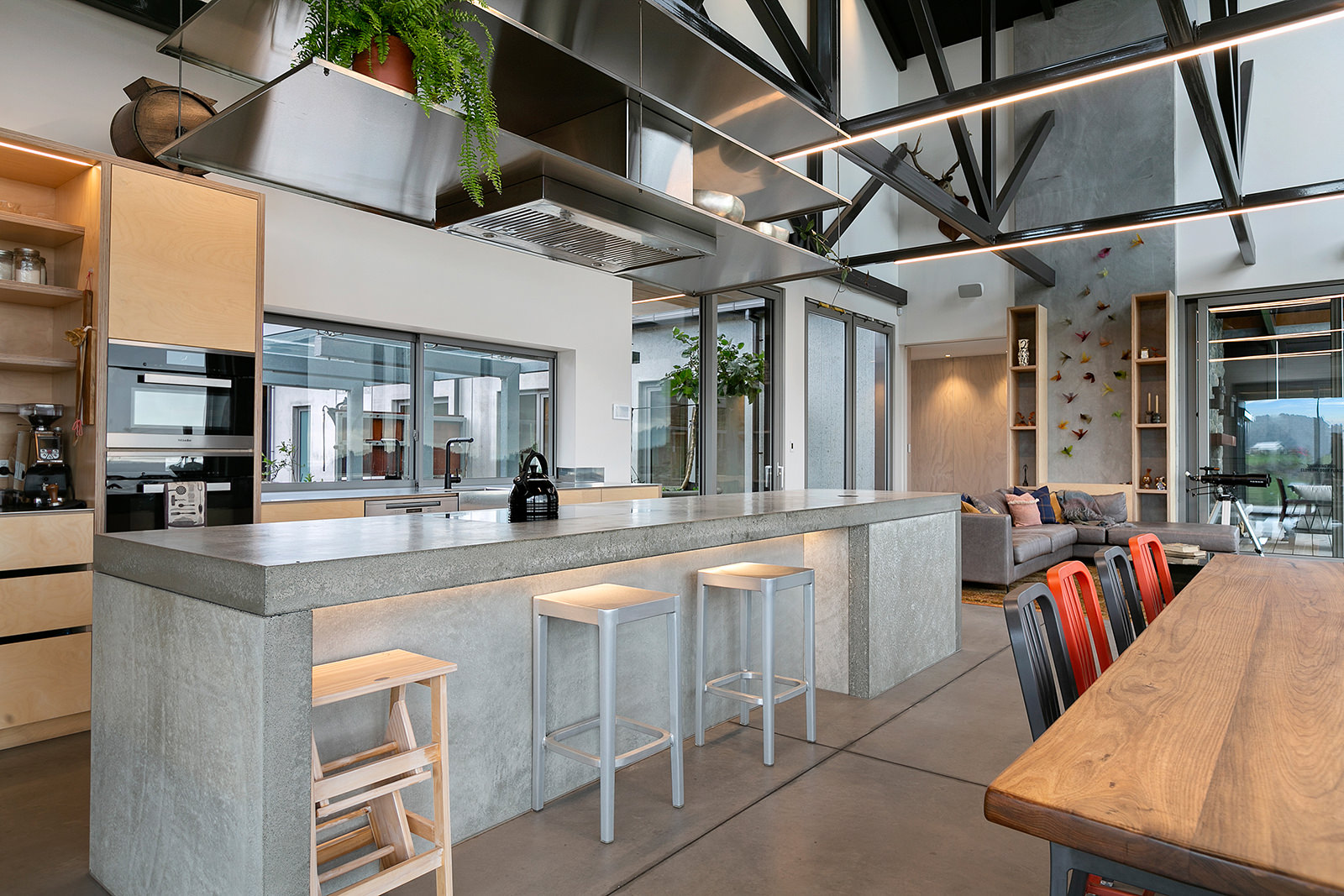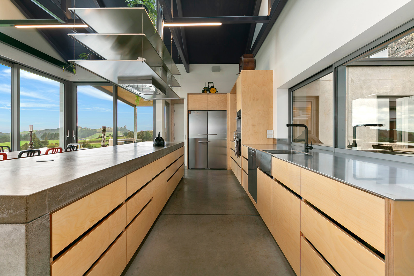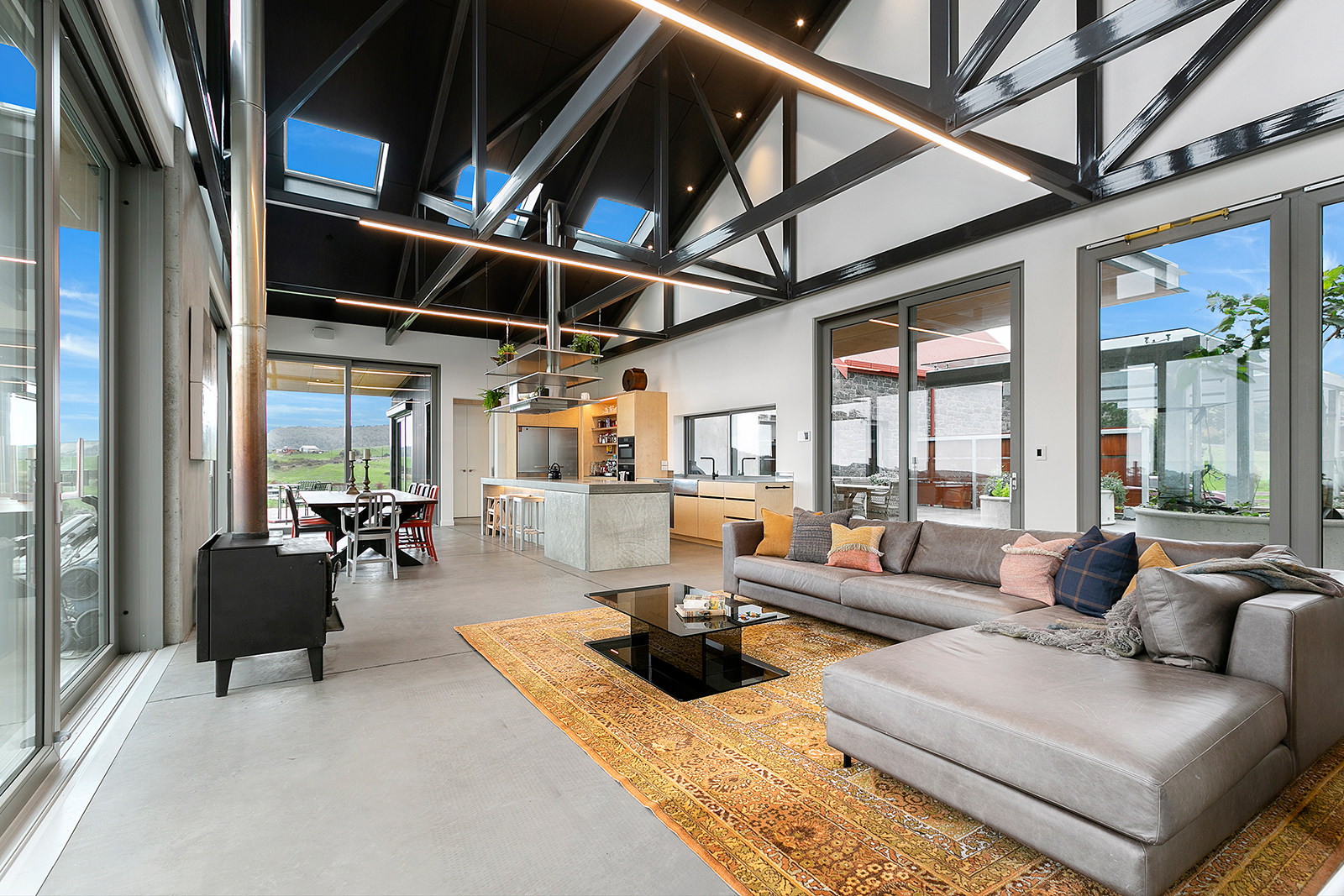 Exposed steel trusses add strength and industrial appeal. Precast concrete and suspended shelving also nod to this commercial approach. Plywood ceilings and wall panelling soften the overall effect.