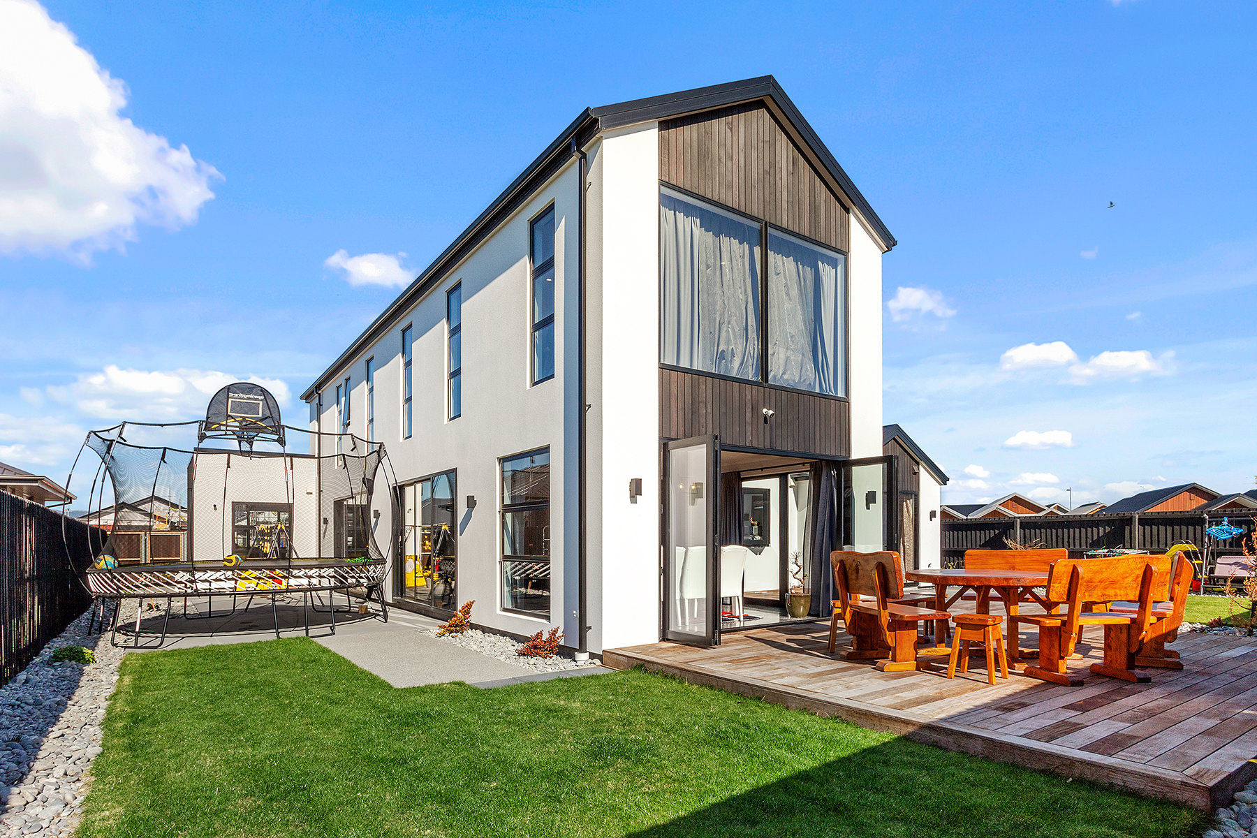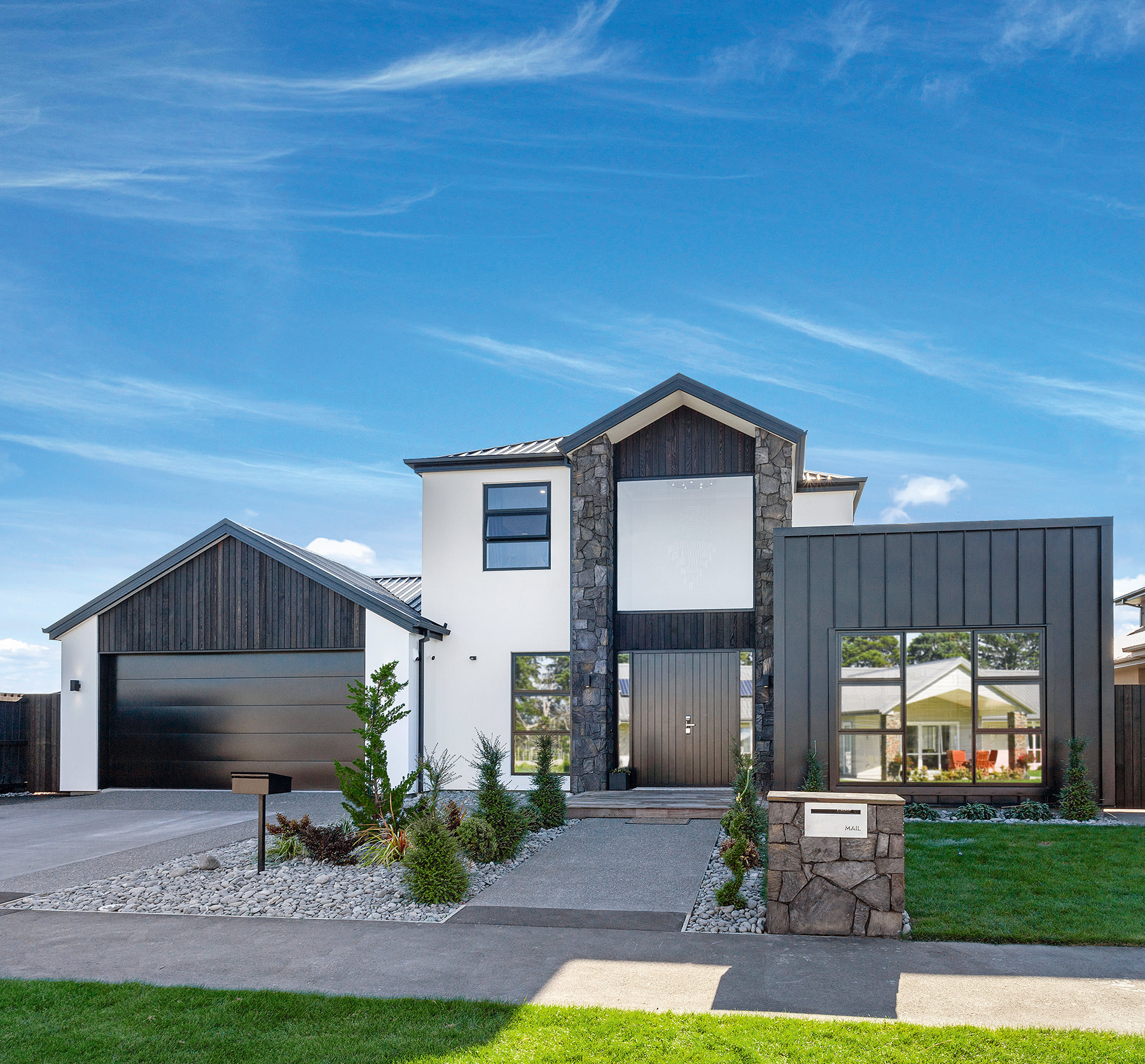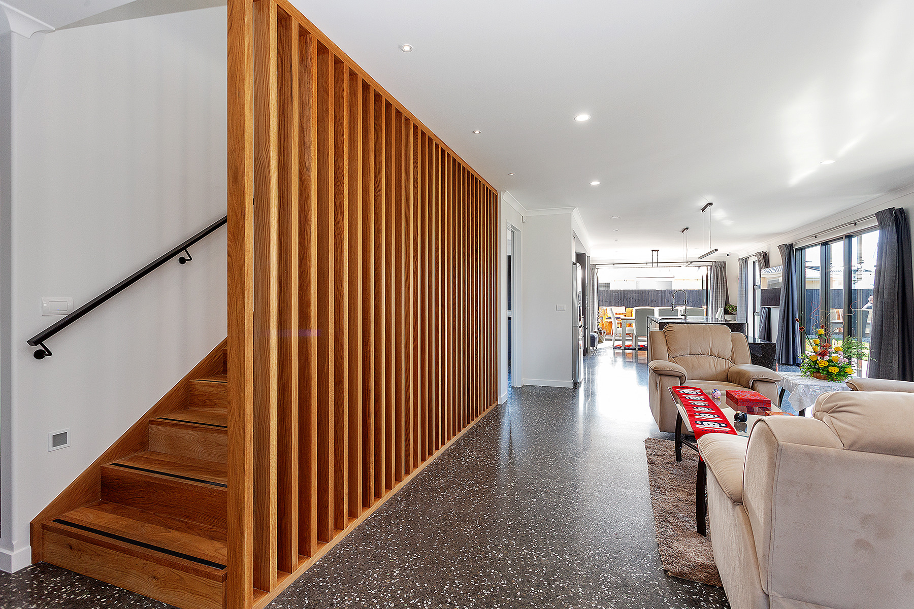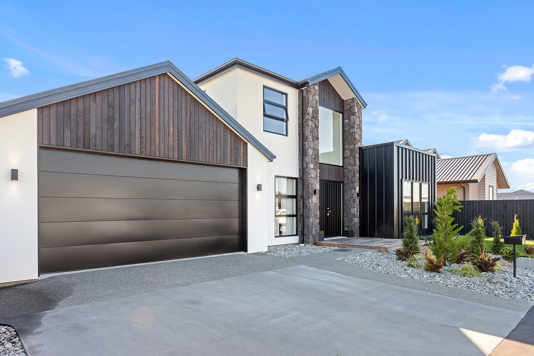 Grand volumes, sharp lines and bold material choices create undeniable street presence. Double doors open to a light-filled double-height foyer – a grand entry befitting this luxurious Christchurch home.