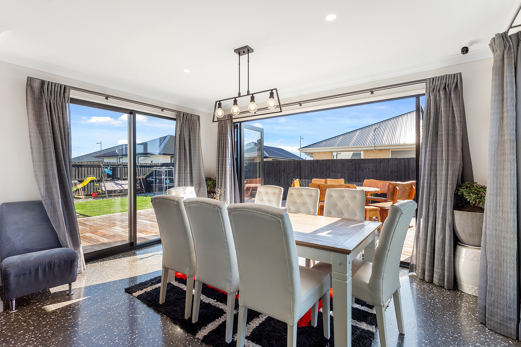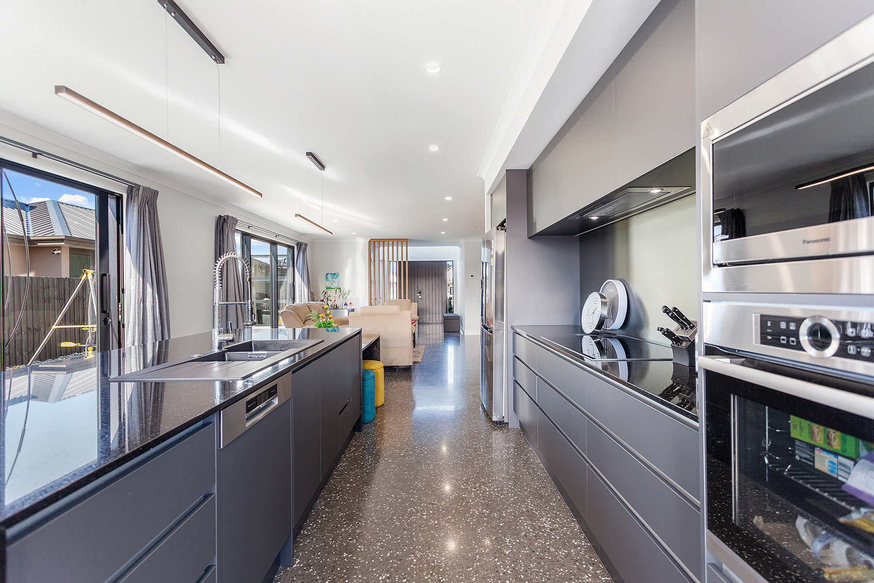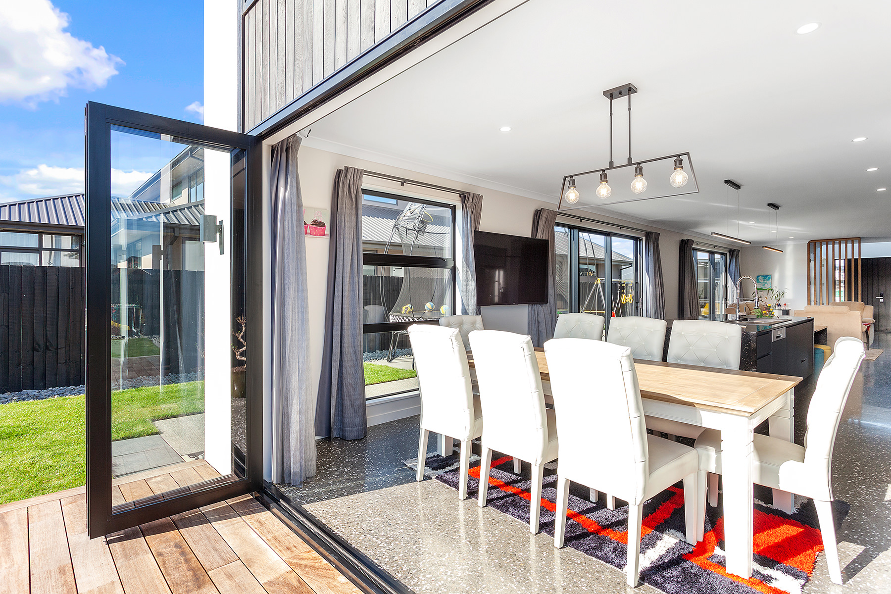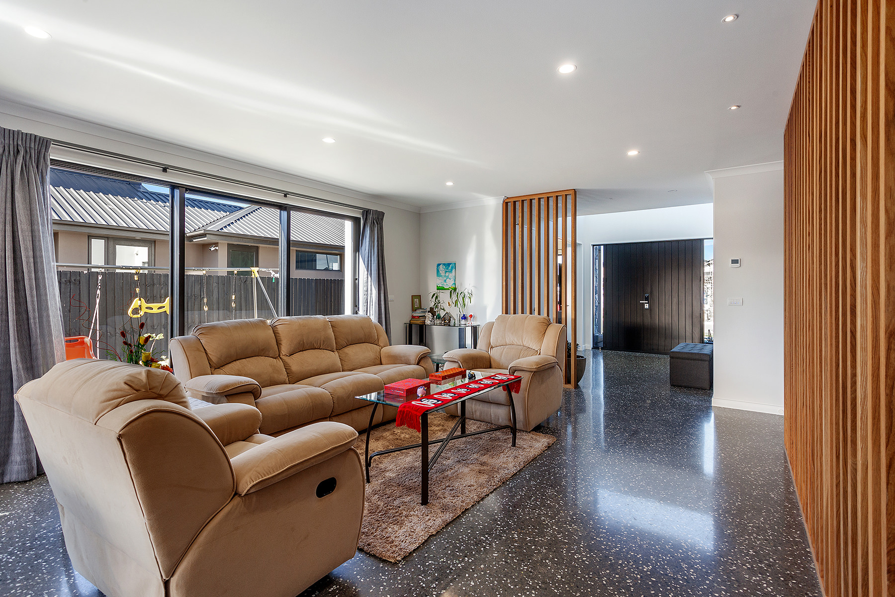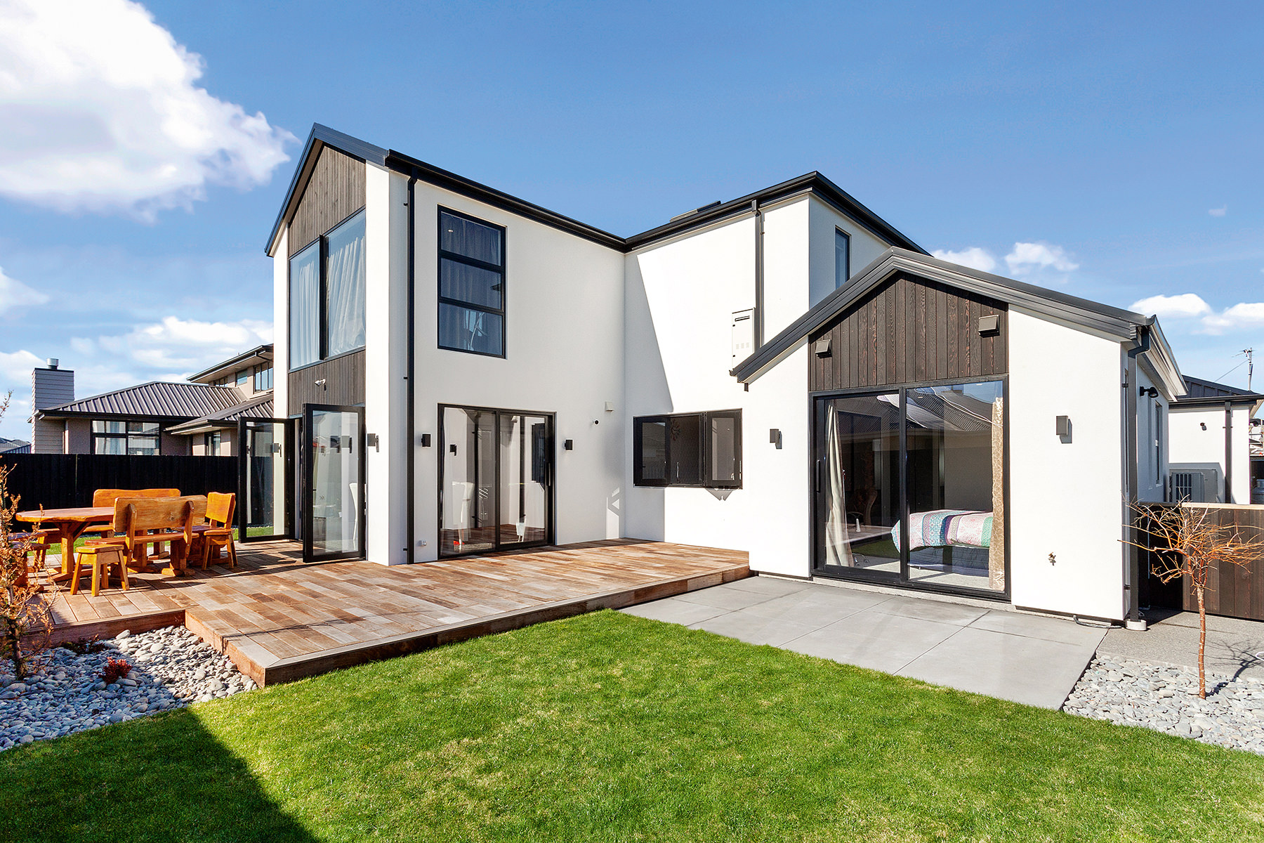Grand volumes, sharp lines and bold material choices create undeniable street presence. Double doors open to a light-filled double-height foyer – a grand entry befitting this luxurious Christchurch home.