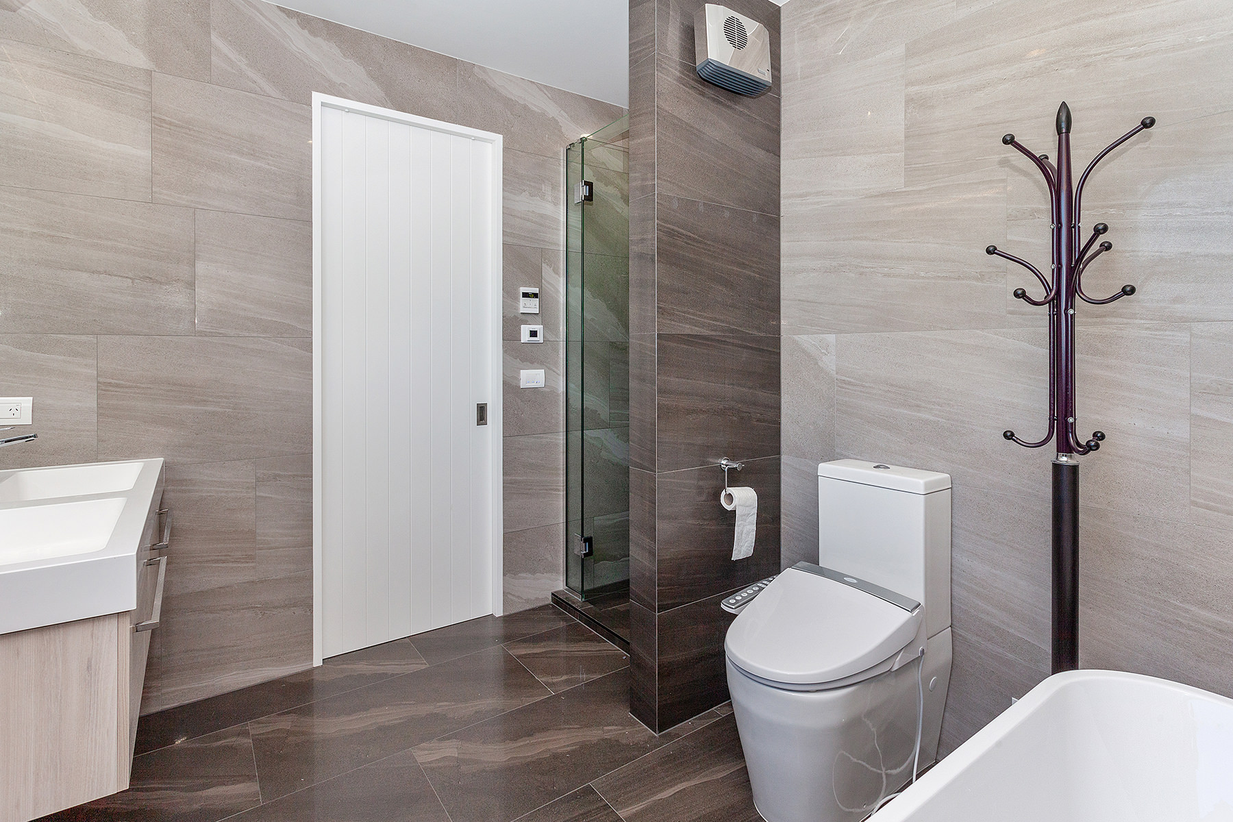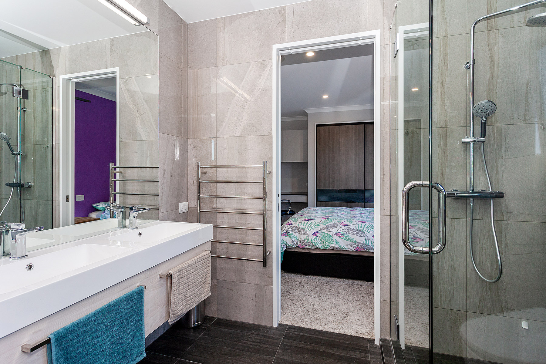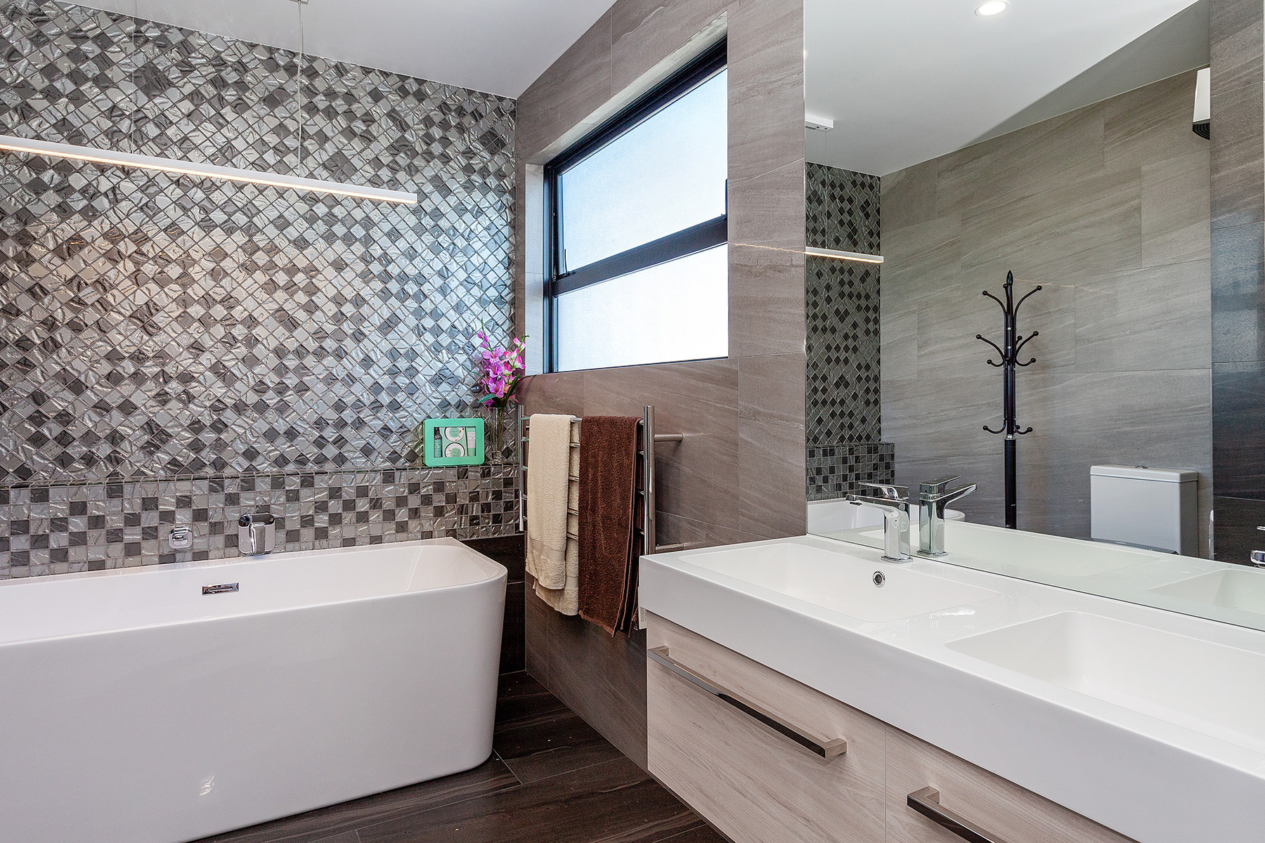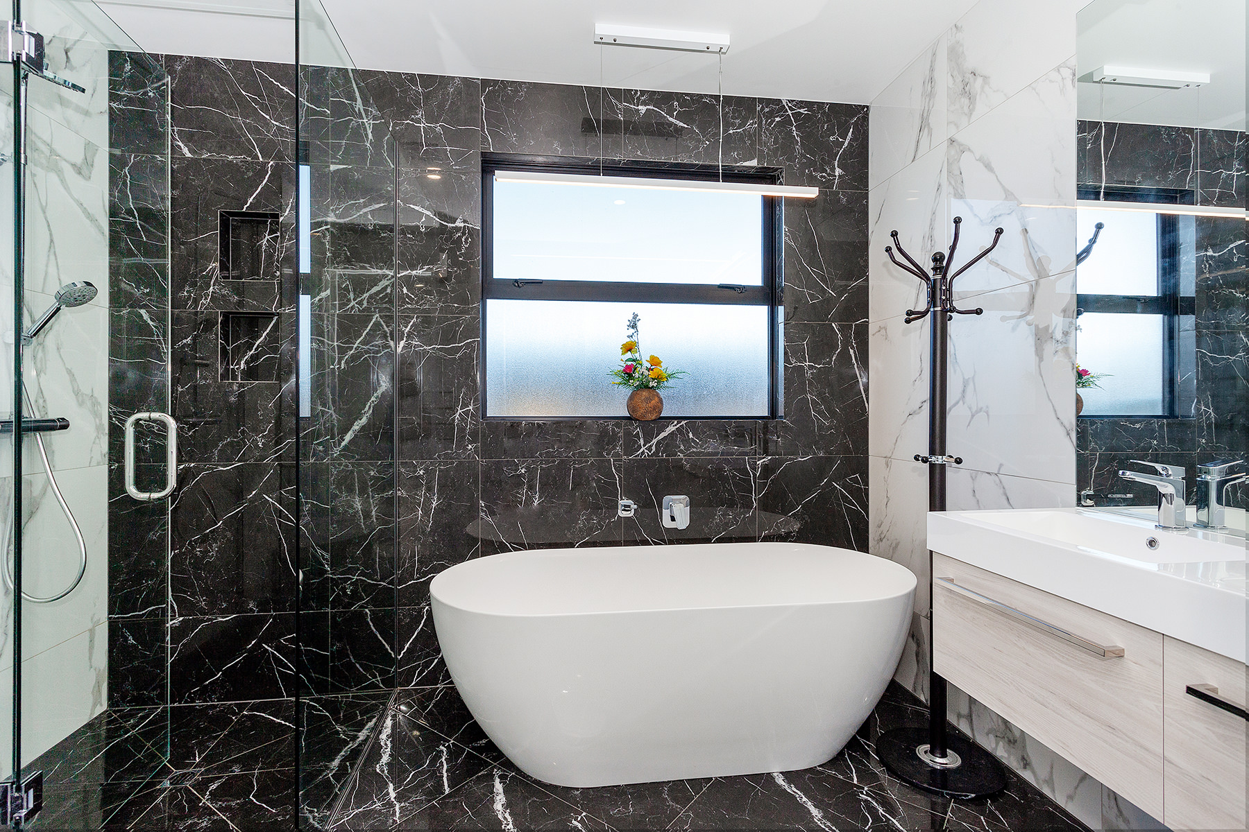 Ascend the stairs to admire the main family sleeping quarters. These four bedrooms are each equipped with their own private ensuite. The master bedroom awaits downstairs with a luxurious ensuite to rival its peers. Black and white marble tiles make a bold statement, covering the walls and floor. A multipurpose bathing space incorporates a wet-floor shower and freestanding bath.