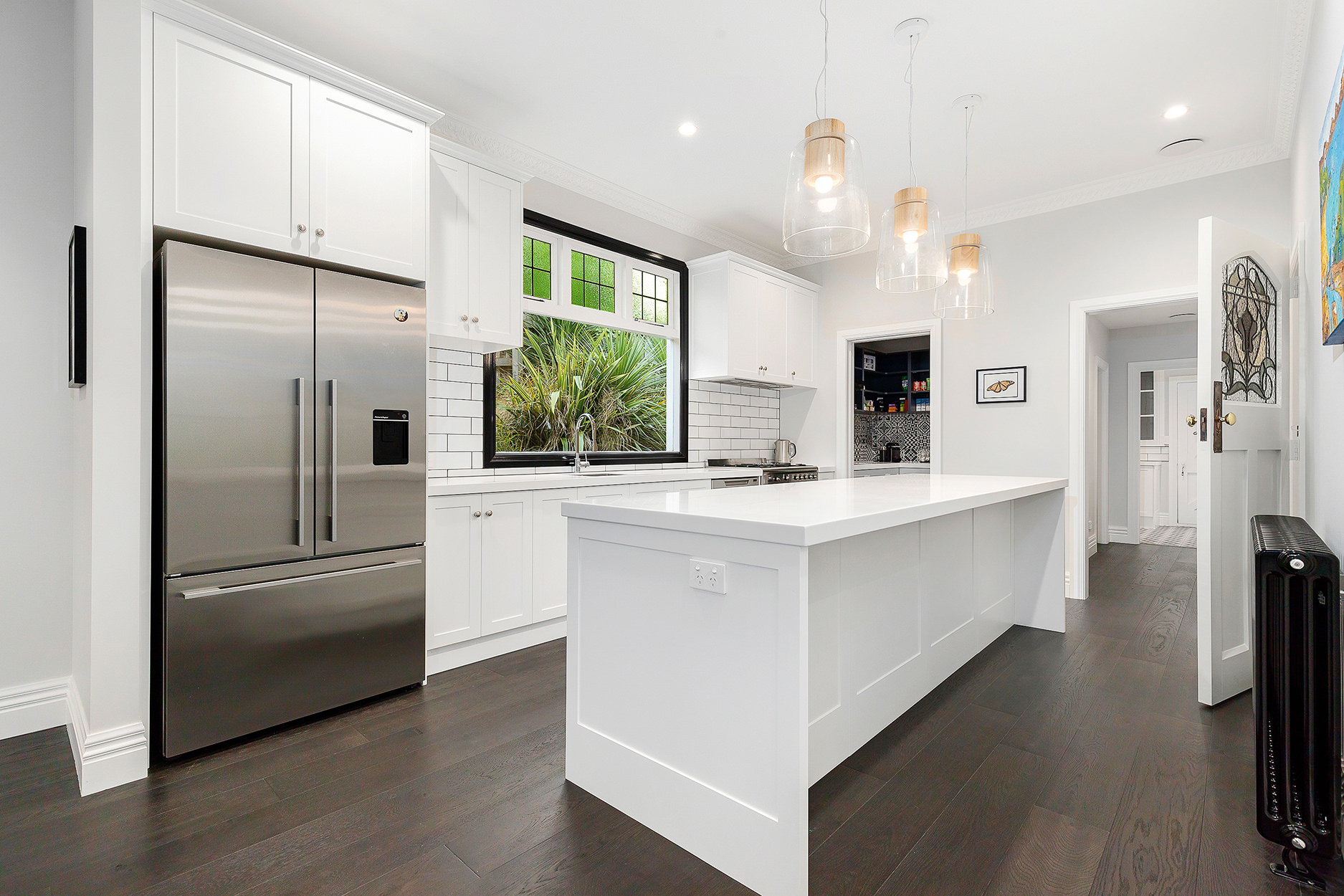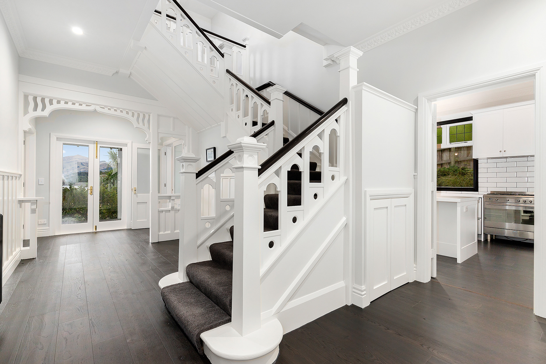 New mouldings grace the elaborate central staircase and entrance way. Traditional scotia honours the home’s heritage. Dark wood floors add depth in predominantly white surroundings and flow into the classic entertainer’s kitchen. Decorative tiles add modern flair in the spacious walk-in pantry.