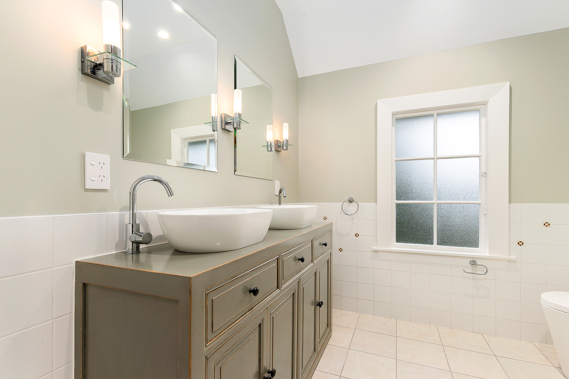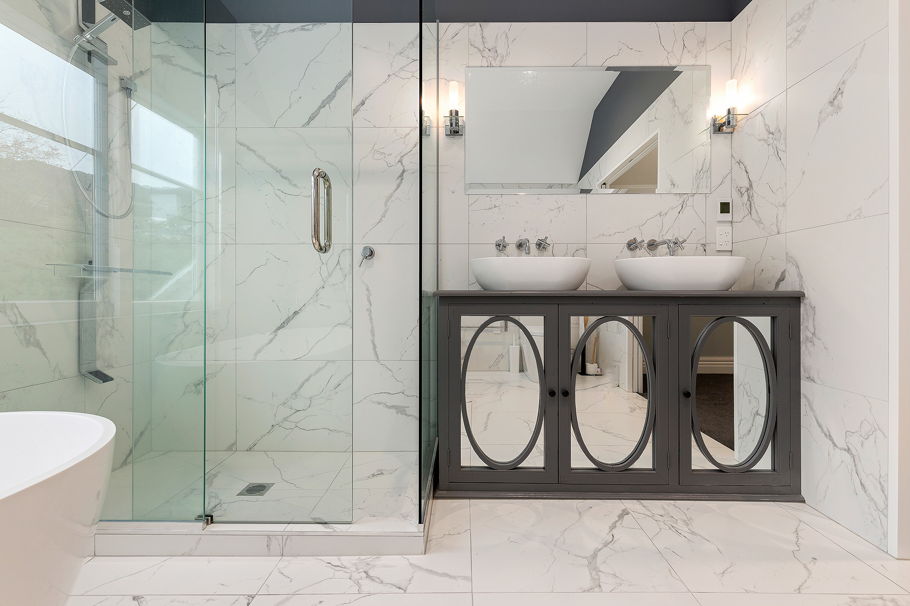 The four tiled bathrooms are beautifully equipped with glazed showers and quality fixtures and fittings. A chic freestanding bath beckons for ultimate relaxation in spacious surrounds.