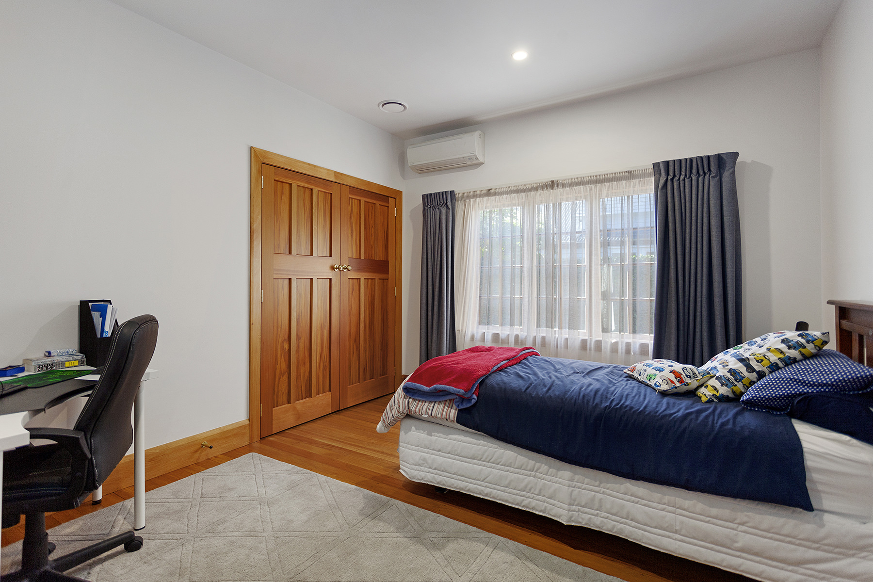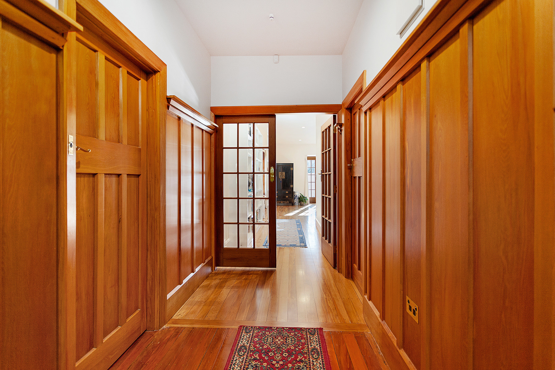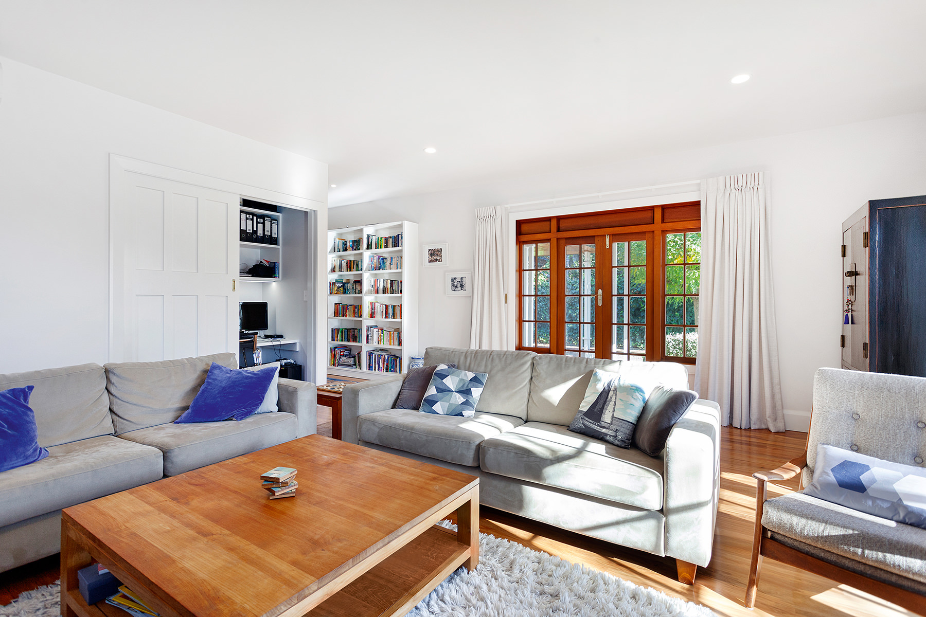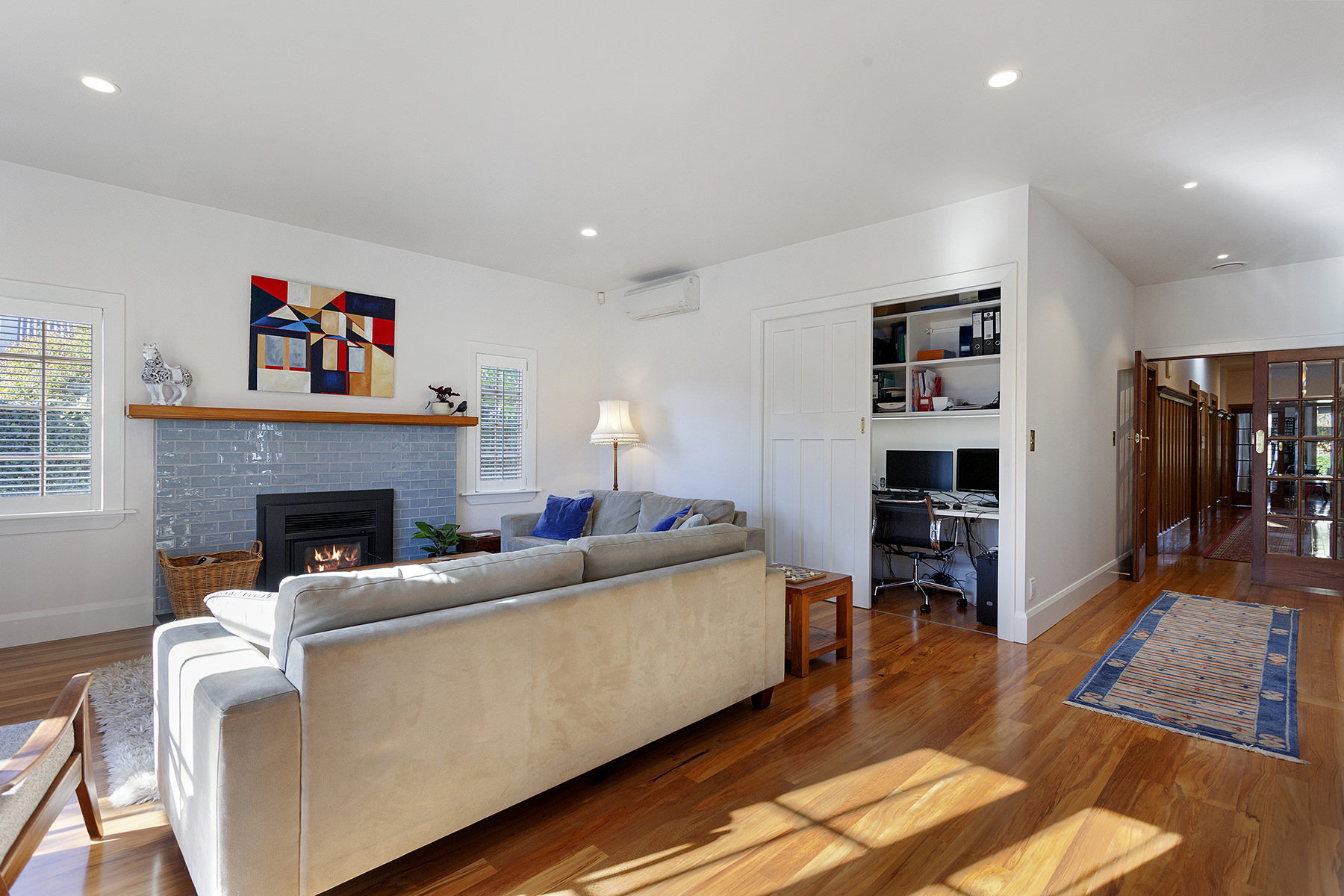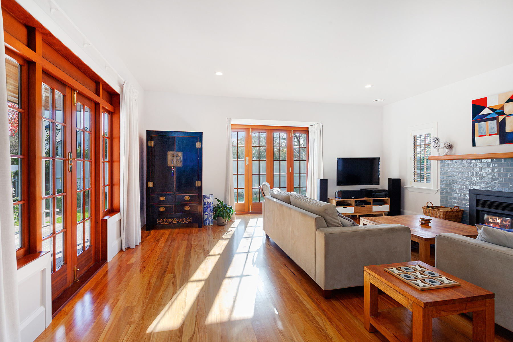 Internal French doors, positioned at the end of a wide hallway, flow into a stunning and spacious new living room. Traditional with a few modern twists, this room is packed with features. A built-in study space is hidden behind a large sliding door. A woodburner set in a tiled surround makes this a warm, inviting sanctuary. Recessed lighting is a lovely addition, ensuring clean lines and open space. Two sets of French doors flow to improved alfresco living areas.