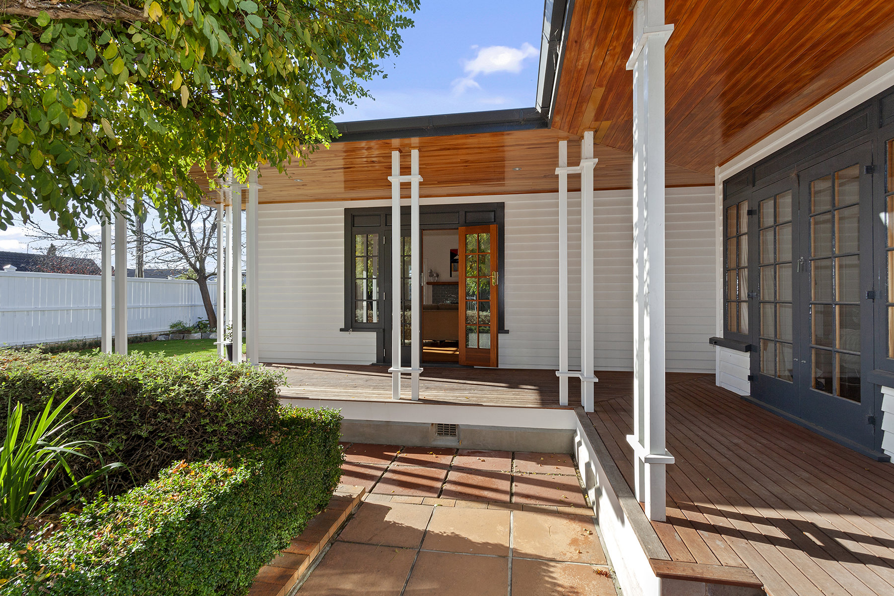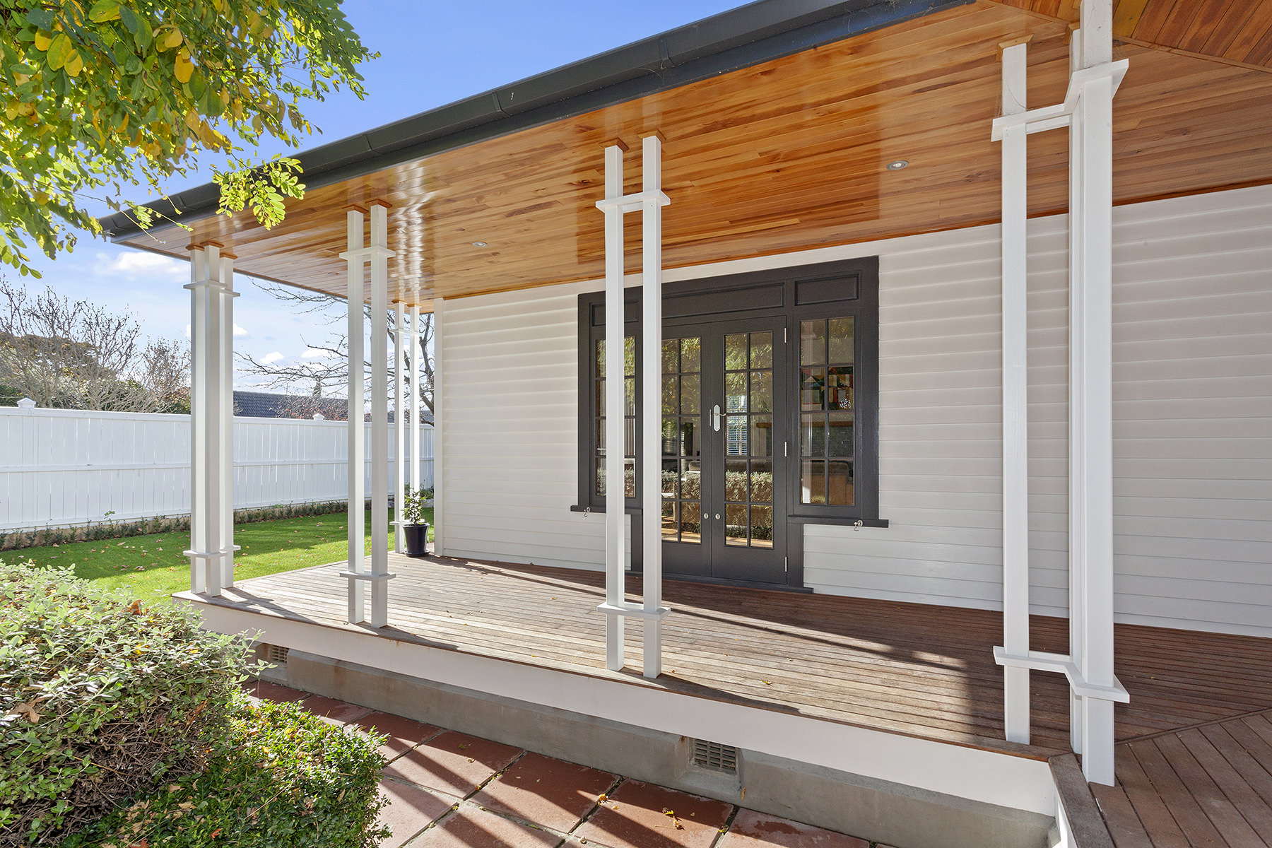 The remarkable ceiling to the new veranda echoes the rimu floors within. Handcrafted rimu window joinery and sculpted posts showcase expert craftsmanship.