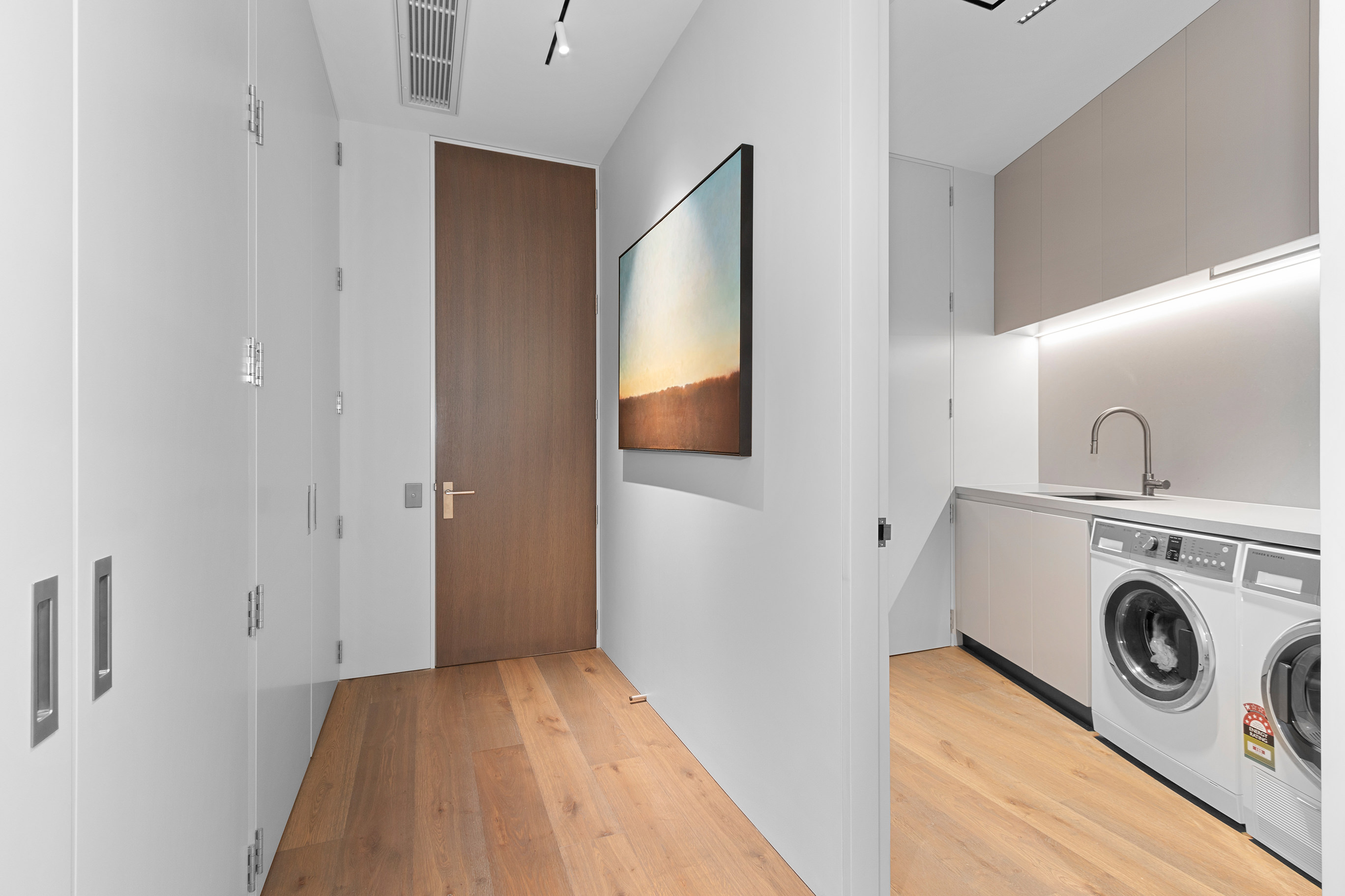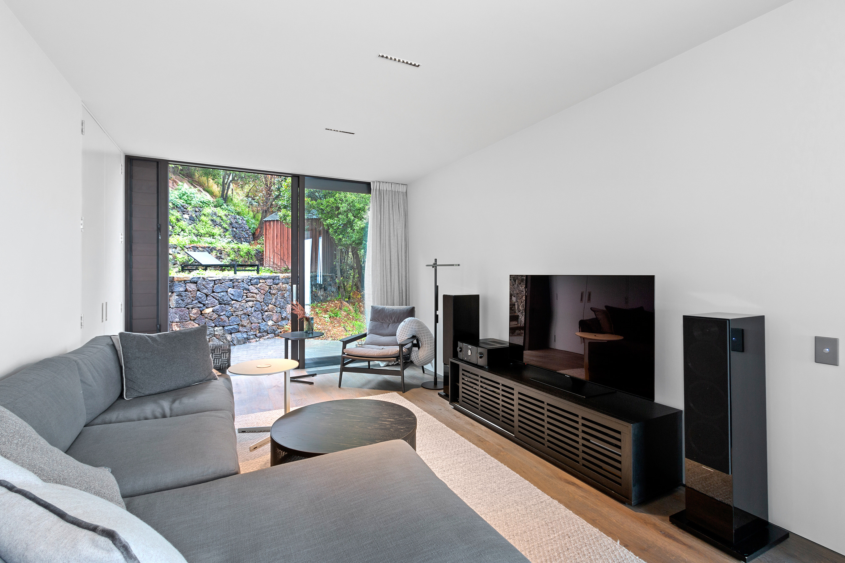 On the lower floor you’ll find a double garage, guest room, children’s bedroom, bathroom and laundry. Upstairs: the open-plan kitchen and living area with inter-connected media room, plus the master retreat. Cavity doors separate the living spaces as needed.