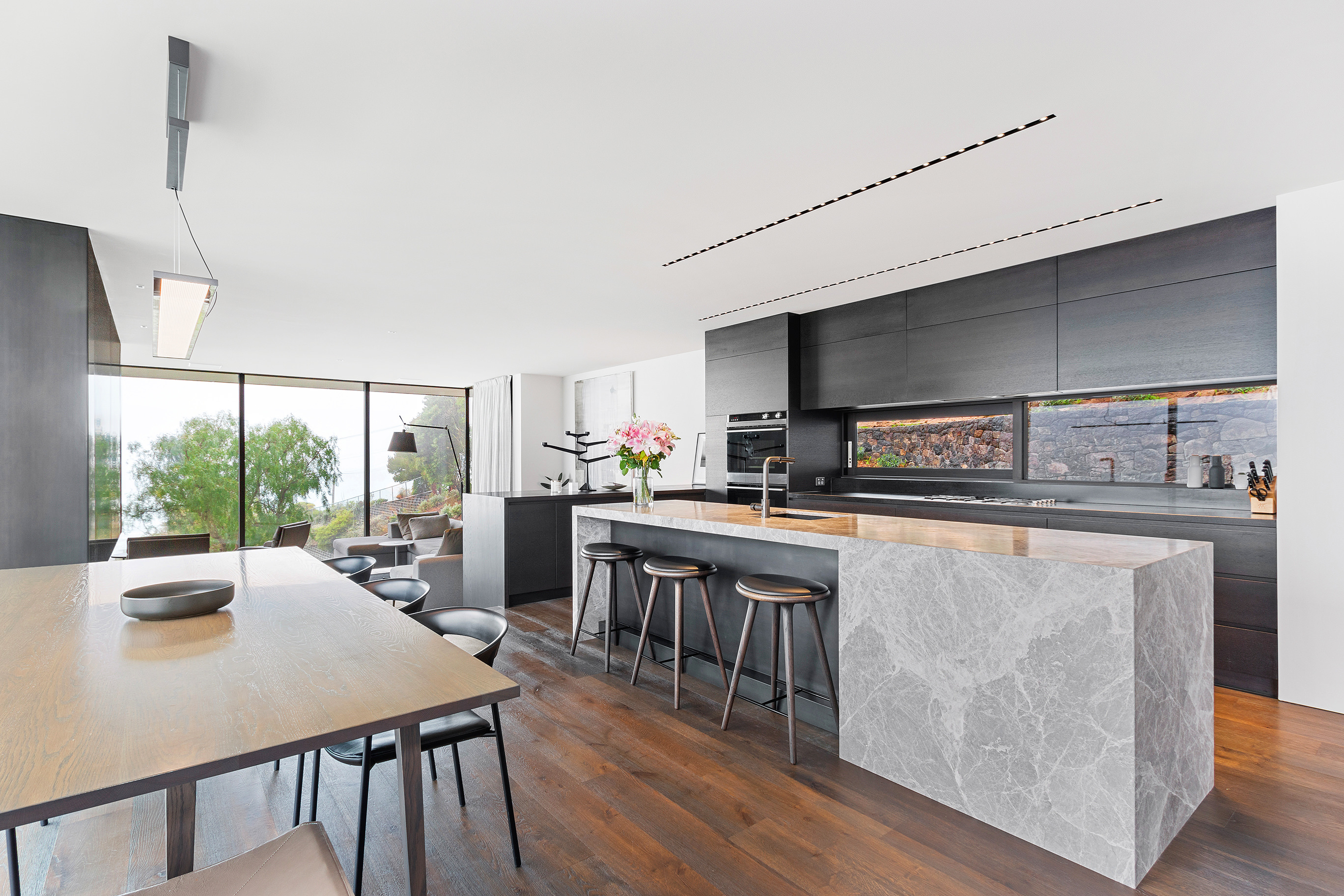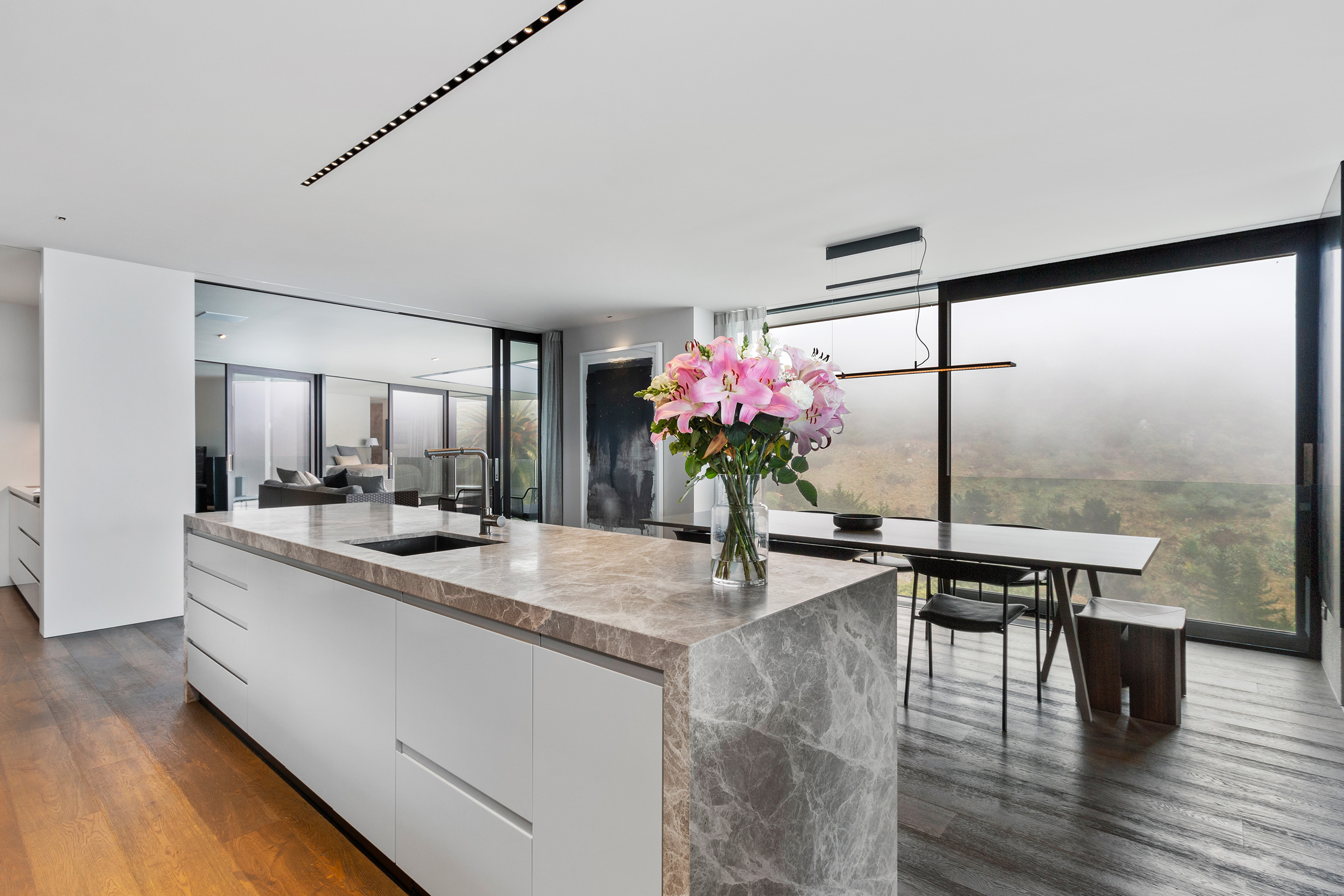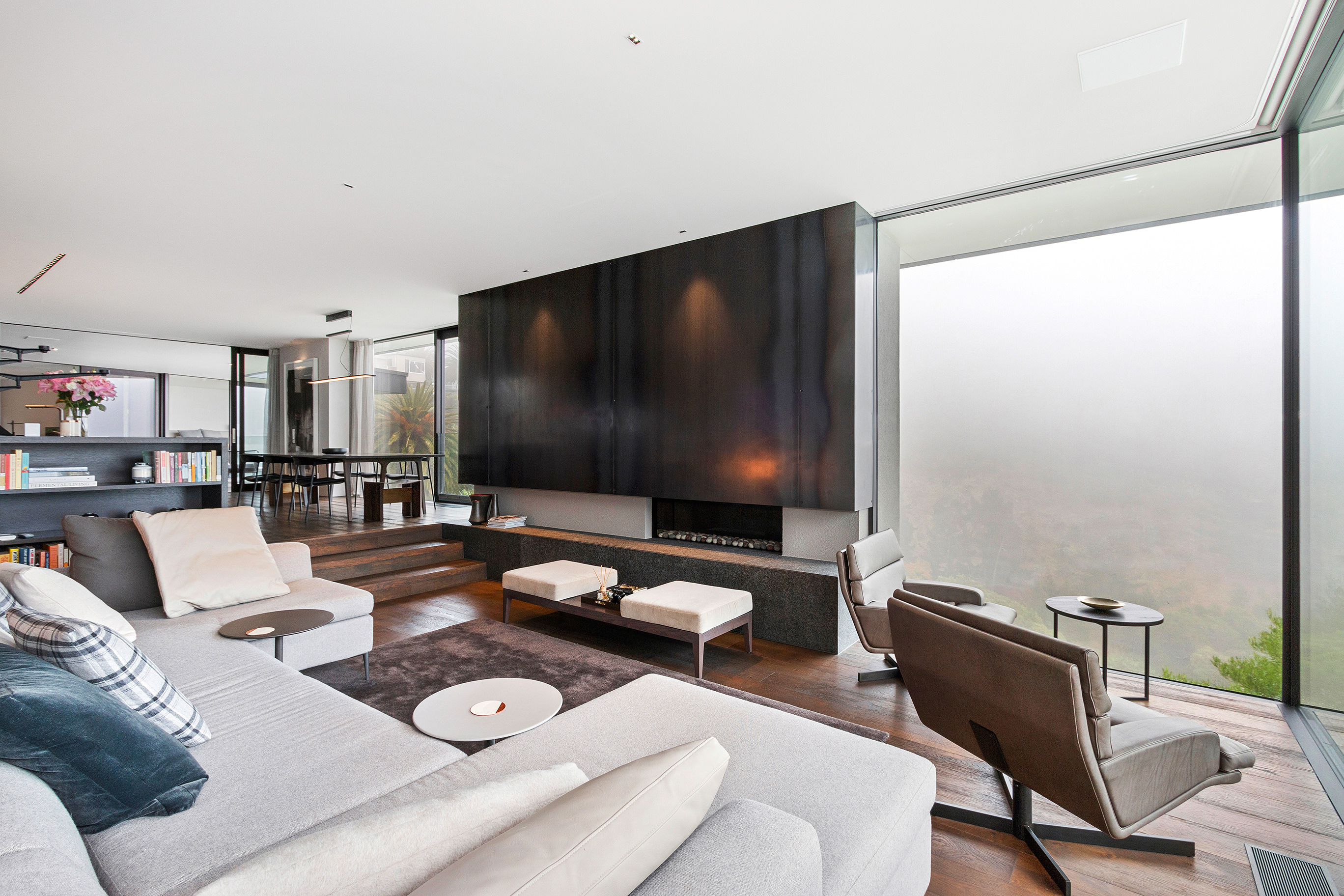 The expansive 365sqm layout is just one room deep at every point, providing each room with unique views. The naturally lit gallery and stairs run as a spine along the south wall. The house is partially suspended over a vehicle forecourt to accommodate manoeuvring.