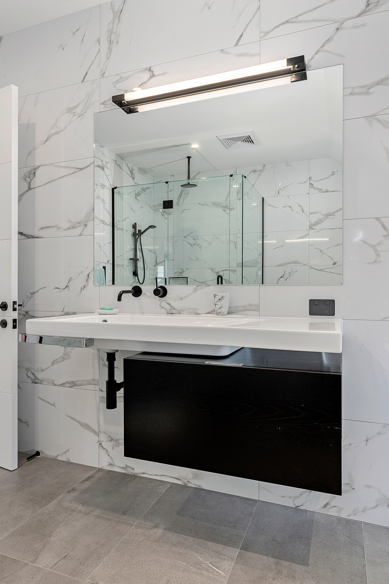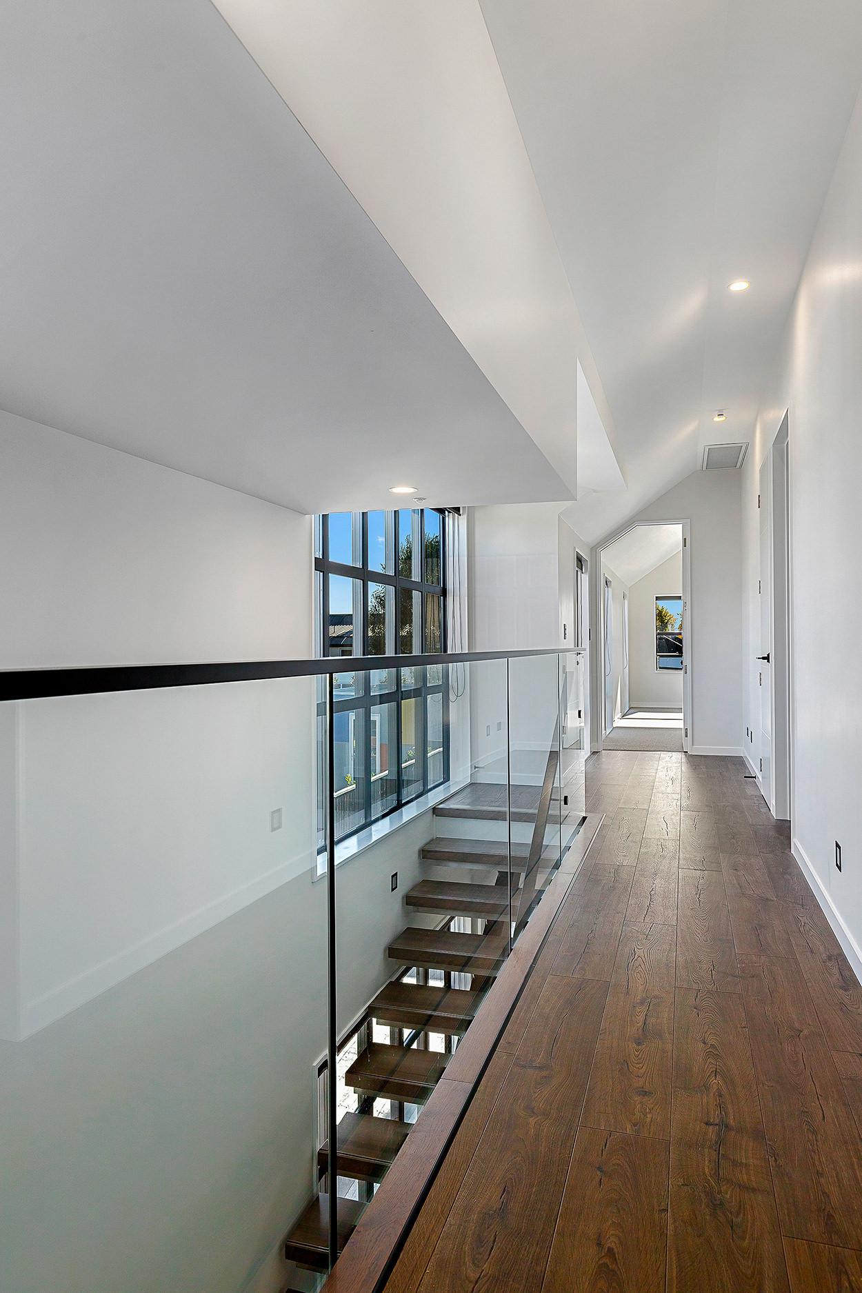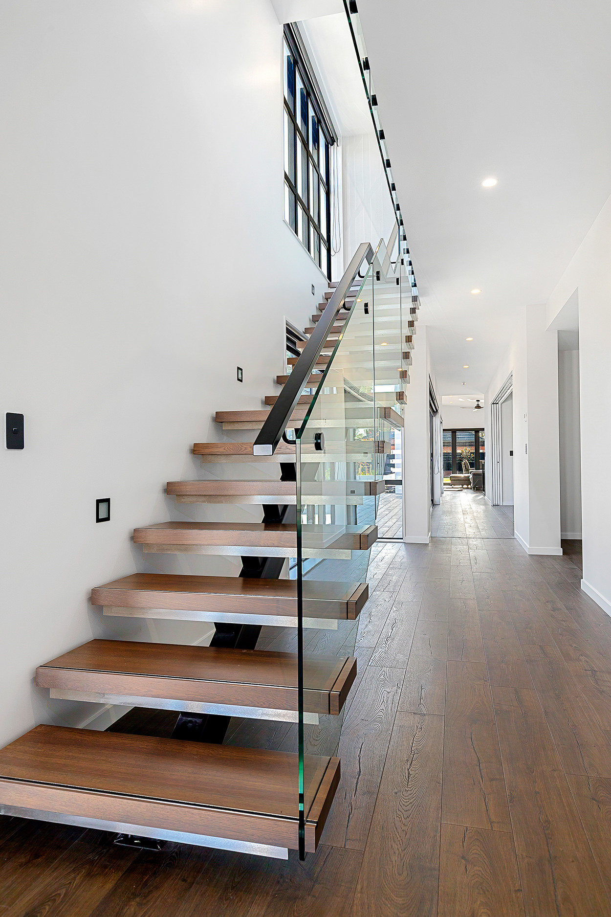 The elegant entrance opens to a feature floating staircase, the backbone of this home. This leads to an open glazed walkway and upstairs bedrooms. The bathrooms are beautifully tiled and well-equipped for luxurious modern living.