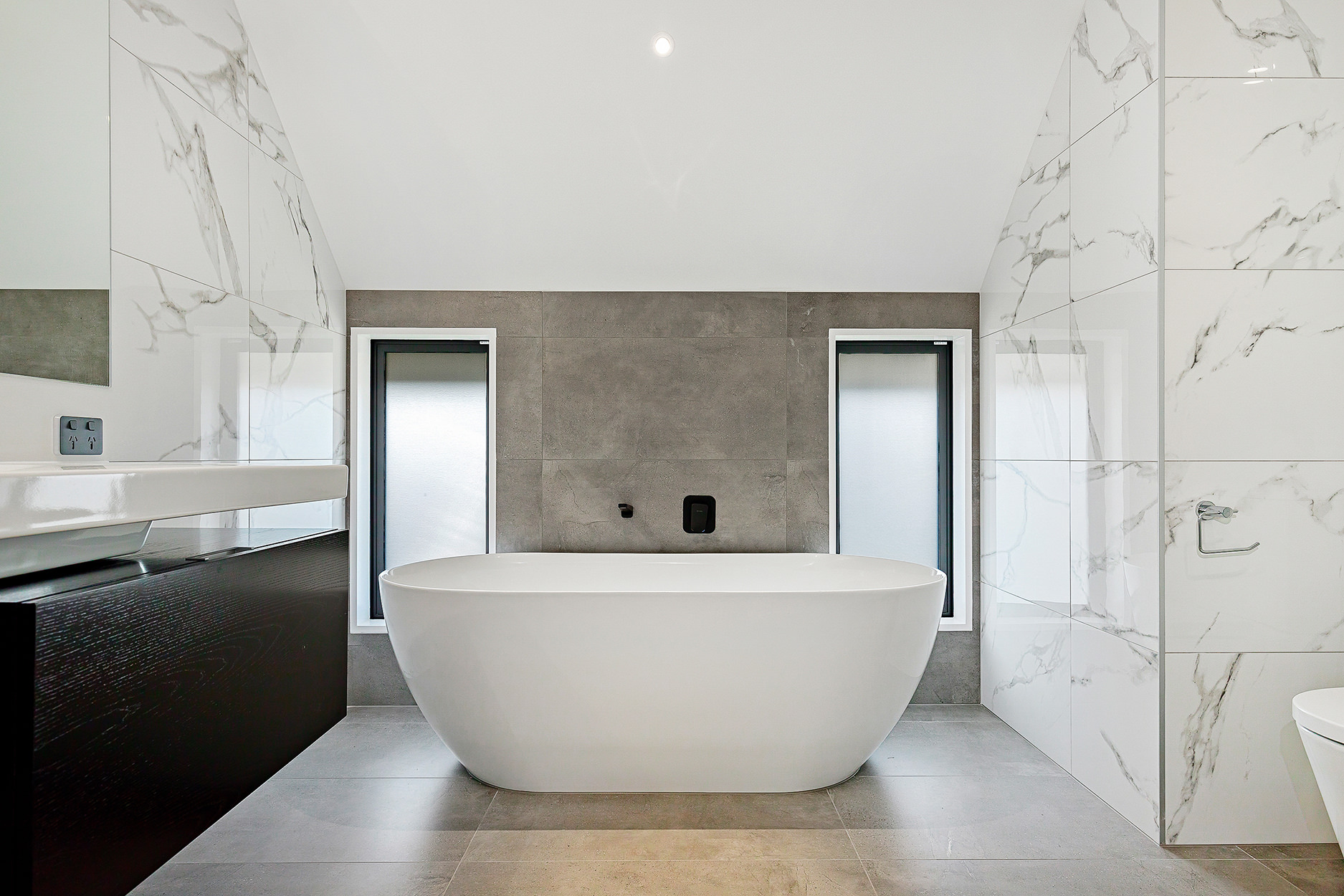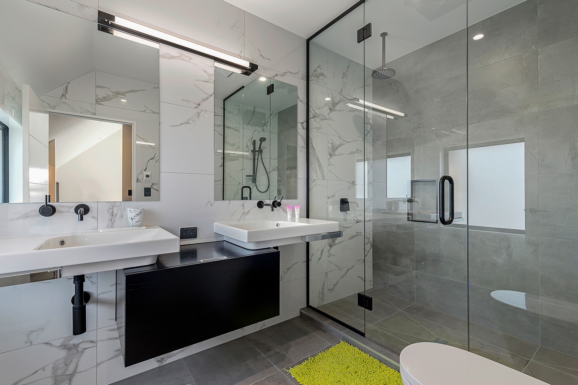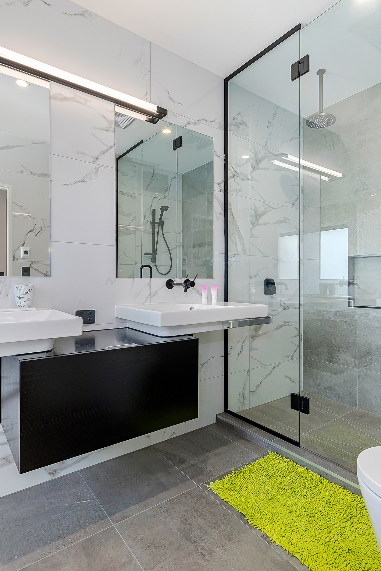 The elegant entrance opens to a feature floating staircase, the backbone of this home. This leads to an open glazed walkway and upstairs bedrooms. The bathrooms are beautifully tiled and well-equipped for luxurious modern living.