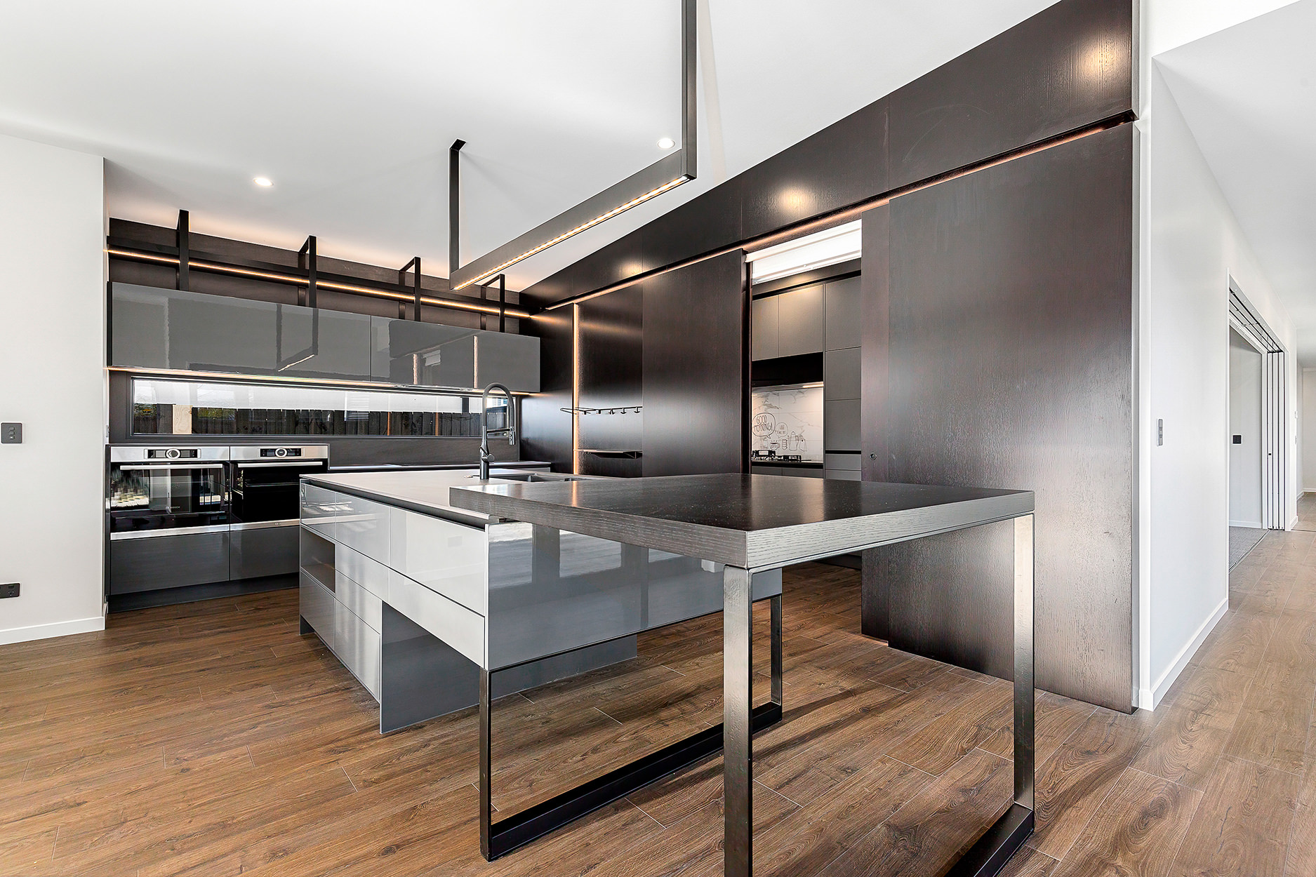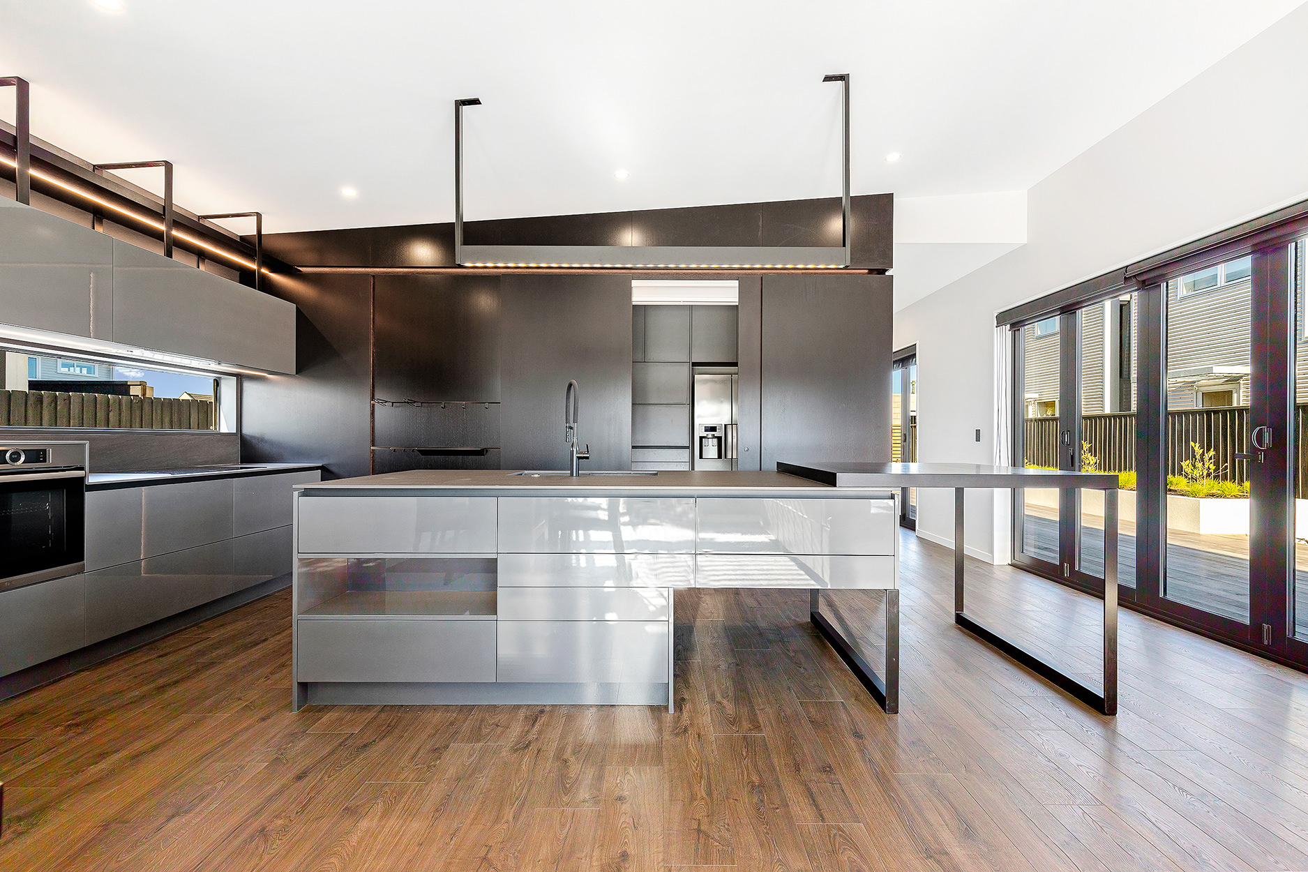 A futuristic feel takes holds in the sleek space-grey kitchen with concealed scullery. Could this be the new frontier of entertaining?
