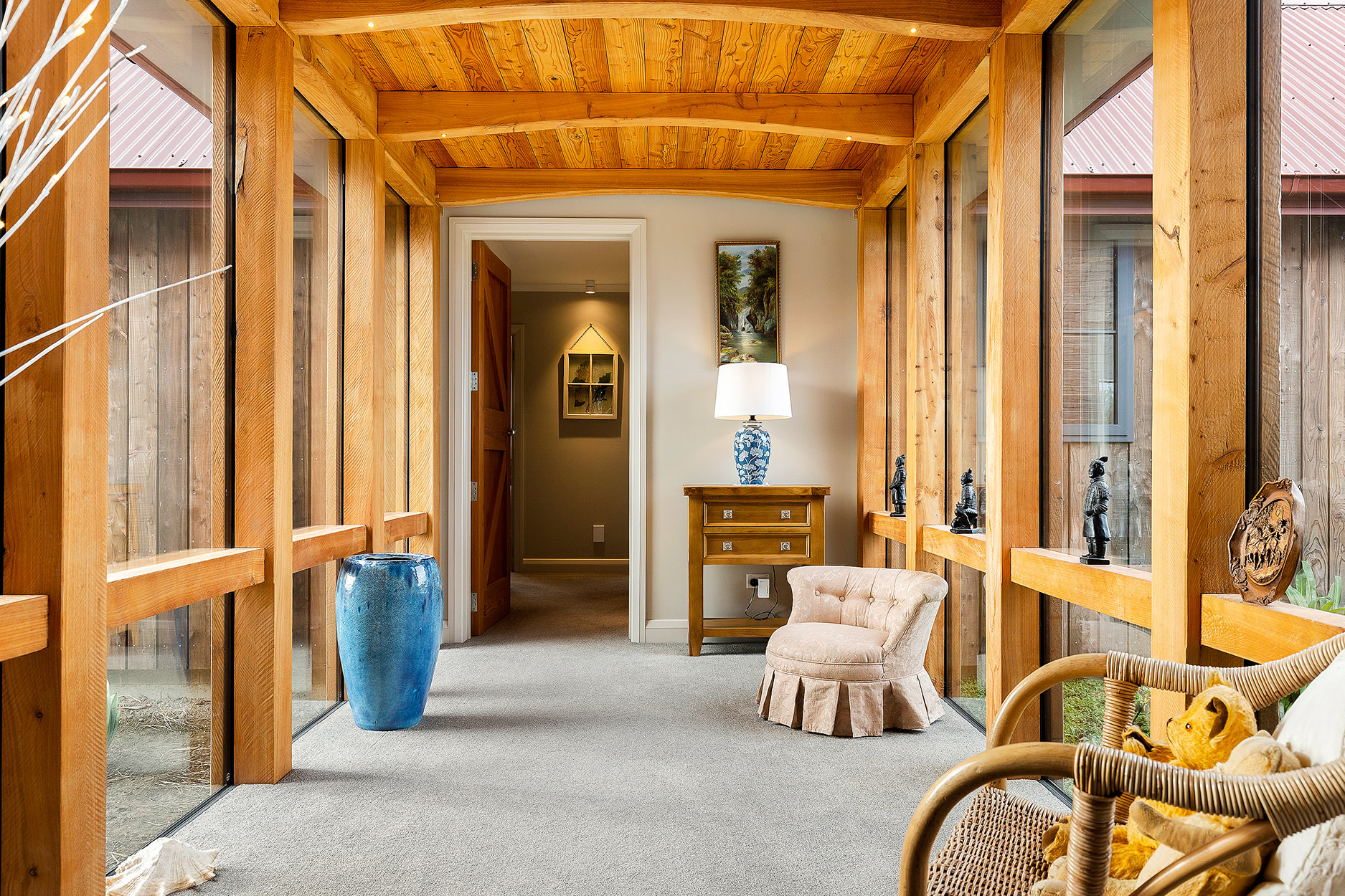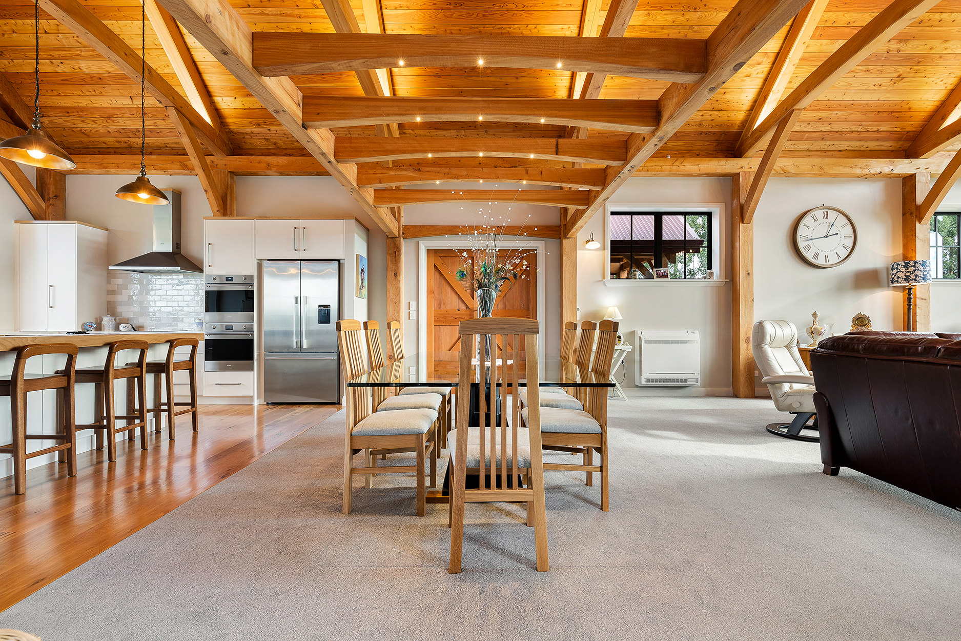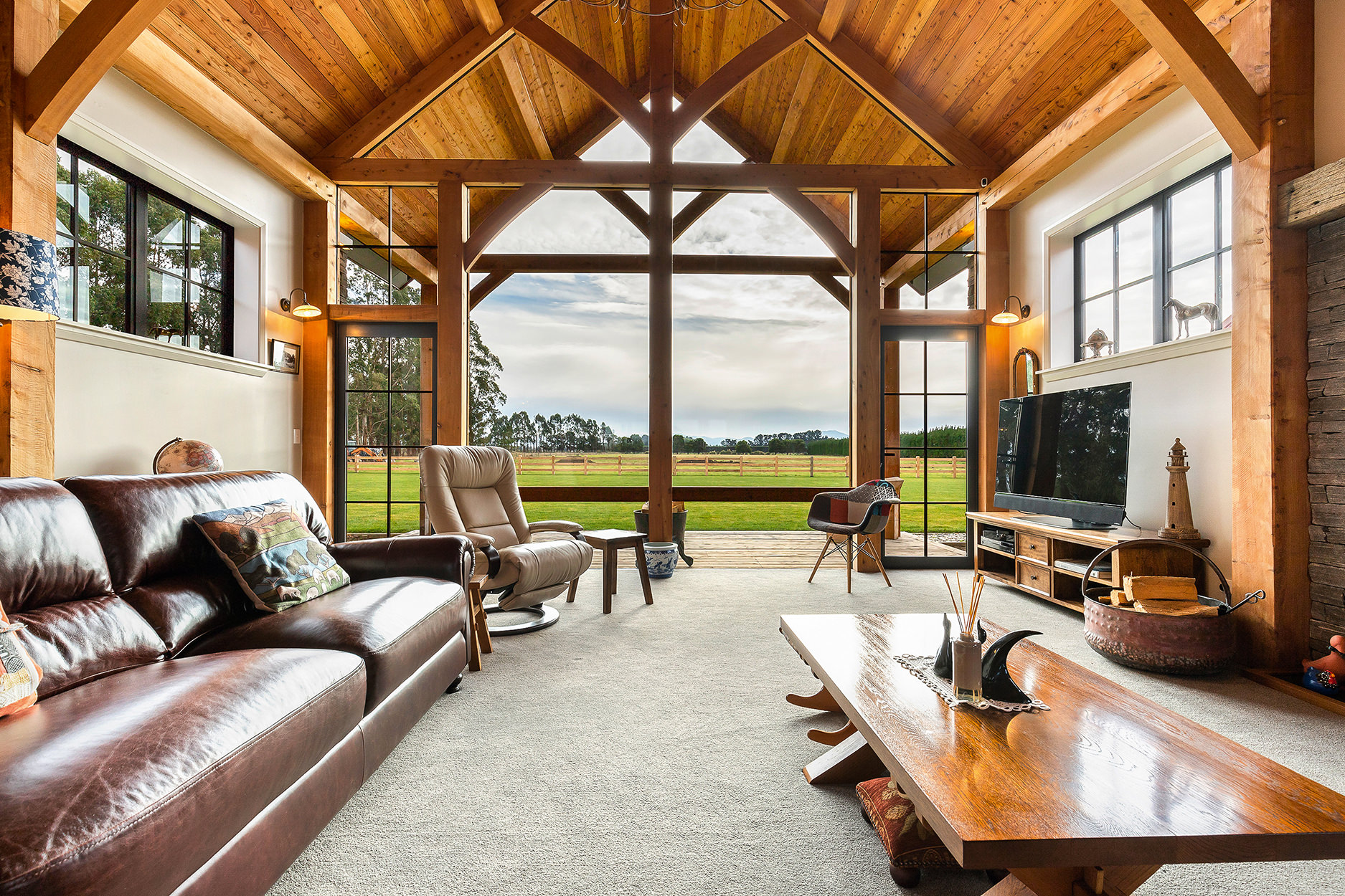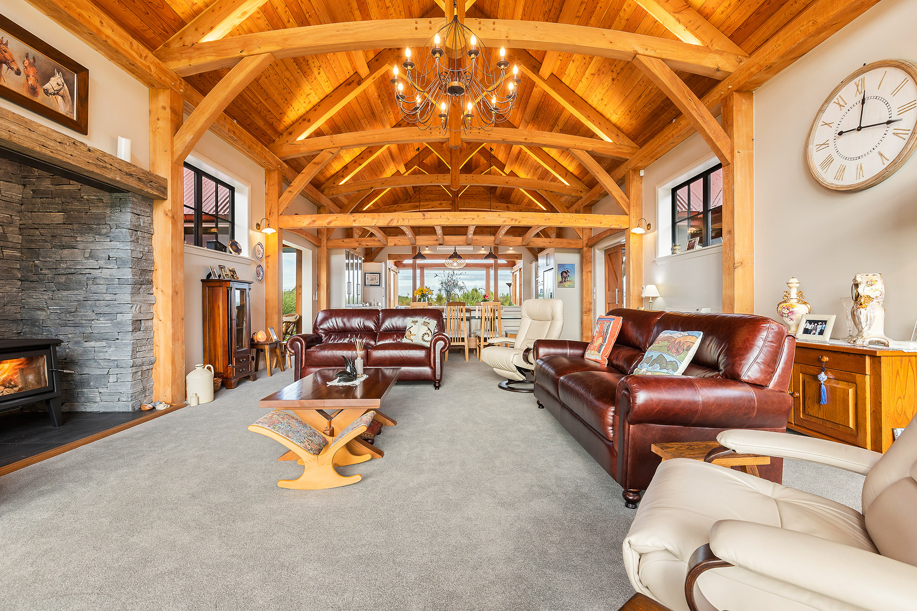 The post and beam structure pays tribute to the client’s career in bridge-building. Big timber is displayed here on a breathtaking scale and the craftsmanship is evident with mortice and tenon connections.