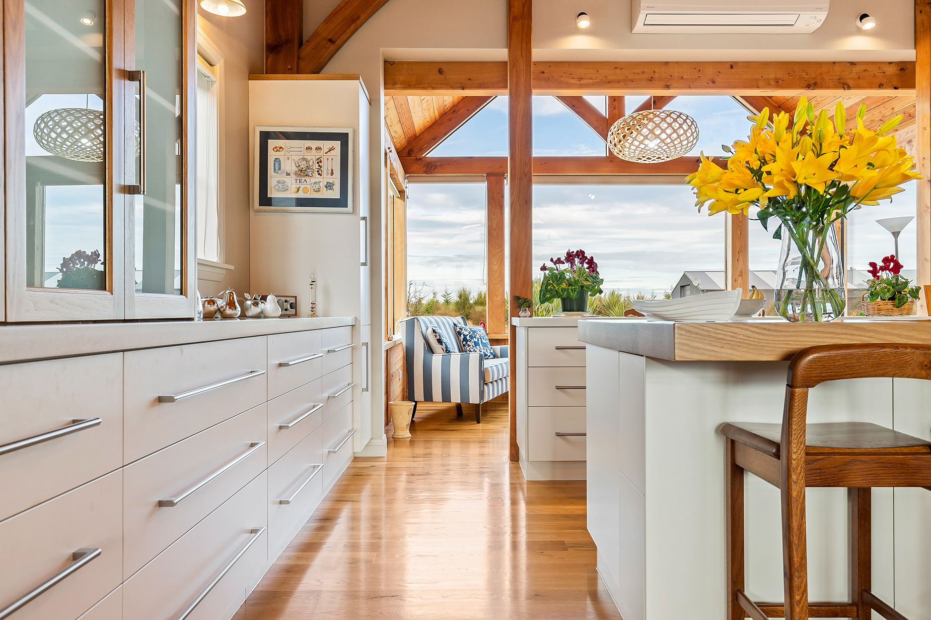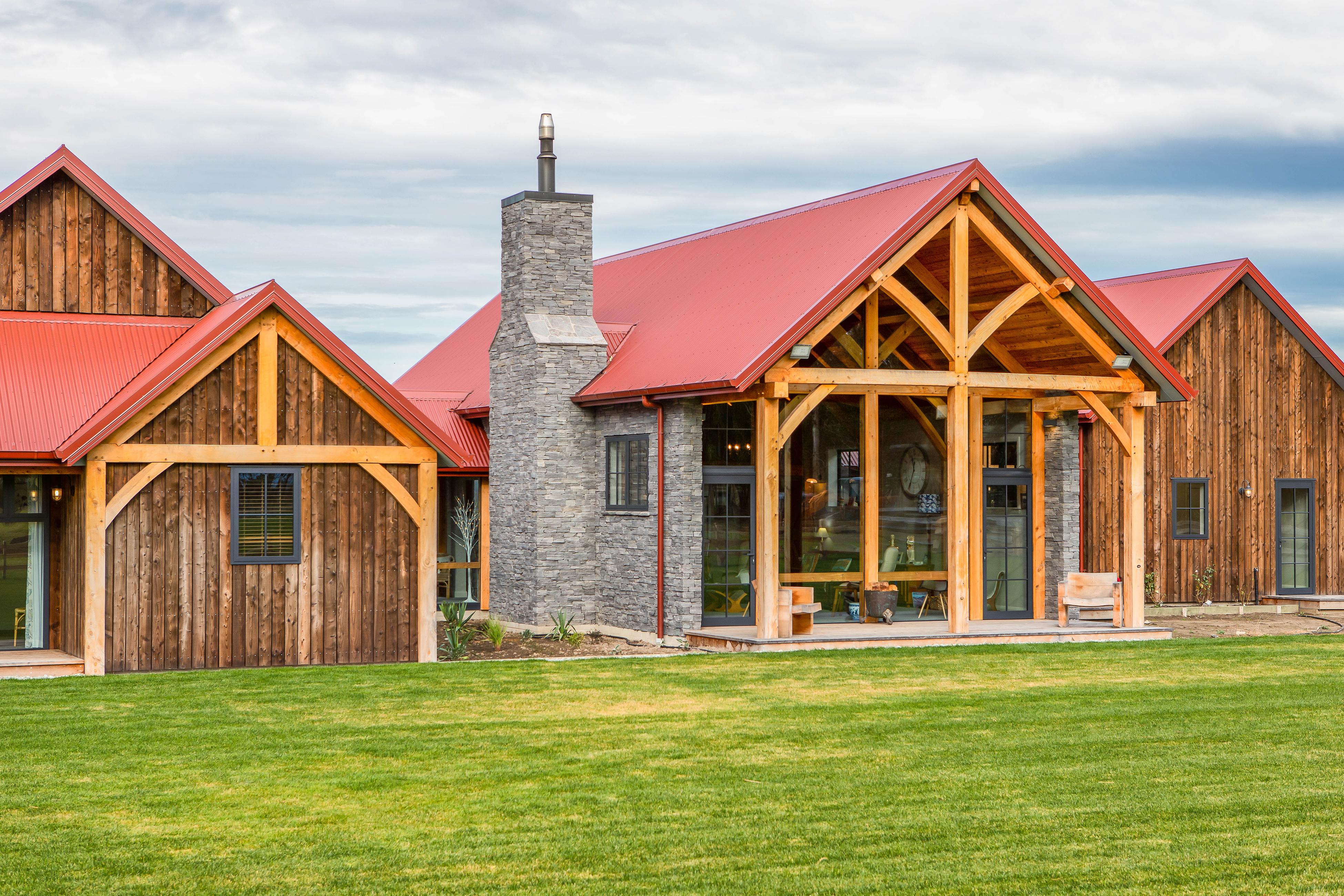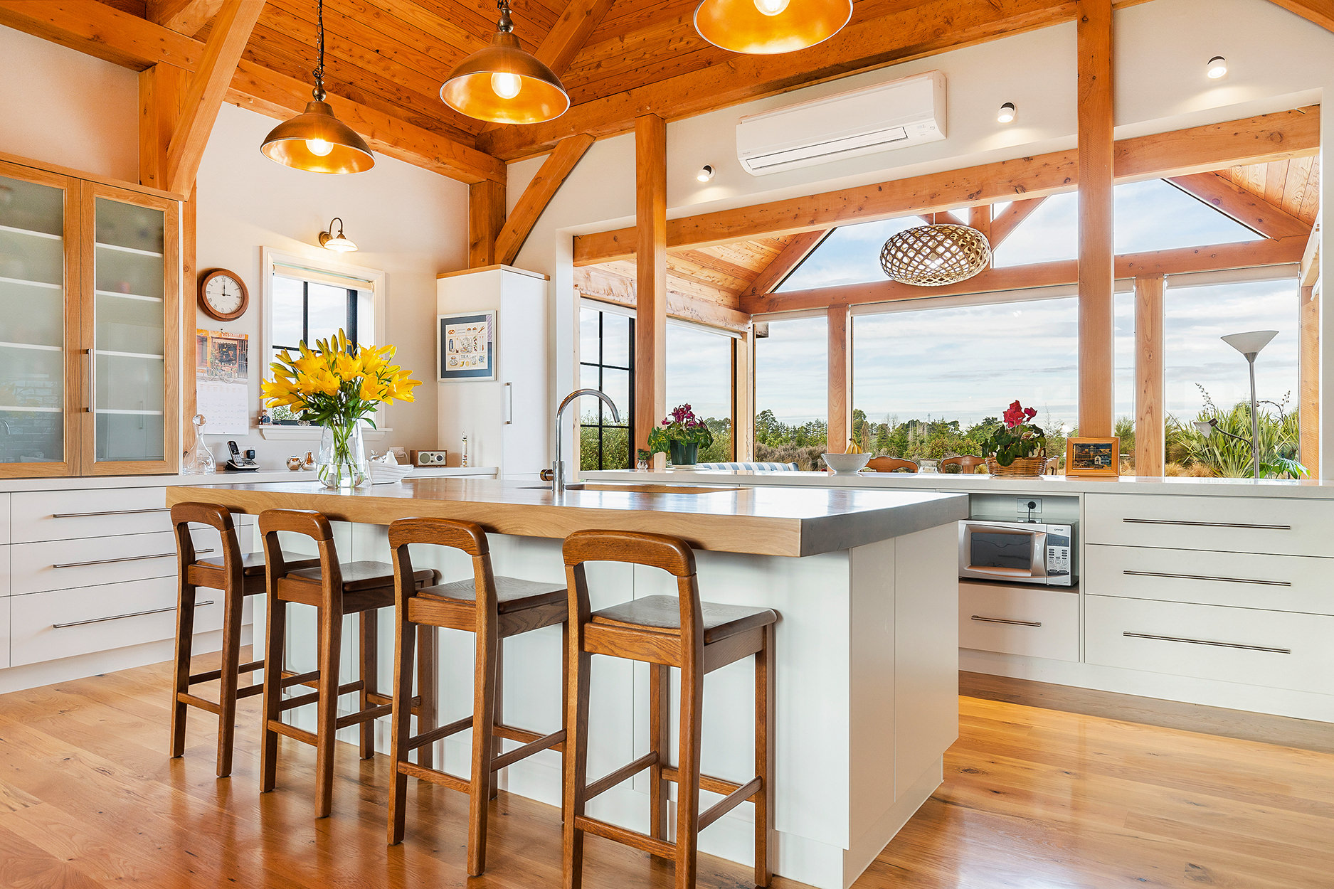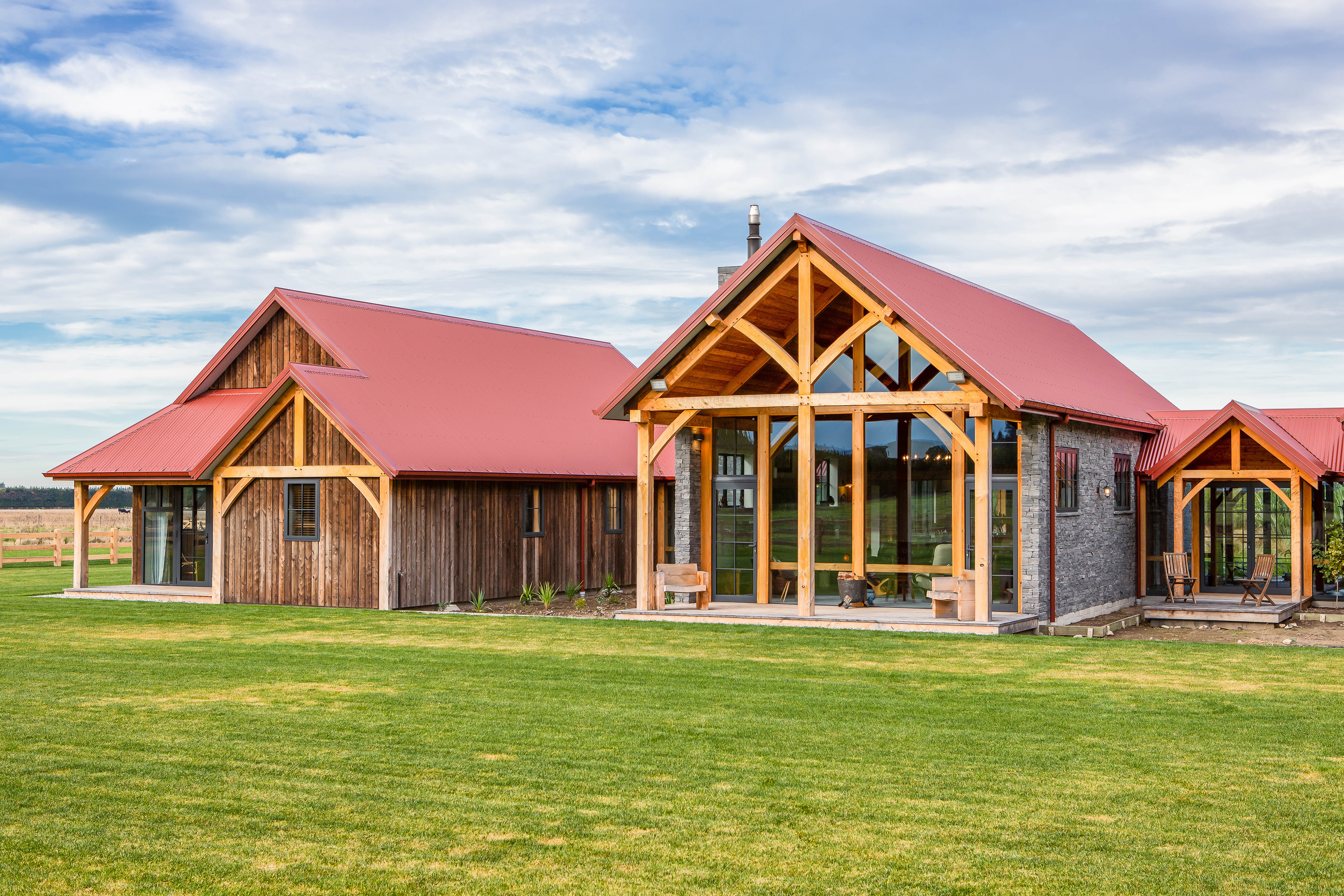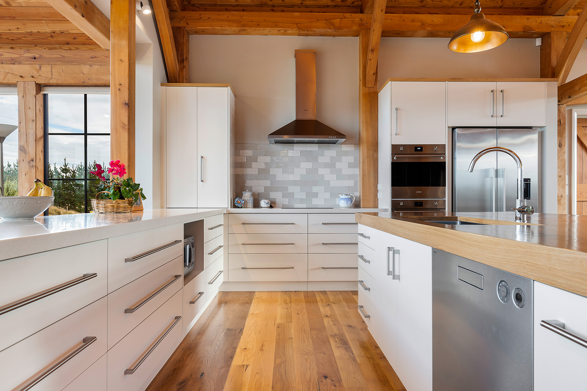 The post and beam structure pays tribute to the client’s career in bridge-building. Big timber is displayed here on a breathtaking scale and the craftsmanship is evident with mortice and tenon connections.