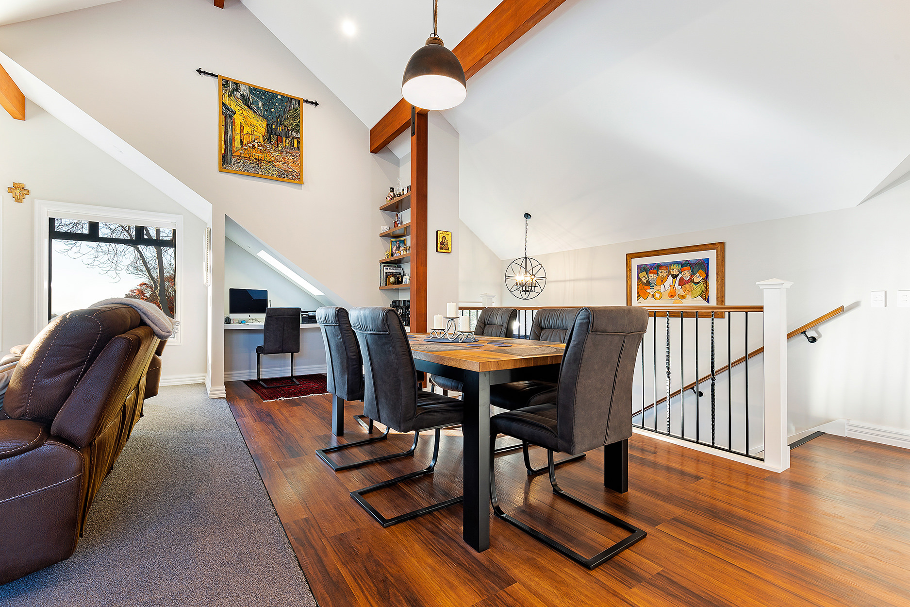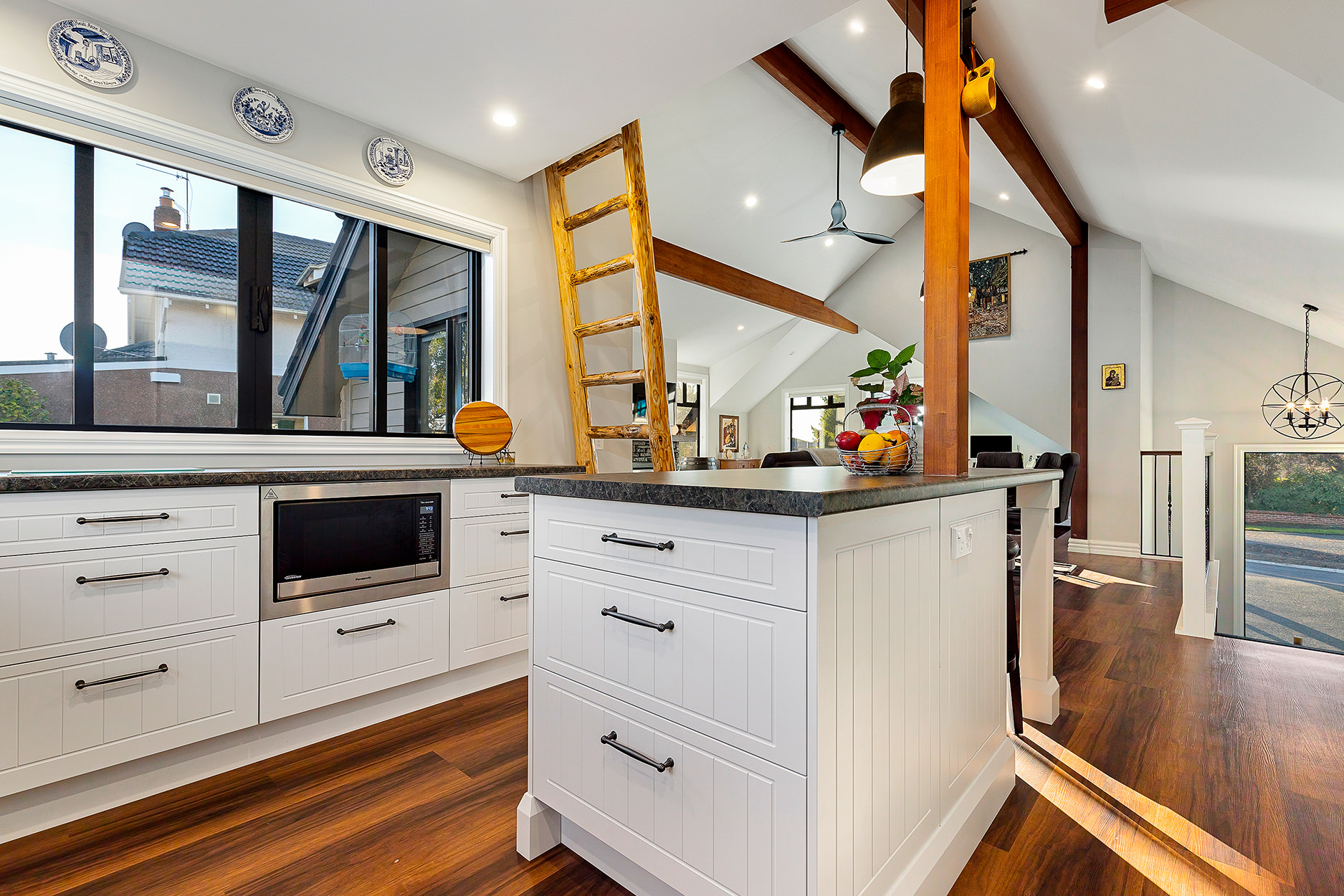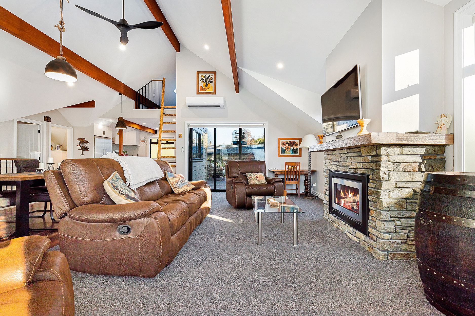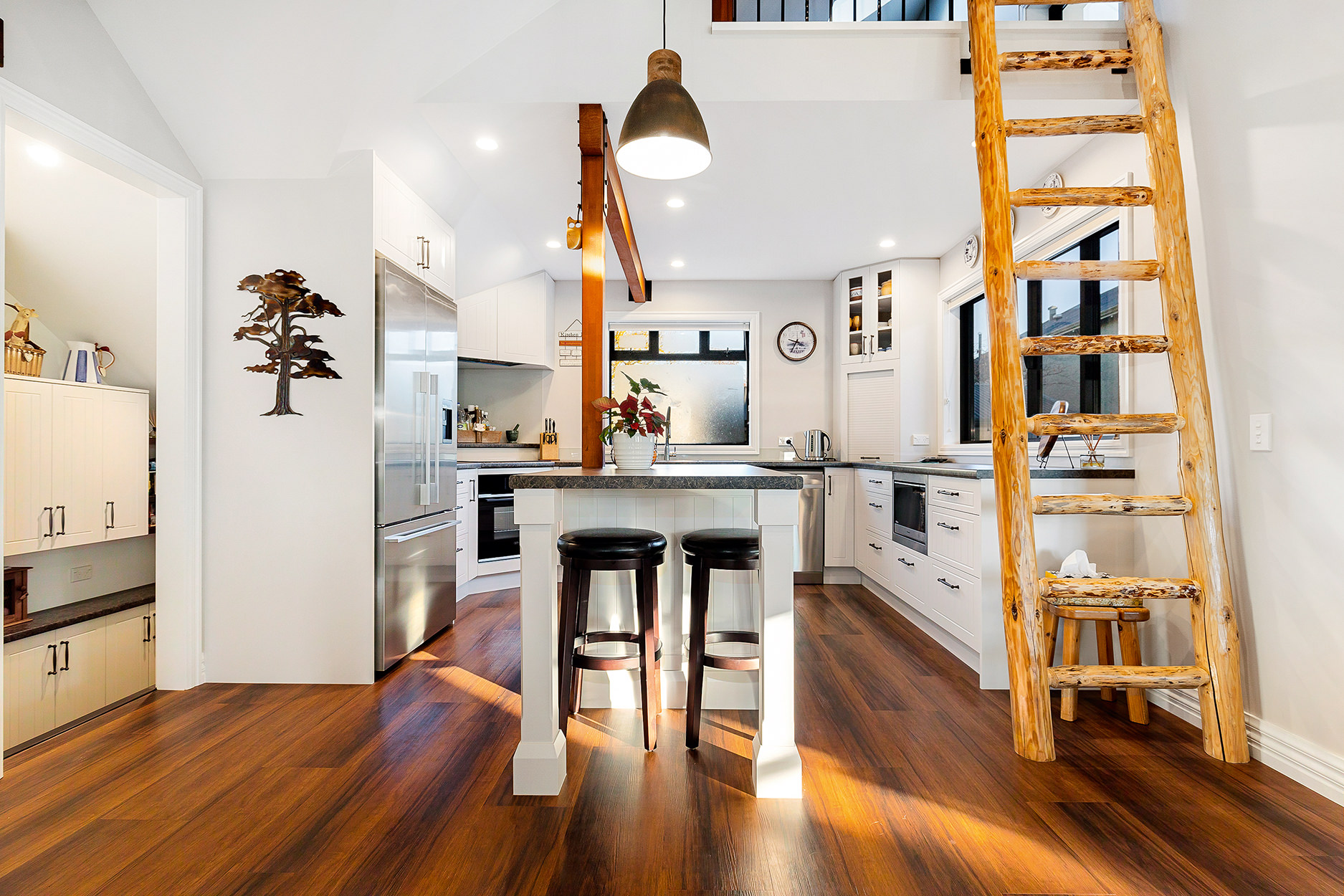 It’s upstairs to the kitchen, dining area and lounge, all smartly arranged in an open-plan hub. A loft for teens and a quirky yet functional step-down scullery make fantastic additions to this architecturally intriguing space.