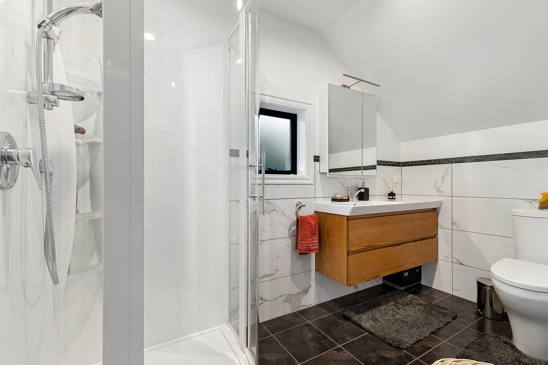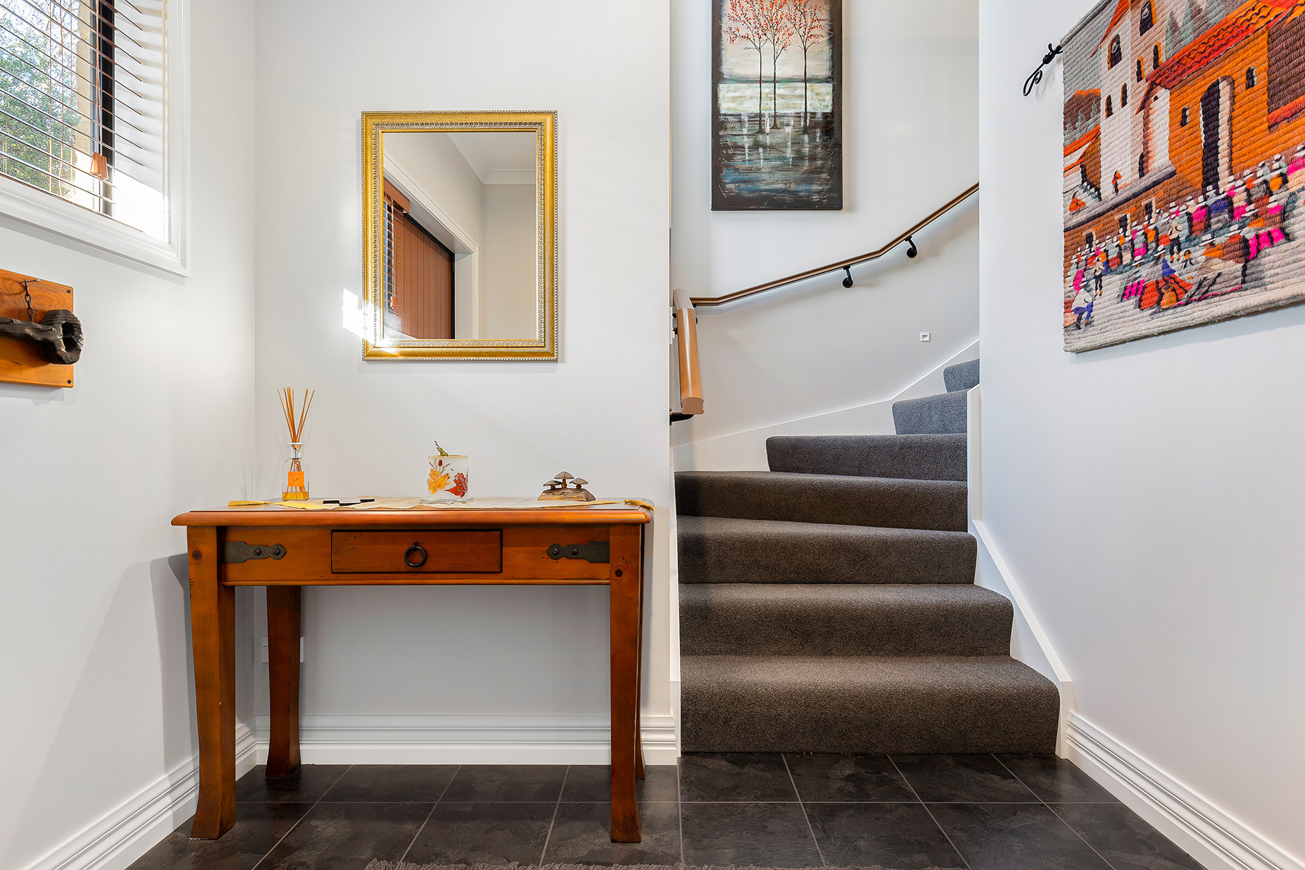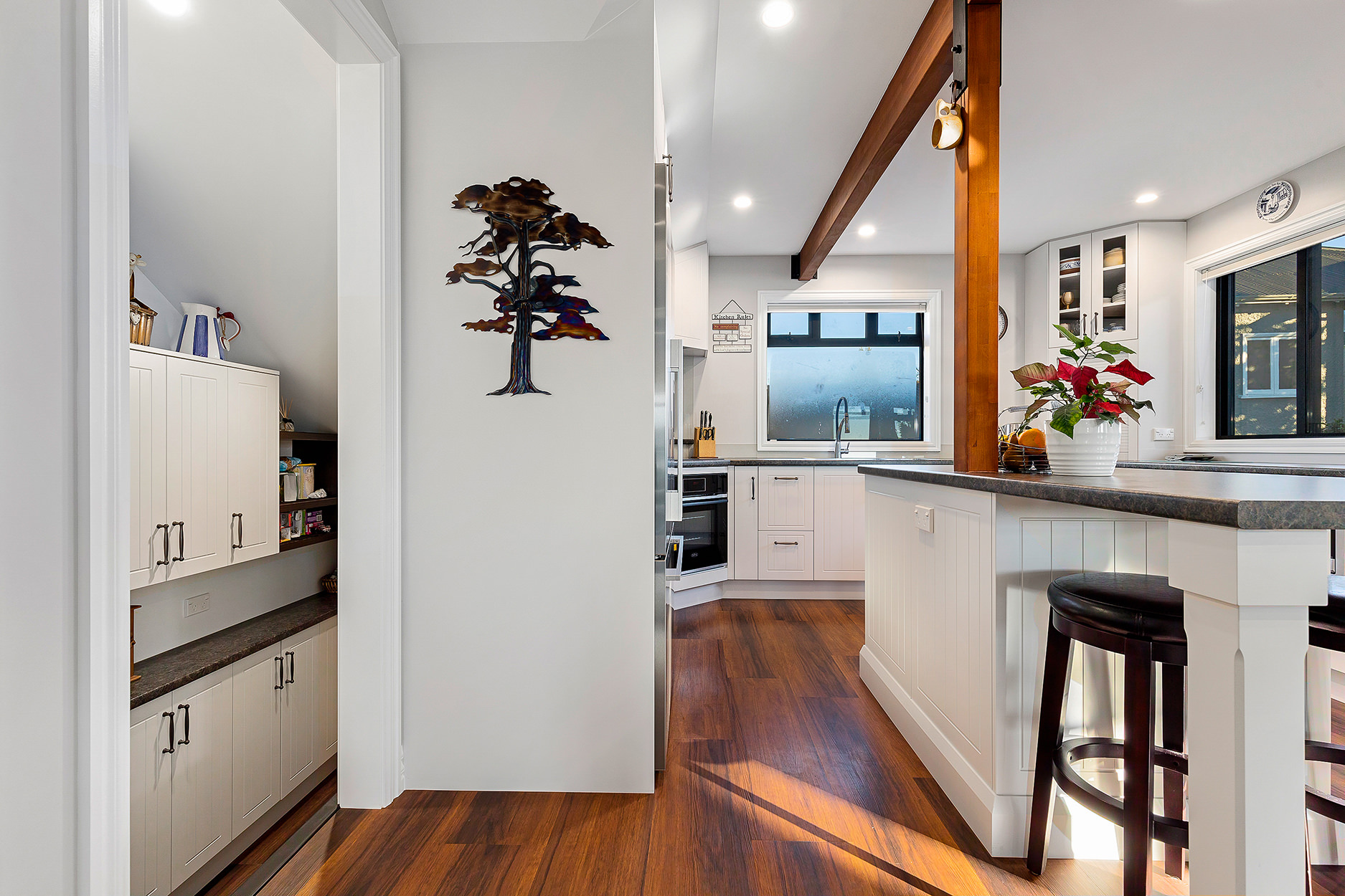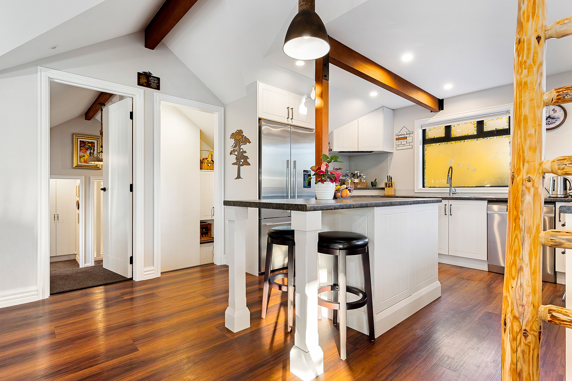 It’s upstairs to the kitchen, dining area and lounge, all smartly arranged in an open-plan hub. A loft for teens and a quirky yet functional step-down scullery make fantastic additions to this architecturally intriguing space.