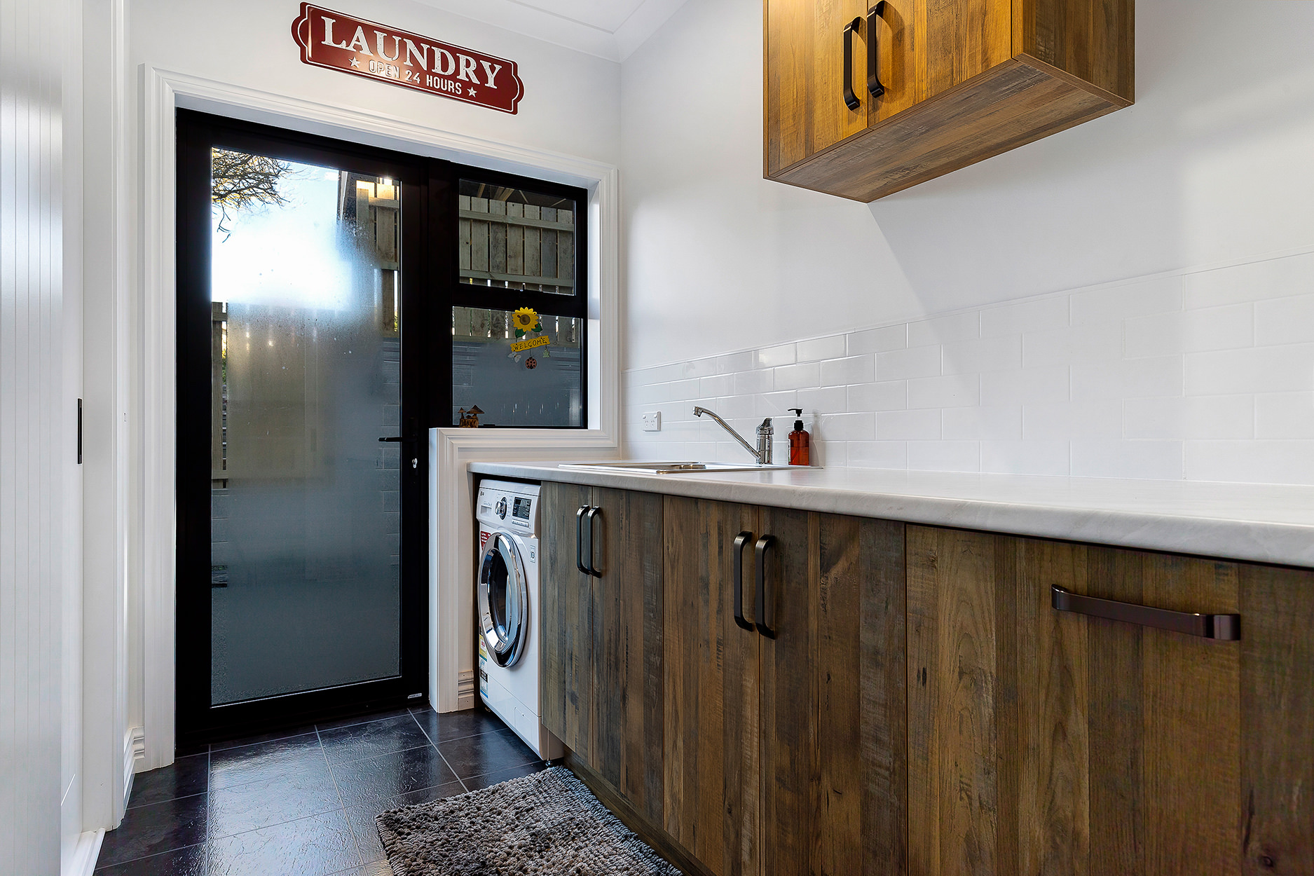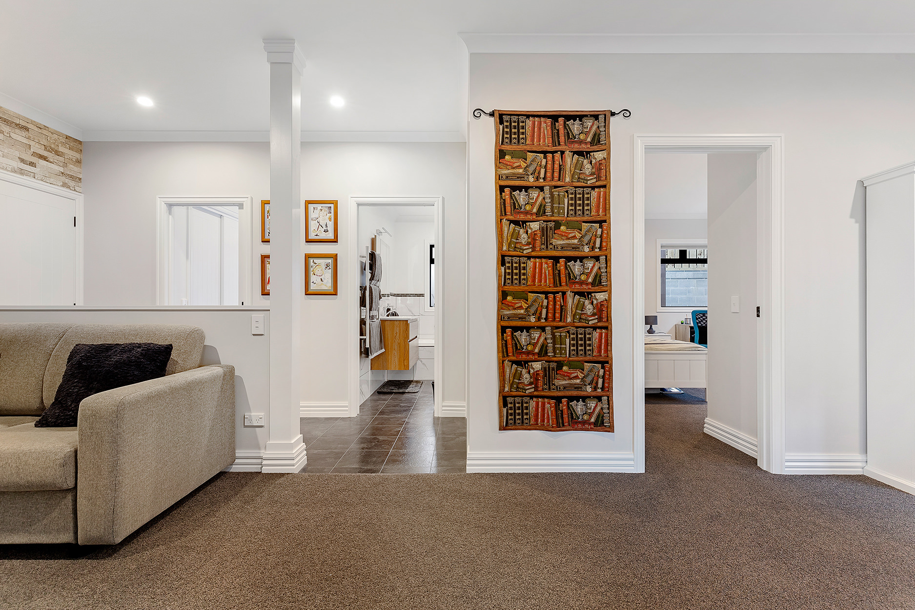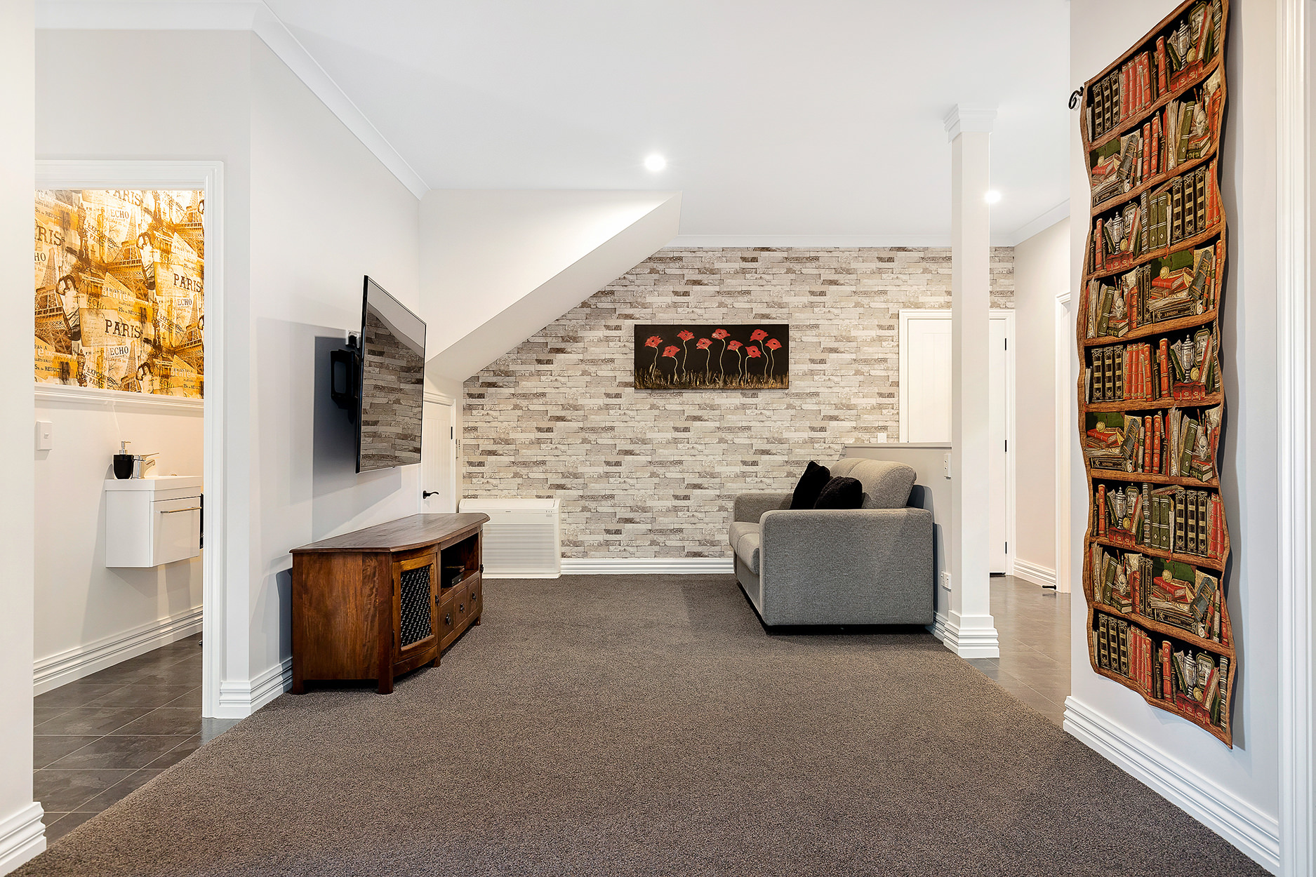 Downstairs are the girls’ quarters. Two bedrooms are located off their open-plan “chill zone”, a social space for evening movie sessions. A second bathroom, laundry and double garaging can also be directly accessed from here.